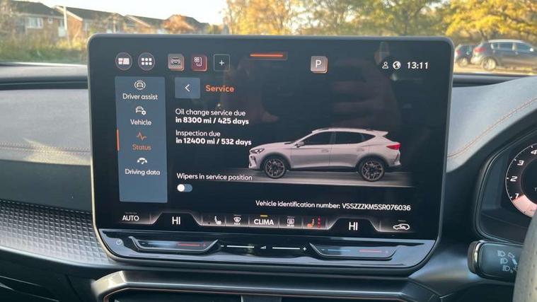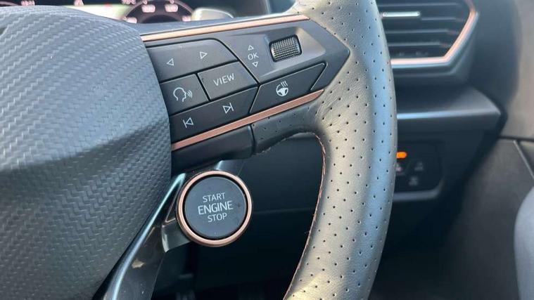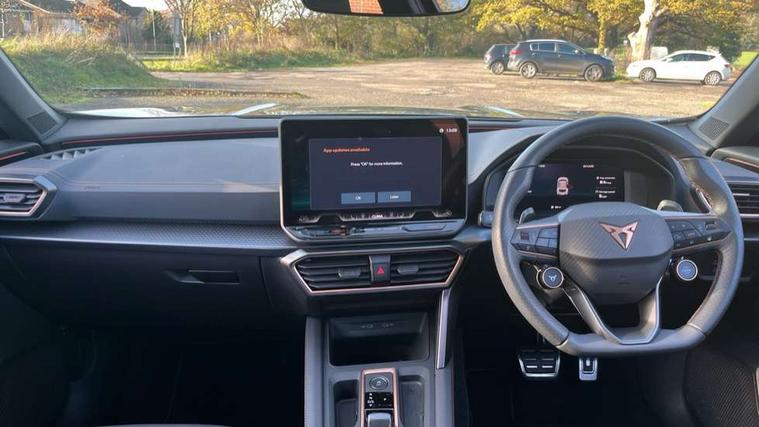 10.25" digital cockpit and configurable dashboard, Adaptive cruise control with follow-to-stop and speed limiter, Advanced driver alert system, Advanced lane assist with semi-automatic vehicle control in a medical emergency and traffic jam assist, Dynamic chassis control with driving profile selection (Comfort, Sport, CUPRA, Individual), Dynamic road sign display, Emergency steering support with turn assist, Forward collision warning with automatic braking, Full link phone integration, Intelligent park assist, RPM, trip computer, outside temp gauge, instrument light brightness, low fuel warning light, lights on reminder, gearshift indicator, Service interval indicator, Side and exit assist, Speed sensitive power steering, Start/stop system with regenerative braking, Top view camera, Virtual pedal and electric tailgate, Voice control system, Wired Android Auto, Wireless apple carplay, Wireless phone charger, Adaptive chassis control with continuous operation, CUPRA sport suspension, Electronic locking differential and dynamic traction support, 2 front and 2 rear USB type C sockets, Media system with navigation, 12.9" touchscreen display, voice control, DAB, steering wheel mounted controls, Auto dimming rear view mirror, Body colour door handles, Body coloured bumpers, Dark grey wing mirror, Daytime running light with automatic headlight control and coming home feature, Door panel ambient lighting, Dynamic headlight range control, Electric front/rear windows, Electrically adjustable heated and folding door mirrors with memory function, Gloss black roof rails and window surrounds, High beam assist, LED 3rd brake light, LED front fog lamps with cornering function, LED Taillights with dynamic indicator, Matrix LED headlights with multifunction camera, Rain sensing wipers, Rear diffuser with twin exhaust pipe on each side, Rear fog lights, Rear side wing doors, Rear wash/wipe, Tinted rear windows, Welcome lights (within exterior mirror housing), 12V socket, 2 front and 2 rear reading lights, 3 seat bench in 2nd row, 60/40 split rear bench seat with armrest and mechanical seat release, Black headlining, Black interior roof lining, Cupra sports pedals, Dust/pollen filter, Electrically adjustable front seats with lumbar support and memory function, Front and rear head restraints, Front centre armrest, Heated front seats, Heated supersports multifunction leather steering wheel with satellite buttons and gear shift paddles, Height/reach adjust steering wheel, Illuminated aluminium doorsteps, Illuminated interior front door sills, Illuminated sunvisor with mirror, Isofix, Leather dashboard, door insert and side trim panel, LED smart wraparound lighting, PVC/Leather upholstery, Satellite steering wheel, Single front passenger seat, Storage pockets on rear of front seats, Three zone climate control with control panel in rear, Variable luggage/load compartment floor, 3 point seatbelts on all rear seats, ABS, Brake control system - ESC and brake booster, Child proof door locks, Driver and front passenger airbags with front passenger airbag de-activation, Electronic parking brake, Front and rear disc brakes, Front side curtain airbags, Hill hold control, Pre-crash front and rear seat belt tensioner, window closure and hazard lights, Public e-call, Seat belt reminder for front and rear seats, Tyre pressure monitoring system, Anti theft alarm system, KESSY Advanced - Keyless start, keyless entry with SAFELOCK, Locking wheel bolts, Copper and aluminium interior detailing, 19" Artic machined sport black and silver alloy wheels, Breakdown and tool kit,