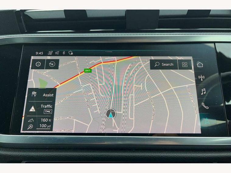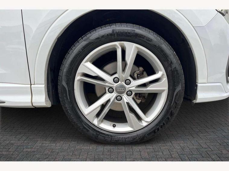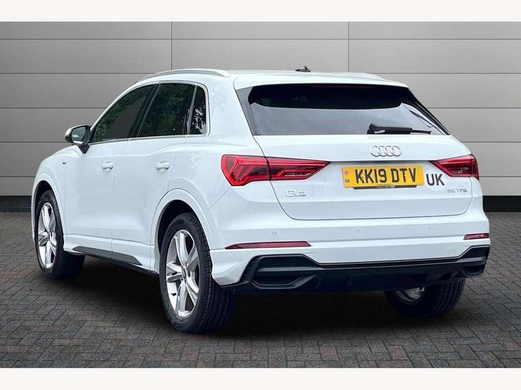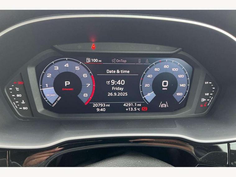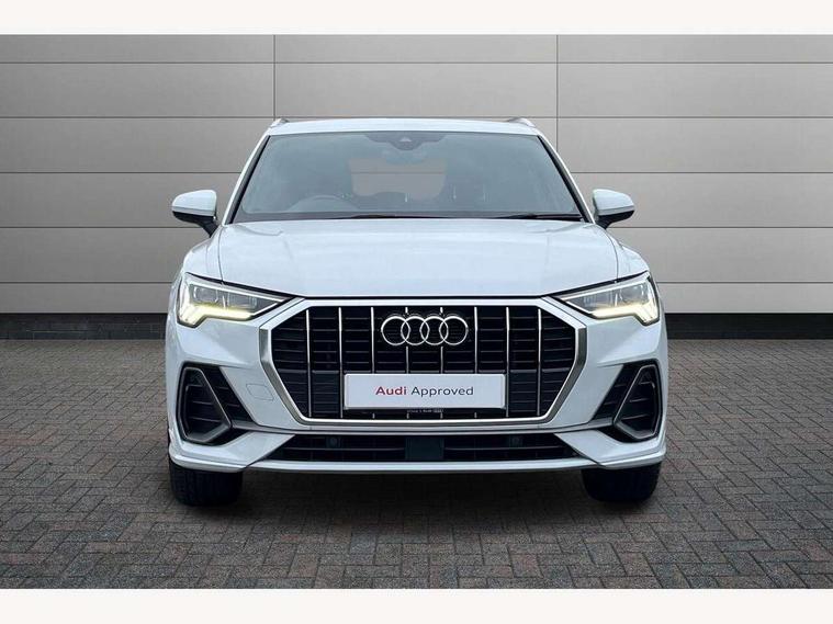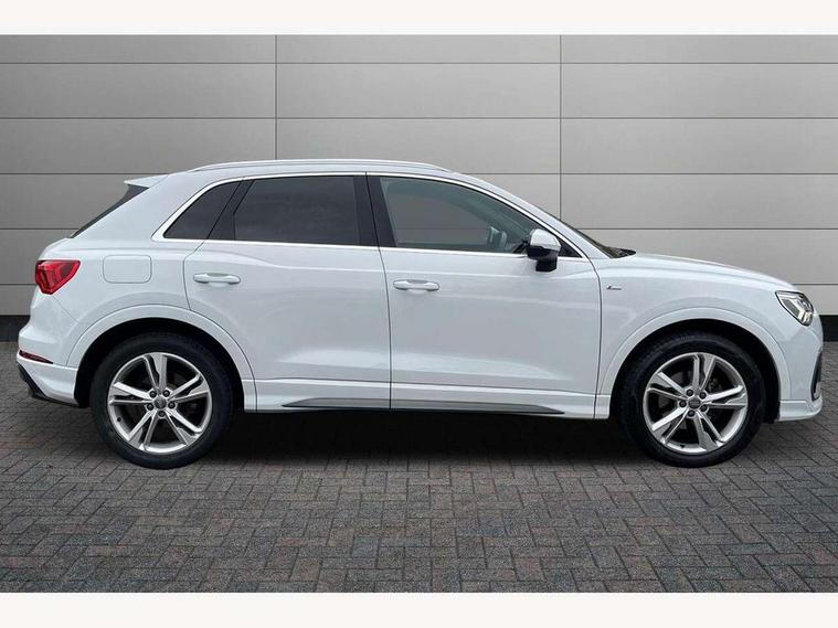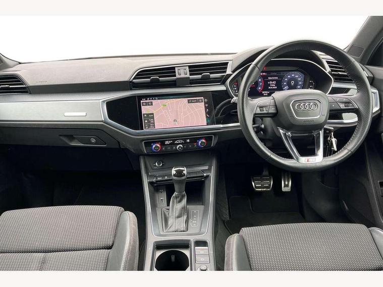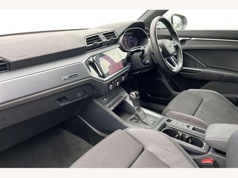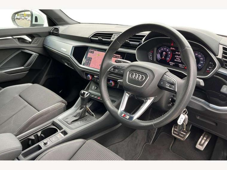 Audi connect safety and service (e-call), Audi drive select, Audi lane departure warning, Audi side assist, Audi smartphone interface, Bluetooth interface, Camera based traffic sign recognition, MMI navigation plus with MMI touch, Power opening/closing tailgate, Progressive steering, Rear parking sensors, Service interval indicator, Stop/start system, Voice control system, Sports suspension, 1 x USB type C and 1 USB type A charging points, 6 speakers, DAB digital radio module, Acoustic windscreen, Aluminium roof rails, Aluminium window trim, Auto dimming rear view mirror, Body coloured bumpers, Diffuser in matt Platinum grey, Electrically adjustable and heated door mirrors with integrated LED side indicators, Front and rear electric windows, Front fog lights, Front side air inlets in matt platinum grey, Front spoiler blade in matt platinum grey, Grille vertical bars in aluminium silver/Matt, High gloss black finish B and C pillars, LED headlights with LED daytime running lights and dynamic rear indicator, LED rear lights, Privacy glass, Rain and light sensors, Rear diffuser strip in matt titanium black, S Line badge on wings, S Line front and rear bumpers, Side skirt insert in matt Platinium grey, Titanium black radiator grille, 12V socket in rear centre console, 40:20:40 split folding rear bench seat, Adjustable rear seat bench/backrest with centre armrest and cupholder, Aluminium door sill trims, Black cloth headlining, Dual zone climate control, Front and rear black floor mats with contrast stitching in rock grey, Front and rear headrests, Front centre armrest with storage compartment and angle adjustment, Illuminated door sill trims with S logo, ISOFIX child seat mounting and Top Tether with front passenger airbag deactivation, Manual front seats with height adjustment, Perforated leather gearknob, Stainless steel luggage compartment sill finisher, Stainless steel pedals, Non smoking pack - Q3, 3x3 point rear seatbelts, 6 airbags - Driver, front passenger, curtain and side windows, Audi pre-sense front with pedestrain and cyclist recognition, Electrically operated child locks on rear doors, Electromechanical parking brake, Electronic stabilisation control including ABS, ASR and EDL, Hill hold assist, Pre sense basic, Seatbelt monitoring, Tyre pressure warning, Warning triangle and first aid kit, Anti theft alarm, Anti theft wheel bolts, Remote central locking, Dark matt brushed aluminium inlay, MMI touch colour display in gloss black with aluminium surround, Tool kit, Tyre repair kit,