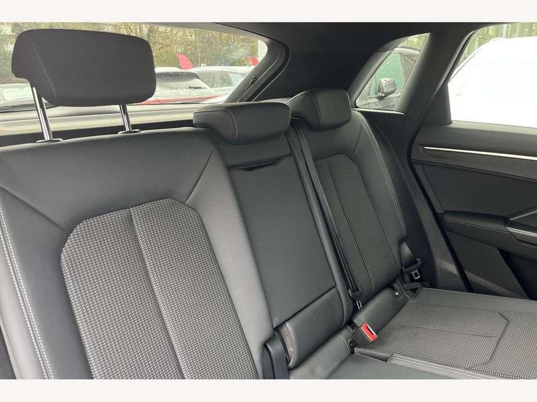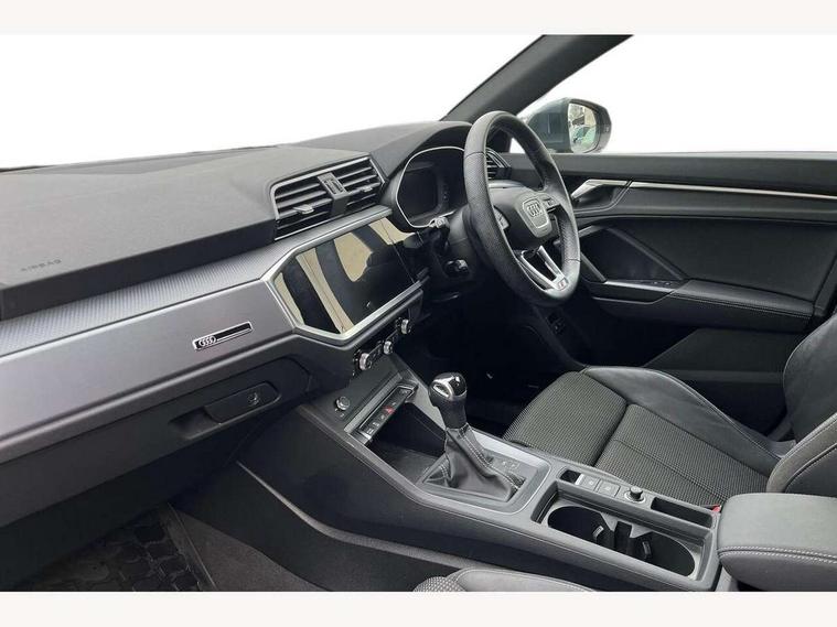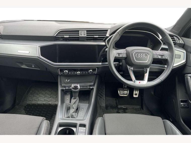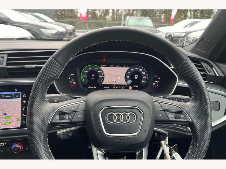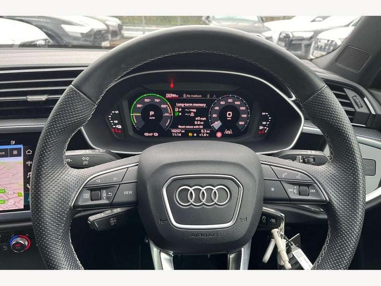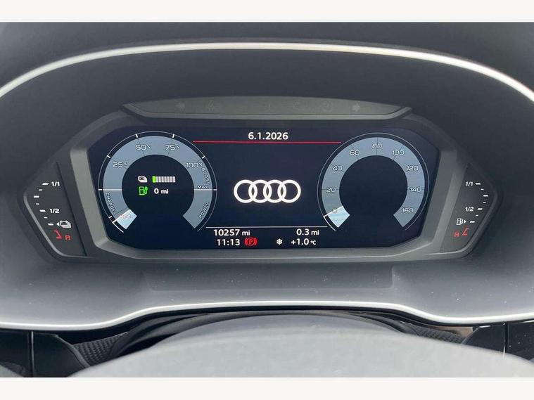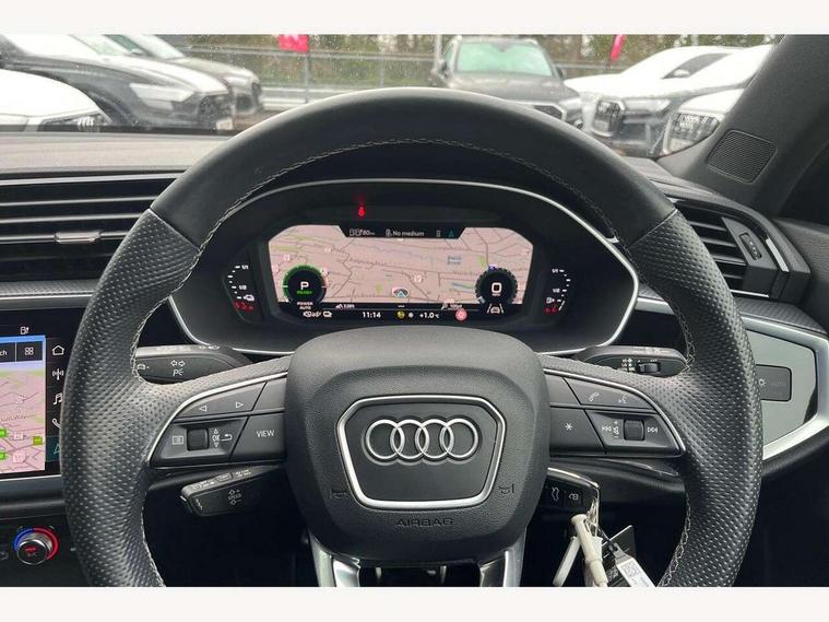 Amazon alexa Integration, Audi drive select, Audi lane departure warning, Audi Virtual Cockpit - 10.25" display, Bluetooth interface, Camera based traffic sign recognition, Legal emergency call, MMI Navigation Plus with high resolution 10.1 inch touchscreen colour display, Power operated tailgate, Progressive steering, Service interval indicator, Smartphone interface includes wireless Apple carplay/Android Auto, Start stop system with recuperation, Voice control system with natural language interaction, 3 pin 10 amp domestic charging cable, 3.6 kw On-board charger, Type 2 mode 3 32 amp charging cable, Type 2 socket for AC charging, 2 USB-C ports with charge and data functions, 6 passive loudspeakers, DAB digital radio module, Acoustic windscreen, Aluminium roof rails, Aluminium window trim, Auto dimming frameless rear view mirror, Body colour front spoiler blade, Body coloured bumpers, Electrically folding, adjustable and heated door mirrors with integrated LED side indicators and kerb view function for passenger side, Front and rear electric windows, Front fog lights, Front side air inlets in matt platinum grey, Grille vertical bars in aluminium silver/Matt, High gloss black finish B and C pillars, LED headlights with LED daytime running lights, LED rear lights, LED third brake light, Privacy glass dark tinted rear and rear-side windows (from B-pillar backwards), Rain and light sensors, Rear diffuser grille in grained matt black, Rear diffuser strip in matt titanium black, Rear side wing doors, Rear wiper, S line badges on front wings, S Line front and rear bumpers, Side skirt insert in matt Platinium grey, Titanium black radiator grille, Variable front intermittent wipers, 12V socket in rear centre console, 3 seat bench in 2nd row, 40:20:40 folding with manual adjustment for 60:40 forwards/backwards position and backrest angle, Adjustable rear seat bench/backrest with centre armrest and cupholder, Black cloth headlining, Dual zone electronic climate control, Front and rear black floor mats with contrast stitching in rock grey, Front and rear headrests, Front and rear roof module including reading lights, Front centre armrest, Glove compartment lighting, Height and reach adjustable steering wheel, Illuminated door sill trims with S logo, ISOFIX child seat mounting for front passenger with airbag deactivation and outer rear seat including top tether attachment point for outer rear seats, Luggage compartment light, Manual front seats with height adjustment, Perforated leather gearknob, Single front passenger seat, Stainless steel luggage compartment sill finisher, Stainless steel pedals, Non smoking pack - Q3, 3x3 point rear seatbelts, 6 airbags - Driver, front passenger, curtain and side windows, Audi pre-sense front with pedestrain and cyclist recognition, Electromechanical parking brake, Electronic stabilisation control including ABS, ASR and EDL, Front seatbelt reminder, Hill descent control, Hill hold assist, Manual child lock in rear doors, Pre sense basic, Seatbelt monitoring, Tyre pressure warning, Warning triangle and first aid kit, Anti theft alarm, Anti theft wheel bolts, Immobiliser, Remote central locking, Dark matt brushed aluminium inlay, Detail dashboard around MMI touch colour display in glass look, black with surround in aluminium look, Leatherette door armrest, Tool kit, Tyre repair kit,