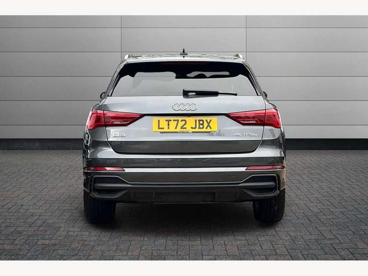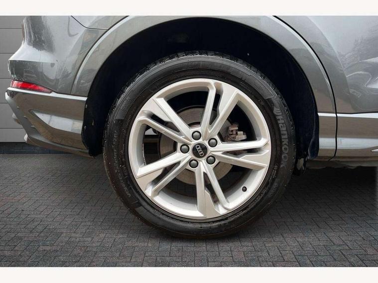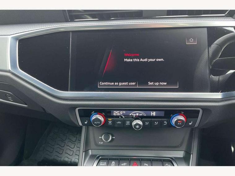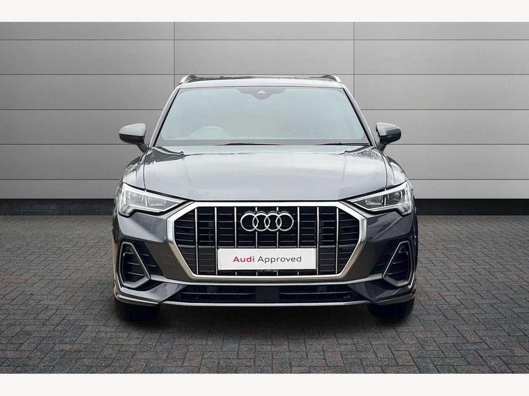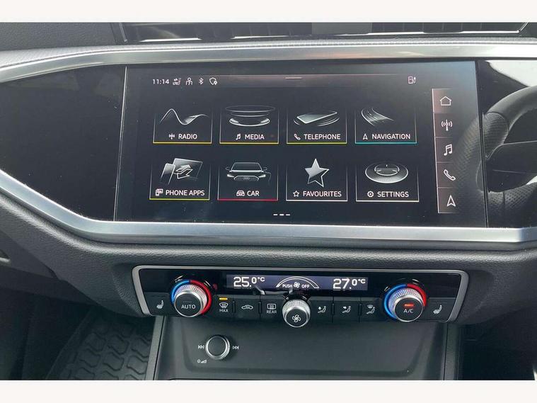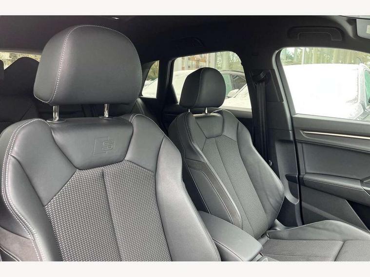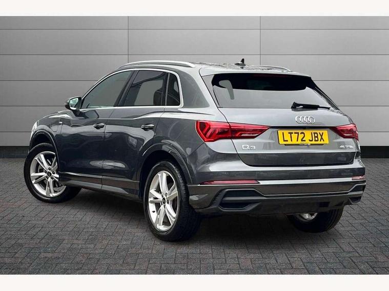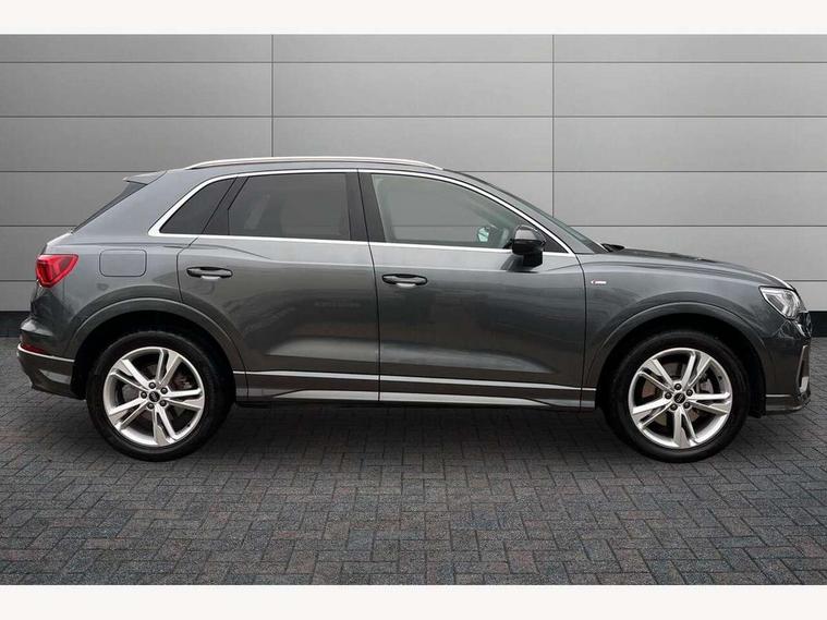 Amazon alexa Integration, Audi drive select, Audi lane departure warning, Audi Virtual Cockpit - 10.25" display, Bluetooth interface, Camera based traffic sign recognition, Legal emergency call, MMI Navigation Plus with high resolution 10.1 inch touchscreen colour display, Power operated tailgate, Progressive steering, Service interval indicator, Smartphone interface includes wireless Apple carplay/Android Auto, Start stop system with recuperation, Voice control system with natural language interaction, 3 pin 10 amp domestic charging cable, 3.6 kw On-board charger, Type 2 mode 3 32 amp charging cable, Type 2 socket for AC charging, 2 USB-C ports with charge and data functions, 6 passive loudspeakers, DAB digital radio module, Acoustic windscreen, Aluminium roof rails, Aluminium window trim, Auto dimming frameless rear view mirror, Body colour front spoiler blade, Body coloured bumpers, Electrically folding, adjustable and heated door mirrors with integrated LED side indicators and kerb view function for passenger side, Front and rear electric windows, Front fog lights, Front side air inlets in matt platinum grey, Grille vertical bars in aluminium silver/Matt, High gloss black finish B and C pillars, LED headlights with LED daytime running lights, LED rear lights, LED third brake light, Privacy glass dark tinted rear and rear-side windows (from B-pillar backwards), Rain and light sensors, Rear diffuser grille in grained matt black, Rear diffuser strip in matt titanium black, Rear side wing doors, Rear wiper, S line badges on front wings, S Line front and rear bumpers, Side skirt insert in matt Platinium grey, Titanium black radiator grille, Variable front intermittent wipers, 12V socket in rear centre console, 3 seat bench in 2nd row, 40:20:40 folding with manual adjustment for 60:40 forwards/backwards position and backrest angle, Adjustable rear seat bench/backrest with centre armrest and cupholder, Black cloth headlining, Dual zone electronic climate control, Front and rear black floor mats with contrast stitching in rock grey, Front and rear headrests, Front and rear roof module including reading lights, Front centre armrest, Glove compartment lighting, Height and reach adjustable steering wheel, Illuminated door sill trims with S logo, ISOFIX child seat mounting for front passenger with airbag deactivation and outer rear seat including top tether attachment point for outer rear seats, Luggage compartment light, Manual front seats with height adjustment, Perforated leather gearknob, Single front passenger seat, Stainless steel luggage compartment sill finisher, Stainless steel pedals, Non smoking pack - Q3, 3x3 point rear seatbelts, 6 airbags - Driver, front passenger, curtain and side windows, Audi pre-sense front with pedestrain and cyclist recognition, Electromechanical parking brake, Electronic stabilisation control including ABS, ASR and EDL, Front seatbelt reminder, Hill descent control, Hill hold assist, Manual child lock in rear doors, Pre sense basic, Seatbelt monitoring, Tyre pressure warning, Warning triangle and first aid kit, Anti theft alarm, Anti theft wheel bolts, Immobiliser, Remote central locking, Dark matt brushed aluminium inlay, Detail dashboard around MMI touch colour display in glass look, black with surround in aluminium look, Leatherette door armrest, Tool kit, Tyre repair kit,