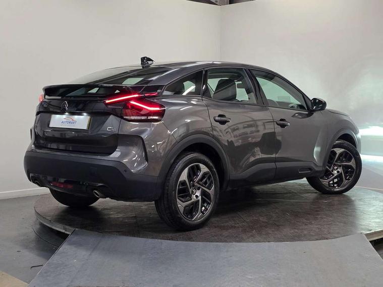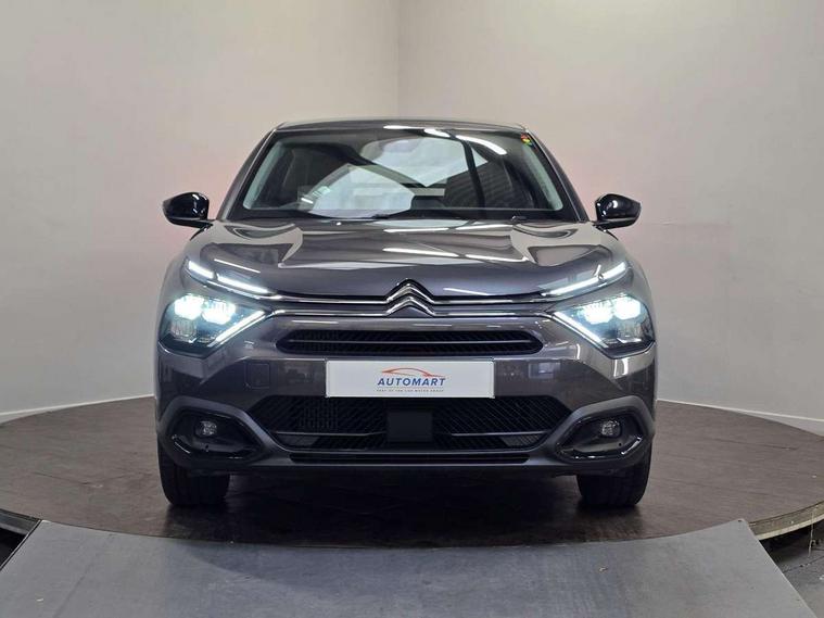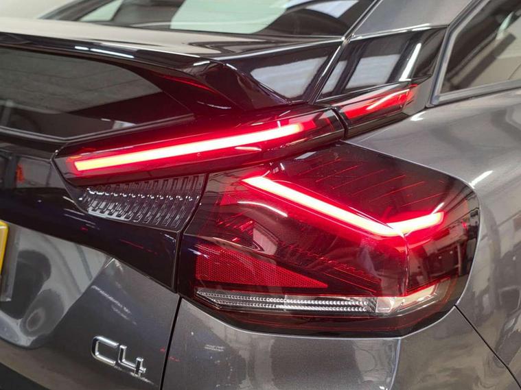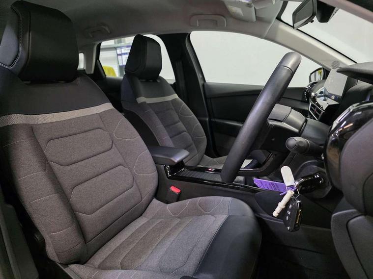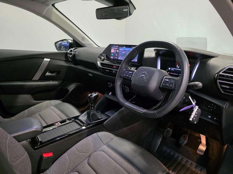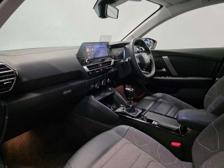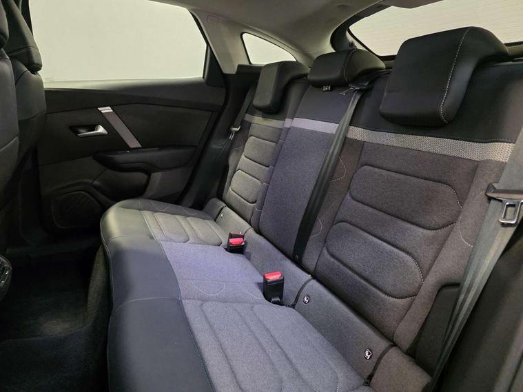 5.5 inch backlit full TFT driver's instrument cluster with LED ambient lighting, Apple car play and Android auto, Citroen connect box emergency and assistance system, Citroen Smart Pad Support - integrated support for attaching a tablet computer for front passenger, Cruise control + speed limiter, Driver's head-up display, Electronic Power Steering (EPS), In-crash braking, My Citroen Drive Plus: 10" high-resolution touchscreen user interface, controlling media, connectivity, vehicle settings + connected nav, Rear parking sensors, Tailgate, Top rear vision reversing camera, Voice commands, Advanced comfort suspension - double hydraulic stops on front and rear suspension, 6 speakers, Bluetooth telephone and audio streaming, DAB Digital radio, 3rd brake light, Automatic headlights, Body colour bumpers, Body colour door handles, Boot spoiler, Electrically heated, folding and adjustable external rear view mirrors, Front and rear electric windows, Gloss black rear skirt, LED daytime running lights in V signature, LED front fog lamps with static cornering function, LED front headlamps, Perla Nera black painted external rear view mirrors, Rain sensing automatic front windscreen wipers, Rear side wing doors, Rear wiper, Shark fin roof aerial, Standard interior rear-view mirror with manual day-night switching, Welcome and goodbye lighting, 12V power outlet, 1x USB Type-C socket charging & data connection and 1x USB Type-A socket in 1st row and 1x USB Type-A socket charging in 2nd row, 3 rear headrests, 3 seat bench in 2nd row, Boot light, Chevrons cloth and leather effect textile seat upholstery, Dashboard tray in front cabin, Driver and passenger sunvisors with illuminated vanity mirrors, Dual zone automatic air conditioning, Front and rear LED interior lighting, Front head restraints, Grained leather steering wheel with two command blocks, Height adjustable driver's seat with adjustable lumbar support, Height adjustable front passenger seat, Height and reach adjustable steering wheel, Map pockets in rear of front seats, Raised centre console with armrest and two cup holders, Single front passenger seat, Split folding rear seats, Two position boot floor, XXL storage in front cabin, High level acoustic insulation pack - C4/C4 X/e-C4 X, 3x3 point rear seatbelts, ABS, Driver and front passenger airbags, Electric parking brake, ESP, Front seatbelt pretensioners, Hill start assist, Manual child lock in second row, Manual deactivation of front passenger airbag, Row 1 and 2 curtain airbags, Row 1 side thorax airbags, Seatbelt unfastened on the move warning, Tyre underinflation detection, Anti-theft alarm (volumetric protection), Immobiliser, Remote locking with deadlocks, Two remote keys, 18" Bi-tone painted aeroblade alloy wheels with anti-theft locking wheel nuts, Puncture repair kit with compressor,