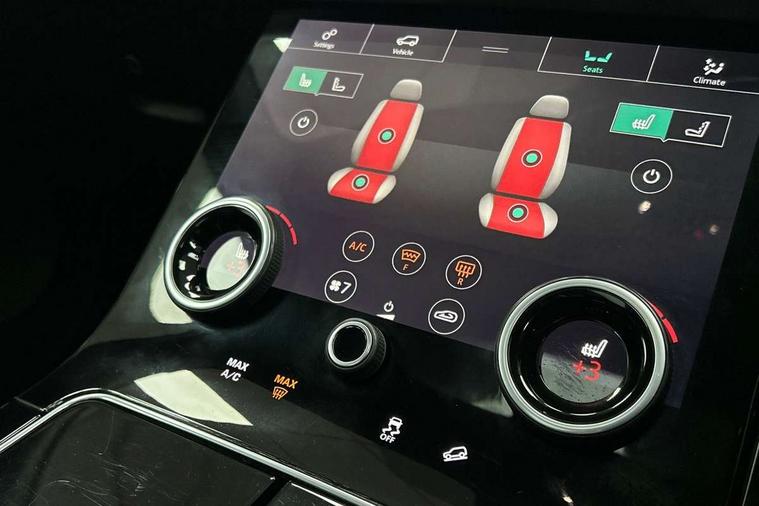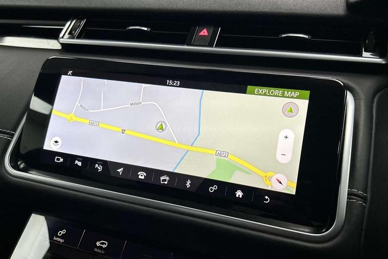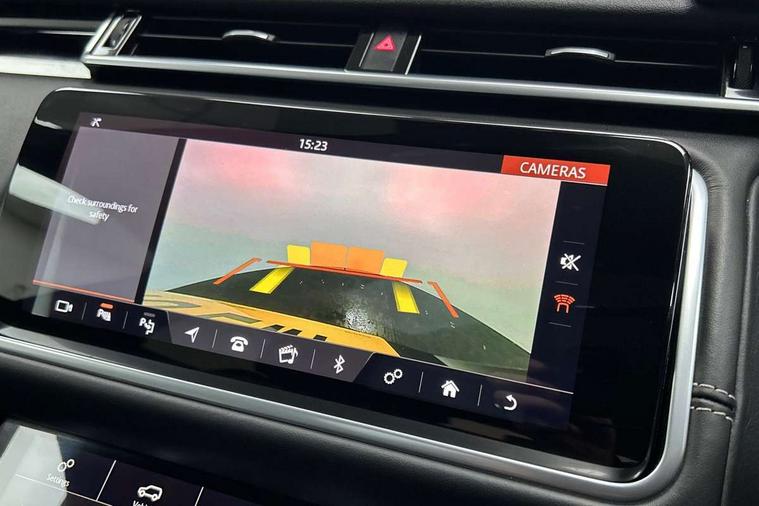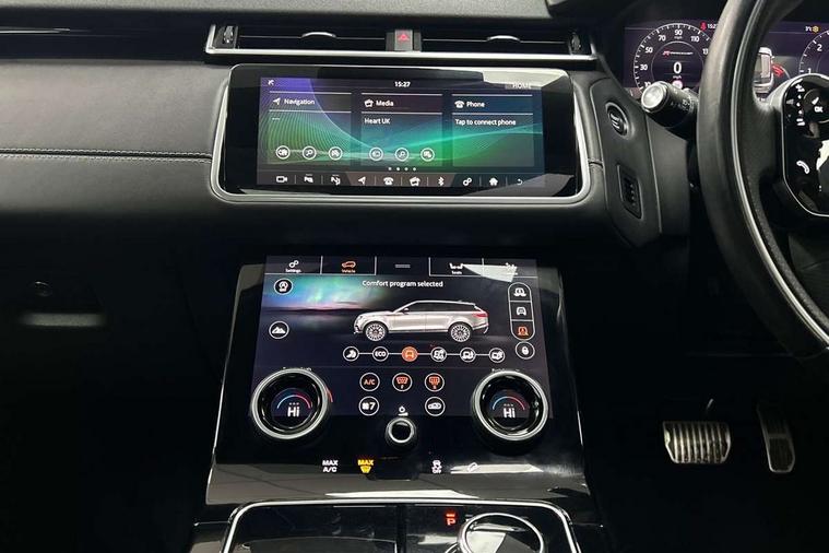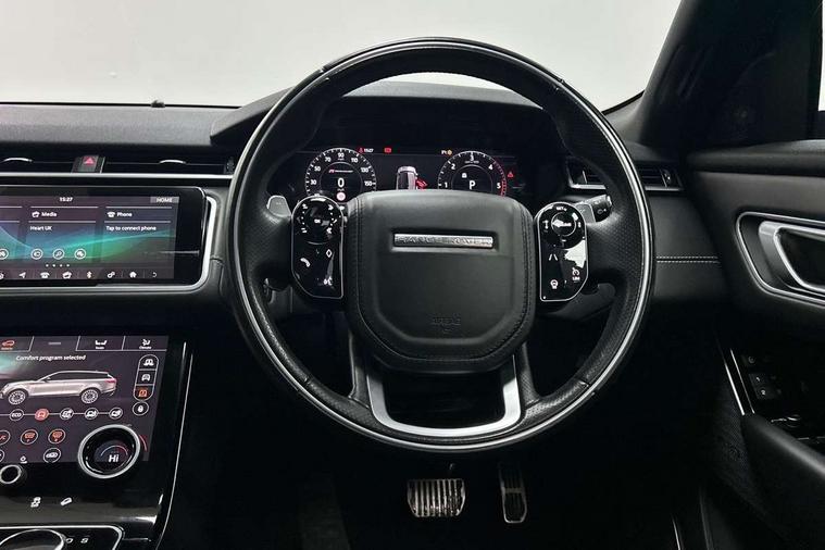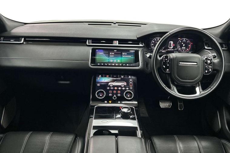 360 Parking aid sensors, Android Auto, Apple car play, Blind spot assist, Bluetooth connectivity, Brake pad wear indicator warning light, Driver condition monitor, InControl remote, InControl Touch navigation pro, Interactive Driver display instrument cluster, Land Rover InControl apps, Lane keep assist, Park Assist - Parallel Park/Parking Exit/Perpendicular park, Pro services and wifi hotspot, Rear traffic monitor, Service indicator, Speed proportional electronic power assisted steering (EPAS), Traffic sign recognition with adaptive speed limiter, Trip computer, Voice control system, 8 speed automatic transmission, Adaptive dynamics, Electronic air suspension, Open differential with torque vectoring by braking, Single speed transfer box, Digital Audio Broadcast radio-DAB, Steering wheel mounted controls, Acoustic laminated windscreen, Adaptive front lighting system, Auto dimming interior rear view mirror, Automatic headlamp levelling, Automatic headlights, Body coloured bumpers, Boot protection plate, Electric windows with one touch open/close and anti trap, Flush deployable exterior door handles, Follow me home headlights, Headlamp power wash, Heated rear window with timer, Heated windscreen + heated windscreen washer jets, Power fold, auto-dimming, heated door mirrors with approach lights, Rain sensor windscreen wipers, Rear fog lights, Rear wash/wipe, Tailgate/boot lid spoiler, Trailer stability assist, Velar and R-dynamic badge, 40:20:40 split folding rear seats, Adjustable front armrest, Bright metal pedals, Driver and passenger illuminated vanity mirror, Electric adjustable steering column, Isofix system on outer rear seats, Loadspace cover, Passive front headrests, Rear centre headrest, Satin chrome gearshift paddles, 350mm front brakes, 3x3 point rear seatbelts, Anti-lock braking system (ABS), Cornering brake control, Curtain airbags, Door side intrusion beams, Driver airbag, DSC - Dynamic Stability Control, Electronic brake force distribution, Electronic parking brake, Electronic traction control, Emergency brake assist, Front and rear seatbelt reminder, High speed emergency braking, Hill descent control, Hill launch assist, Low traction launch, Passenger airbag, Power operated child locks, Rear airbags, Roll stability control, Side airbags, Tyre pressure monitoring system, Unpainted brake calipers, Global lock and unlock switch on driver door, Immobiliser, Intrusion sensor, Keyless entry, Lock only switch on front passenger door, Perimetric alarm, Remote central locking,