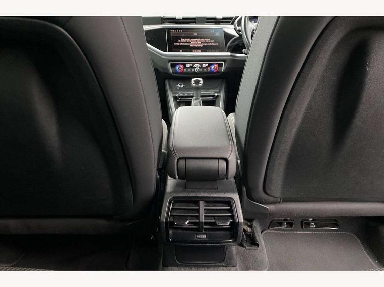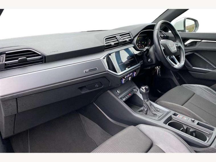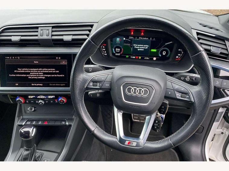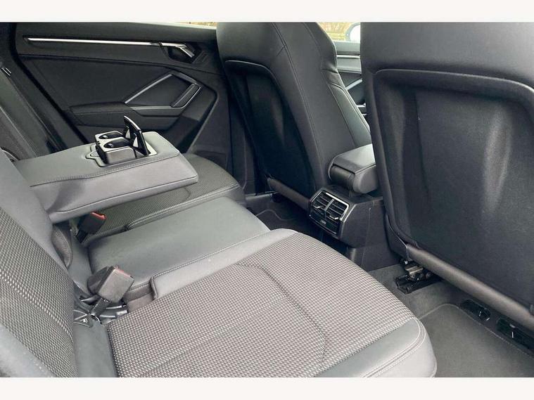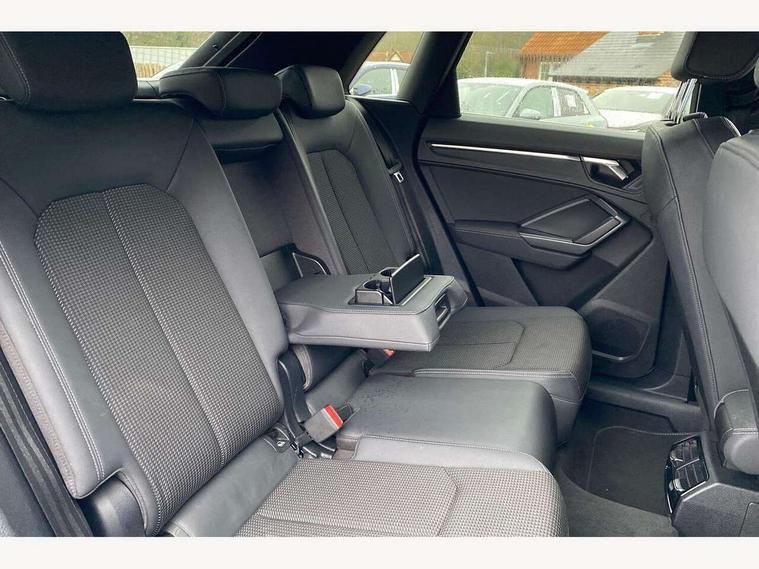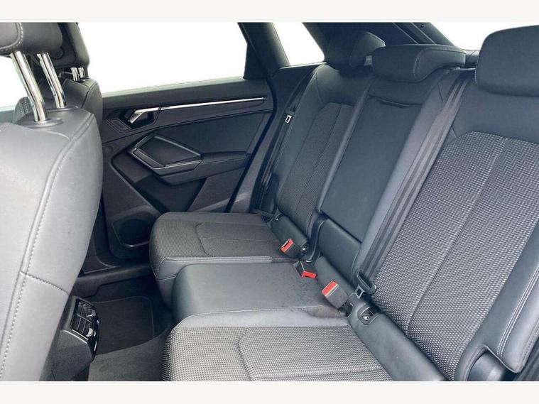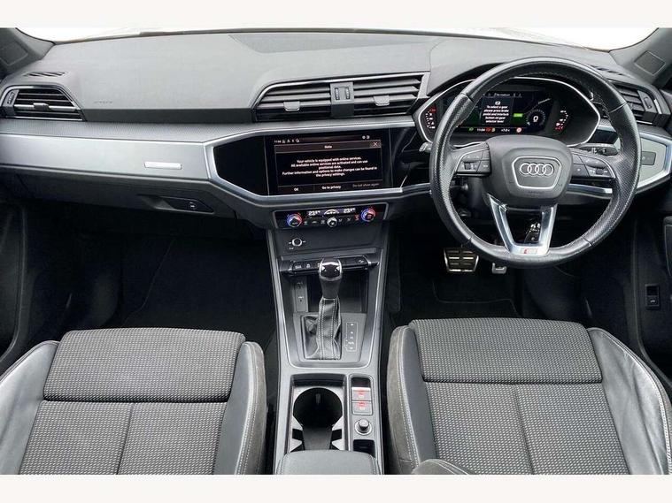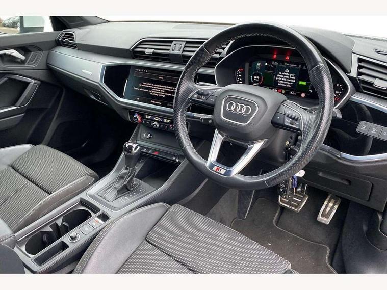 Amazon alexa Integration, Audi drive select, Audi lane departure warning, Audi Virtual Cockpit - 10.25" display, Bluetooth interface, Camera based traffic sign recognition, Legal emergency call, MMI Navigation Plus with high resolution 10.1 inch touchscreen colour display, Power operated tailgate, Progressive steering, Service interval indicator, Smartphone interface includes wireless Apple carplay/Android Auto, Start stop system with recuperation, Voice control system with natural language interaction, Diesel particulate filter, Sports suspension, 2 USB-C ports with charge and data functions, 6 passive loudspeakers, DAB digital radio module, Acoustic windscreen, Aluminium roof rails, Aluminium window trim, Auto dimming frameless rear view mirror, Body coloured bumpers, Electrically folding, adjustable and heated door mirrors with integrated LED side indicators and kerb view function for passenger side, Front and rear electric windows, Front fog lights, Front side air inlets in matt platinum grey, Front spoiler blade in matt platinum grey, Grille vertical bars in aluminium silver/Matt, High gloss black finish B and C pillars, LED headlights with LED daytime running lights, LED rear lights, LED third brake light, Privacy glass dark tinted rear and rear-side windows (from B-pillar backwards), Rain and light sensors, Rear diffuser grille in grained matt black, Rear diffuser strip in matt titanium black, Rear side wing doors, Rear wiper, S line badges on front wings, S Line front and rear bumpers, Side skirt insert in matt Platinium grey, Titanium black radiator grille, Variable front intermittent wipers, 12V socket in rear centre console, 3 seat bench in 2nd row, 40:20:40 folding with manual adjustment for 60:40 forwards/backwards position and backrest angle, Adjustable rear seat bench/backrest with centre armrest and cupholder, Black cloth headlining, Dual zone electronic climate control, Front and rear black floor mats with contrast stitching in rock grey, Front and rear headrests, Front and rear roof module including reading lights, Front centre armrest, Glove compartment lighting, Height and reach adjustable steering wheel, Illuminated door sill trims with S logo, ISOFIX child seat mounting for front passenger with airbag deactivation and outer rear seat including top tether attachment point for outer rear seats, Luggage compartment light, Manual front seats with height adjustment, Perforated leather gearknob, Single front passenger seat, Stainless steel luggage compartment sill finisher, Stainless steel pedals, Non smoking pack - Q3, 3x3 point rear seatbelts, 6 airbags - Driver, front passenger, curtain and side windows, Audi pre-sense front with pedestrain and cyclist recognition, Electromechanical parking brake, Electronic stabilisation control including ABS, ASR and EDL, Front seatbelt reminder, Hill descent control, Hill hold assist, Manual child lock in rear doors, Pre sense basic, Seatbelt monitoring, Tyre pressure warning, Warning triangle and first aid kit, Anti theft alarm, Anti theft wheel bolts, Immobiliser, Remote central locking, Dark matt brushed aluminium inlay, Detail dashboard around MMI touch colour display in glass look, black with surround in aluminium look, Leatherette door armrest,