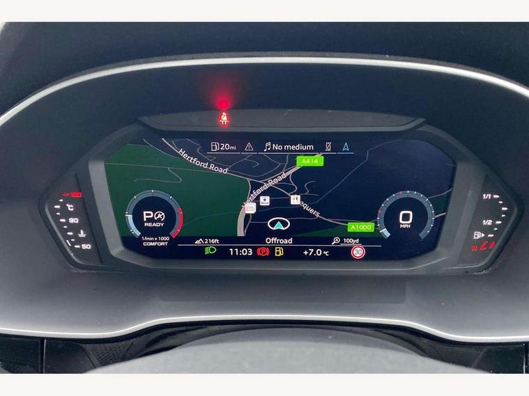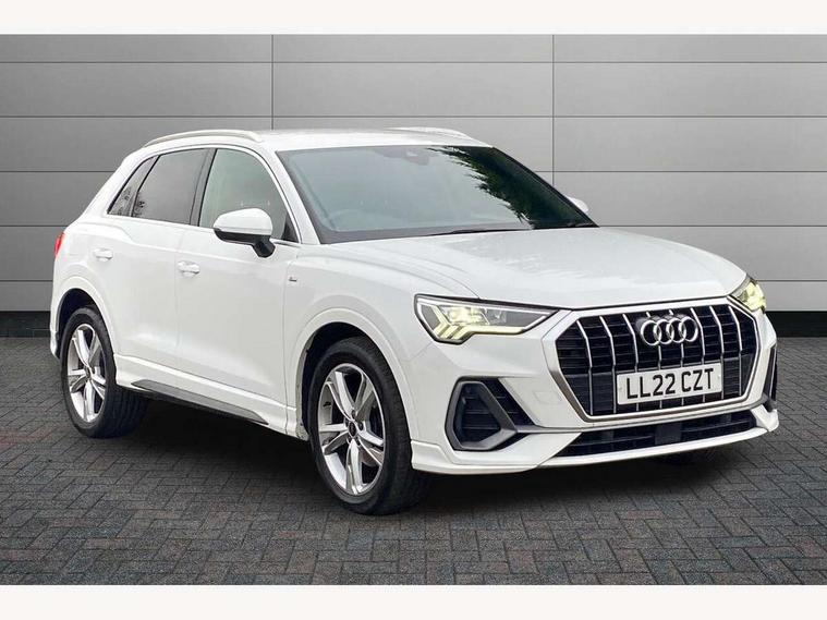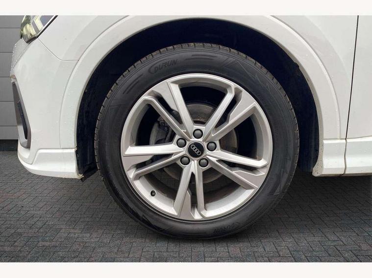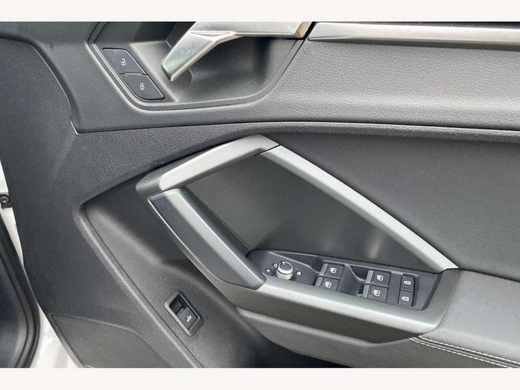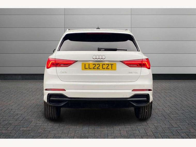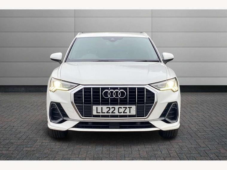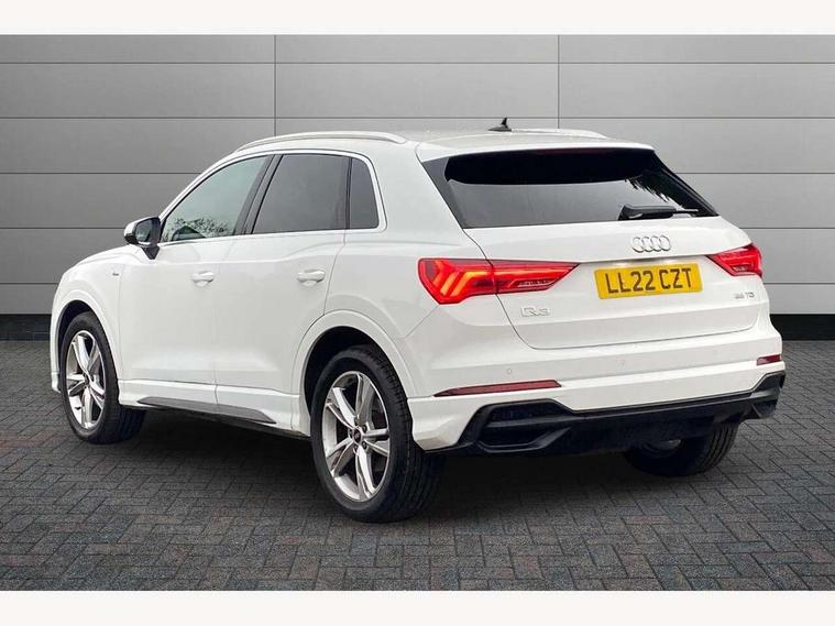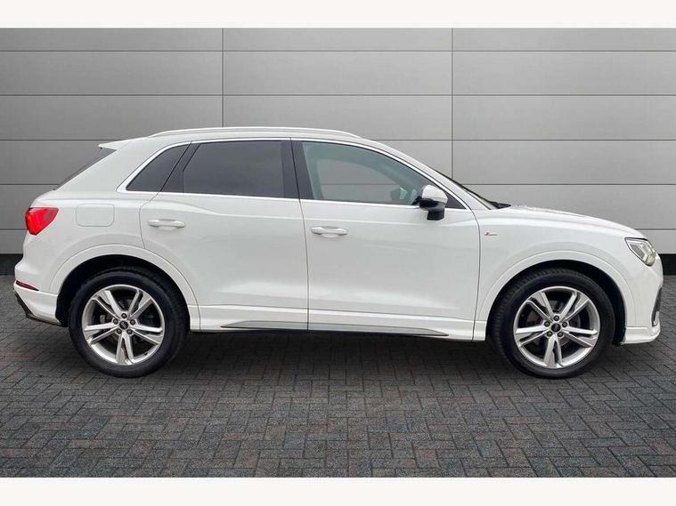 Amazon alexa Integration, Audi drive select, Audi lane departure warning, Audi Virtual Cockpit - 10.25" display, Bluetooth interface, Camera based traffic sign recognition, Legal emergency call, MMI Navigation Plus with high resolution 10.1 inch touchscreen colour display, Power operated tailgate, Progressive steering, Service interval indicator, Smartphone interface includes wireless Apple carplay/Android Auto, Start stop system with recuperation, Voice control system with natural language interaction, Diesel particulate filter, Sports suspension, 2 USB-C ports with charge and data functions, 6 passive loudspeakers, DAB digital radio module, Acoustic windscreen, Aluminium roof rails, Aluminium window trim, Auto dimming frameless rear view mirror, Body coloured bumpers, Electrically folding, adjustable and heated door mirrors with integrated LED side indicators and kerb view function for passenger side, Front and rear electric windows, Front fog lights, Front side air inlets in matt platinum grey, Front spoiler blade in matt platinum grey, Grille vertical bars in aluminium silver/Matt, High gloss black finish B and C pillars, LED headlights with LED daytime running lights, LED rear lights, LED third brake light, Privacy glass dark tinted rear and rear-side windows (from B-pillar backwards), Rain and light sensors, Rear diffuser grille in grained matt black, Rear diffuser strip in matt titanium black, Rear side wing doors, Rear wiper, S line badges on front wings, S Line front and rear bumpers, Side skirt insert in matt Platinium grey, Titanium black radiator grille, Variable front intermittent wipers, 12V socket in rear centre console, 3 seat bench in 2nd row, 40:20:40 folding with manual adjustment for 60:40 forwards/backwards position and backrest angle, Adjustable rear seat bench/backrest with centre armrest and cupholder, Black cloth headlining, Dual zone electronic climate control, Front and rear black floor mats with contrast stitching in rock grey, Front and rear headrests, Front and rear roof module including reading lights, Front centre armrest, Glove compartment lighting, Height and reach adjustable steering wheel, Illuminated door sill trims with S logo, ISOFIX child seat mounting for front passenger with airbag deactivation and outer rear seat including top tether attachment point for outer rear seats, Luggage compartment light, Manual front seats with height adjustment, Perforated leather gearknob, Single front passenger seat, Stainless steel luggage compartment sill finisher, Stainless steel pedals, Non smoking pack - Q3, 3x3 point rear seatbelts, 6 airbags - Driver, front passenger, curtain and side windows, Audi pre-sense front with pedestrain and cyclist recognition, Electromechanical parking brake, Electronic stabilisation control including ABS, ASR and EDL, Front seatbelt reminder, Hill descent control, Hill hold assist, Manual child lock in rear doors, Pre sense basic, Seatbelt monitoring, Tyre pressure warning, Warning triangle and first aid kit, Anti theft alarm, Anti theft wheel bolts, Immobiliser, Remote central locking, Dark matt brushed aluminium inlay, Detail dashboard around MMI touch colour display in glass look, black with surround in aluminium look, Leatherette door armrest,
