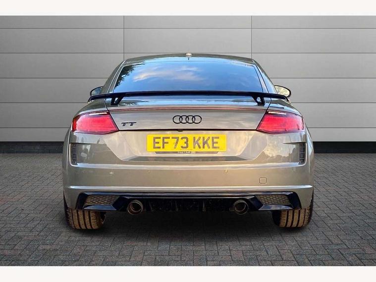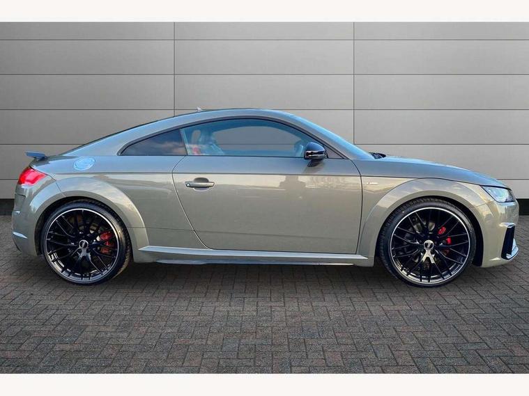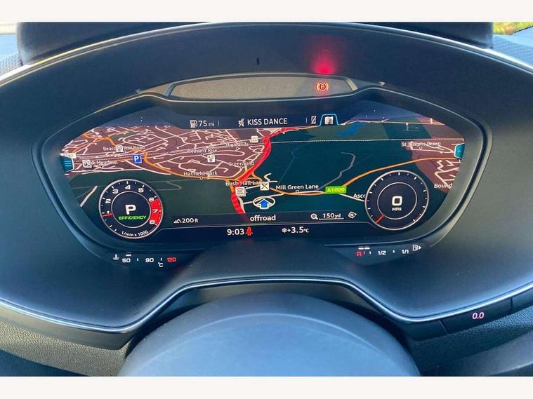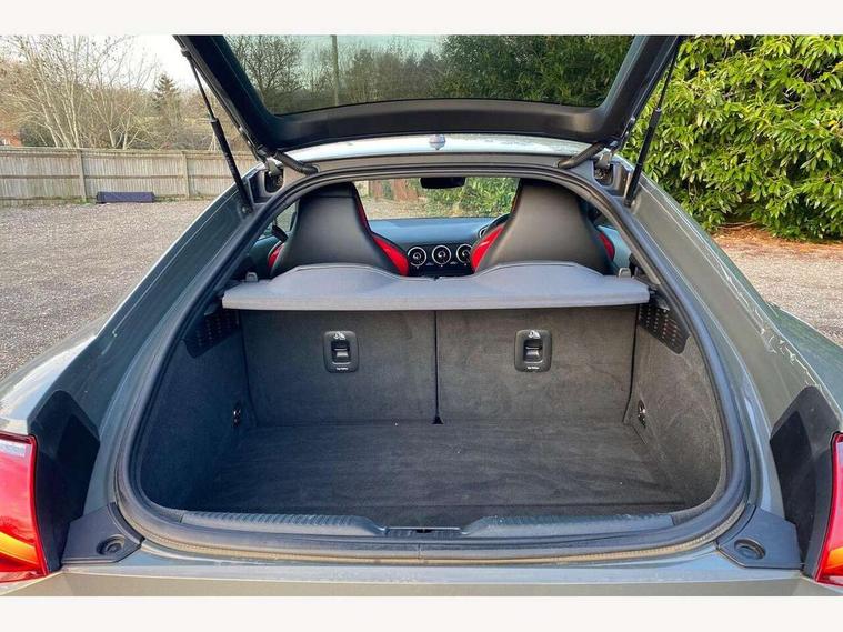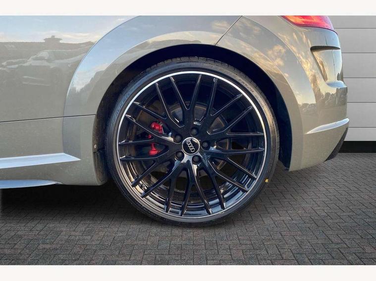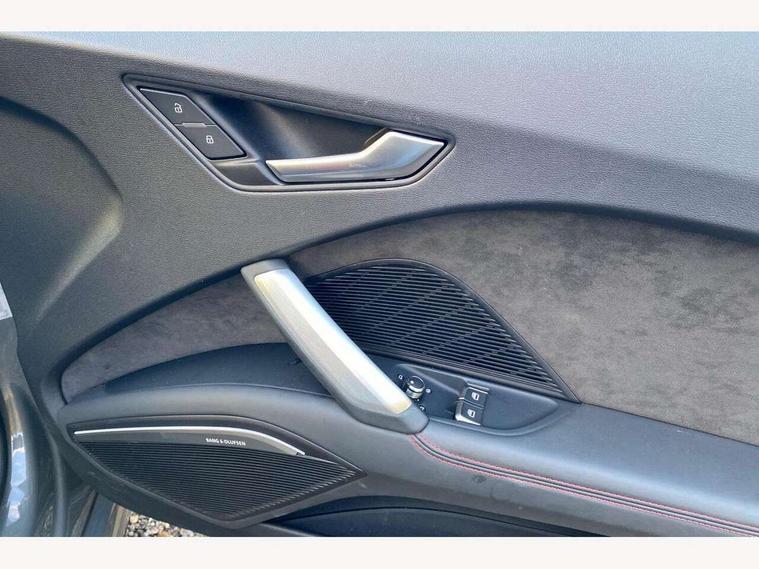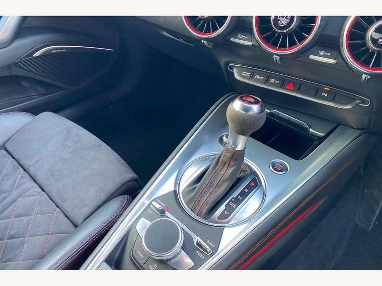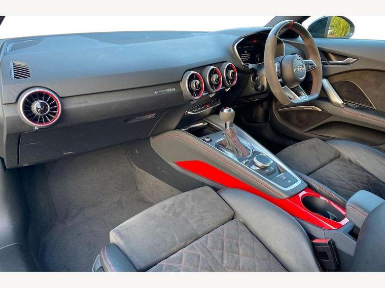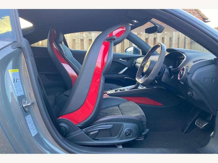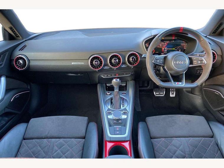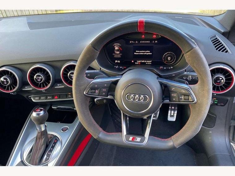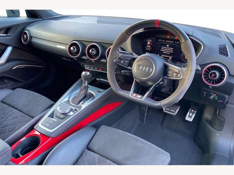 Audi drive select with 4 Pre configured modes, Audi smartphone interface, Audi virtual cockpit - 12.3" high-resolution LCD display with fully customisable instrument cluster, Cruise control + speed limiter, Emergency call service, Mobile phone preparation with bluetooth interface, Progressive power assisted steering, Rear parking sensors, Service interval indicator, Start/Stop system with energy recuperation, TP memo, Sports suspension, 8 Speakers, AM/FM radio, Bluetooth audio streaming, DAB Digital radio, Audi Beam uses LEDs to project the Audi Sport logo, Audi rings decals, Auto dimming rear view mirror, Auto headlight range control, Black chrome tailpipe, Black door mirrors, Dark privacy glass from B-pillar backwards, Electric folding door mirrors, Electric front windows, Electrically adjustable and heated door mirrors with integrated LED side indicators, Heat insulating glass in windshield, Heat reflecting windows, LED 3rd brake light, LED daytime running lights, LED headlights with LED rear lights + dynamic rear indicators, Light and rain sensors, Rear boot, 12V socket, 2 rear seats, 3 spoke flat bottomed high multi-function leather sport steering wheel with gearshift paddles, 4 way electric lumbar support for driver and front passenger, Alcantara leather with 12o'clock marker and express red contrast stitching in steering wheel, Alcantara/leather upholstery with S embossing + contrasting express red stitching on upholstery, Steering wheel and gear knob gaiter, Black headlining, Door sill trims, Extended aluminium look with stainless steel pedals, Front centre armrest, Front passenger seat, Front super sports seats, Heated front seats, Integrated head restraints, ISOFIX child seat mounting for front passenger seat with airbag deactivation, Manual adjustment of seat height, fore/aft position, seat angle, seat depth and backrest angle, Rear head restraints, Rear top tether child seat ISOFIX attachment, Red piped floor mats, Split folding rear seat, Black styling package - TT, Leather pack - TT, LED interior light pack - TT/TTS, Non smoking pack - TT/TT RS, Technology pack without Audi phone box - TT, 3 point front seat belts, ABS, ASR traction control, Curtain airbags, Driver and front passenger airbag with front passenger airbag deactivation, EDL traction control, Electromechanical parking brake, ESP, First aid kit, Front side airbags, Head airbags, Hill hold assist, Red brake callipers, Seatbelt warning, Tyre pressure loss indicator, Warning triangle, Anti theft alarm, Anti theft wheel bolts, Immobiliser, Keyless Go, Remote central locking, Matt brushed aluminium inlays, Tool kit, Tyre repair kit,