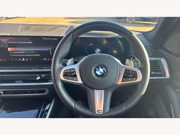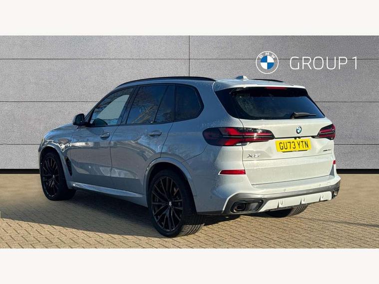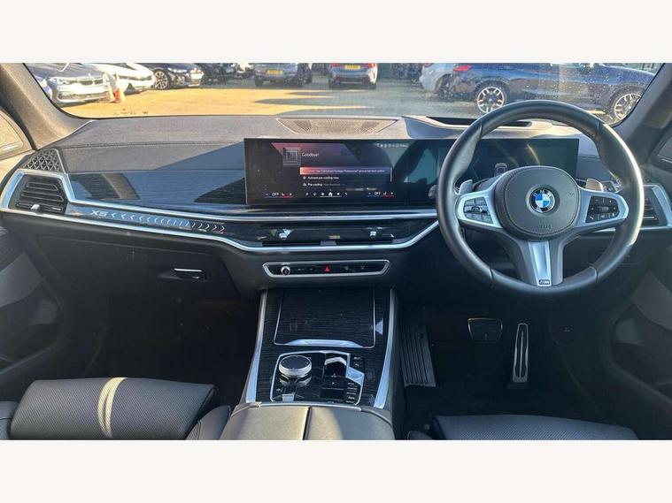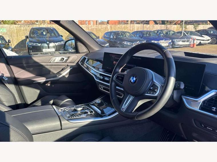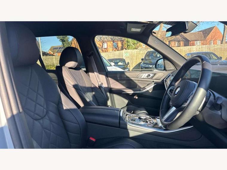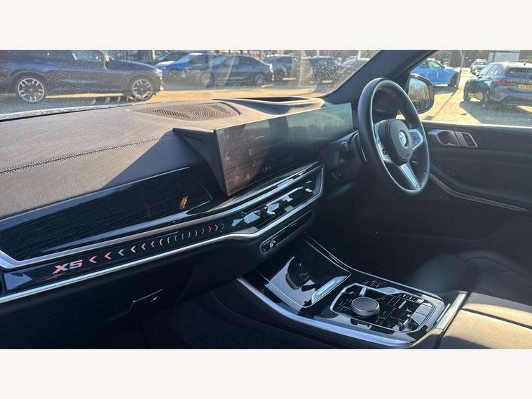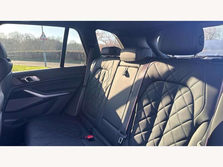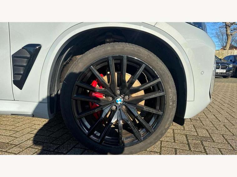 Attentiveness assist, Automatic tailgate operation, BMW ConnectedDrive online services, BMW live cockpit + with curved 12.3 instrument cluster/14.9 central display, nav/Tuner with diversity reception, RDS/4GLTE/remote software upgrade, BMW Recovery system, BMW Teleservices, Condition based service, Cruise control with brake assist, eCall emergency call system, Enhanced bluetooth with wireless charging, Integrated owner's handbook, PAS, Speed limiter, Wi-Fi hotspot, Drive performance control with ECO PRO comfort + sport mode, Eight speed steptronic sport automatic transmission and gearshift paddles on the steering wheel, Hi-Fi loudspeaker system, Adaptive LED Headlights, Front and rear electric windows, High beam assistant, High gloss black shadow line roof rails, LED daytime running lights, Rear side wing doors, Third brake light in rear spoiler, Variable intermittent rear wash/wipe, 12V - Power sockets with 2x centre console and 1x luggage compartment, 3 seat bench in 2nd row, Foldable rear centre armrest with 2 cupholders and storage compartment, Front and rear side armrest integrated into door trim, Headrests for all seats, Luggage compartment separating net, Single front passenger seat, Three spoke sport M leather steering wheel, Velour floormats, Ambient light interior pack - X5, Driving assistant pack with radar based driver assistance system - X5, Expanded exterior mirror pack - X5/X5 M, M aerodynamics pack - X5, 3 rear seatbelts, Active protection, Airbags - driver/front passenger, rear and side, first and second row seats head airbags, front passenger seat airbag deactivation + knee airbag, Anti-lock braking system (ABS), Automatic Stability Control (ASC), Brake energy regeneration, Cornering brake control (CBC), Crash sensor activating central locking release, hazard warning lights, fuel cut off, interior lighting + activation of safety battery terminal clamp, DSC - Dynamic Stability Control, Dynamic Traction Control - DTC, Electromechanical parking brake with automatic drive away release and auto hold function, Electronic brake force distribution, Hill start assistant, M Sport blue painted brake calipers with 'M' designation, Mechanical child proof lock on rear doors, Tyre pressure monitoring system, Tyre pressure sensors, Ventilated front and rear disc brakes, Warning triangle and first aid kit, Closing system with central locking, Comfort access system, Locking wheel bolts, Sensatec instrument panel,