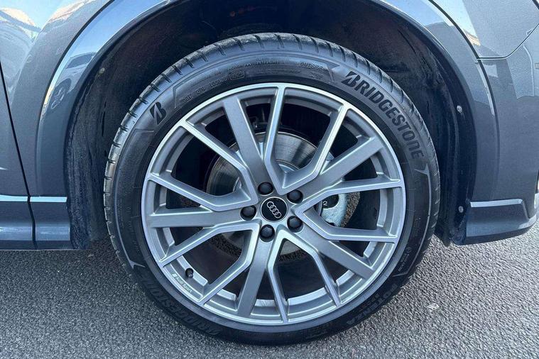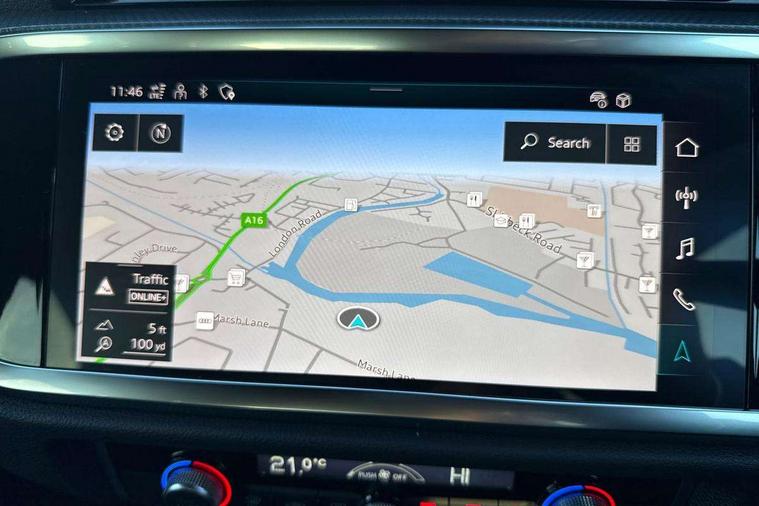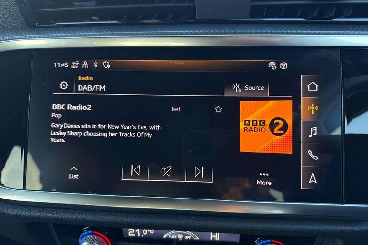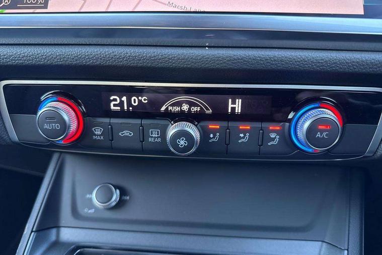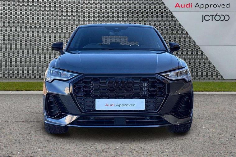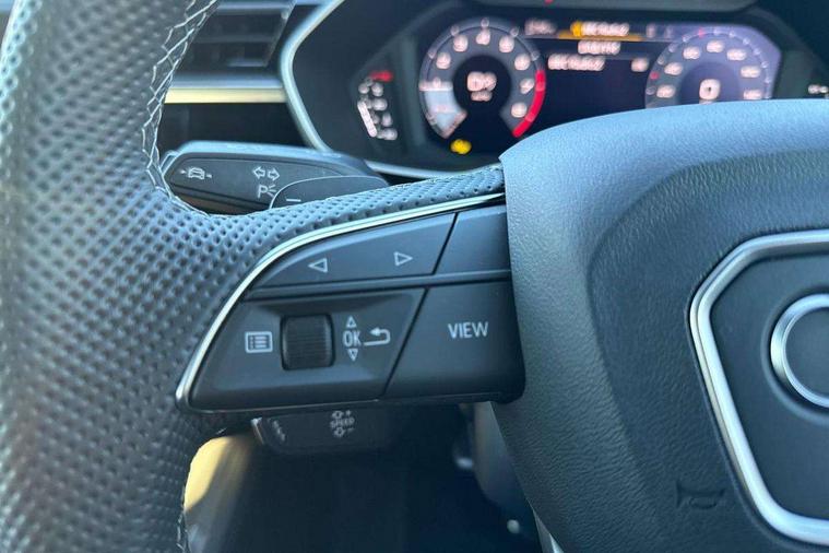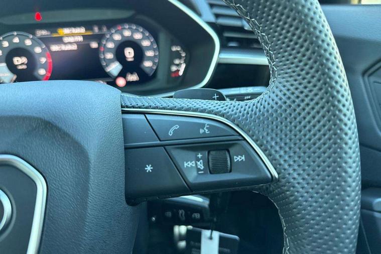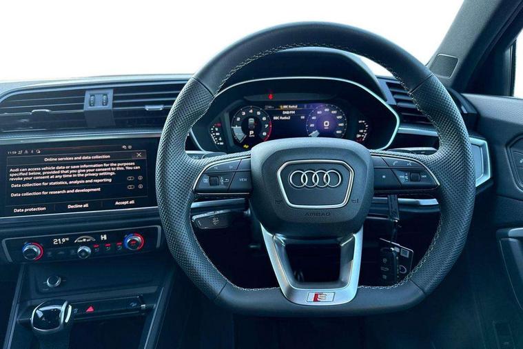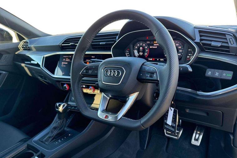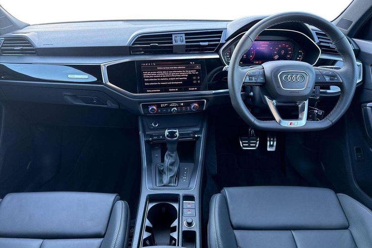Audi connect safety and service, Audi drive select, Audi lane departure warning, Audi Virtual Cockpit - 10.25" display, Bluetooth interface, Camera based traffic sign recognition, Distraction and Fatigue warning, Legal emergency call, MMI Navigation Plus with high resolution 10.1 inch touchscreen colour display, Power operated tailgate, Progressive steering, Service interval indicator, Smartphone interface includes wireless Apple carplay/Android Auto, Start stop system with recuperation, Voice control system with natural language interaction, Sports suspension, 2 USB-C ports with charge and data functions, 6 passive loudspeakers, DAB digital radio module, Acoustic windscreen, Audi Beam uses LEDs to project the Audi logo onto the ground as you exit your Q3, Auto dimming door mirrors, Auto dimming frameless rear view mirror, Electrically folding, adjustable and heated door mirrors with integrated LED side indicators and kerb view function for passenger side, Front and rear electric windows, Front fog lights, Front underbody protection in manhattan grey paint finish, High gloss black finish B and C pillars, Honeycomb design radiator grille in matt anthracite black, LED Dynamic rear indicators, LED headlights with LED daytime running lights, LED rear lights, LED third brake light, Privacy glass dark tinted rear and rear-side windows (from B-pillar backwards), Rain and light sensors, Rear diffuser grille in grained matt black, Rear diffuser strip in matt anthracite black, Rear side wing doors, Rear underbody protection in matt black, Rear wiper, S line front and rear bumpers and side skirts in contrasting Manhattan grey paint finish, Variable front intermittent wipers, 12V socket in rear centre console, 3 seat bench in 2nd row, 40:20:40 folding with manual adjustment for 60:40 forwards/backwards position and backrest angle, Adjustable rear seat bench/backrest with centre armrest and cupholder, Black carpet mats, Black cloth headlining, Dual zone electronic climate control, Electric lumbar support, Front and rear black floor mats with contrast stitching in rock grey, Front and rear headrests, Front centre armrest, Height and reach adjustable steering wheel, Illuminated door sill trims with S logo, ISOFIX child seat mounting for front passenger with airbag deactivation and outer rear seat including top tether attachment point for outer rear seats, Luggage compartment sill protection in stainless steel, Manual front seats with height adjustment, Perforated leather gearknob, Single front passenger seat, Stainless steel pedals, Twin leather upholstery with front sport seats + S embossing, Black styling pack - Q3, Non smoking pack - Q3, 3x3 point rear seatbelts, 6 airbags - Driver, front passenger, curtain and side windows, Audi pre-sense front with pedestrain and cyclist recognition, Electrically operated child locks on rear doors, Electromechanical parking brake, Electronic stabilisation control including ABS, ASR and EDL, Front seatbelt reminder, Hill descent control, Hill hold assist, Pre sense basic, Seatbelt monitoring, Tyre pressure warning, Warning triangle and first aid kit, Anti theft wheel bolts, Immobiliser, Remote central locking, Thatcham approved category 1 anti theft alarm, Aluminium look interior elements, Detail dashboard around MMI touch colour display in glass look, black with surround in aluminium look, Leatherette door armrest, Piano black inlay,