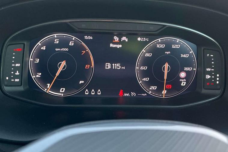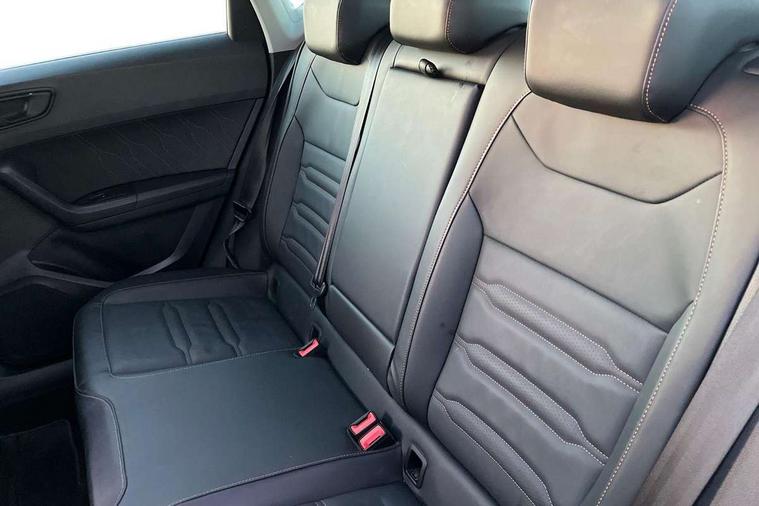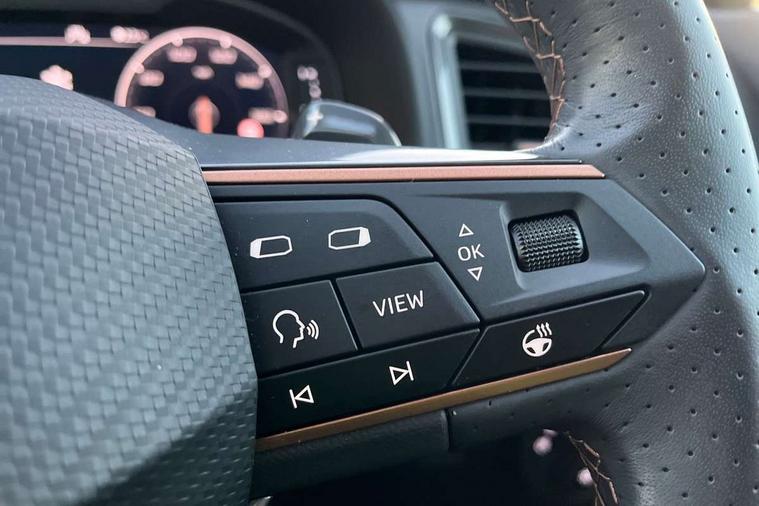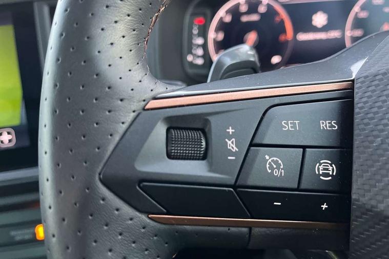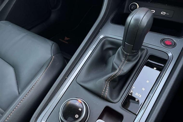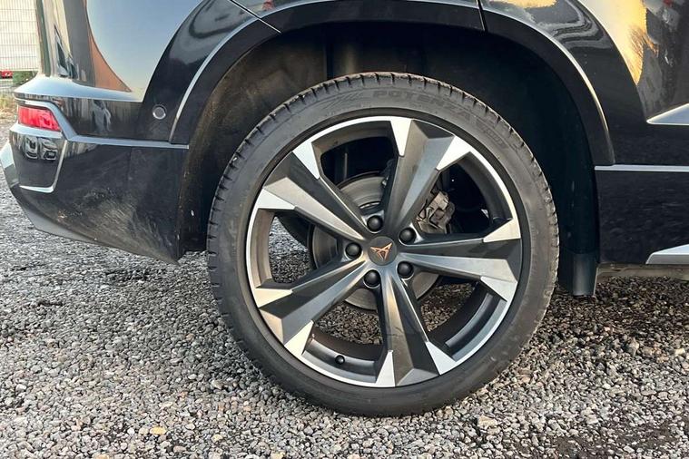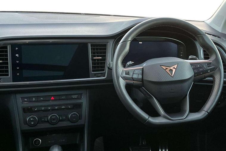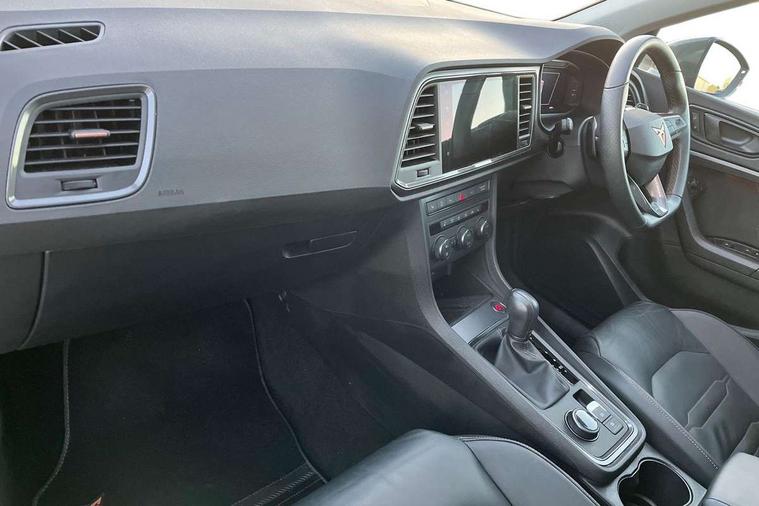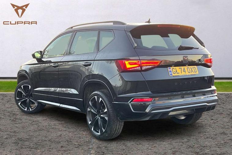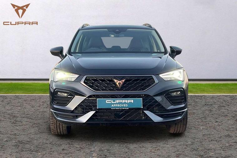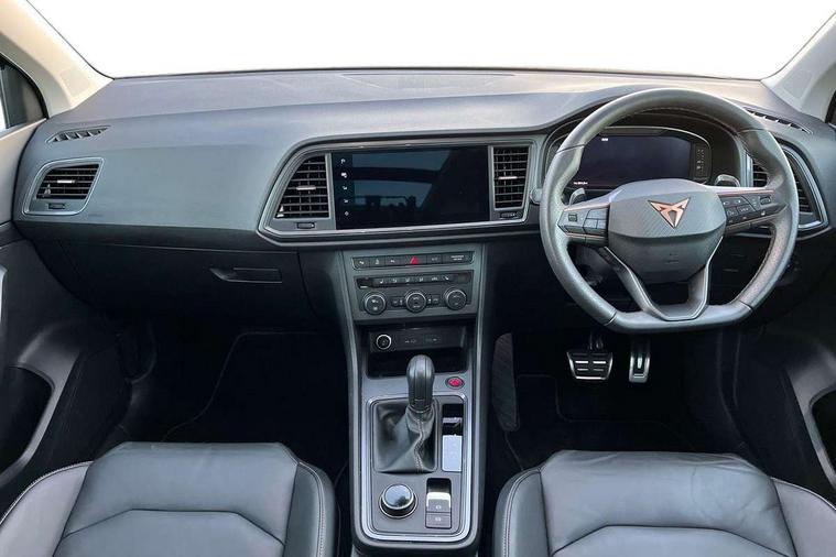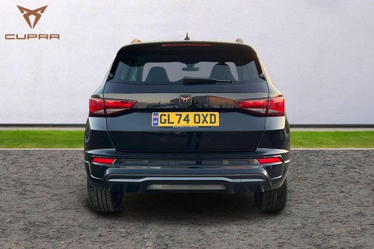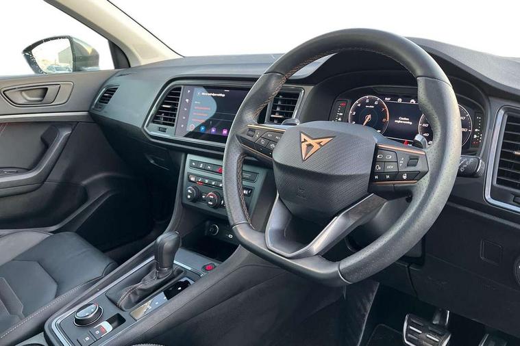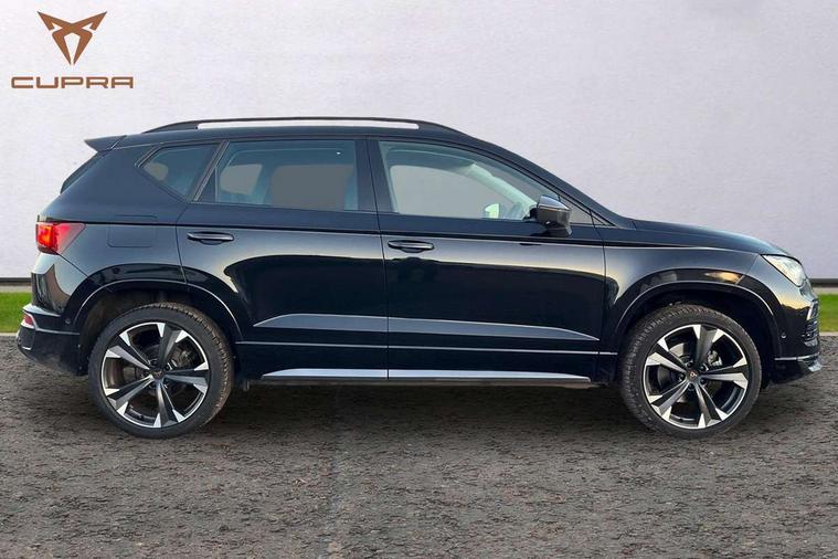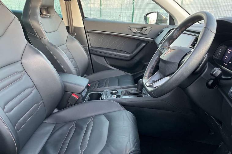 Cruise control system with speed limiter, Digital cockpit, Driving profile selection and conventional shock absorber, E-call, Electric tailgate with virtual pedal, Outside temperature gauge, Progressive power assisted steering, Rear view camera, Self parking functionality (includes front and rear parking sensors), Trip computer, wired and wireless full link smartphone integration, Wireless phone charger, Front and rear shock absorption, chassis with increased ride height, Steering wheel mounted audio/phone controls, Body colour bumpers with dark aluminium diffusor, Body coloured wheel arch surrounds, Dark tinted rear windows, Daytime running lights, Door mirrors with welcome CUPRA light silhouette, Dynamic headlight range control with self adjusting whilst driving, Electric adjustable/heated/folding door mirrors, Front and rear electric windows, Front grille frame in chrome, Full LED headlamps with lens and LED front fog lamps with cornering function, Gloss black door mirrors, Gloss black roof rails, Gloss black side mouldings, Gloss black side window trim, Illuminated aluminium front door sill, LED rear tail lights with dynamic indicators, Rear fog lights, Rear side wing doors, Rear spoiler, Rear wash/wipe, Specific CUPRA design front bumper, Standard rear exhaust tailpipes, Third brake light, 12V socket in front, 3 seat bench in 2nd row, 60/40 split folding rear seat, Aluminium pedals, Cupra steering wheel emblem, Dual zone climate control, Electric driver seat with memory function, Front and rear head restraints, Front centre armrest, Front seat back storage pockets, Grey roof lining, Heated front seats, Heated steering wheel, Height adjustable driver and passenger seat with lumbar adjustment, ISOFIX points in outer rear seats with top tether anchorage points, Leather sport bucket seats, Leather steering wheel and gear knob, Multicoloured ambient lighting with LED interior illumination, Pedal cluster, Rear armrest and easy back seat release mechanism from boot, Single front passenger seat, Sports steering wheel, Steering wheel mounted gearshift paddles, Storage compartment in roof console for sunglass, Storage compartment under driver's seat, Convenience pack - Ateca, Interior lighting pack - Ateca, Navigation system plus pack with DAB - Ateca, Safety and driving pack - Ateca, 3x3 point rear seatbelts, ABS, Traction control system (TCS), Electronic stability control (ESC) and Electronic differential lock system (XDS), Airbags - Driver and front passenger airbag with deactivation, front side, two curtain and driver's knee airbags, Black brake callipers with CUPRA logo, Electric parking brake with auto hold function, Front and rear seatbelt reminder, Front assist with autonomous emergency braking, Hill hold control, Manual rear child locks, Single tone horn, Tiredness recognition system, Tyre pressure monitoring system, Alarm, Keyless entry, Locking wheel bolts, 19" Sport machined alloy wheels 36/3 in black/silver,
