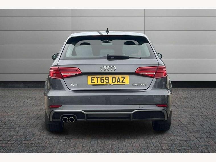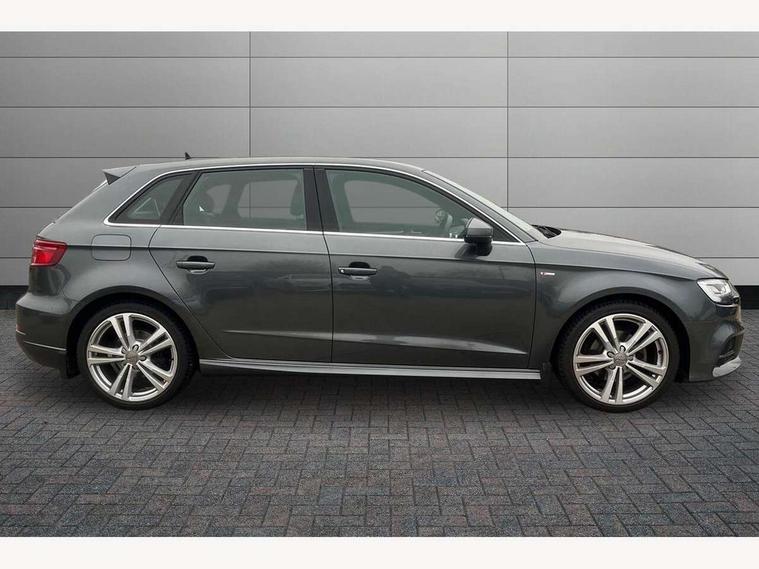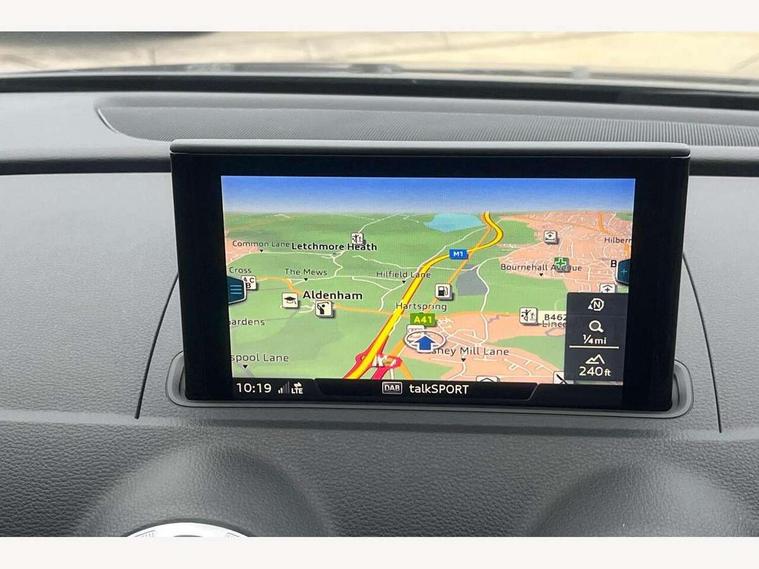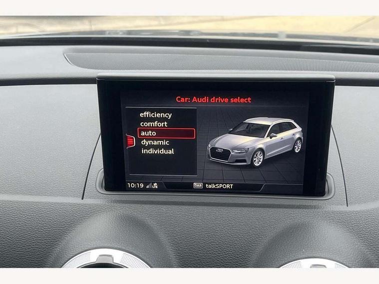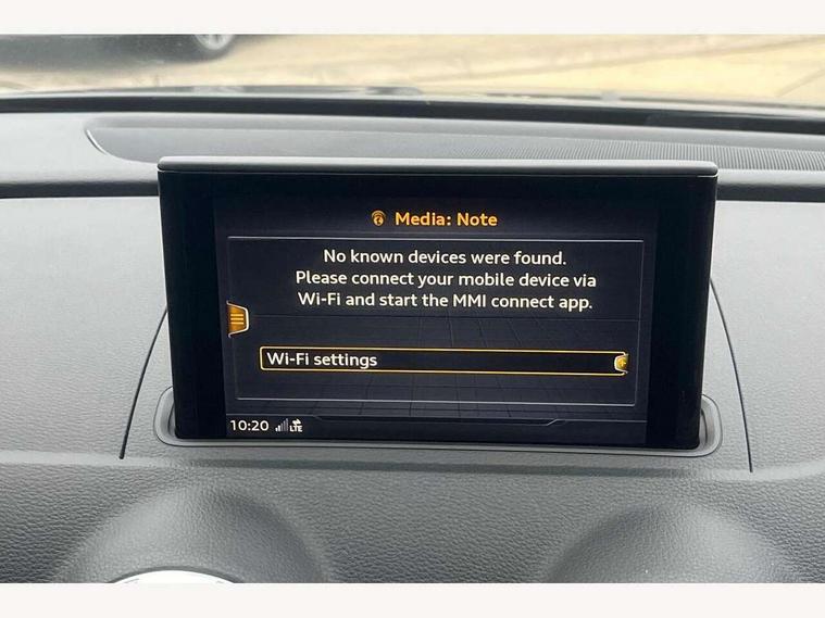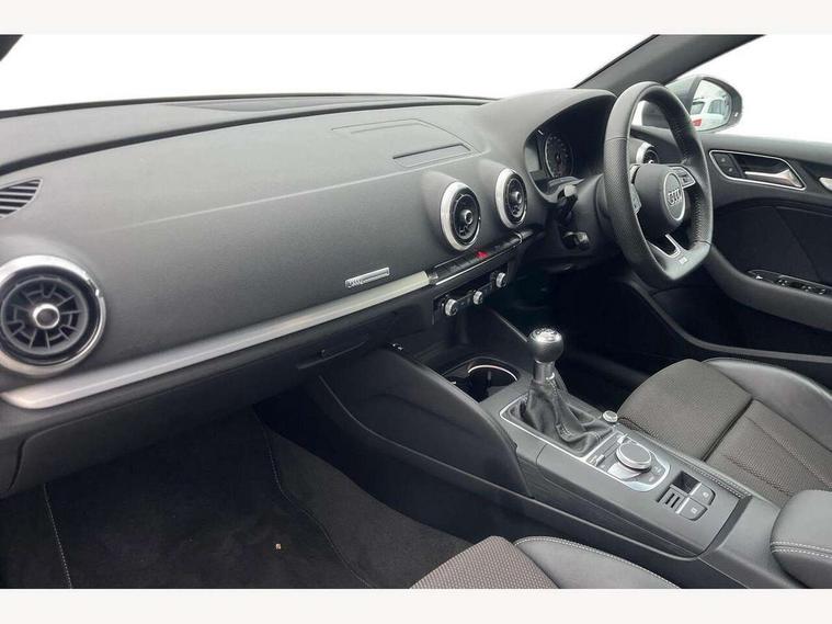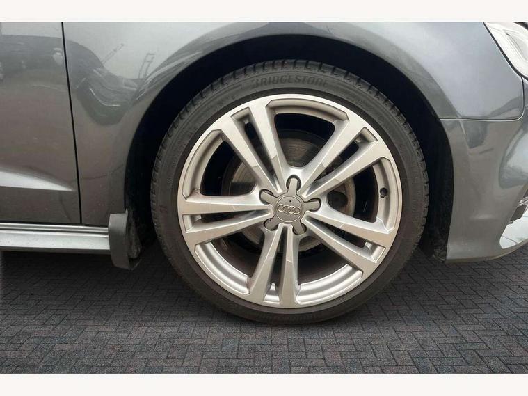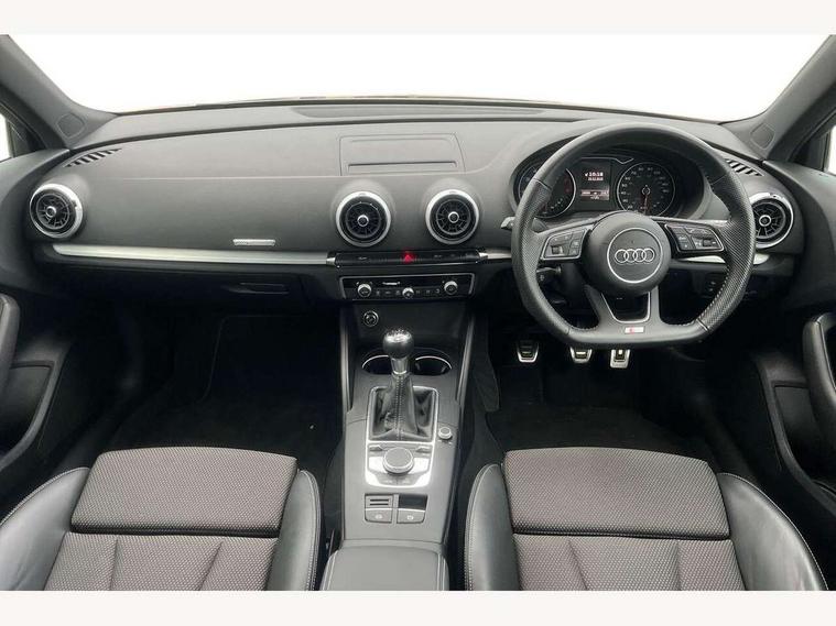 Audi drive select, Audi smartphone interface, Automatic start/stop system, Colour driver's information system display, Electro - mechanical power assisted steering, Mobile telephone preparation - bluetooth interface, SD card based MMI navigation, Service interval indicator, Speed limit display, Voice control system, Voice recognition for navigation system, Sports suspension, 2 USB interfaces and Aux-In jack, Audi music interface, CD player, DAB Digital radio, MMI radio plus with 7" colour MMI screen and MMI controller, Online entertainment, Aluminium window trim, Auto dimming interior rear view mirror, Body colour door mirrors, Chrome exhaust tailpipes, Electric front windows, Electric rear windows, Electrically adjustable and heated door mirrors with integrated LED side indicators, Heated windscreen washer jets, LED daytime running lights, Light and rain sensors, Matt black radiator grille, Rear wiper, S line badges on front wings, S Line body styling with front & rear bumpers and side skirts, radiator grille and rear diffuser insert, roof spoiler, Sport specific side air inlet grille and diffuser insert, 3 adjustable rear headrests, 3 spoke flat bottomed multi-function leather sport steering wheel, 60/40 split folding rear seat, Adjustable front centre armrest, Black cloth headlining, Dual zone electronic climate control, Front and rear interior lights with delay, Front/rear floor mats, Height and reach adjustable steering wheel, Illuminated door sill trims with S logo, Isofix child seat preparation for front passenger/outer rear seats inc passenger airbag deactivation including top tether, Lashing point in luggage compartment, Manual height adjustable front seats, Stainless steel pedals, Storage compartments in doors side trims, centre console and under front drivers seat, LED interior light pack - A3/RS3, Non smoking pack - A3, Storage and luggage pack - A3/RS3, 3 point seatbelts on all seats, ABS/EBD, Active bonnet, Active front headrests, Airbags - front driver/passenger, front & rear side, curtain, drivers knee, ASR, EDL, Electromechanical parking brake, ESC - Electronic Stability Control + traction control, Front passenger airbag deactivation, Hill hold assist, Manual rear child locks, Multi-Collision braking, Seatbelt warning, Tyre pressure warning, Warning triangle and first aid kit, Anti theft alarm, Anti-theft wheel bolts, Remote control central locking, Thatcham category 1 alarm + immobiliser, Aluminium air vent surrounds, Aluminium trim elements, Matt brushed aluminium inlays, Tool kit, Tyre repair kit,