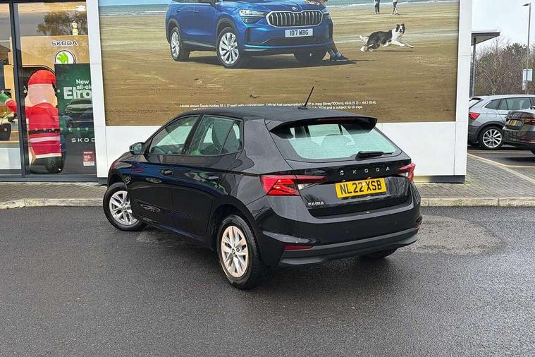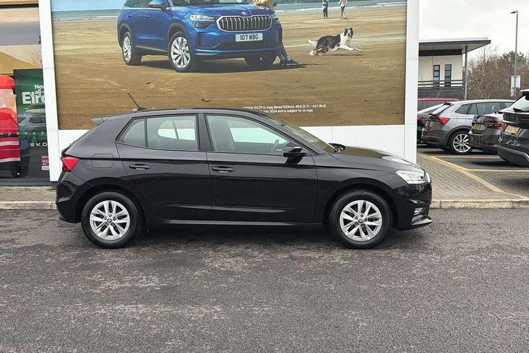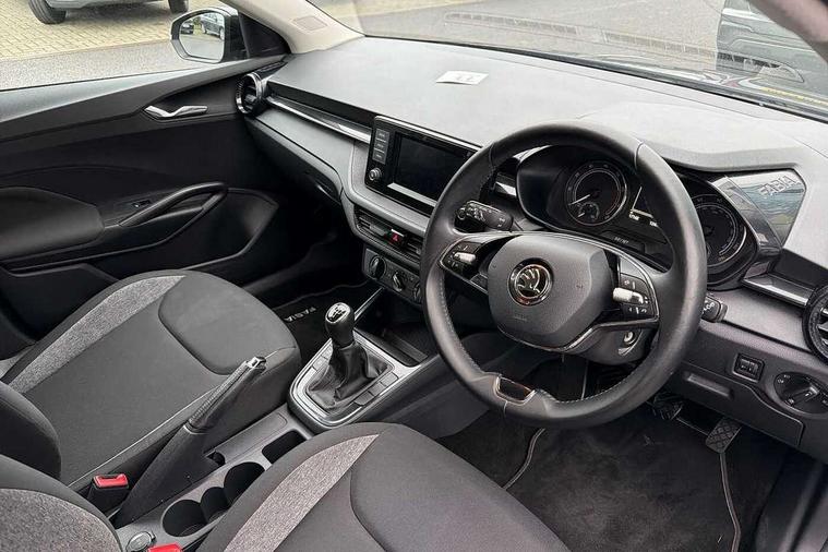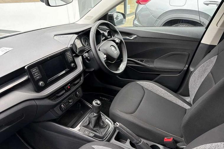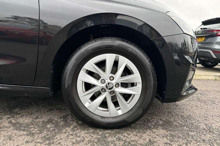 Bluetooth connection, Driver alert system - DAS, Electromechanical power steering, Exterior temperature gauge, Lane assist including road edge detection, Multifunction trip computer in black and white, Service interval indicator, Speed limiter, 2x USB-C in the front (for data transmission and charging), 4 speakers in front, Auxiliary socket for external MP3 player, DAB digital radio reception, Radio Swing with 6.5" colour display, Basic LED Headlights, Basic rear lights, Body colour door mirrors, Body coloured bumpers, Dimming rear view mirror with black frame, Door mirror integrated indicators, Electrically adjustable and heated door mirrors, Electrically adjustable front windows with function auto up/down, Front fog lights, Front window wiper intermittent control, Headlight range control - Automatic, Ice scraper in fuel cap, LED daytime running lights with coming and leaving home feature, Mechanical adjustable rear windows, Rain sensor, Rear LED fog light, Rear side wing doors, Rear window wiper with washing nozzles, Roof mounted spoiler, SKODA tailgate lettering in chrome, Third brake light, 2 reading lights in front and 2 reading lights in rear, 2 spoke leather multifunction steering wheel, 3 rear headrests, Backrest split and folding, Central console with fixed cup holder and storage box, Chrome handbrake release button, Fabric upholstery, Gearshift knob/handle in leather, Grain satin black interior door handles, Hand brake lever handle in leather, Height adjustable front headrests, Height adjustable front seats, Height adjustable steering wheel, ISOFIX and TopTether anchorage points to the outer rear seats, ISOFIX and TopTether on the front passenger seat, Luggage compartment lighting, Manual air conditioning, Manually adjustable lumbar support in front seats, Pollen filter, Rear seat bench unsplit, Single front passenger seat, Storm grey headlining, Sun visors with mirror and airbag label on passenger side, Ticket holder, 3-point height adjustable front seats belts with pretensioner and force limiter, Automatic warning lights in case of crash, Driver and passengers airbag with switch off function, e-Call+, ESC including ABS, MSR, ASR, EDS, HBA and XDS, Front and rear seat belt warning, FRONT ASSIST (AEB City and AEB Inter Urban), Front side airbags, Head airbags, One tone horn, Pedestrian protection, Three rear 3-points safety seat belts with pretensioner and force limiter including stop function for outer rear seat belts, Tyre pressure monitoring system, Anti-theft alarm system including immobiliser, interior monitoring, backup horn, and towing protection, Central locking with radio remote control, interior controls, SAFE function and 2 foldable keys, Black painted air vents, Glossy black decorative trim, Grain satin black central console cover, Grain satin black lower decorative trim, Satin black door and side trim panel in front, Anti-theft wheel bolts protection, Super-low rolling resistance tyres,
