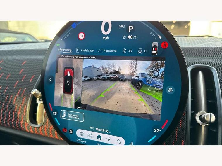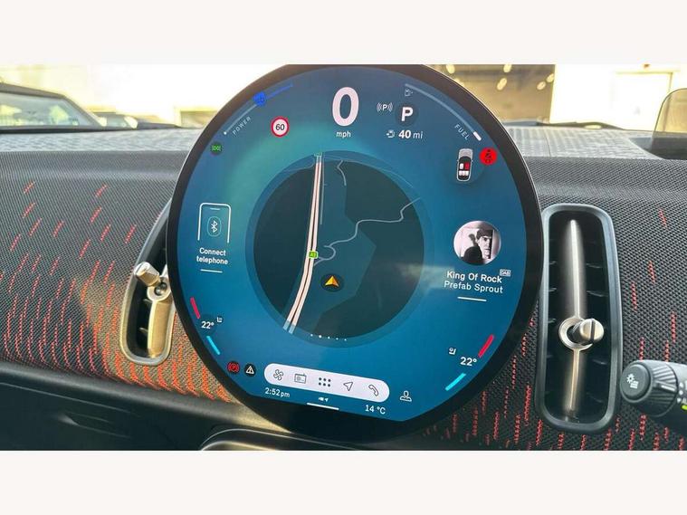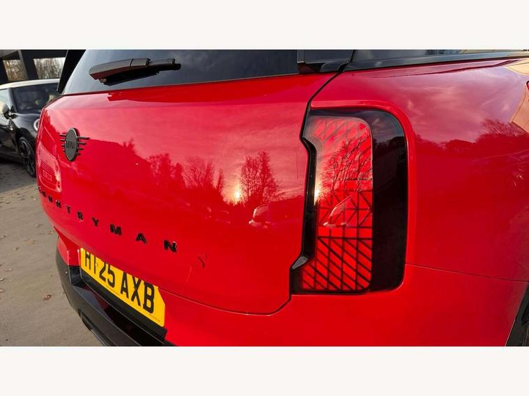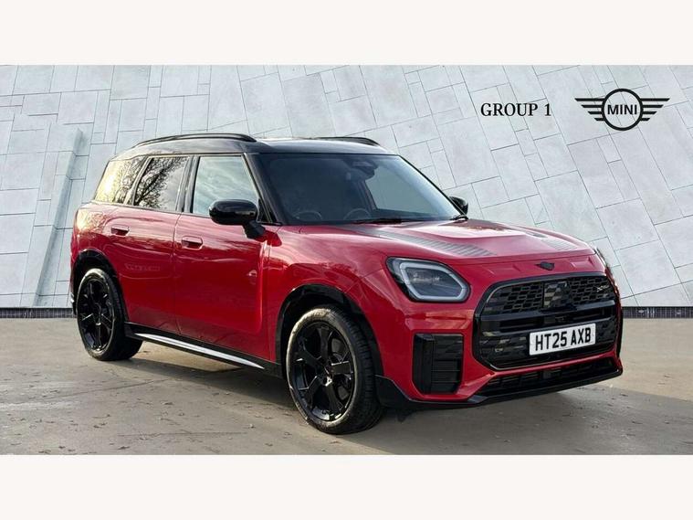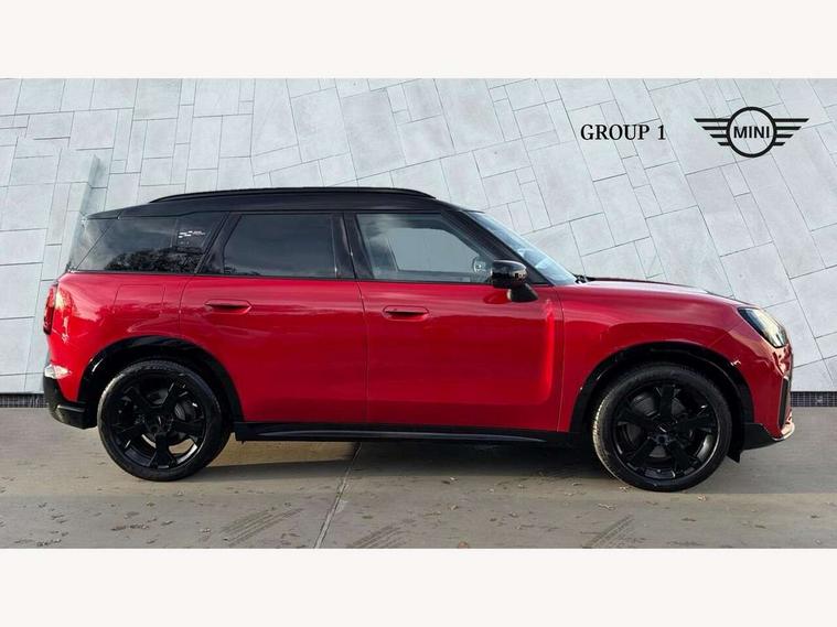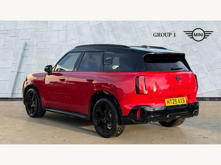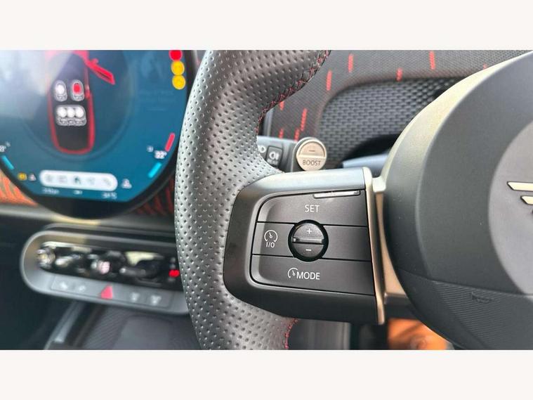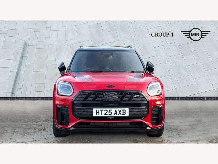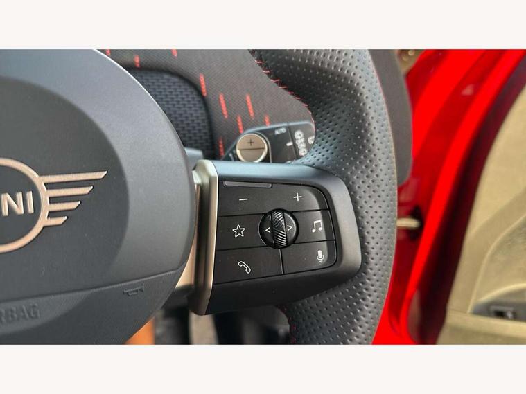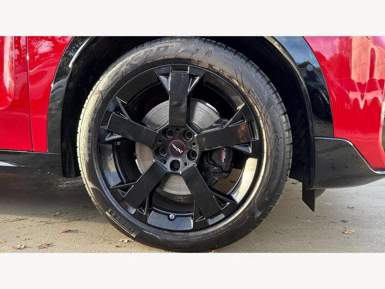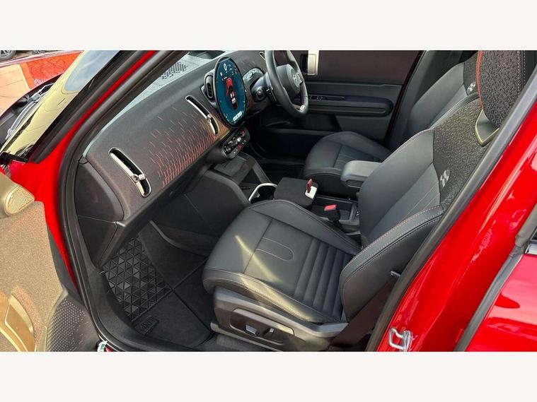 Bluetooth connection, Circular OLED Screen, Compatible mobile phone bluetooth with audio streaming, Cruise Control (DCC), Digital dashboard display, Driving assistant, Driving Assistant Plus Preparation, E-call, Electro-mechanical speed dependant steering assistance, MINI Experience Modes, MINI Head up display, Mini navigation system, MINI TeleServices, Parking assistant in camera and ultrasound based assistance system, rear view camera, parking aid and distance control, Adaptive suspension, Double clutch sports transmission, Larger capacity fuel tank, 6 speakers, DAB Digital radio, Personal eSim, Auto tailgate, Electric adjustable heated door mirrors, Front and rear apron, Front and rear electric windows, Heated rear window, High beam assistant, High gloss hexagonal patterned grille surround, Interior rear-view mirror with automatic anti-dazzle function, LED daytime running lights, LED headlights with extended contents including Adaptable light signatures, LED rear lights, LED third brake light, Rain sensor with auto headlights, Rear roof spoiler with airblades, Rear side wing doors, Rear window wiper, Roof rails, 3 Seat sliding rear bench in 2nd row, 60/40 split rear bench seat, Anthracite headliner, Auto air conditioning, Driver and front passenger seat heating, Floor mats, Front armrest, Front headrests, Heated steering wheel, Height and length steering column adjustment, JCW Front sports seats, Lidded storage box in Black/Red knit, Luggage compartment separating net, Perforated Vescin steering wheel, Rear headrests, Seat adjustment for rear seats, Single front passenger seat, Sunvisors with vanity mirrors, Vescin/Cloth upholstery, Wireless charging tray, Interior and exterior mirror package - Mini Countryman, 3x3 point rear seat belts, 6 Airbags - front, side, head and seat belt tensioners, ABS, Brake calipers in Black with JCW badge, DSC - Dynamic Stability Control, Electronic handbrake, Electronic Stability Programme (ESP), Front ISOFIX (iSize), Hill descent control, Hill hold assist, Hill start assist, JCW Sport Brakes, Manual rear child locks, Traction control, Tyre pressure monitoring system, Warning triangle, Alarm system with tilt sensor, monitoring doors, bonnet interior and tailgate, Auto drive away locking, Comfort access system, Deadlocking function, Electronic vehicle immobiliser, Locking wheel bolts, Remote control locking, Start/stop toggle with keyless go, JCW Black/Red dashboard knit, MINI Mobility Kit,