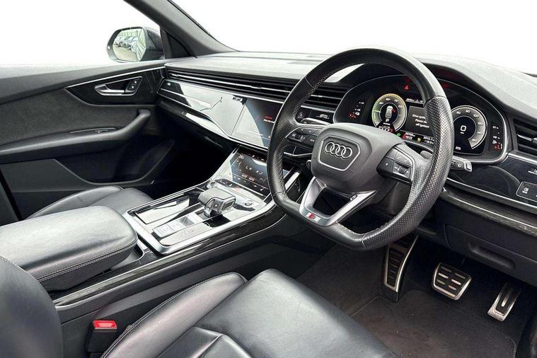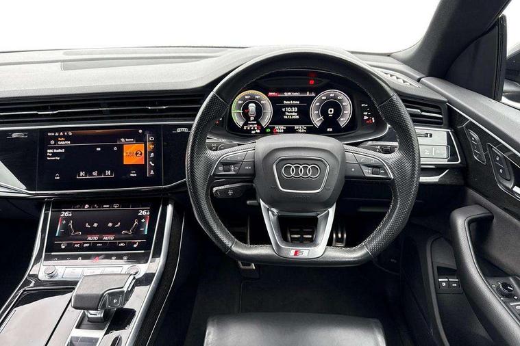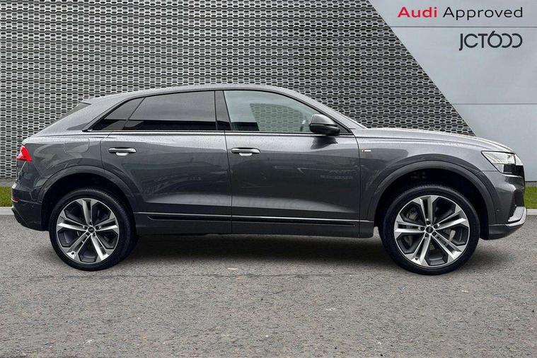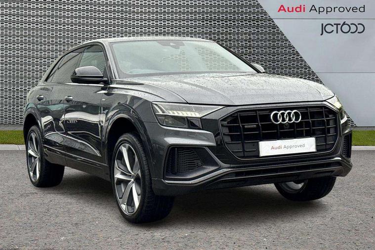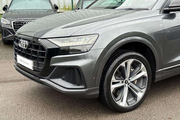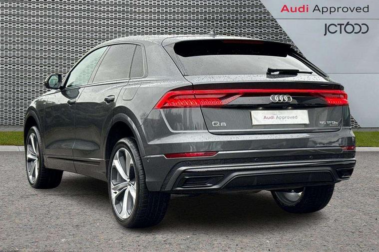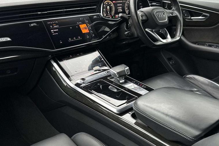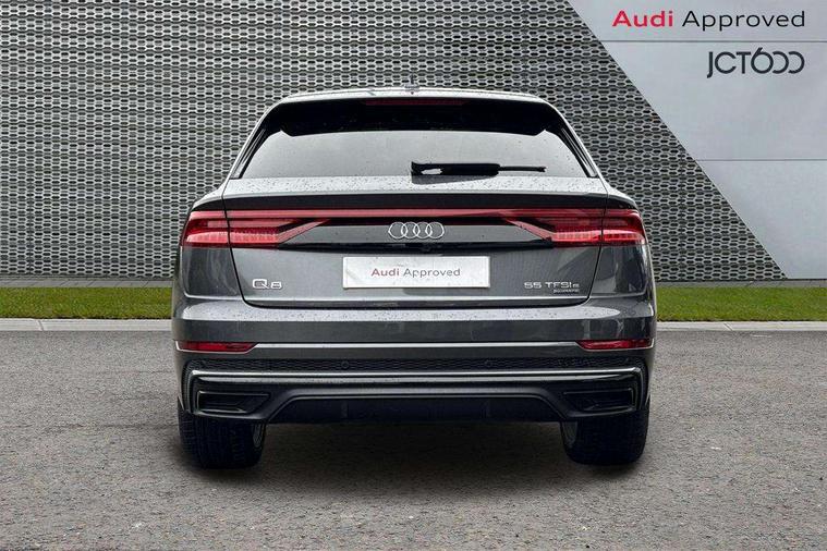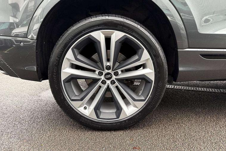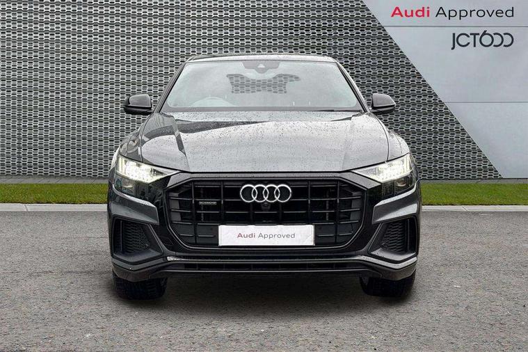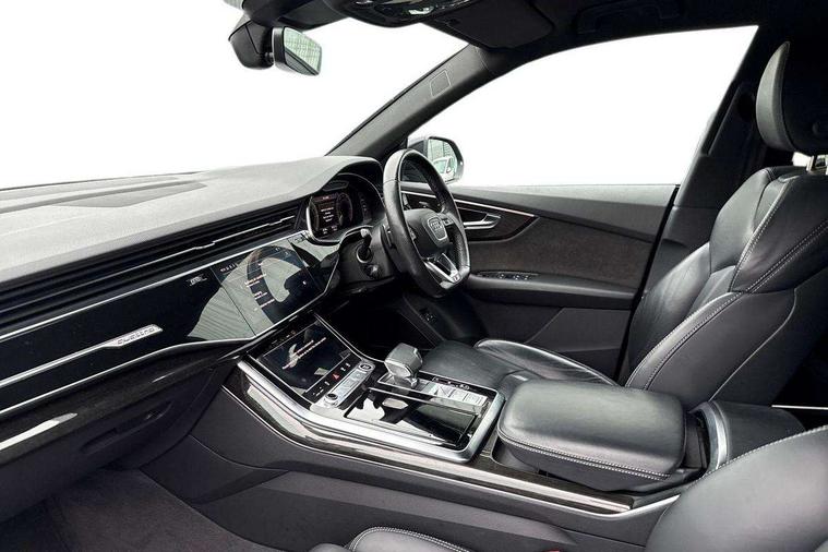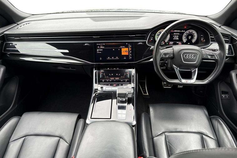 10.1" and 8.6" Dual colour touchscreens, Audi connect safety and service (e-call), Audi connect with Amazon Alexa Integration, Audi drive select, Audi parking system plus includes 360 degree display with front and rear sensors, Audi phone box with wireless charging, Audi virtual cockpit - 12.3" high resolution LCD display with fully customisable instrument cluster, Automatic start/stop system, Electro-mechanical PAS, Low washer fluid indicator, MMI - Multi Media Interface control system, MMI navigation plus with MMI touch, Natural voice recognition, On board computer, Operating buttons in black, glass look with haptic feedback, Power operated tailgate, Rear view camera, Service interval indicator, Smartphone interface includes wireless Apple carplay/Android Auto, 3 pin 10 amp domestic charging cable, 48V Mild hybrid technology, Adaptive sport air suspension, Quattro all wheel drive with self locking centre differential, Type 2 mode 3 charging cable, Type 2 socket for AC charging, Audi music interface with 2 USB ports with charge and data functions, Audi sound system with 6 channel amplifier, 180 watt amplifying capacity and 10 loudspeakers including subwoofer, Aux-in socket, DAB Digital radio, Acoustic windscreen, Audi HD Matrix LED headlights with dynamic front and rear indicators, Auto dimming frameless rear view mirror, Coming/leaving home lighting function, Electric front+rear windows, Electrically adjustable/heated/folding/auto dimming door mirrors with integrated LED indications + kerb view function for passenger side, Headlight washers, Heat insulating glass in windshield, LED signature daytime running lights, Platinum grey front spoiler lip and diffuser insert with honeycomb grille in black, Privacy glass - dark tinted rear and rear side windows from B-pillar backwards, Rain and light sensors, Rear wiper, 3 zone automatic air conditioning including remote pre-conditioning, 4-way lumbar support for front seats, 40:20:40 split folding rear bench seat, Black cloth headlining, Comfort front centre armrest, Driver seat memory function, Electrically adjustable front seats, Front head restraints, Front/rear floor mats, Heated front seats, ISOFIX child seat mounting for front passenger seat and 2 outer rear seats with top tether child seat mounting for all 3 rear seats, LED interior ambient lighting, Luggage compartment sill protection in stainless steel, Rear centre armrest with 2 cupholders, Rear headrests, Rear seat bench plus, Stainless steel pedals, Sunvisors with illuminated vanity mirrors, Titanium Black Styling Pack - Q8, 3 point seatbelts on all seats, Audi pre sense front, Driver and front passenger, front side and curtain airbags, Electromechanical parking brake, Electronic Stability Control (ESC) including ABS, ASR and EDL, Front passenger airbag deactivation, Hill descent control, Hill hold assist, Predictive pedestrian protection, Seatbelt monitoring, Traction control, Tyre pressure loss indicator, Warning triangle and first aid kit, Anti theft alarm with tow away protection, Anti-theft wheel bolts and wheel loosening detection, Immobiliser, Keyless go with remote central locking, Polished oak trim with grey finish inlay, Tool kit, Tyre repair kit,