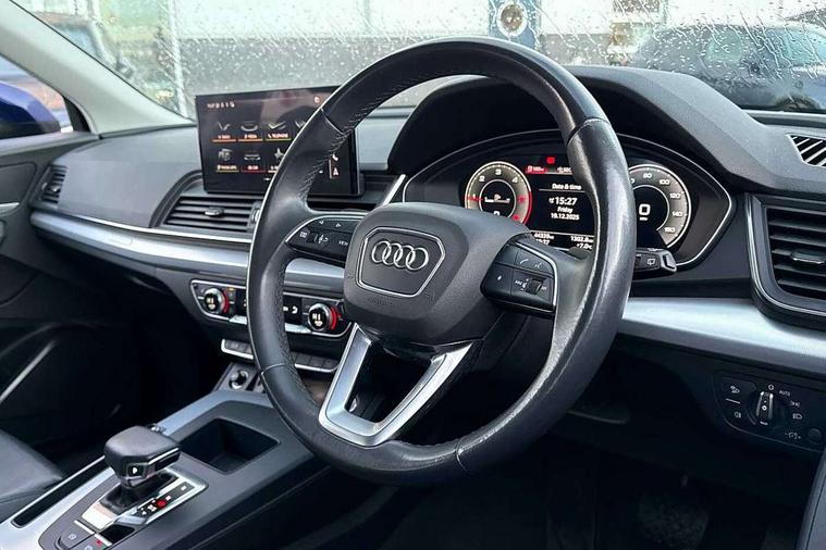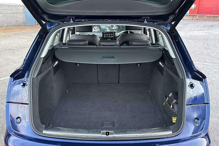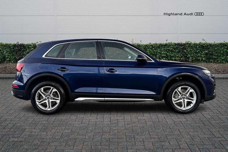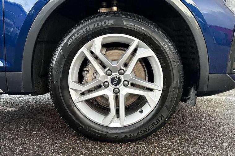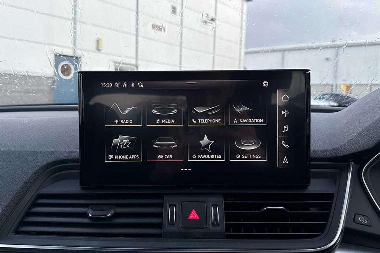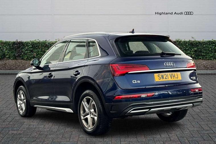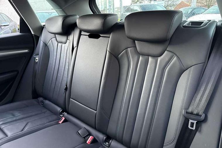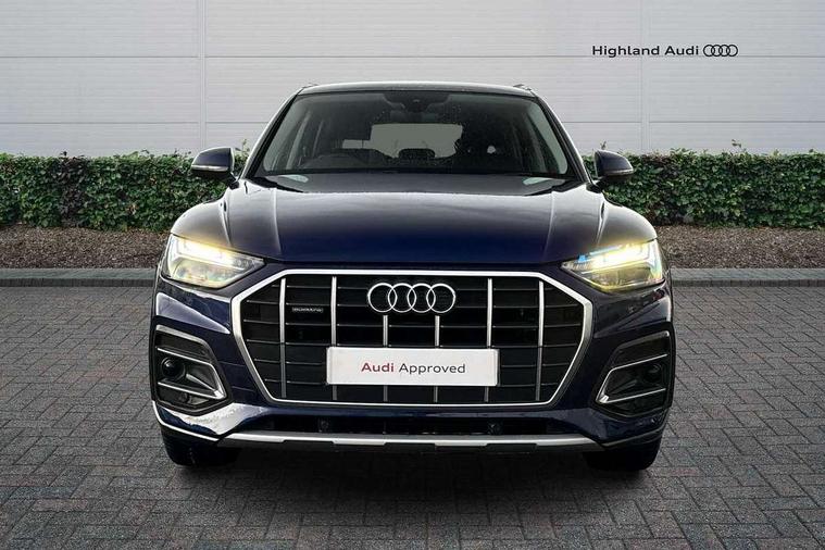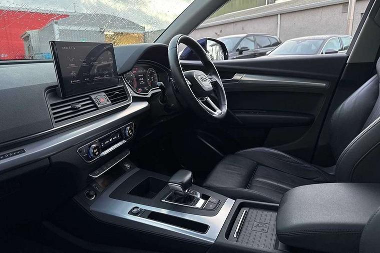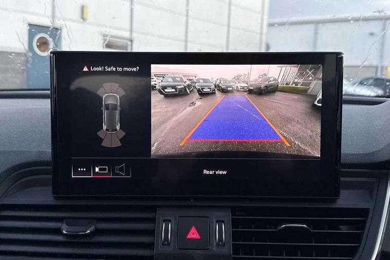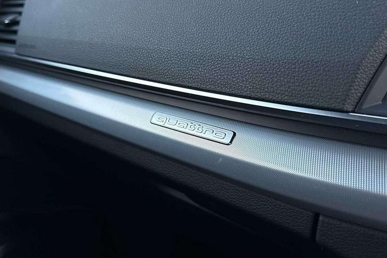 Audi connect safety and service (e-call), Audi connect with Amazon Alexa Integration, Audi drive select, Audi virtual cockpit plus with 12.3" screen and three different layout designs, Audi wireless smartphone interface, Automatic start-stop system with coasting functionality and efficiency programme, Bluetooth interface, Cruise control + speed limiter, Electro - mechanical power assisted steering, MMI navigation plus with 10.1" touch screen, Power tailgate, Reversing camera, Service interval indicator, Voice control system with Audi hotword activation "Hey Audi", Diesel particulate filter, Dynamic suspension, Quattro on demand, DAB Digital radio, Acoustic windscreen, Air inlets in matt titanium black with blades in matt aluminium silver, Aluminium roof rails, Auto dimming rear view mirror, Automatic headlights and windscreen wipers, Body colour bumpers, Body colour door mirrors, Chrome plated exhaust trims, Door sills in Selenite silver, Electric adjustable/heated/folding door mirrors, Front and rear electric windows, LED headlights and LED tail lights, Lower bumpers painted in contrast Manhattan grey, Matt selenite silver underbody protection, Matt twilight grey radiator grille with chrome vertical struts, Rear chrome trim strip below lights, Rear diffuser strip in selenite silver, Rear spoiler, Rear wiper, Roof bars, 2 x USB charging port with aux input socket, 3 rear headrests, 3 spoke multifunction leather steering wheel with shift paddles, 40:20:40 split folding rear seat with rear centre armrest, Comfort front centre armrest, Deluxe 3 zone electronic climate control, Door sills trims with aluminium inlays, Front/rear floor mats, Heated front seats, Height adjustable front head restraints, Height/reach adjustable steering column, ISOFIX child seat mounting and top tether, Luggage compartment cover, Manual seat adjustment with 4-way electric lumbar support, Removable luggage compartment floor, Silver cloth headlining, Sunvisors with vanity mirrors, Twin leather upholstery + front sports seats, High gloss pack - Q5, LED interior light pack - Q5, 3 point seatbelts on all seats, 6 airbags - Driver, front passenger, curtain and side airbags, Electrically operated child locks on rear doors, Electromechanical parking brake, Electronic stabilisation control including ABS, ASR and EDL, Front passenger airbag deactivation, Hill descent control, Hill hold assist, Multi collision brake assist, Pop-up bonnet for pedestrian protection, Pre sense city, Seat belt force limiter, Seatbelt monitoring, Tyre pressure warning, Warning triangle and first aid kit, Anti theft alarm, Anti-theft wheel bolts, Keyless Go access/ignition system, Aluminium rhombus inlay,