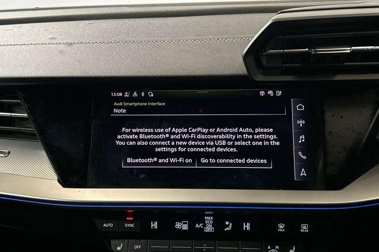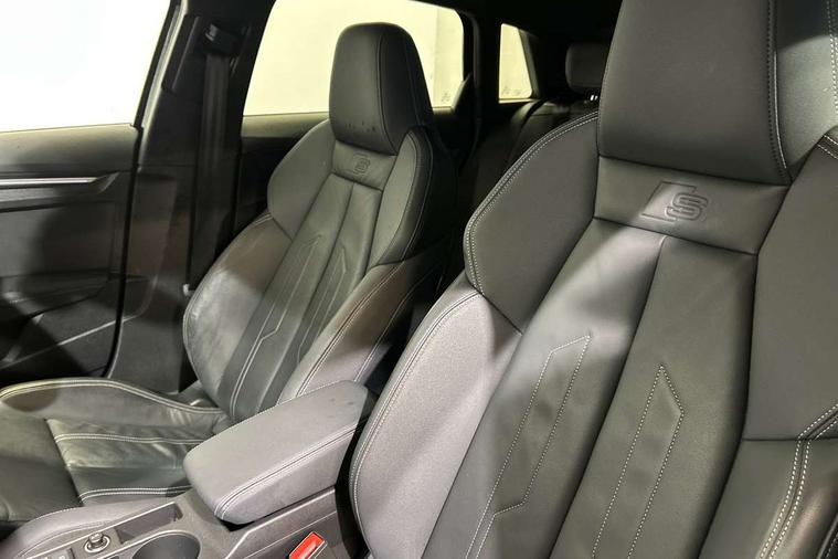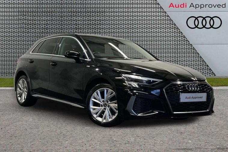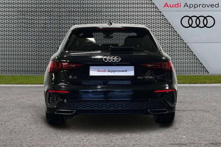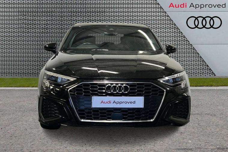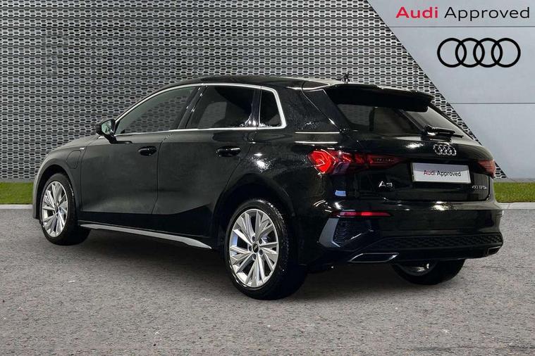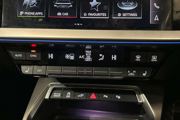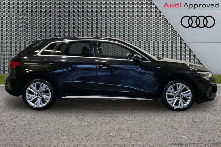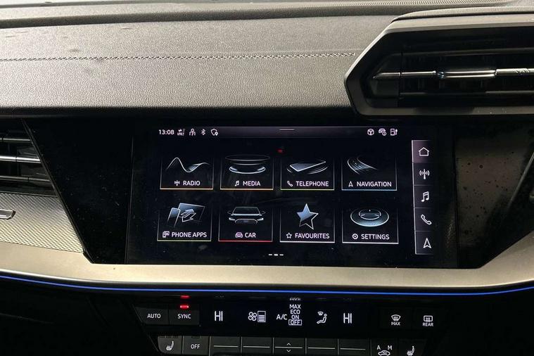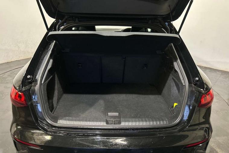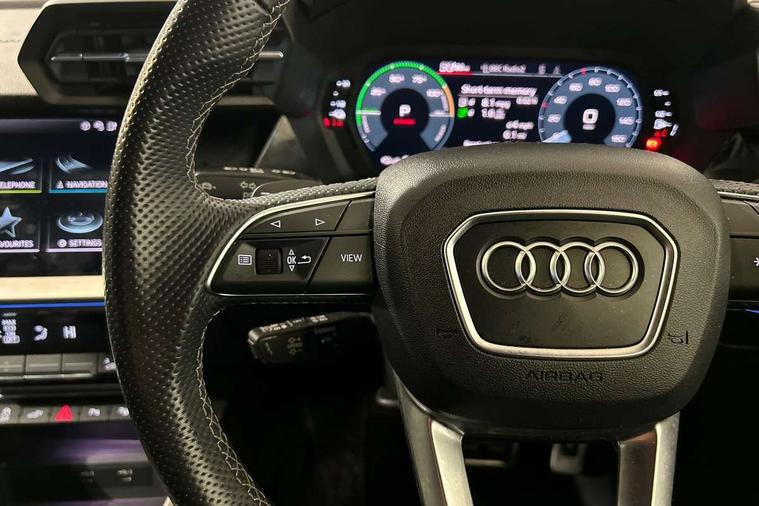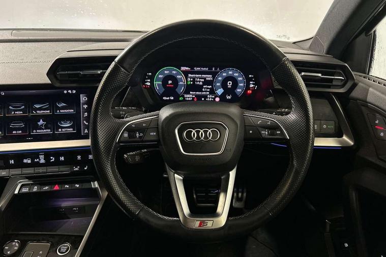 Audi connect emergency call and service, Audi drive select (Auto, Comfort, Dynamic, Efficiency and Individual), Audi smartphone interface, Audi Virtual Cockpit - 10.25" digital and colour instrument cluster, Automatic start/stop system with recuperation, Bluetooth interface, Collision avoidance assistant, Electromechanical power speed sensitive steering, Lane departure warning system, MMI Navigation Plus with high resolution 10.1" colour touch screen display, Service indicator, Trip computer, Voice control system with natural language interaction, 3 pin 10 amp domestic charging cable, Type 2 mode 3 32 amp charging cable, Type 2 socket for AC charging, 2xUSB-C connection with data and charging functions, 6 passive loudspeakers, DAB Digital radio, 3rd brake light, Acoustic glass windscreen, Aluminium window trim, Auto dimming frameless rear view mirror, Electrically adjustable/heated/folding/dimming door mirrors with kerb view includes integrated LED indications + kerb view function for passenger side, Front electric windows, Illuminated aluminium inserts front door sills with S logo, LED daytime running lights, LED headlights with LED rear lights and dynamic rear indicators, Light and rain sensors, Privacy glass - dark tinted rear window, rear door and side windows, Rear electric windows, Rear side air outlets in grained matt black, Rear wiper, S line bumpers, S roof spoiler, 12V socket and storage compartment in front centre console, 40/20/40 split folding rear seat bench with cupholder, Black cloth headlining, Dual zone electronic climate control, Front and rear centre armrest in leather, Front and rear headrests, Front/rear floor mats, Height and reach adjustable steering wheel, Interior lighting - glove compartment light and right hand side, Luggage compartment floor covering, Manual boot compartment lid, Manually adjustable front seats, Seat side bolsters, Stainless steel pedals and front footrest in black, Twin leather upholstery with front sports seats S embossed logo, Aluminium interior elements pack - A3 Sportback, S line styling pack - A3 Sportback, 3x3 point rear seat belts, Driver and front passenger airbag with passenger airbag deactivation, Electronic Stabilisation Control (ESC) including ABS, ASR and EDL, First aid kit with warning triangle and 2 safety vests, Front side airbags with head airbags and interaction airbag, Hill hold assist, Pre-sense front with pedestrian and cyclist detection, Seatbelt monitoring, Tyre pressure loss indicator, Anti theft alarm, Anti-theft wheel bolts, Electronically operated child lock, Immobiliser, Remote control central locking, Accent surfaces in the dashboard and centre console in platinum grey silk effect paint finish, Dark spectrum aluminium inlays, Tool kit, Tyre repair kit,