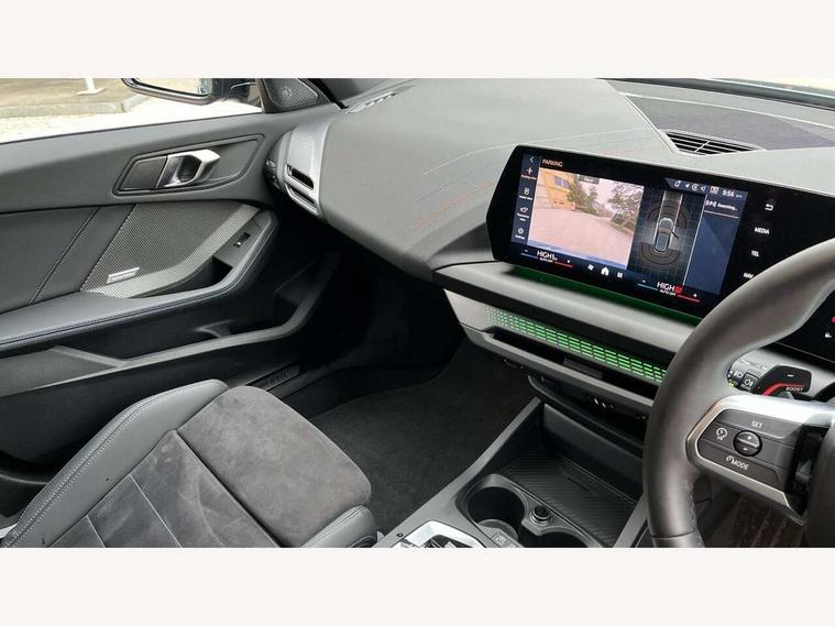 Active guard plus, Attentiveness assist, Bluetooth / WiFi interface for wireless connection of mobile terminal devices and audio streaming, BMW ConnectedDrive online services, BMW Live cockpit plus, BMW Teleservices, Check Control warning system for monitoring of lights and door/luggage compartment open warning, Eco pro mode, Electric power steering with Servotronic steering optimised at all speed ranges, Evasion assistant, Flat airvents in instrument panel with adjustable slats, Front and rear parking sensors, Front axle single joint with specific axle kinematics to minimise drive influences on steering + provide increased rigidity agile driving behaviour, Gearshift time display in manual mode, Integrated owners handbook, Left turn warning with brake function, My modes (Personal / Efficient / Sport), Oil sensor for level and grade, On board computer, Optimum shift indicator, Park assist including reversing assistant, lateral parking aid and reversing assist camera, Personal e-SIM, Personal Profile, Pull away assistant, Rigidly mounted rear subframe - Multi link construction with separate spring / damper configuration and excellent driving characteristics, Speed limit Info including no-overtaking indicator, Speed limiter, 49 litre fuel tank, Aluminium lightweight construction, Anti roll bar front and rear, Balancer shaft, Double VANOS twin scroll turbocharging system, Drive Performance Control, Electronic differential lock, Electronic selector lever, High precision injection, M Adaptive suspension, Petrol Particulate Filter, Steptronic transmission with double clutch, Twin tube gas filled shock absorbers with degressive characteristic curve, VALVETRONIC engine management, DAB Digital radio, Auto dimming rear view mirror, Automatic windscreen wipers and automatic headlight, Body colour door handles, Body colour roof trims, Chrome 'M' logo side designation, Chrome exhaust twin tailpipes round 90mm in left, Chrome kidney grille frame with Satin Aluminium struts, Direction indicator side lights in exterior mirrors, Electrically adjustable exterior mirror with mirror adjustment switch on drivers armrest and aspheric on driver side, convex on passenger side, Exterior M sport design elements, Fading support, Folding side mirrors with auto dimming/folding wing mirrors with auto dimming, Follow me home headlights, Front and rear bumper system with replaceable deformation elements, Front and rear electric windows with open and close fingertip control, anti trap facility and comfort closing, Front bumper panel with M specific design in vehicle colour with inserts in black high gloss, Front door sill finishers in black plastic with M designation in metallic look, Green tinted heat protection glazing, Heated rear window, High gloss black exterior mirrors, High gloss shadowline window frame, Recess cover mirror frames and B/C pillar embelisher trim, High level third brake light, Integrated front windscreen with washer jets, LED daytime running lights, LED eyebrow turn indicators, LED front fog lights, LED Headlights, Lightweight engineering, Matt black air guide grilles, Matt black wheel arch trim, Model badge on tailgate right, Nearside reverse light in rear light cluster, Preparation for high beam assistant, Rain sensor, Rear bumper panel with M-specific design in vehicle colour with inserts in black high gloss, Rear fog lights, Rear side wing doors, Rear window wiper, Shark fin antenna, Side sill covers with M specific design in body colour, Trailer stabilisation logic, Visible VIN plate, Welcome lighting, 12V power socket in front centre console with blanking plug, 3 rear seat head restraints, 3 seat bench in 2nd row, 3 spoke sports leather steering wheel with black leather and stitching, pearl chrome decorative finish, specific M Badge, Anthracite front and rear floor mats, Anthracite headlining, Black boot net with lashing eyes, Cargo function on 2nd seat row, Child seat ISOFIX attachment for two outer rear seats and front passenger seat with anchorage points, Conditioned based service, Driver and front passenger backrest net on rear, Driver and front passenger seat heating, Driver side folding compartment in instrument panel, Folding rear clothes hook, Footrest and pedals in black plastic, Four grab handles integrated in roof lining, Front and rear door pockets with bottle holders, Front and rear side armrest integrated into door trim, Front armrest with storage compartment, Gearshift paddles on steering wheel, Glove compartment, Height adjustable front head restraints, Luggage compartment for bag hooks on left and right, foldable luggage compartment liner and four lashing eyelets, Manual adjust steering wheel, Multi-function controls for steering wheel, Rear seat backrest with manual 60:40 split folding with 3 top tether clips integrated on rear of seat panels, Single front passenger seat, Storage compartment in centre console, Storage compartment in luggage compartment, Stowage of the parcel shelf in luggage compartment trim, Sun visors with vanity mirrors and insert tab, Two front centre console cupholders, Type C two USB ports in rear centre console, Upper retaining strap integrated into backrest rear panels, Connected pack professional - 1 Series, Interior lights pack - 1 Series, M Sport exterior styling aerodynamics pack - 1 Series, 2 tone horn, 3 point seatbelts on all seats, front pyrotechnic belt tensioners, stopper and belt force limiters, rear coded belt buckles, Airbags - Front driver/passenger, front and rear curtain head protection, front side, manual deactivation of front passenger airbag, Anti lock braking system (ABS) with brake assist, BMW emergency call, Brake drying, Braking readiness, Child proof locking system in rear door, Comfort modes, Cornering brake control, Crash sensor activating of airbags, Unlocking doors, hazard warning lights, interior light, safety battery terminal, Driver and front passenger seat belt security check, Dynamic stability control + (DSC+), Dynamic