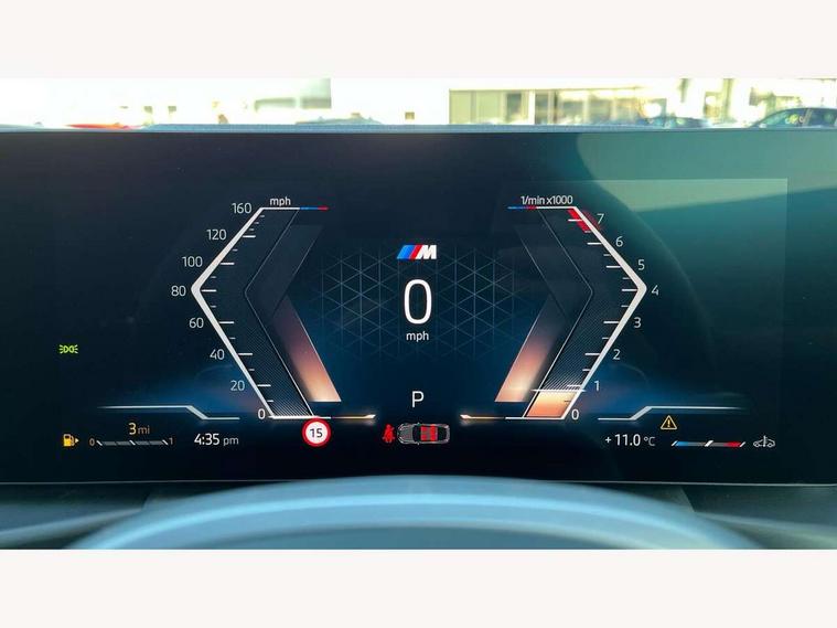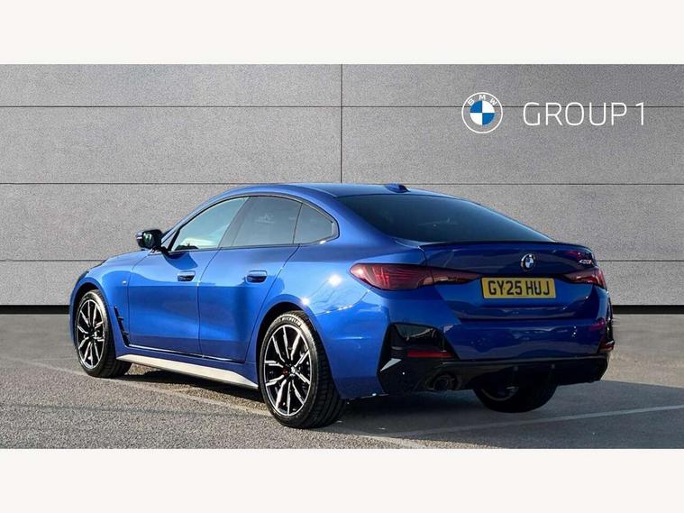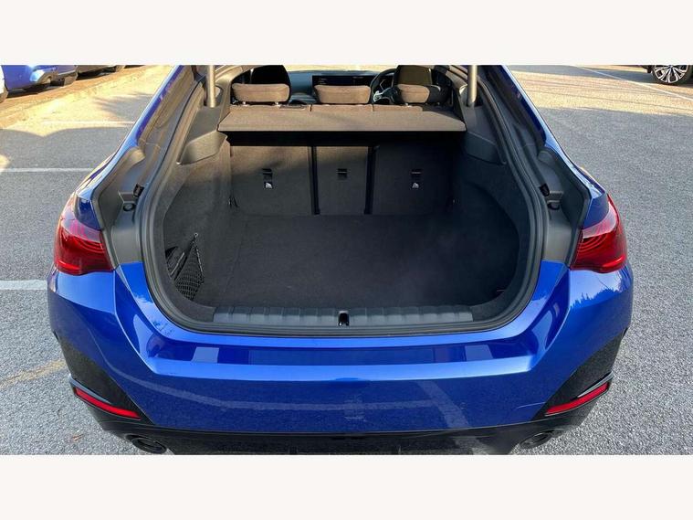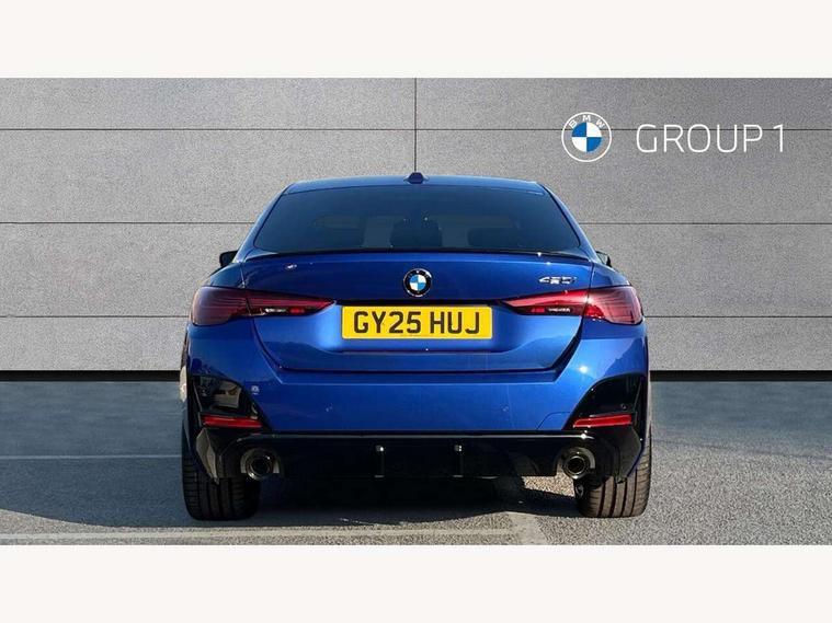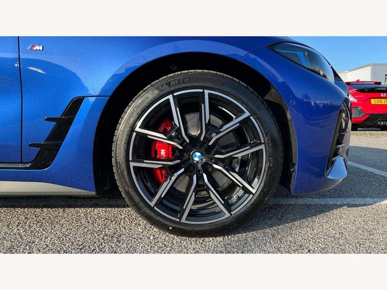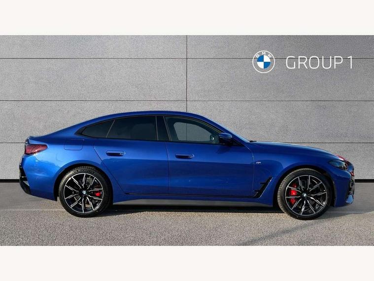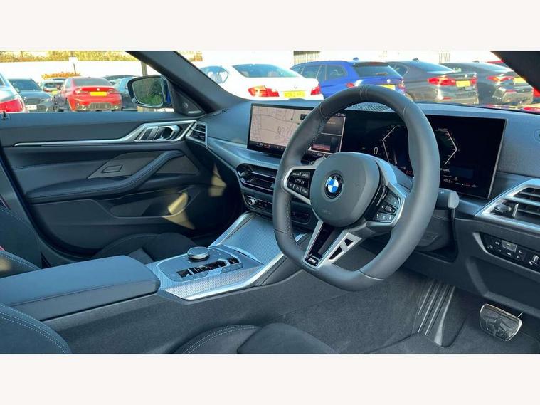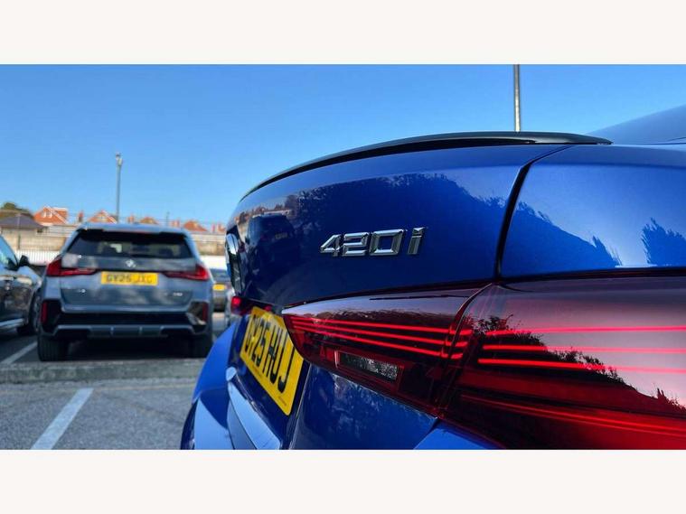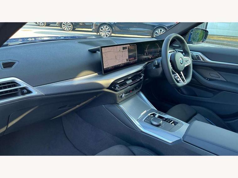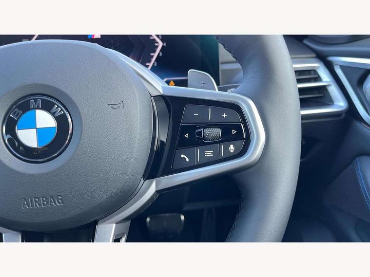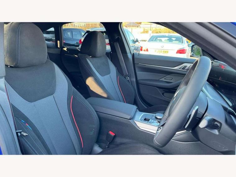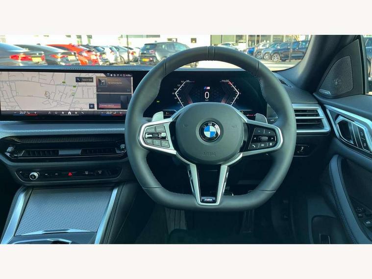 Active guard plus, Attentiveness assist, Auto start-stop, Bluetooth hands free facility with USB audio interface with audio streaming, BMW ConnectedDrive online services, BMW iDrive controller on centre console, BMW Live Cockpit Plus Nav-12.3" instrument&14.9" control Widescreen curved display/Intelligent Voice Assist/iDrive touch/Access 3rd party app/4G LTE, BMW service history, BMW Teleservices, Brake pad wear indicator in front and rear, Check Control warning system for monitoring of lights and door/luggage compartment open warning, Condition based service, Electric bootlid, Electric power steering with Servotronic steering optimised at all speed ranges, Gearshift time display in manual mode, Instrument cluster with speedometer with mph readout, tachometer, fuel gauge and oil temperature gauge, Integrated owners handbook, Language version English, Oil sensor for level and grade, warning by check control system, On board computer - average speed, fuel consumption, outside temp display with acoustic warning, clock/date, service interval, odometer/trip meter, Optimum shift indicator, Run flat indicator, Shifting point display, Variable sport steering, 8 speed automatic steptronic transmission with gearshift paddles, Balanced 50/50 weight distribution, Double joint spring strut front axle, Double VANOS, Drive performance control - ECO PRO, comfort and sport modes, High precision injection, Low centre of gravity, Petrol Particulate Filter, Stroke dependent dampers, VALVETRONIC engine management, 1x USB type A with data transfer and 1.5 Amp charging function in the centre console, 1x USB type C with 3 Amp charging function in the front centre armrest, DAB tuner, Electronic service booklet, Personal eSim, Acoustic glazing, Automatic headlight beam throw control with load dependent regulating reaction, dynamic compensation of braking dive and acceleration squat, Automatic windscreen wipers and automatic headlight, Automatically dimming electrochromatic rear view mirror, BMW emblem on engine compartment lid and tailgate, BMW radiator grille with mesh grille, end face of the nuggets in aluminium matt and frame in chrome matt, Body colour fuel filler flap, Body colour roof fin, Bonnet and tailgate badge, Brushed aluminium inserts in the front door sill finishers with BMW designation, Door sill strips, Dynamic brake lights, Electric windows - front and rear, with open/close fingertip control, anti trap facility and comfort closing function all round, Exterior mirrors - electrically folding with anti-dazzle, Fading support, Follow me home headlights, Front and rear bumper system, Front apron plastic in body colour, Green tinted heat protection glazing, High gloss shadow line exterior trim, Illuminated bow type door handles in body colour drivers side with door lock, Interior rear view electrochromatic mirror with automatic anti dazzle function, LED 3rd brake light, LED daytime running lights, LED front fog lights, LED front indicators, Licence plate panel integrated into front bumper and tailgate, Lightweight engineering, Low and high beam headlights in Bi-LED, M designation on front side panels, left and right, M rear boot spoiler, One piece front bumper cover including towing eye cover in body colour, Preparation for high beam assistant, Rear side wing doors, Rear wiper, Reversing light, Side frame trim strip black matt, Two part LED tailights in L-shape with components in smoked glass, brake light, LED turn indicator and rear fog light, Visible exhaust tailpipe finisher, Visible VIN plate, Welcome lights in interior and door handle area, Widened track and increased camber values for max transverse dynamics, agility and steering precision, Window recess finisher strip in matt black, Windscreen wipers with integrated heated washing jets, 12V power socket in front centre console, 2 front cupholder in centre console with clamping elements and matt black inlay, 3 rear headrests, 3 seat bench in 2nd row, 3 spoke flat bottom M sport leather multifunction steering wheel, 3 zone automatic air conditioning, 4 pieces lashing eyelets in luggage compartment, 40:20:40 split folding rear seat and rear centre armrest with two cupholders, Anthracite headlining, Armrest integrated in front and rear door trim + front centre console armrest, Battery in luggage compartment, BMW ID, Four grab handles integrated in roof lining, Front and rear door pockets, Front and rear reading lights, Front footwell lights, Heated driver and front passenger seats, Height adjustable front headrests, Height adjustable mechanically and infinitely variable steering column, Illuminated armrest storage compartment, Illuminated glove compartment with separate small compartment, Luggage compartment light, Luggage compartment seprating net on side trim left/right, Bag hook, 12V socket, TTH button, USB C charging in rear, Folding compartment on driver side, Make-up mirror lights, Single front passenger seat, Storage compartment in rear centre console, Sunvisors with illuminated vanity mirrors and ticket pocket, Through load system, Toolkit located in luggage compartment, Velour front floor mats, Ambient lighting pack - 4 Series, Connected professional package - 4 Series, M sport exterior styling pack - 4 Series, Park assist pack - 4 Series, 3 point seatbelts on all seats, Battery safety cut-off, BMW emergency call, Brake energy regeneration, Braking pre-tensioning, Child locks, Child seat ISOFIX attachment for the two outer rear seats, Coasting in idle in ECO PRO mode, Cornering brake control (CBC), Crash sensor activating of airbags, Unlocking doors, hazard warning lights, fuel cut off, interior lighting+activation of safety battery terminal clamp, Driver and front passenger side airbags, integrated in the door side seat backrest bolsters for all seat variants, Driver/Front Passenger airbags, Dry braking, Dynamic brake control, Dynamic stability control + (DSC+) - Anti-lock Braking System (ABS) with brake assist and cornering brake control 