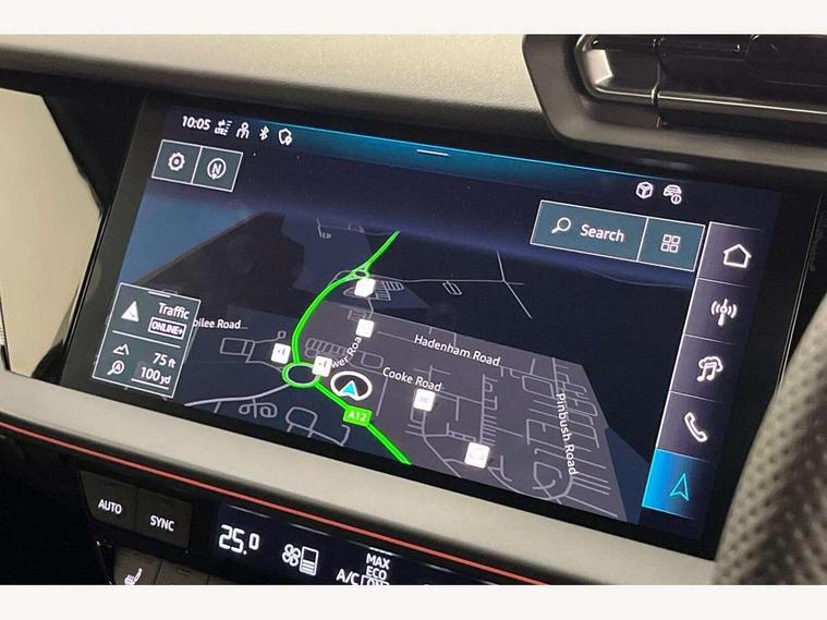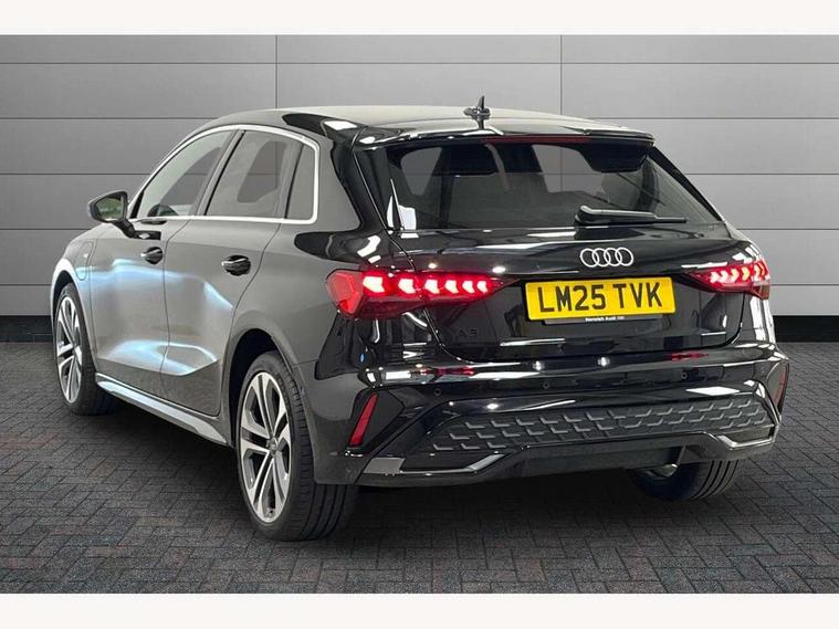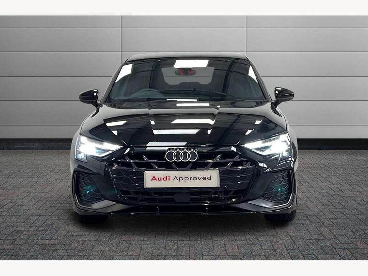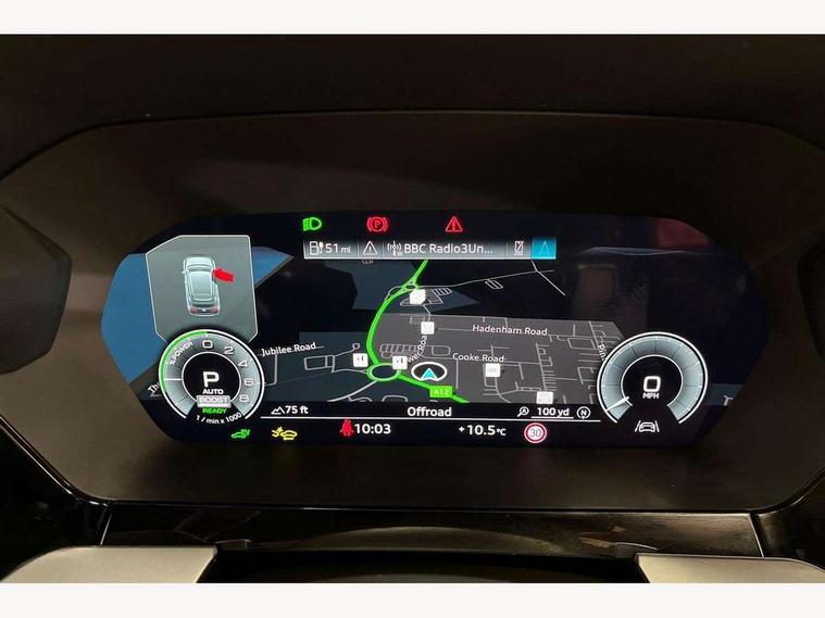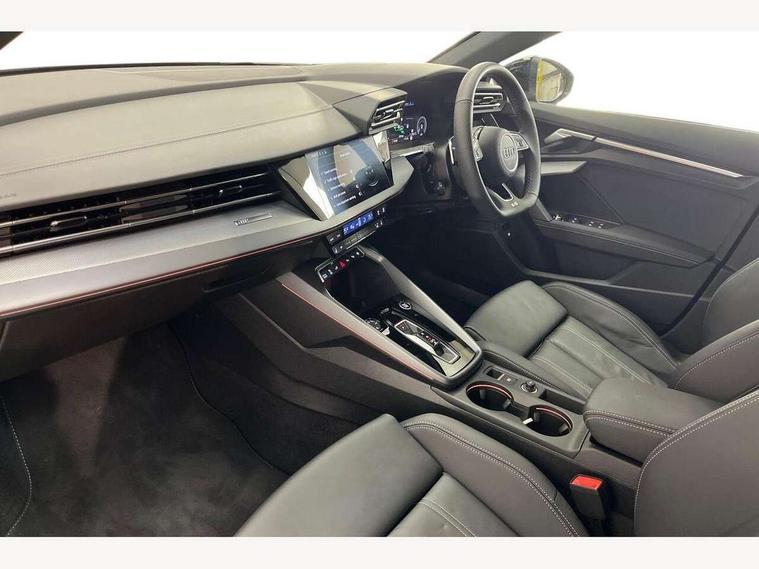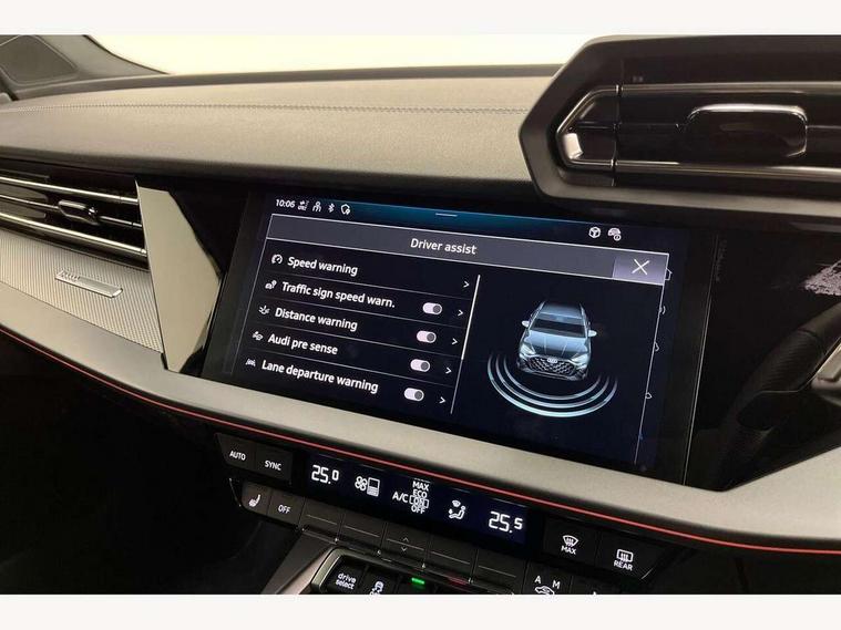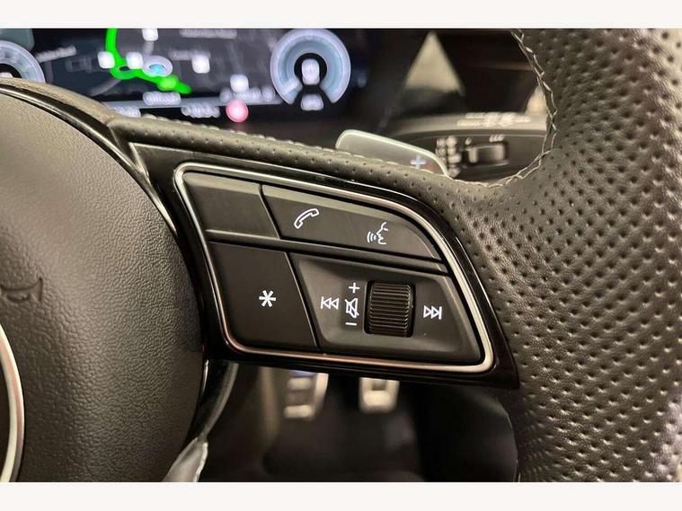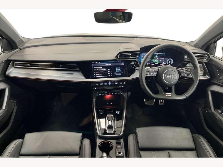 Adjustable speed limiter, Audi drive select, Audi smartphone interface with app store includes wireless Apple carplay, Android auto and Amazon alexa integration, Audi virtual cockpit plus - 12.3" full HD resolution dynamic digital instrument cluster, Automatic start/stop system with recuperation, Bluetooth interface, Camera based traffic sign recognition, Collision avoidance assistant, Cruise control, Distraction and Fatigue warning, e-Call (emergency call), Electromechanical power speed sensitive steering, Emergency assist, Lane departure warning system, MMI Navigation Plus with high resolution 10.1" colour touch screen display, Park Assist with parking system Plus, Service indicator, Trip computer, Voice control system with natural language interaction, 3 pin 10 amp domestic charging cable, CCS socket for DC charging, Charging cable for public charging, mode 3 (type 2), 32 A, Compact charging system, Industrial connector CEE 32 A, 230 V, length 1.6 m, Standard suspension, Type 2 socket for AC charging, Audi Phonebox light with wireless charging, Audi sound system - 10 loudspeakers including centre loudspeaker and subwoofer, DAB Digital radio, USB ports with charging function in the rear, Acoustic glass windscreen, All weather light, Aluminium window trim, Auto dimming frameless rear view mirror, Automatic dynamic range control, Body colour exterior mirrors, Chrome exhaust tailpipes, Dipped beam, main beam, position light and turning light, Electrically adjustable/heated/folding/auto dimming door mirrors with integrated LED indications + kerb view function for passenger side, Exterior model badging, Front and rear side air inlets in grained matt black with dark liquid chrome frame, Front electric windows, Front radiator grill in high gloss dark chrome, Heat insulating glass windscreen, Illuminated door sills with aluminium inserts at the front with S logo, Intersection light, LED 3rd brake light, LED brake lights, LED daytime running x3, LED headlights with LED rear lights and dynamic rear indicators, LED rear number plate lights, LED reverse light, LED tail lights, Light and rain sensors, Manoeuvring light, Motorway light, Privacy glass - dark tinted rear window, rear door and side windows, Rear diffuser and grill in grained matt black with inlay in dark liquid chrome, Rear electric windows, Rear side wing doors, Rear wiper, S line bumpers, S roof spoiler, Side S line emblems on front wings, Side sill trim in dark liquid chrome, Static Cornering lights, 12V socket and storage compartment in front centre console, 3 seat bench in 2nd row, 3 spoke flat bottomed leather multifunction sport steering wheel with gear shift paddles, 3-zone deluxe automatic air conditioning, 4 way electrically adjustable lumbar support for driver and front passenger, 40/20/40 split folding rear seat bench, Black cloth headlining, Black front and rear floor mats, Convenience auxiliary air conditioning, Front and rear centre armrest in artificial leather with contrasting stitching on armrests and instrument panel, Front and rear headrests, Heated front seats, Height and reach adjustable steering wheel, Manual boot compartment lid, Manually adjustable front seats, Rear centre armrest with cupholder, S badging on the steering wheel, Seat side bolsters, Single front passenger seat, Stainless steel pedals and front footrest in black, Twin leather upholstery with front sports seats S embossed logo, Aluminium interior elements pack - A3, Multi-coloured LED interior lighting package with Multi-coloured contour lighting of instrument panel - A3, 3x3 point rear seat belts, Acoustic vehicle alerting system, Driver and front passenger airbag with passenger airbag deactivation, Electronic Stabilisation Control (ESC) including ABS, ASR and EDL, First aid kit with warning triangle and 2 safety vests, Front side airbags with head airbags and interaction airbag, Hill hold assist, Pre-sense front with pedestrian and cyclist detection, Seatbelt monitoring, Tyre pressure loss indicator, Anti theft alarm, Anti-theft wheel bolts, Electronically operated child locks, Immobiliser, Remote central locking with safelock, Black dashboard, Inlay in dark aluminium spectrum, Tyre repair kit,