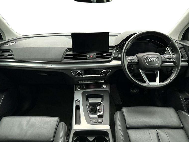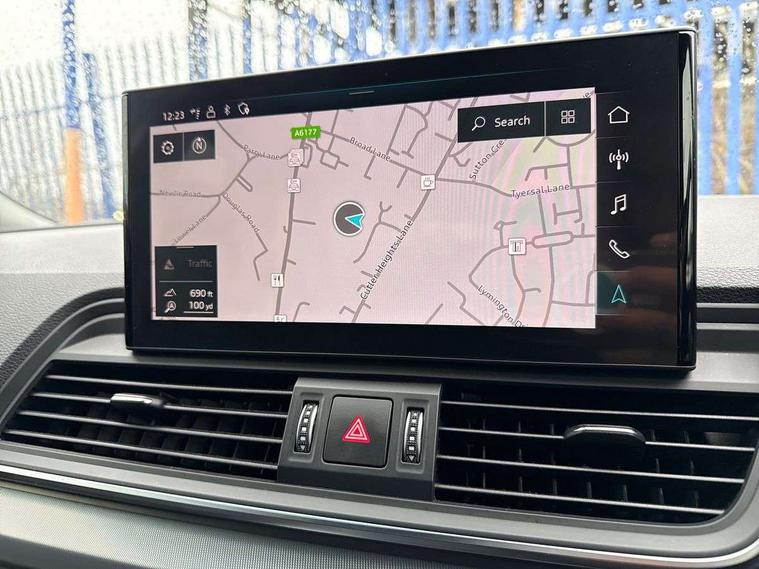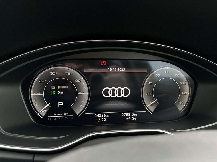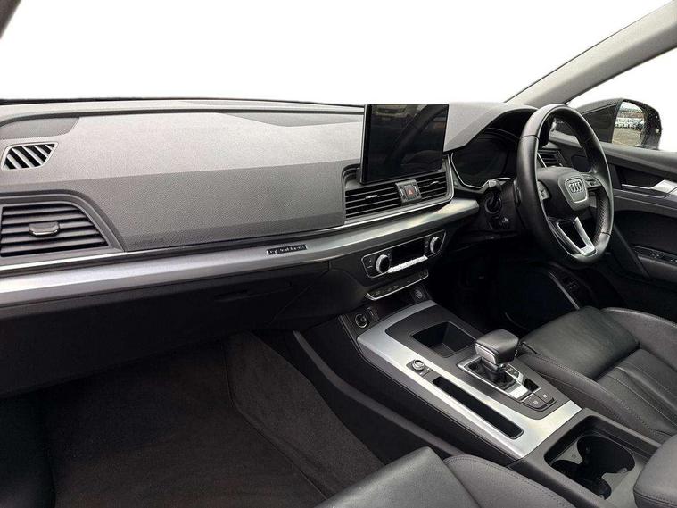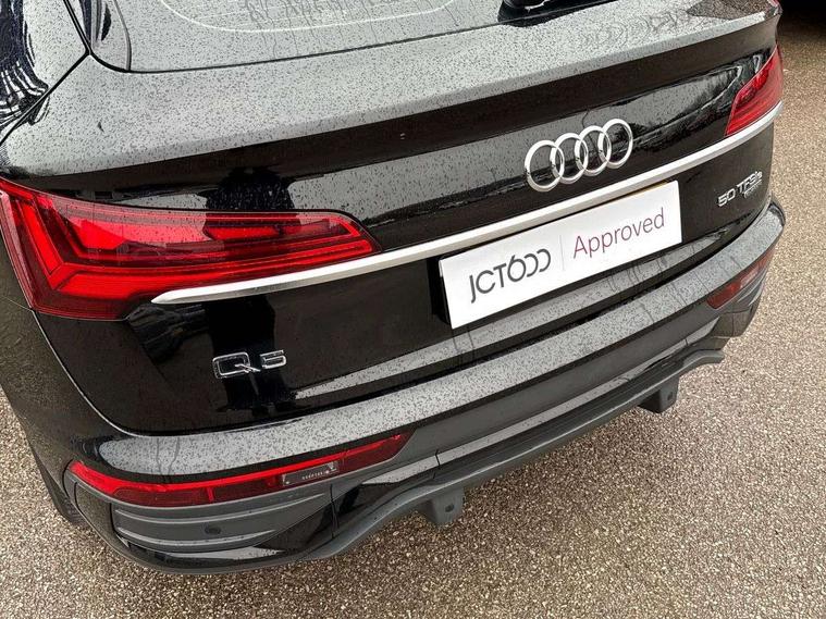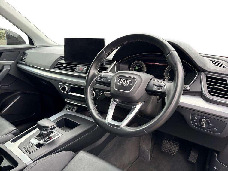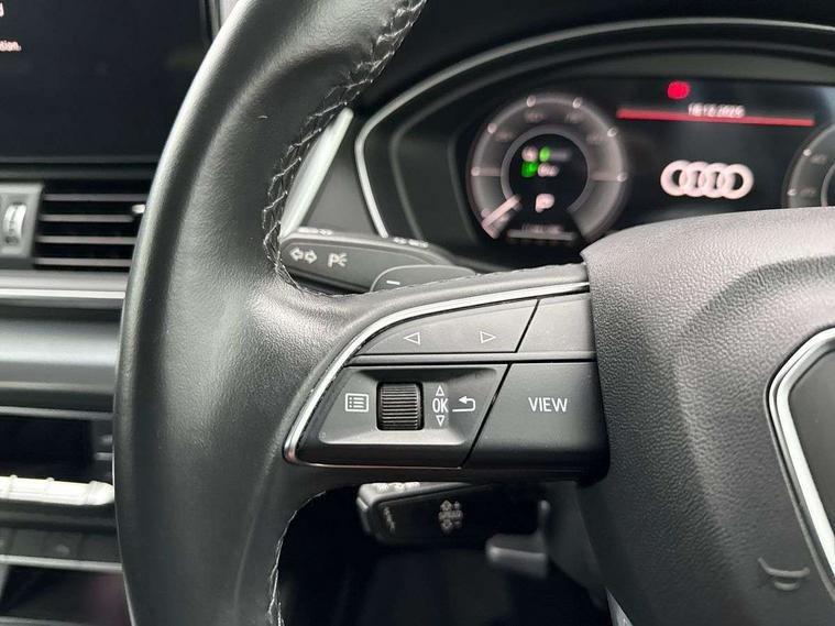 Audi connect safety and service (e-call), Audi connect with Amazon Alexa Integration, Audi drive select, Audi virtual cockpit plus with 12.3" screen and three different layout designs, Audi wireless smartphone interface, Automatic start-stop system with coasting functionality and efficiency programme, Bluetooth interface, Cruise control + speed limiter, Electro - mechanical power assisted steering, MMI navigation plus with 10.1" touch screen, Power tailgate, Reversing camera, Service interval indicator, Voice control system with Audi hotword activation "Hey Audi", 3 pin 10 amp domestic charging cable, 7.4 kW onboard charger, Dynamic suspension, Quattro on demand, Type 2 mode 3 22kW 32 amp charging cable, Type 2 socket for AC charging, DAB Digital radio, Acoustic windscreen, Air inlets in matt titanium black with blades in matt aluminium silver, Aluminium roof rails, Auto dimming door mirrors, Auto dimming rear view mirror, Automatic headlights and windscreen wipers, Body colour bumpers, Body colour door mirrors, Chrome plated exhaust trims, Daytime running lights, Door sills in Selenite silver, Electric adjustable/heated/folding door mirrors, Front and rear electric windows, High level LED brake light, LED headlights and LED tail lights, Lower bumpers painted in contrast Manhattan grey, Matt selenite silver underbody protection, Matt twilight grey radiator grille with chrome vertical struts, Rear chrome trim strip below lights, Rear diffuser strip in selenite silver, Rear side wing doors, Rear spoiler, Rear wiper, Roof bars, 2 x USB charging port with aux input socket, 3 rear headrests, 3 spoke multifunction leather steering wheel with shift paddles, 40:20:40 split folding 3 rear bench seat in 2nd row with rear centre armrest, Comfort front centre armrest, Deluxe 3 zone electronic climate control, Door sills trims with aluminium inlays, Front/rear floor mats, Heated front seats, Height adjustable front head restraints, Height/reach adjustable steering column, ISOFIX child seat mounting and top tether, Manual seat adjustment with 4-way electric lumbar support, Rear seat bench plus, Silver cloth headlining, Single front passenger seat, Sunvisors with vanity mirrors, Tool kit, Trunk roller cover, Twin leather upholstery + front sports seats, High gloss pack - Q5, LED interior light pack - Q5, 3 point seatbelts on all seats, 6 airbags - Driver, front passenger, curtain and side airbags, Electrically operated child locks on rear doors, Electromechanical parking brake, Electronic stabilisation control including ABS, ASR and EDL, Front passenger airbag deactivation, Hill descent control, Hill hold assist, Multi collision brake assist, Pop-up bonnet for pedestrian protection, Pre sense city, Seat belt force limiter, Seatbelt monitoring, Tyre pressure warning, Warning triangle and first aid kit, Anti theft alarm, Anti-theft wheel bolts, Keyless Go access/ignition system, Remote central locking, Aluminium rhombus inlay, 18" 5 twin spoke dynamic design alloy wheels, Tyre repair kit,
