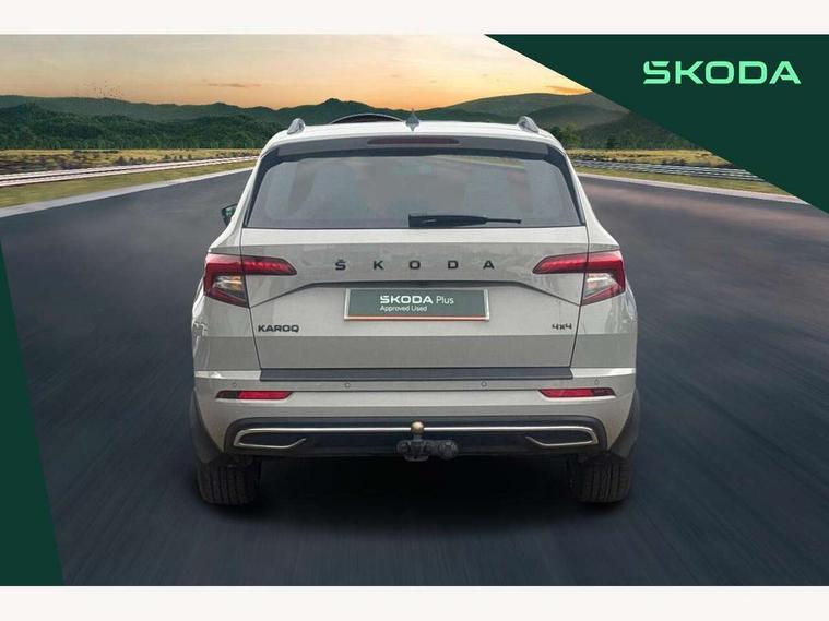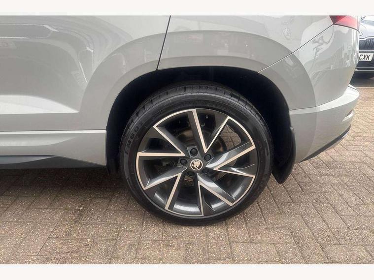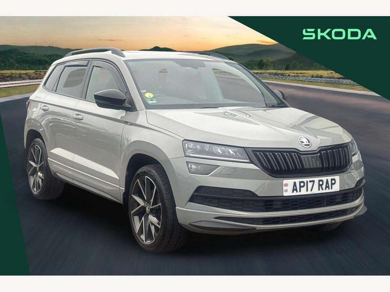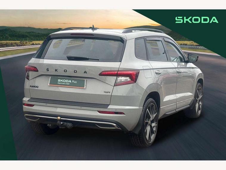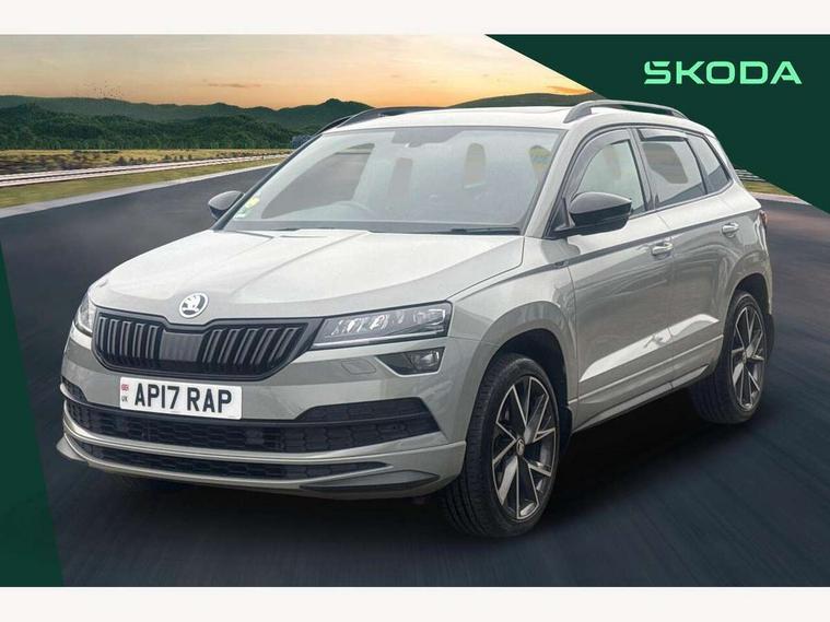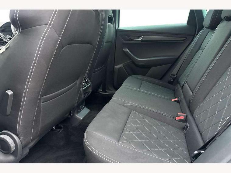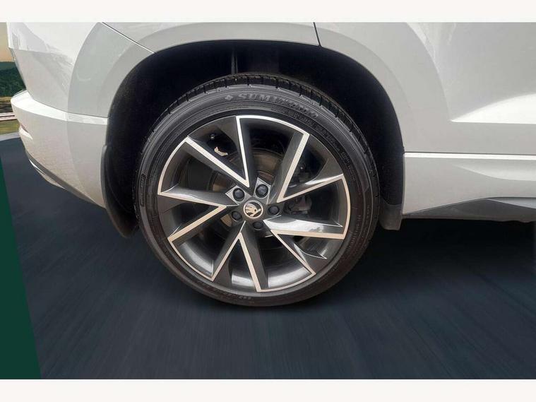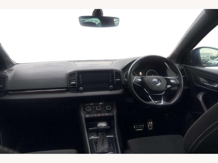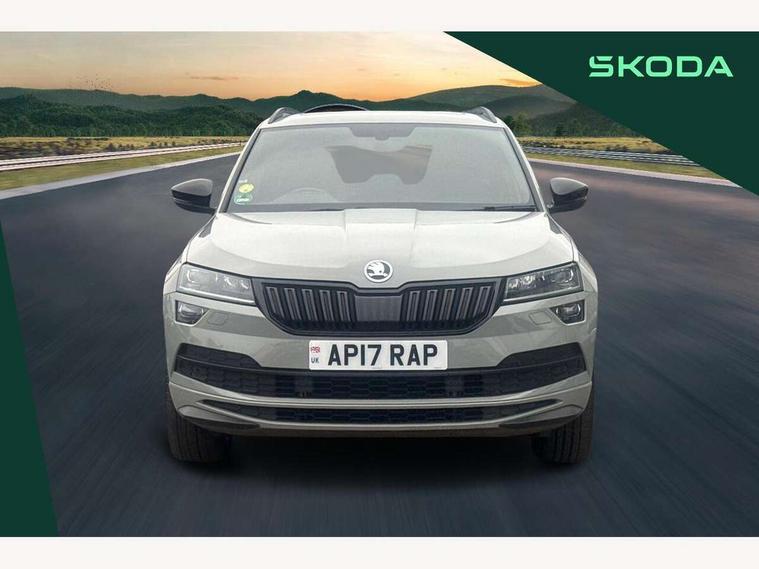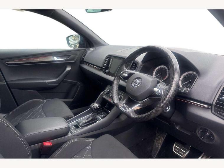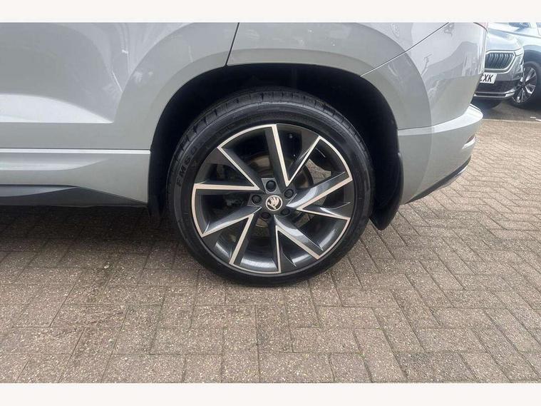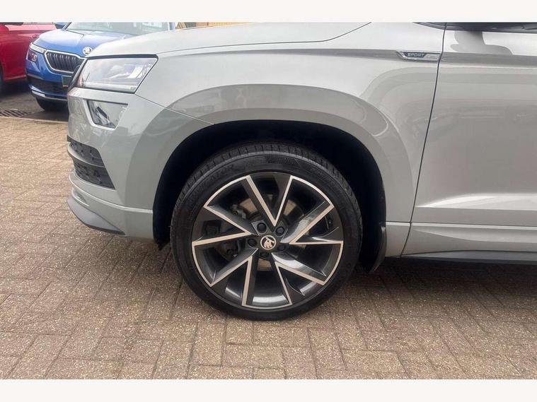 Care connect, Drive mode selection with off road, Driver fatigue sensor, Multifunction colour trip computer, Outside temperature gauge, Service interval indicator, SmartLink wireless for Apple and wired for Android, Start/stop system with regenerative braking, USB C Port x 2 in front centre console, Diesel particulate filter, DAB radio with Bluetooth, USB connection, Wireless charging without wireless aerial connection, Acoustic glass, Aero front windscreen wipers with intermittent function, Automatic headlight control system, Black electric window control buttons, Black roof rails and door mirrors with radiator grille, Body colour door handles, Electric front and rear windows with child proof lock, Front door steps with SportLine logo, Full LED headlights + adaptive front light system + LED daytime running lights and front cornering fog lights, Headlight washers, Heated rear windscreen, LED rear lights with high functionality, Light assistant (coming/leaving home/tunnel light), Panoramic sliding sunroof, Privacy glass, Protective door side sills in body colour, Rear diffuser, Safety reflectors on front doors, Skoda lettering on tailgate in black, Sportline badge on front fender, Sportline decorative inserts with badging, Sports front and rear bumpers, Third brake light, 1.5 litre bottle holders in driver and front passenger door panels, 12V socket in boot, 12v socket in front centre armrest with storage compartment and rear air vents, 2 Folding hooks and nets in boot, 2 Front readings lights for driver and passenger, 3 rear height adjustable headrests, 4 foldable roof handles with rear coat hooks, 4 lashing points on luggage floor, Aluminium pedals, Backrest release, Black roof headlining, Cargo elements in boot, Chrome inner door handles, Door sill scuff plates, Driver and passenger seats height adjust, Front head restraints, Front seat and rear pockets, Height adjustable front three point seats belts with tensioners, Height/reach adjust steering wheel, Ice scraper, Illuminated and cooled glovebox, Illuminated luggage compartment, Isofix child seat preparation outer rear, Manual lumbar support for front seats, Net programme in boot, Pen holder, Pollen filter, Rear boot cover, Rear reading lights, Rear seats fixed folding and divided 60:40, Retractable parcel shelf attachable to tailgate, Safety vest holder, Storage box in upper central dashboard closed, Storage compartment below the passenger seat, Sunvisors with illuminated vanity mirrors, Textile floor mats, Umbrella under passenger seat, Welcome animation with sportline logo, LED Interior lighting pack with Skoda welcome logo - Karoq, Airbags - Front side, head, knee and curtain, Automatic door unlocking in case of crash, Automatic fuel cut off in case of crash, Driver airbag, Electronic parking brake with auto hold function, Emergency rear braking signal, ESC including ABS, MSR, ASR, EDS, HBA, DSR, RBS, MKB and traction control, Front assist radar scanning of the space in front of the car with automatic braking, Hill hold control, Passenger airbag with switch-off function, Pedestrian monitor, Seatbelt reminder signalisation and pretensioner for all seats, Three point seatbelts rear, Two tone horn, Tyre pressure display, Tyre pressure monitor, Alarm with interior monitoring, back up horn and tilt sensor with safe function, Electronic engine immobiliser, Keyless entry and keyless start with safe system, Remote central locking with 2 remote folding keys, Black air vent surround, 19" Vega anthracite alloy wheels, Anti-theft wheel bolts protection, Storage on wheel cover,
