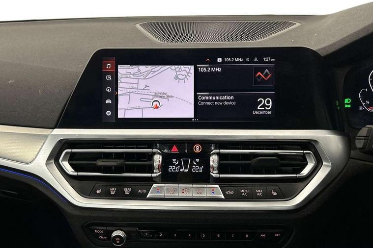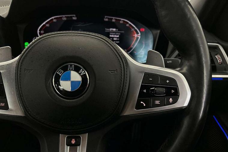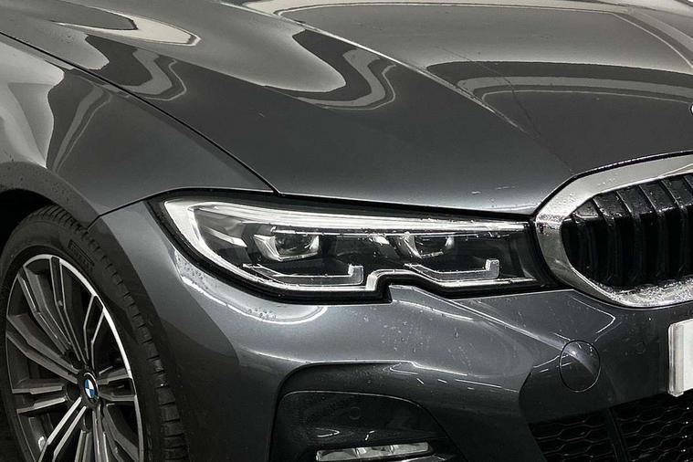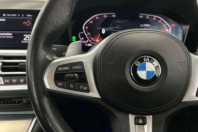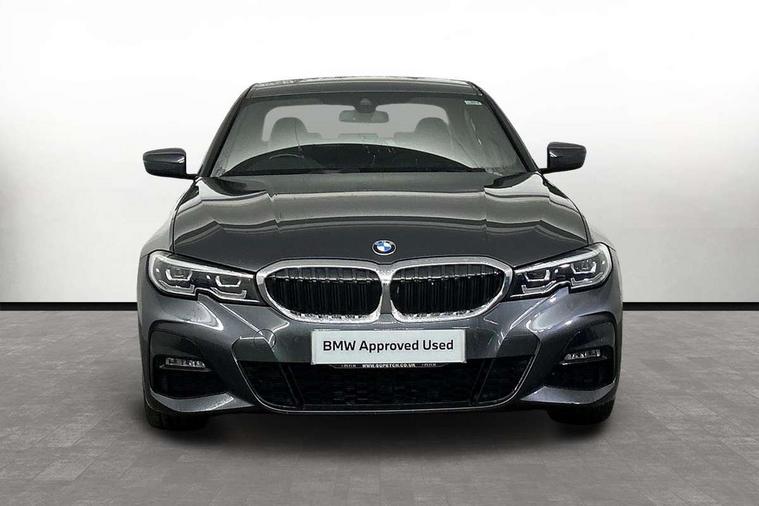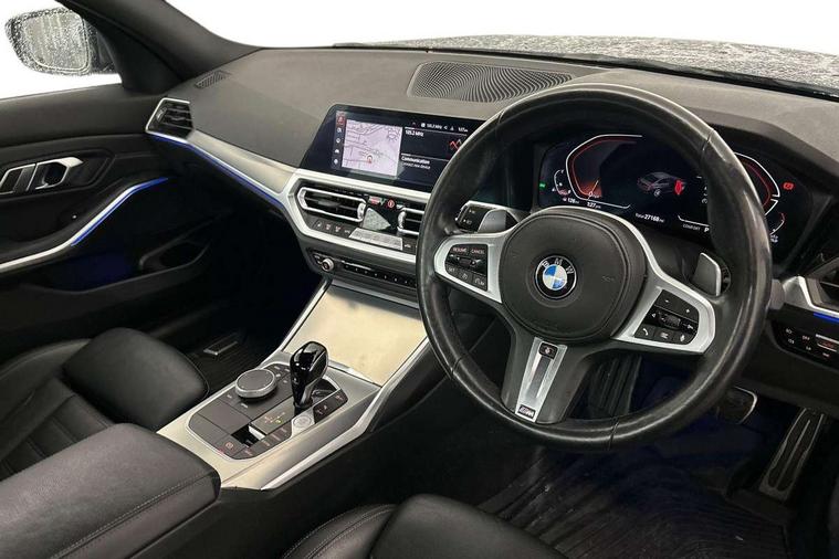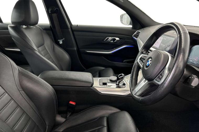 Active guard plus, Attentiveness assist, Auto start-stop, Bluetooth hands free facility with USB audio interface with audio streaming, BMW Live Cockpit Professional Nav with 12.3" instrument display + 10.25" display, Intelligent Voice Assist, BMW OS 7, HDD, 2USB, 4G LTE connect, BMW service history, BMW Teleservices, Brake pad wear indicator in front and rear, Check Control warning system for monitoring of lights and door/luggage compartment open warning, Condition based service, Cruise control with brake function + speed limiter, Electric power steering with Servotronic steering optimised at all speed ranges, iDrive controller on centre console, Instrument cluster with speedometer with mph readout, tachometer, fuel gauge and oil temperature gauge, Integrated owners handbook, Oil sensor for level and grade, warning by check control system, On board computer - average speed+fuel consumption, service interval, clock/date, odometer/trip meter, outside temperature display and ice warning, Optimum shift indicator, Personal Profile - automatic lock when driving away selectable, Variable sport steering, Balanced 50/50 weight distribution, Battery cut-out switch, Drive performance control - ECO PRO, comfort and sport modes, Larger capacity fuel tank, M sport suspension, Petrol Particulate Filter, Stroke dependent dampers, DAB tuner, Electronic service booklet, Acoustic glazing, Active airstream chrome frame kidney grille with 8 high gloss black vertical slats, Automatic headlight beam throw control with load dependent regulating reaction, dynamic compensation of braking dive and acceleration squat, Black roof mouldings, Body colour door handles, Body colour front and rear bumpers, Body colour fuel filler flap, Body colour mirror caps with bottom segment in matt black, Dynamic brake lights, Electric windows - front and rear, with open/close fingertip control, anti-trap facility and comfort closing, Exhaust tailpipe - split left and right, Exterior mirrors - electrically folding with anti-dazzle, Fading support, Front and rear bumper system with replaceable deformation elements, Front black door sill finishers with BMW designation, Green tinted heat protection glazing, High gloss shadow line exterior trim, Interior rear view electrochromatic mirror with automatic anti dazzle function, LED daytime running lights, LED front fog lights, LED third brake light, Lightweight engineering, M designation on front side panels, left and right, Matt black exterior B pillar, Model designation on right side of tailgate, Rain sensor with automatic headlight activation, Rear boot, Rear side wing doors, Shark fin antenna, Two part LED tailights in L-shape with components in smoked glass, brake light, LED turn indicator and rear fog light, Visible VIN plate, Welcome lights in interior and door handle area, Windscreen wipers with integrated washing jets, 12V power socket in front storage compartment, 2 front cupholder in centre console with clamping elements and matt black inlay, 3 rear seats with non folding headrests with 3 point seat belts, 3 seat bench in 2nd row, 3 zone automatic air conditioning, 4 pieces lashing eyelets in luggage compartment, 40:20:40 split folding rear seat with loading system, Ambient lighting with welcome carpet light, Anthracite headlining, Armrest integrated in front and rear door trim + front centre console armrest, Backrest width adjustment, Centred top Luggage compartment lights, Four grab handles integrated in roof lining, Front and rear door exit lighting (left / right), Front and rear door pockets, Front and rear reading lights, Front and rear velour floor mats, Front head restraints, Front sport seats, Heated front seats, Height adjustable mechanically and infinitely variable steering column, Illuminated armrest storage compartment, Illuminated glove compartment with separate small compartment, Interior lighting - front centre over interior mirror with soft light, rear centre and front and rear footwell lighting, M sport leather steering wheel, Make-up mirror lights, Rear centre armrest with 2 cupholders, Rear centre console with storage compartment and ventilation grille, Single front passenger seat, Sunvisors with vanity mirrors and ticket pocket, Toolkit located in luggage compartment, Connected pack professional - 3 Series Saloon/Touring, M sport exterior styling pack - 3 Series Saloon/Touring, Parking assistant pack - 3 Series, 2 tone horn, BMW emergency call, Brake energy regeneration, Braking pre-tensioning, Child proof locking system in rear door, Child seat ISOFIX attachment rear outer seats, Coasting in idle in ECO PRO mode, Crash sensor activating of airbags, Unlocking doors, hazard warning lights, fuel cut off, interior lighting+activation of safety battery terminal clamp, Driver and front passenger side airbags, integrated in the door side seat backrest bolsters for all seat variants, Driver/Front Passenger airbags, Dry braking, Dynamic brake control, Dynamic stability control + (DSC+) - Anti-lock Braking System (ABS) with brake assist and cornering brake control + Automatic Stability Control (ASC), Dynamic Traction Control - DTC, Electromechanical parking brake including automatic hold function and automatic release of the parking brake when pulling away, Electronic differential lock control (EDLC), Front passenger manual airbag deactivation, Head airbags for all 4 outer seats, Hill start assist, Seat belt security check for driver and front passenger, Side impact protection, Three 3 point seat belts on all seats including front belt stopper, pyrotechnic belt tensioners and belt force limiters, Tyre pressure monitoring with three level warning strategy, Ventilated front and rear disc brakes, Warning triangle and first aid kit, Alarm system (Thatcham 1) with remote control and electronic engine immobiliser, Central locking switch for all doors, fuel filler cap and luggage compartment, Remote control with integrated key one button open/close vehicle and windows, sole o