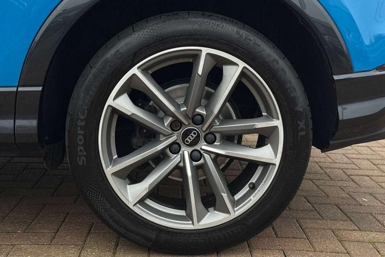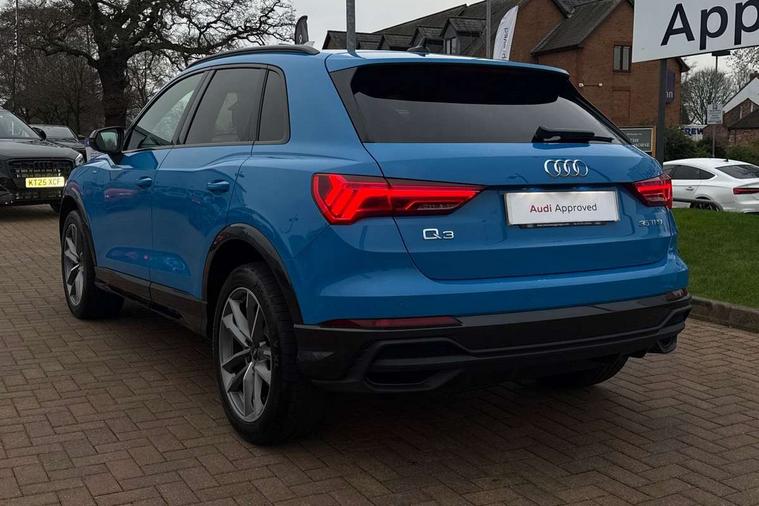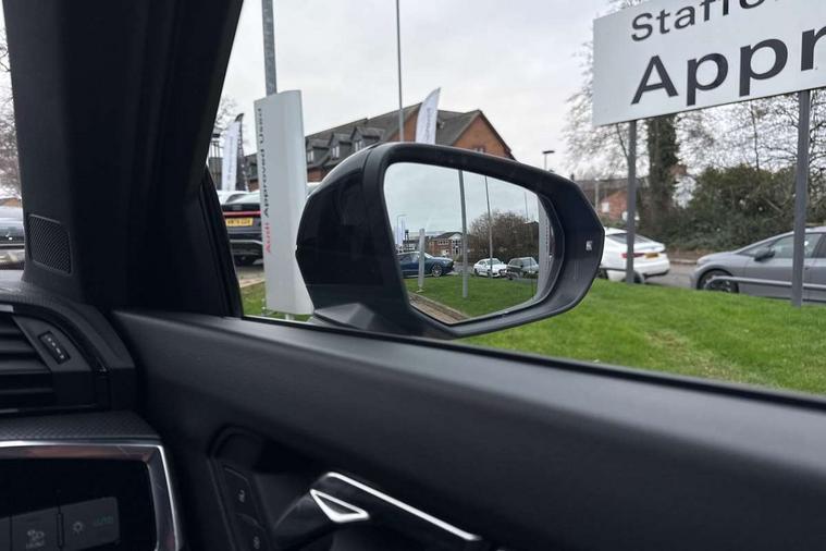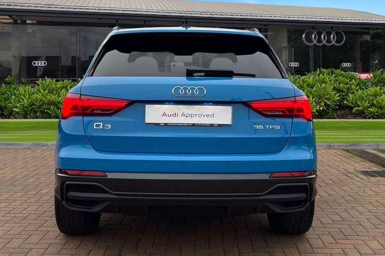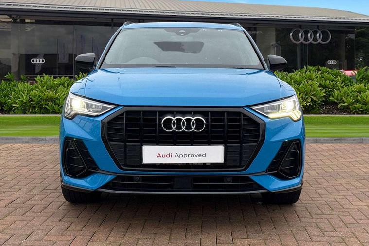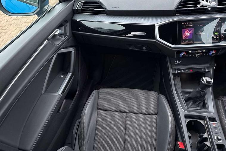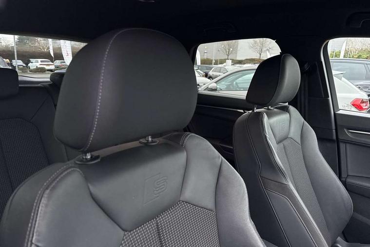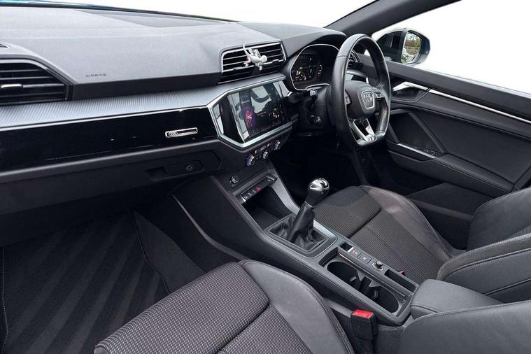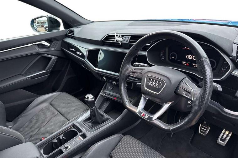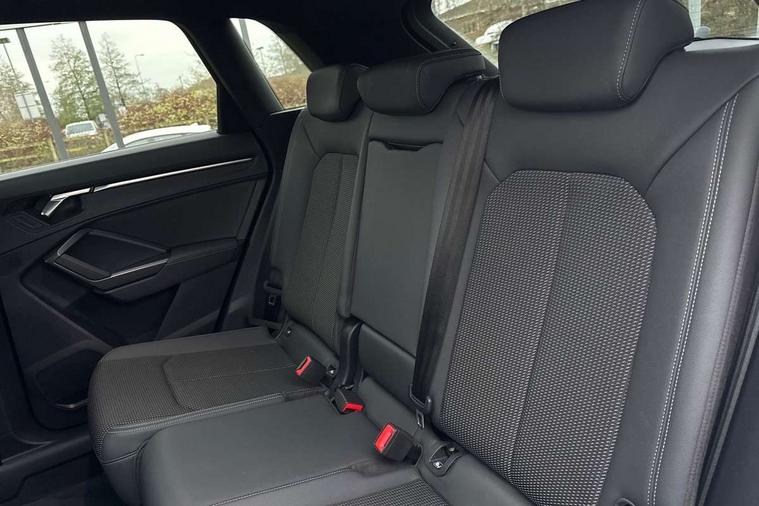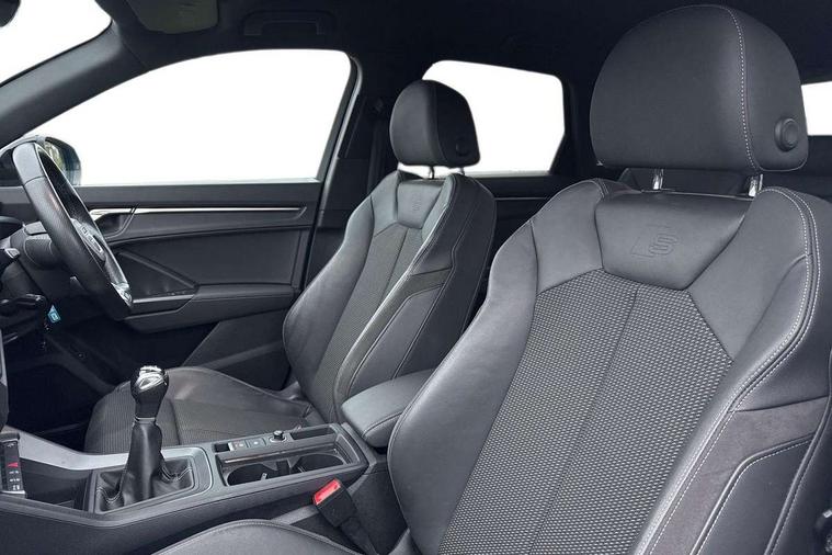 Amazon alexa Integration, Audi drive select, Audi lane departure warning, Audi smartphone interface includes wireless Apple carplay/Android Auto, Audi Virtual Cockpit - 10.25" display, Bluetooth interface, Camera based traffic sign recognition, Cruise control + speed limiter, Legal emergency call, MMI Navigation Plus with high resolution 10.1 inch touchscreen colour display, Power operated tailgate, Progressive steering, Rear parking sensors, Service interval indicator, Start stop system with recuperation, Voice control system with natural language interaction, Sports suspension, 2 USB-C ports with charge and data functions, 6 passive loudspeakers, DAB digital radio module, Acoustic windscreen, Auto dimming frameless rear view mirror, Black roof rails, Electrically folding, adjustable and heated door mirrors with integrated LED side indicators and kerb view function for passenger side, Front and rear electric windows, Front fog lights, Grille vertical bars in aluminium silver/Matt, High gloss black finish B and C pillars, LED headlights with LED daytime running lights, LED rear lights, LED third brake light, Privacy glass dark tinted rear and rear-side windows (from B-pillar backwards), Rain and light sensors, Rear diffuser grille in grained matt black, Rear diffuser strip in matt titanium black, Rear side wing doors, Rear wiper, S line bumpers in contrasting Manhattan grey, Variable front intermittent wipers, 12V socket in rear centre console, 3 seat bench in 2nd row, 3 spoke flat bottomed multi-function leather sport steering wheel, 40:20:40 folding with manual adjustment for 60:40 forwards/backwards position and backrest angle, Adjustable rear seat bench/backrest with centre armrest and cupholder, Black cloth headlining, Dual zone electronic climate control, Front and rear black floor mats with contrast stitching in rock grey, Front and rear headrests, Front and rear roof module including reading lights, Front centre armrest, Glove compartment lighting, Height and reach adjustable steering wheel, Illuminated door sill trims with S logo, ISOFIX child seat mounting for front passenger with airbag deactivation and outer rear seat including top tether attachment point for outer rear seats, Luggage compartment light, Manual front seats with height adjustment, Perforated leather gearknob, Single front passenger seat, Stainless steel luggage compartment sill finisher, Stainless steel pedals, Black styling pack - Q3, Non smoking pack - Q3, 3x3 point rear seatbelts, 6 airbags - Driver, front passenger, curtain and side windows, Audi pre-sense front with pedestrain and cyclist recognition, Electromechanical parking brake, Electronic stabilisation control including ABS, ASR and EDL, Front seatbelt reminder, Hill descent control, Hill hold assist, Manual child lock in rear doors, Pre sense basic, Seatbelt monitoring, Tyre pressure warning, Warning triangle and first aid kit, Anti theft alarm, Anti theft wheel bolts, Immobiliser, Remote central locking, Detail dashboard around MMI touch colour display in glass look, black with surround in aluminium look, Leatherette door armrest, Piano black inlay,