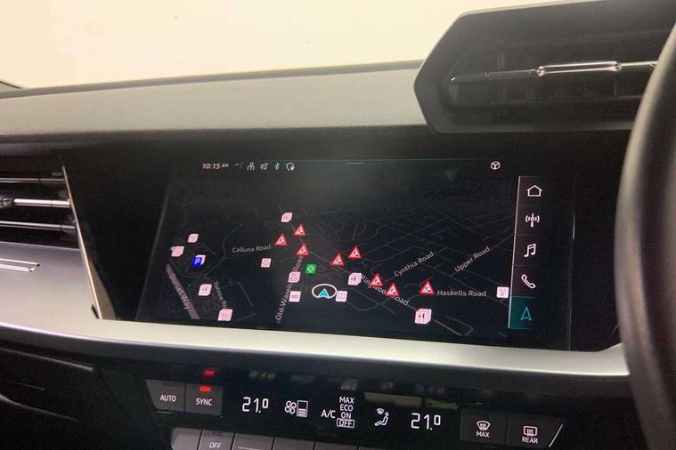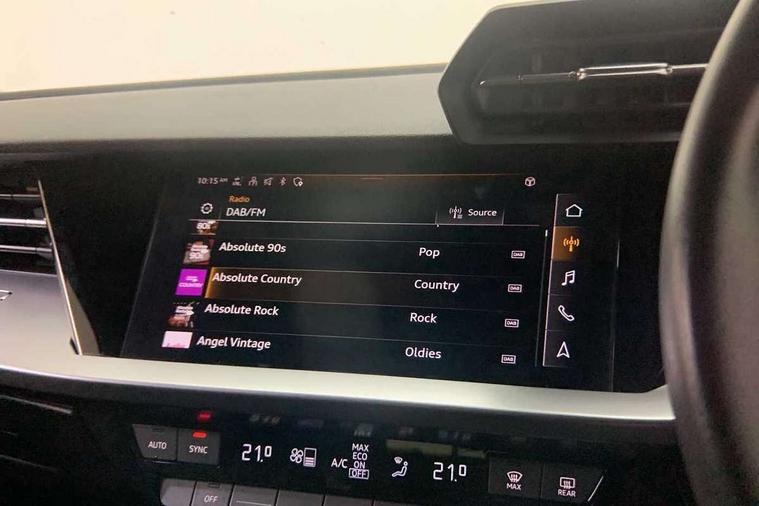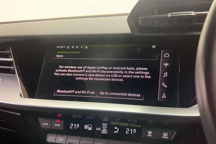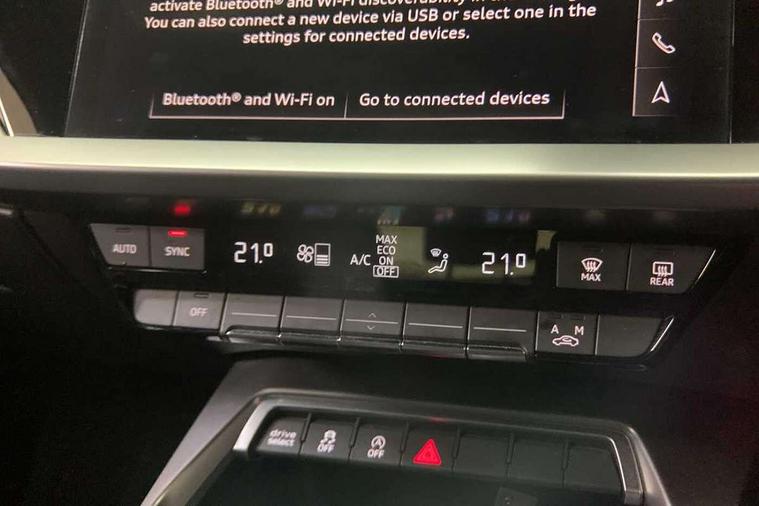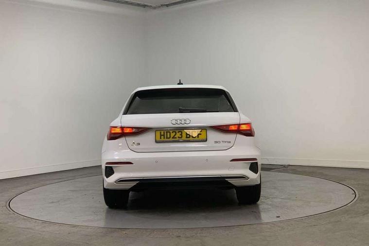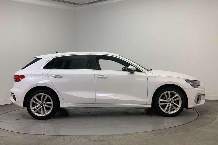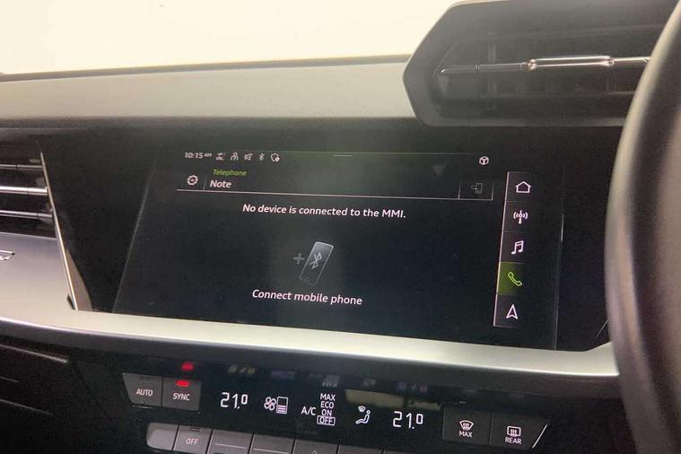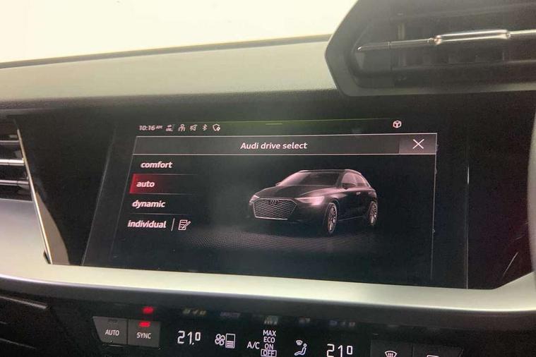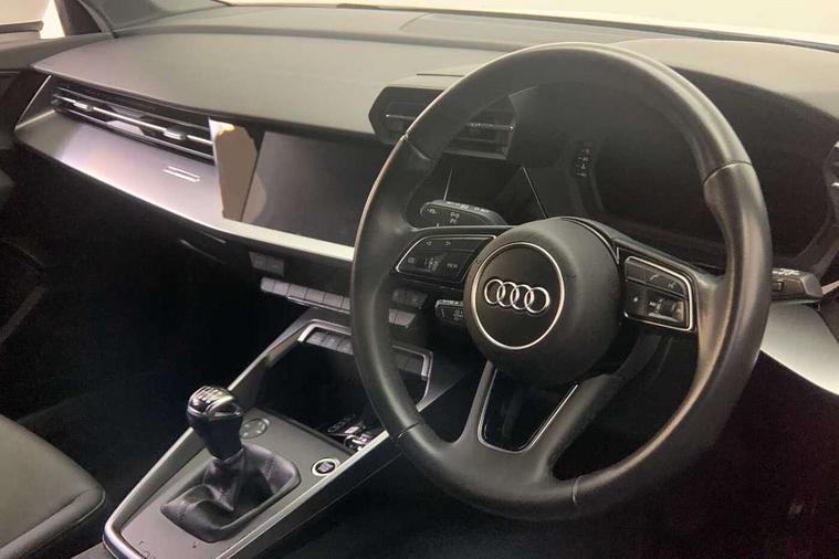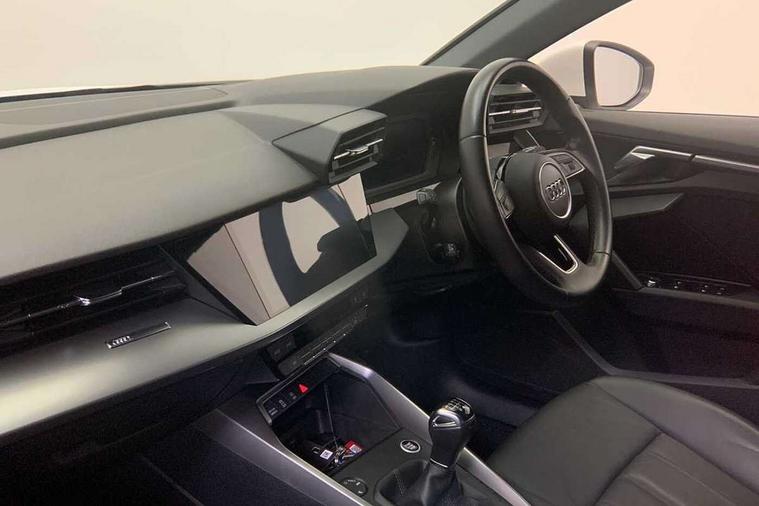 Audi drive select (Auto, Comfort, Dynamic and Individual), Audi smartphone interface, Audi Virtual Cockpit - 10.25" digital and colour instrument cluster, Automatic start/stop system with recuperation, Bluetooth interface, Camera based traffic sign recognition, Collision avoidance assistant, Cruise control, e-Call (emergency call), Electromechanical power speed sensitive steering, Lane departure warning system, MMI Navigation Plus with high resolution 10.1" colour touch screen display, Rear parking sensors, Service indicator, Trip computer, Voice control system with natural language interaction, Standard suspension, 2xUSB-C connection with data and charging functions, 6 passive loudspeakers, DAB Digital radio, 3rd brake light, Acoustic glass windscreen, Aluminium window trim, Auto dimming frameless rear view mirror, Body colour exterior mirrors, Body colour roof spoiler, Electrically adjustable/heated/folding/auto dimming door mirrors with integrated LED indications + kerb view function for passenger side, Front electric windows, LED daytime running lights, LED headlights and halogen rear lights, Light and rain sensors, Rear electric windows, Rear side wing doors, Rear window, rear door windows and rear side windows in clear glass, Rear wiper, 12V socket and storage compartment in front centre console, 3 seat bench in 2nd row, 3 spoke leather multifunction steering wheel, 4 way electrically adjustable lumbar support for driver and front passenger, 60/40 split folding rear seat bench, Dual zone electronic climate control, Front and rear headrests, Front centre armrest, Front door sill trims with aluminium inlay, Front/rear floor mats, Height and reach adjustable steering wheel, Interior lighting - Front and rear roof module including reading lights, glove compartment light and right hand side, Interior lighting - glove compartment light and right hand side, Luggage compartment floor covering, Manual boot compartment lid, Manually adjustable front seats, Routine cloth upholstery with front sports seats, Seat side bolsters, Single front passenger seat, Steel grey cloth headlining, Aluminium interior elements pack - A3 Sportback, LED interior lighting pack - A3 Sportback, Sport styling pack - A3 Sportback, 3x3 point rear seat belts, Driver and front passenger airbag with passenger airbag deactivation, Electronic Stabilisation Control (ESC) including ABS, ASR and EDL, First aid kit with warning triangle and 2 safety vests, Front side airbags with head airbags and interaction airbag, Pre-sense front with pedestrian and cyclist detection, Seatbelt monitoring, Tyre pressure loss indicator, Anti theft alarm, Anti-theft wheel bolts, Electronically operated child lock, Immobiliser, Remote control central locking, Inlays with silk effect paint in platinum grey,