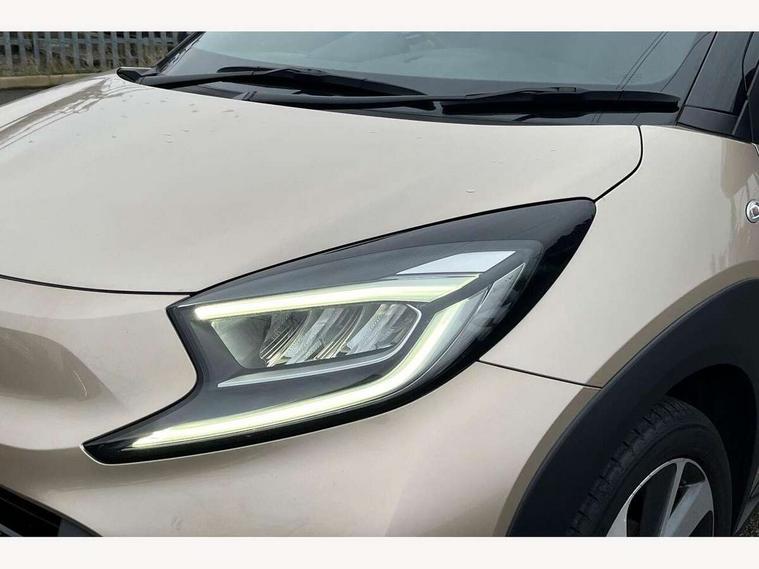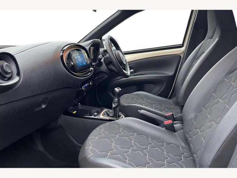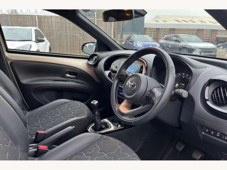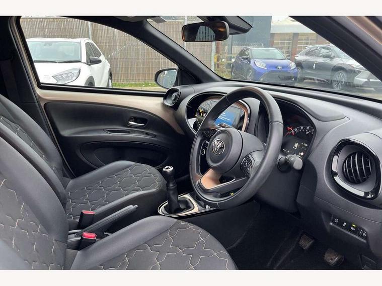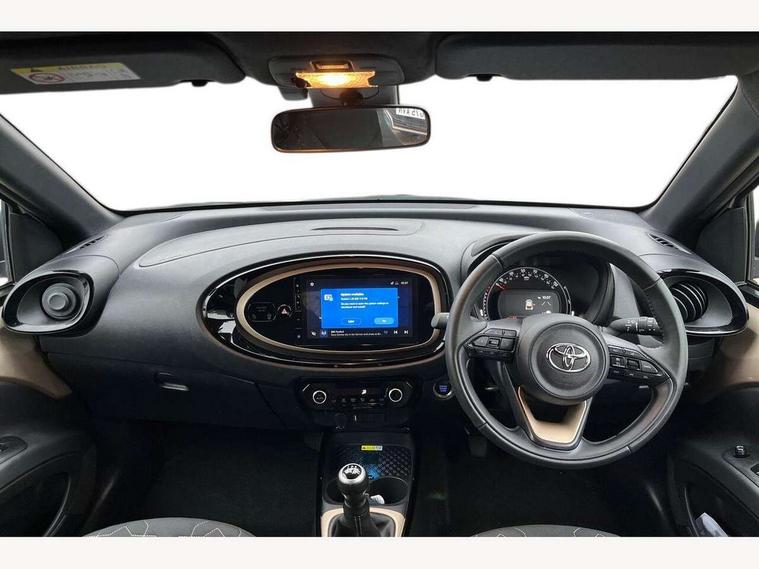 4.2" TFT colour screen, Adjustable speed limiter, Analogue speedometer, Bluetooth connectivity, Digital tachograph, Driver attention alert system, eCall emergency call system, Electric power steering, Front and rear parking sensors with auto brake, Intersection turn assist, Key reminder warning, Noise reduction kit, Pre collision system with emergency steering assist, Remote boot door release on key, Reversing camera with static guide lines, Smart entry and push button start, Speed limit display, Start and stop, Wireless charger, Wireless Smartphone Integration includes Apple CarPlay and Android auto, Vehicle Stability Control (VSC), 4 speakers, 9" HD multimedia display touch screen with Toyota smart connect, DAB digital audio broadcast, USB connector, Auto headlights, Auto wipers, Automatic headlights cut-off, Automatic high beam On/Off switch, Bicycle towing hook, Black fog light surrounds, Black side protection mouldings, Black wheel arch mouldings, Body colour door handles, Body coloured front bumper, Boot door scuff plate, Eclipse black rear bumper, Electric heated door mirrors, Follow me home headlights, Front and rear underruns in silver, Front fog lights, Front power windows, Gloss black door mirrors, Gloss black upper front grille, Headlight cut-off reminder, LED daytime running lights guide, LED front light guide, LED High mounted stop lamp, LED projector headlights, Manual day/night rear view mirror, Manual headlight levelling, Pagoda roof, Power adjustable door mirrors, Power back door, Privacy glass, Rain sensor, Rear combination lights LED bulb type, Rear side wing doors, Rear windscreen defogger, Rear windscreen wiper, Remote hazard lights system, Short antenna, Variable intermittent windscreen wipers, 12v power outlet - front, 2 seat bench in 2nd row, 3 spoke leather steering wheel, 50/50 split folding rear seat, Adhesive roof headlining, Adjustable speed limiter switch on steering wheel, Audio and telephone switches on steering wheel, Auto air conditioning, Black roof lining, Body colour satin anodised insert on steering wheel, Boot light, Centre room light, Chrome interior door handles, Chrome surround on air conditioning buttons, Clean air filter, Console box storage, Floor mats, Front and rear cup holders, Front head rest deco art, Front head restraints, Height adjustable driver seat, Intelligent adaptive cruise control switch on steering wheel, ISOFIX child restraint system on rear seats, Lane departure alert switch on steering wheel, Leather gearshift knob, Light blue ambient lighting in centre console, Manual tilt steering wheel, Manually reclining and sliding driver seat, Manually reclining and sliding front passenger seat, Multimedia switches on steering wheel, Partial synthetic leather upholstery, Pollen filter, Rear door pockets, Rear head restraints, Satin silver insert on gear shift knob, Single compartment glovebox with lights, Single front passenger seat, Soft tonneau cover, Sun visors with mirror on driver and passenger side, Voice recognition switch on steering wheel, Toyota safety sense pack - Aygo X, Anti lock braking system + Electronic brake force distribution, Child safety door lock, Emergency brake light signal (EBS), Hill start assist control (HAC), Passenger airbag on/off switch, Seat belt reminder for front and rear seats, Supplement restraints system (SRS) - 6 airbags, Traction control, Tyre pressure warning system, Immobiliser, Remote power door locks, Black wheel centre caps, Tyre repair kit,