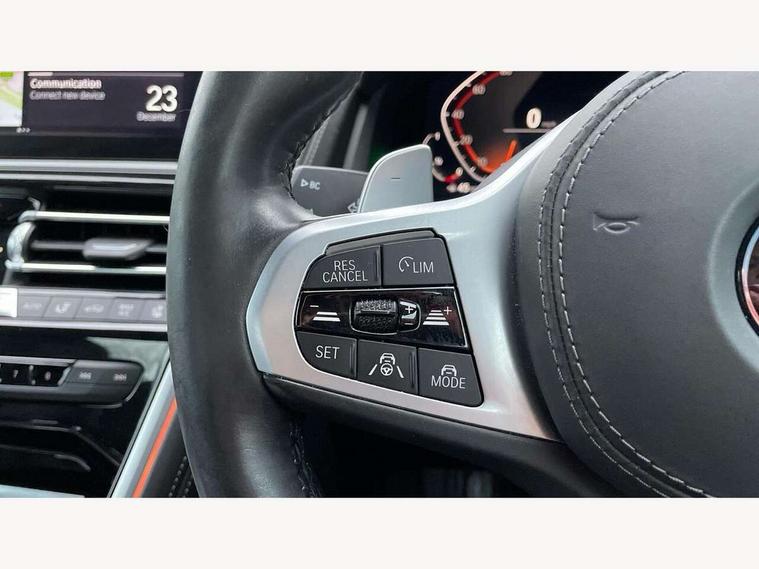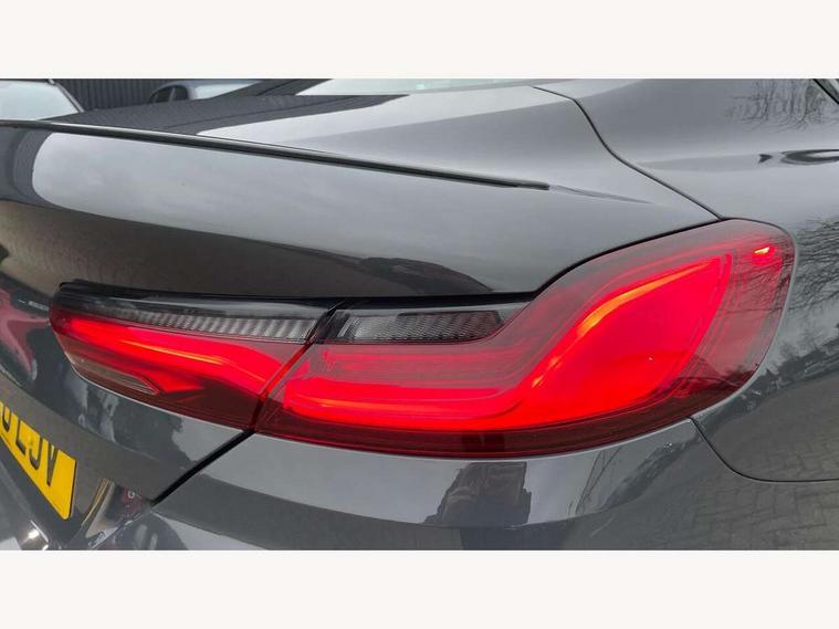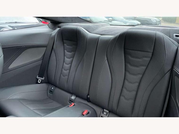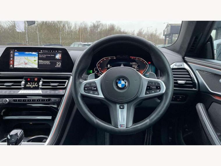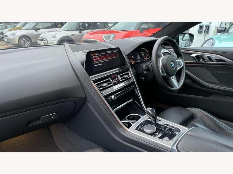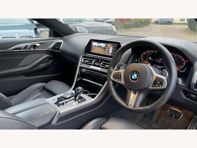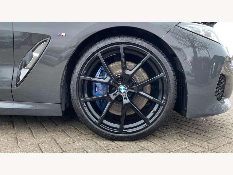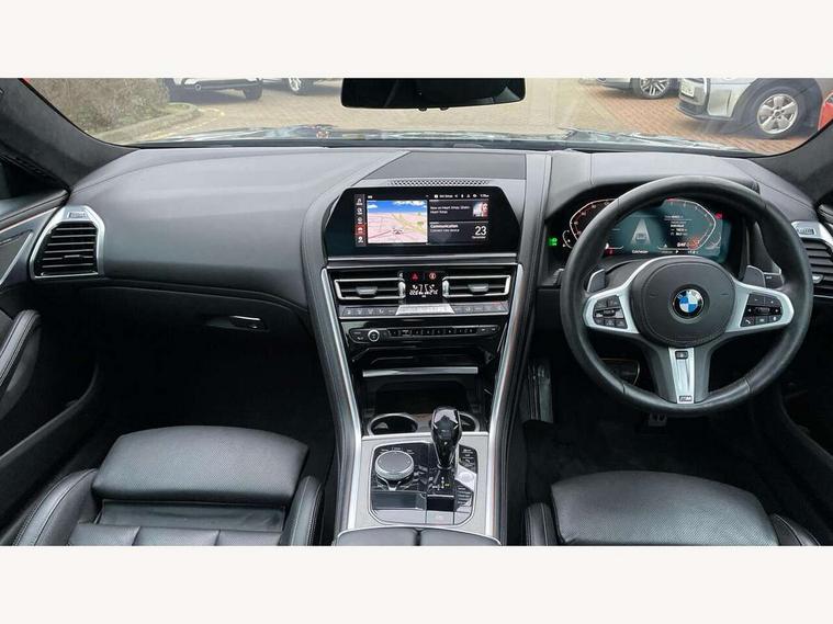 Active Guard incl speed limiting and lane departure functions with auto steering, and front collision warning with brake intervention, BMW legal emergency call, BMW Live Cockpit Professional sat nav system with intelligent personal assistant, voice control, gesture control, BMW Online services, BMW Teleservices, Brake pad wear indicator, Check control system, Condition based service, Drive experience control with Sport, Comfort, Eco Pro and Adaptive modes, Enhanced bluetooth with wireless charging, Head up Display, iDrive touch controller with shortcut buttons, Instrument and upper door panel in walknappa leather, Integrated owners handbook, Oil sensor for level and grade, On board computer, Outside temperature display, Powered tailgate operation, Rear view camera, Run flat indicator, Service interval indicator, Wifi hotspot preparation, Adaptive M suspension, Double wishbone front axle, Dynamic Damper Control, Eight speed sport automatic transmission with gearshift paddle switches, Petrol Particulate Filter, DAB Digital radio, Favourite buttons, USB/audio interface, Bright chrome kidney grille, Carbon core, Chrome M designation on front side panel, left and right, Climate comfort windscreen, Dynamic brake lights, Electrically adjustable, heated, folding exterior mirrors, Follow me home headlight function, Frameless interior mirror, Front and rear bumper system with replaceable deformation elements, Front electric windows, Heated windscreen washer jets, High beam assistant, Illuminated door handles, LED rear lights, M aerodynamic body styling with dark shadow elements, Model logo on right tailgate, Rain sensor with automatic headlight activation, Rear apron trim insert in dark shadow metallic, Satinised aluminium kidney struts, Thermally insulated windscreen, Third brake light featuring LED technology, Welcome lights in interior and door handle area, 2 cup holders in front, 2 X front 12v power sockets, 50/50 split folding rear seat, Automatic air conditioning with 2-zone control, Dynamic ambient interior lighting, Electric front seat adjustment with driver memory, Front entry lights doors, Front reading lights, Front seat heating, Front sun visors with ticket holder and illuminated mirror, Illuminated glovebox, Illuminated M door sill finishers, Lockable glove compartment with light, M Pedals, M sport leather steering wheel including multifunction controls, Microfilter and active carbon filter, Rear head restraints, Steering column with adjustable height and length and activation via control on the steering column, Velour floormats, Connected professional pack - 8 Series, M sport exterior styling aerodynamics pack - 8 Series, ABS/EBD, Active front seat headrests, Active protection, Airbags - Driver and front passenger airbag with seat occupancy detection, knee, side and front passenger seat airbag deactivation, Child seat ISOFIX attachment rear outer seats, Cornering brake control (CBC), Crash sensor activating central locking release, hazard warning lights, fuel cut off, interior lighting, safety battery terminal clamp and airbags, DSC - Dynamic Stability Control, Dynamic brake control, Dynamic Traction Control - DTC, Electromechanical parking brake with automatic drive away release and auto hold function, Front and rear brake discs with interior ventilation, Front and rear head airbags, Front three point with pyrotechnical belt latch tensioner seat belts, belt force limiter and belt stopper, Fuel supply cut off, Hill start assist, Rear three point with pyrotechnical belt latch tensioner seat belts and belt force limiter, Side impact protection, Two tone horn, Tyre pressure monitoring system (TPMS), Warning triangle and first aid kit, Alarm system (Thatcham 1) with electronic engine immobiliser, Centre lock switch, Closing system with central locking, Comfort access system, Keyless engine start, Locking wheel bolts, Vehicle key with exclusive M designation,