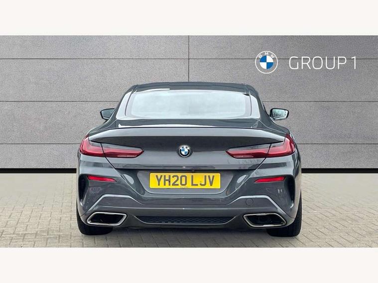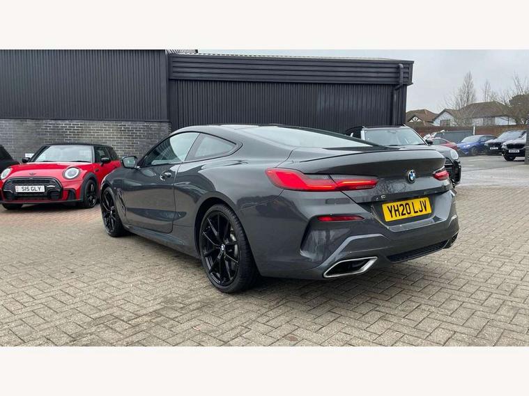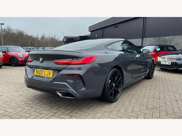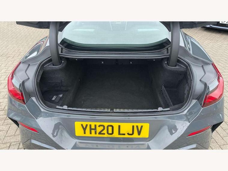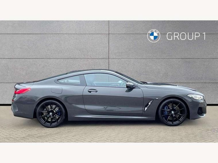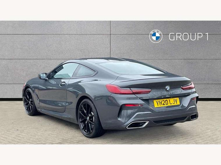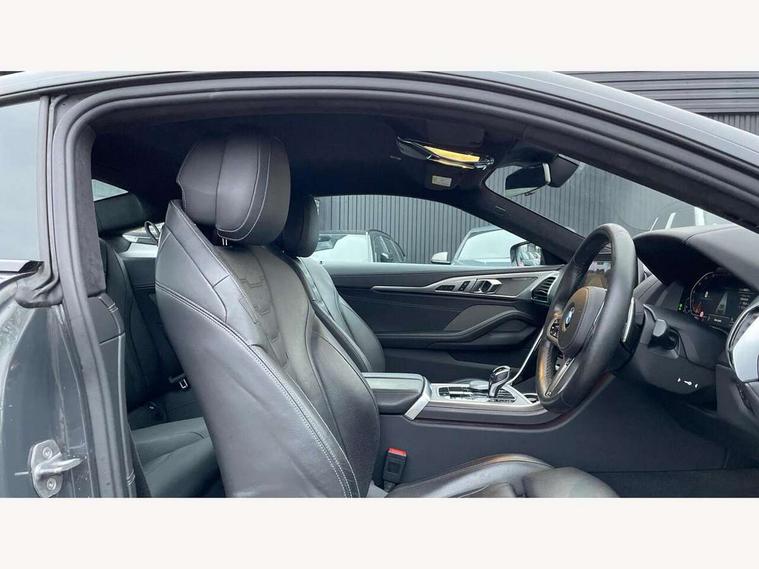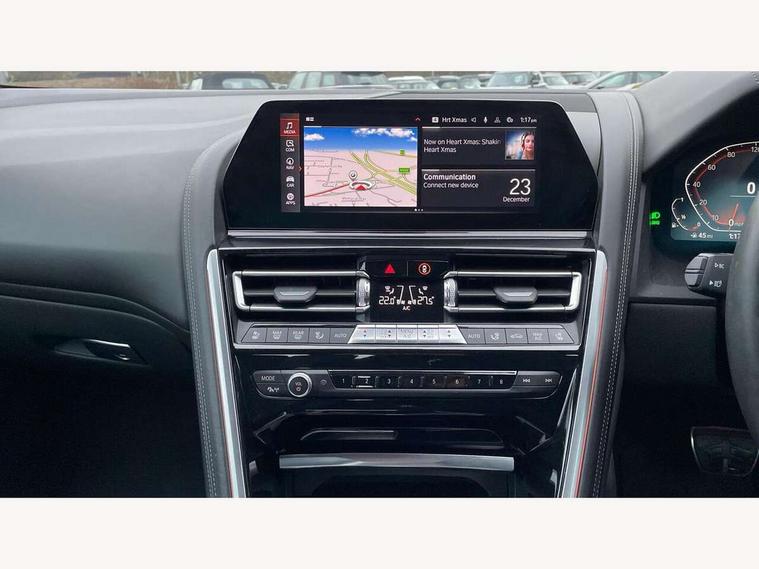 Active Guard incl speed limiting and lane departure functions with auto steering, and front collision warning with brake intervention, BMW legal emergency call, BMW Live Cockpit Professional sat nav system with intelligent personal assistant, voice control, gesture control, BMW Online services, BMW Teleservices, Brake pad wear indicator, Check control system, Condition based service, Drive experience control with Sport, Comfort, Eco Pro and Adaptive modes, Enhanced bluetooth with wireless charging, Head up Display, iDrive touch controller with shortcut buttons, Instrument and upper door panel in walknappa leather, Integrated owners handbook, Oil sensor for level and grade, On board computer, Outside temperature display, Powered tailgate operation, Rear view camera, Run flat indicator, Service interval indicator, Wifi hotspot preparation, Adaptive M suspension, Double wishbone front axle, Dynamic Damper Control, Eight speed sport automatic transmission with gearshift paddle switches, Petrol Particulate Filter, DAB Digital radio, Favourite buttons, USB/audio interface, Bright chrome kidney grille, Carbon core, Chrome M designation on front side panel, left and right, Climate comfort windscreen, Dynamic brake lights, Electrically adjustable, heated, folding exterior mirrors, Follow me home headlight function, Frameless interior mirror, Front and rear bumper system with replaceable deformation elements, Front electric windows, Heated windscreen washer jets, High beam assistant, Illuminated door handles, LED rear lights, M aerodynamic body styling with dark shadow elements, Model logo on right tailgate, Rain sensor with automatic headlight activation, Rear apron trim insert in dark shadow metallic, Satinised aluminium kidney struts, Thermally insulated windscreen, Third brake light featuring LED technology, Welcome lights in interior and door handle area, 2 cup holders in front, 2 X front 12v power sockets, 50/50 split folding rear seat, Automatic air conditioning with 2-zone control, Dynamic ambient interior lighting, Electric front seat adjustment with driver memory, Front entry lights doors, Front reading lights, Front seat heating, Front sun visors with ticket holder and illuminated mirror, Illuminated glovebox, Illuminated M door sill finishers, Lockable glove compartment with light, M Pedals, M sport leather steering wheel including multifunction controls, Microfilter and active carbon filter, Rear head restraints, Steering column with adjustable height and length and activation via control on the steering column, Velour floormats, Connected professional pack - 8 Series, M sport exterior styling aerodynamics pack - 8 Series, ABS/EBD, Active front seat headrests, Active protection, Airbags - Driver and front passenger airbag with seat occupancy detection, knee, side and front passenger seat airbag deactivation, Child seat ISOFIX attachment rear outer seats, Cornering brake control (CBC), Crash sensor activating central locking release, hazard warning lights, fuel cut off, interior lighting, safety battery terminal clamp and airbags, DSC - Dynamic Stability Control, Dynamic brake control, Dynamic Traction Control - DTC, Electromechanical parking brake with automatic drive away release and auto hold function, Front and rear brake discs with interior ventilation, Front and rear head airbags, Front three point with pyrotechnical belt latch tensioner seat belts, belt force limiter and belt stopper, Fuel supply cut off, Hill start assist, Rear three point with pyrotechnical belt latch tensioner seat belts and belt force limiter, Side impact protection, Two tone horn, Tyre pressure monitoring system (TPMS), Warning triangle and first aid kit, Alarm system (Thatcham 1) with electronic engine immobiliser, Centre lock switch, Closing system with central locking, Comfort access system, Keyless engine start, Locking wheel bolts, Vehicle key with exclusive M designation,