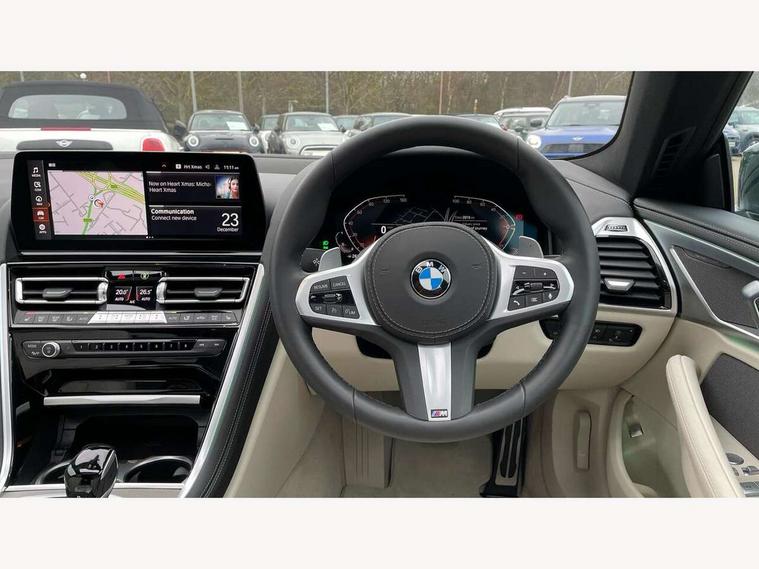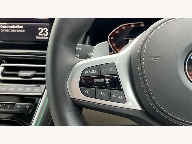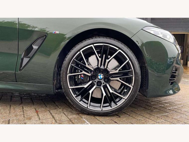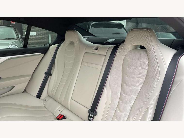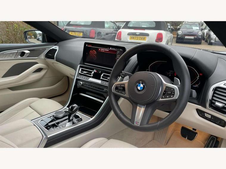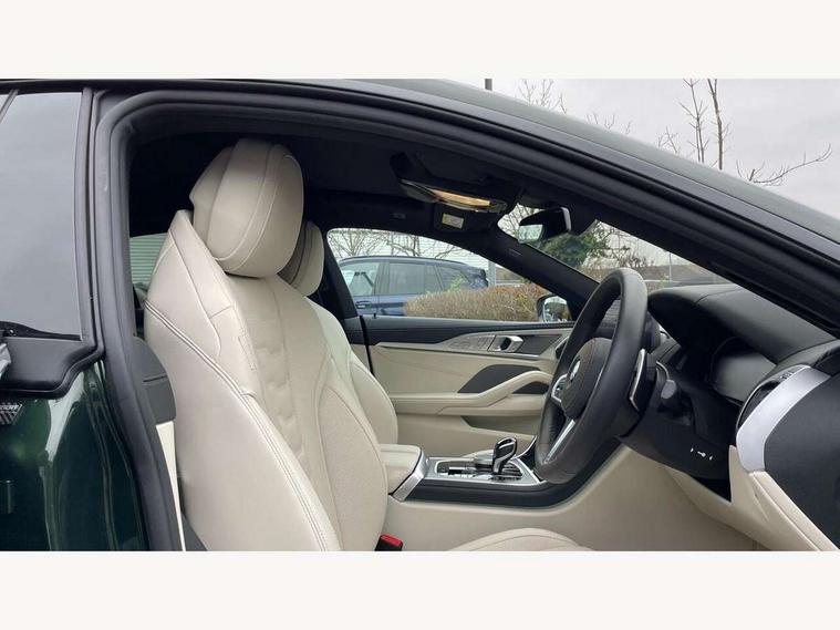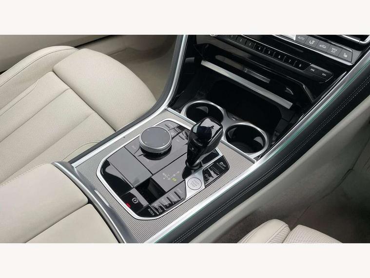 Automatic tailgate operation, remote opening with key, closing by tailgate button or remote control including tailgate in LED technology, Bluetooth hands free facility with USB audio interface, voice control and enhanced bluetooth + Wireless charging, BMW ConnectedDrive online services, BMW legal emergency call, BMW Live cockpit professional with 12.3" instrument display, BMW Teleservices, Brake pad wear indicator, Check control system, Condition based service, Drive experience control with Sport, Comfort, Eco Pro and Adaptive modes, Electric bootlid, Engine start/stop button, Head up Display, iDrive controller with shortcut buttons, Integrated owners handbook, Light on warning, Oil sensor for level and grade, On board computer, Outside temperature display, Service interval indicator, Servotronic system, Wi-Fi hotspot, Adaptive M suspension, Double wishbone front axle, Dynamic Damper Control, Eight speed sport automatic transmission, M Sport differential, Petrol Particulate Filter, Sport exhaust system, DAB Digital radio, Favourite buttons, Automatic windscreen wipers and automatic headlight, Carbon core, Climate comfort windscreen, Daytime driving lights front and rear active, Dynamic brake lights, Exterior mirrors - Floating design mirror, electric adjust/heated/folding, aspherical, Follow me home headlight function, Frameless interior mirror, Front and rear bumper system with replaceable deformation elements, Front electric windows, Front ornamental grille with kidney grille bars, Heat protection, sun protection glazing, Heated rear window, glass, Heated windscreen washer jets, High beam assistant, Illuminated door handles, Illuminated radiator grille iconic glow, LED rear lights, Model logo - right tailgate in chrome, M emblem on side panel in light chrome, badge on bonnet and tailgate, Rain sensor and automatic driving lights control, Rear boot, Rear side wing doors, Side window graphic in black high gloss, Sun protection glass, Thermally insulated windscreen, Third LED technology brake light in rear window, Welcome lights in interior and door handle area, 1 x 12V power socket in front centre console, 2 cup holders in front, 2 rear head restraints, 3 spoke M sport leather multifunction steering wheel with shift paddle, 4 zone control automatic air conditioning, 5 seats, 50/50 split folding rear seat, Ambient light with dynamic interior light, BMW ID, Front and rear seat heating, Front door pockets, Front entry lights doors, Front reading lights, Front sun visors with ticket holder and illuminated mirror, Interior lighting - Interior light front centre above interior mirror, luggage compartment light, automatic interior light system soft on/soft off, Lashing eyelets, Lockable glove compartment with light, Microfilter and active carbon filter, Steering column with adjustable height and length and activation via control on the steering column, Storage compartment under front centre armrest with light, 1 x 12V power socket and USB, Through loading function, Connected professional pack - 8 Series, M sport exterior styling aerodynamics pack - 8 Series, 3x3 point rear seatbelts, ABS/EBD, Active protection, Airbags - Driver and front passenger airbag with seat occupancy detection, knee, side and front passenger seat airbag deactivation, Brake discs, compound structure, Child locks on rear doors, Cornering brake control (CBC), Crash sensor activating central locking release, hazard warning lights, fuel cut off, interior lighting, safety battery terminal clamp and airbags, DSC - Dynamic Stability Control, Dynamic brake control, Dynamic Traction Control - DTC, Electromechanical parking brake with automatic drive away release and auto hold function, Front three point with pyrotechnical belt latch tensioner seat belts, belt force limiter and belt stopper, Head airbags for 1st and 2nd seat row, Hill start assist, Integrated brake system, ISOFIX child seat mounting for the two outer rear seats, Rear three point with pyrotechnical belt latch tensioner seat belts and belt force limiter, Side impact protection, Tyre pressure monitoring system (TPMS), Warning triangle and first aid kit, Alarm system (Thatcham 1) with electronic engine immobiliser, Centre lock switch, Closing system with central locking, Comfort access system, Locking wheel bolts, Vehicle key with exclusive M designation, Instrument and upper door panel in black walknappa leather with contrast stitching,