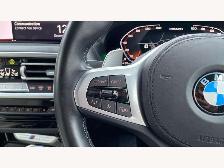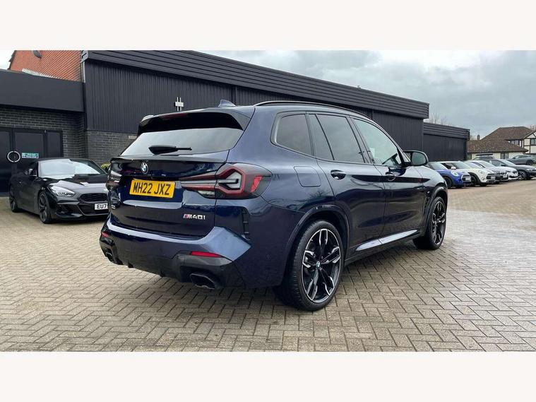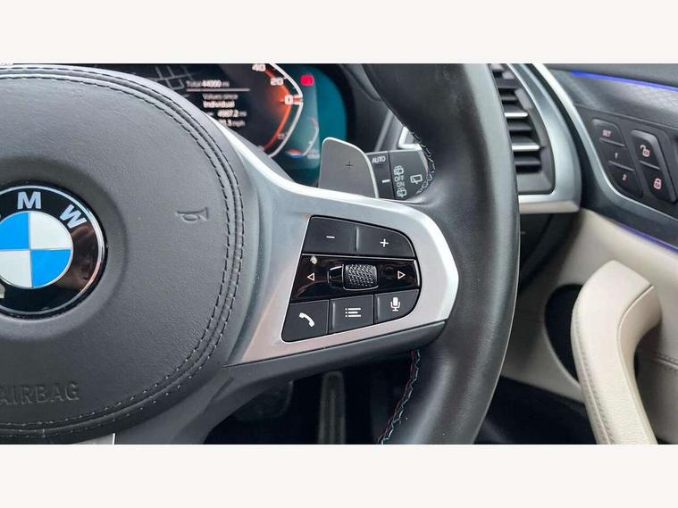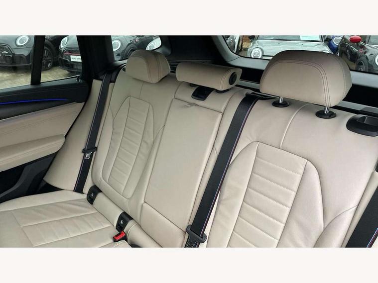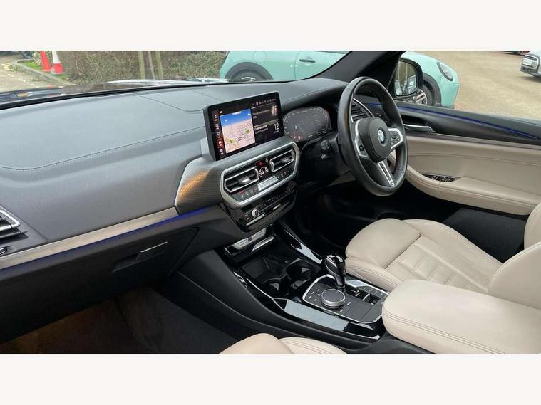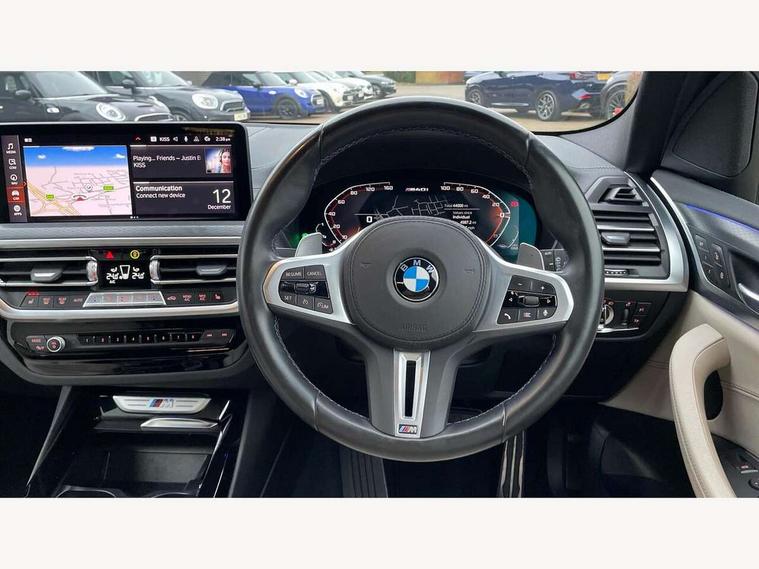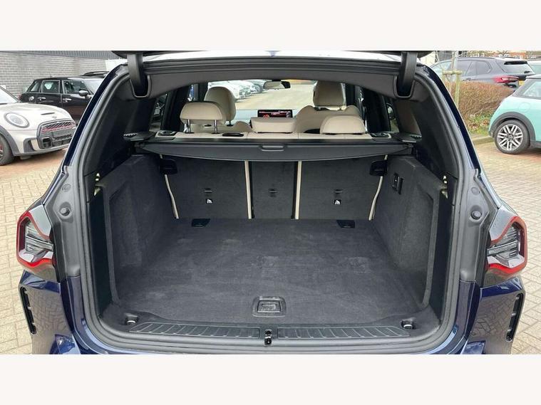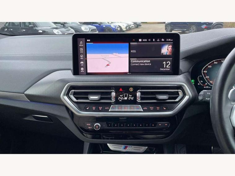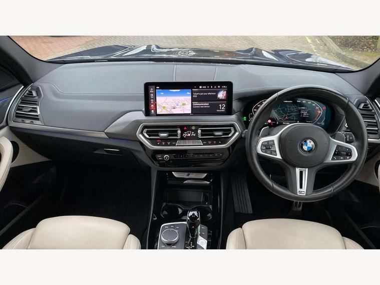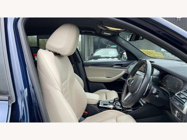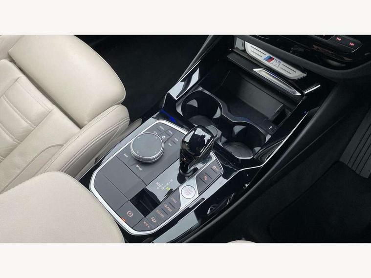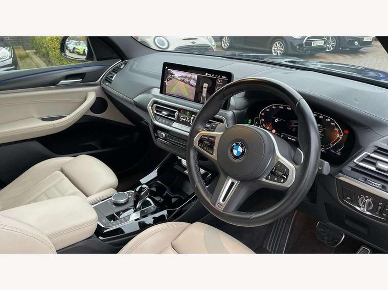 Active Guard, Attentiveness assist, BMW Live Cockpit Professional nav system including 12.3" instrument display + 12.3 high resolution control display, BMW Online services, BMW Teleservices, Brake pad wear indicator in front and rear, Check Control warning system for monitoring of lights and door/luggage compartment open warning, Condition based service - BMW service history, electronic service booklet, integrated owner's handbook, Connected drive services, Deletion of driving assistant professional, Electric boot lid, Front/rear Parking distance control, iDrive Controller with 8 favourite buttons, Instrument cluster with speedometer with mph readout, tachometer, fuel gauge and oil temperature gauge, Lights on warning by audio warning signal when ignition is switched off, Oil sensor for level and grade, warning by check control system, On board computer - average speed+fuel consumption, service interval, clock/date, odometer/trip meter, outside temperature display and ice warning, Optimum shift indicator, Personal Profile - automatic lock when driving away selectable, Stop/start system, Variable sports power steering, Drive performance control with ECO PRO comfort + sport mode, Incorrect fuelling protection, M Adaptive suspension, M Sport differential, Multi-link rear suspension, Performance Control, Sport automatic transmission with gearshift paddles, BMW professional radio/CD/MP3, DAB tuner, Acoustic glazing, Automatic windscreen wipers and automatic headlight, Black finish on B pillars, BMW individual high gloss shadow line with extended content, Body colour door handles, Body colour roof mouldings, Body coloured bumpers, Direction indicator, side repeaters, integrated in exterior mirrors, Dynamic brake lights, Electric adjust heated aspherical door mirrors, Exhaust tailpipes - dual, round, split left and right with chrome finisher, Fingertip control / anti-trap function on electric window, Folding wing mirrors with auto dimming, Follow me home headlights, Front and rear bumper system with replaceable deformation elements, Front and rear electric windows, Green tinted heat insulating glass, Heated windscreen washer jets, High beam assistant, High gloss black shadow line roof rails, High gloss shadowline exterior trim in decorative moulding side frame/recess cover/guide rail/B, C pillars/mirror frame and triangle with mirror base, High level 3rd brake light incorporating LED Technology, Interior rear view electrochromatic mirror with automatic anti dazzle function, Kidney frame and struts painted in high gloss black, LED tail lights, Lightweight engineering, M aerodynamic bodystyling, M black mirror caps, Model designation, Rear side wing doors, Rear wing door, Rear wiper, Shark fin antenna, Side exterior M designation badges, Sun protection glass, Visible VIN plate, Welcome lighting, Windscreen wipers with adjustable interval, 12V power socket in front centre console, 3 rear headrests, 3 zone automatic air conditioning, 4 lashing points to secure luggage, 40:20:40 split folding rear seat with loading system, 5 seats, Ambient lighting, Anthracite headlining, Automatic interior light when door is opened/ignition switched off or via remote key, Electric adjustable seats with memory function, Foldable storage floor with compartment, Four grab handles integrated in roof lining, Front and rear bottle holders integrated into door trim storage compartments, Front and rear side armrests integrated into door trim, Front centre armrest with storage compartment, Front footwell lights, Front head restraints, Front/rear courtesy lights with soft on/off dimming, Front/rear reading lights, Heated front seats, Isofix rear child seat preparation, Leather gear knob, Luggage area underfloor compartment, Luggage compartment lighting, M sport leather steering wheel, Multifunction steering wheel, Parcel shelf removeable and storable under boot floor, Reach and rake adjustable steering column, Rear centre armrest with 2 cupholders, Removable / retractable luggage cover, Slope adjustable rear seats, Storage compartment in rear centre console and front/rear door trims, Sun visors with vanity mirrors and ticket pocket, Toolkit located in luggage compartment, Two front cupholders with removable oddments tray/lid, Vernasca leather upholstery, Connected pro pack - X3, Active protection, ADB - Automatic Differential Brake, Anti-lock braking system (ABS) with brake assist, Automatic Stability Control (ASC), Battery safety cut-off, BMW emergency call, Brake drying, Brake energy regeneration, Braking pre-tensioning, Child locks on rear doors, Cornering brake control (CBC), Crash Sensor - activation of central locking release, hazard warning light and interior lighting, Deactivation of fuel pump in the event of a crash, Driver and front passenger front and side airbags with passenger deactivation and ITS front and rear head airbags, DSC+, Dynamic brake control, Dynamic Traction Control - DTC, Electromechanical parking brake, Hill descent control, Hill start assist, M sport seatbelt, Seatbelt security check for front seats, Side impact protection, Three point seatbelts to all seats with front and outer rear pyrotechnic belt tensioners and seat belt force limiters, Two tone horn, Tyre pressure sensor, Ventilated front and rear disc brakes, Warning triangle and first aid kit, Central locking switch for all doors, fuel filler cap and luggage compartment, Electronic engine immobiliser, Locking wheel nuts, Remote control including two integrated key - one button for open/close all lockable content, windows and separate button for open luggage compartment, Remote control Thatcham category 1 alarm, Start/stop button with Comfort Go keyless engine start and auto Start/stop deactivation button, Sensatec dashboard, Low rolling resistance tyres,