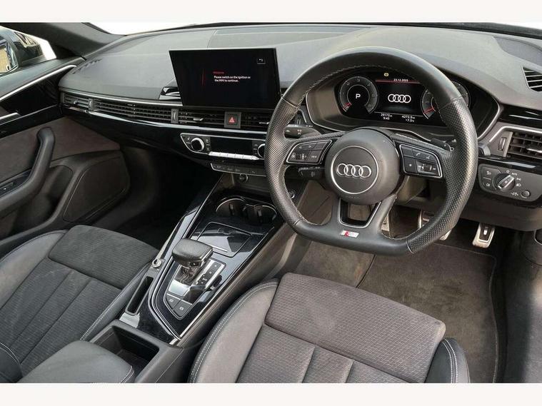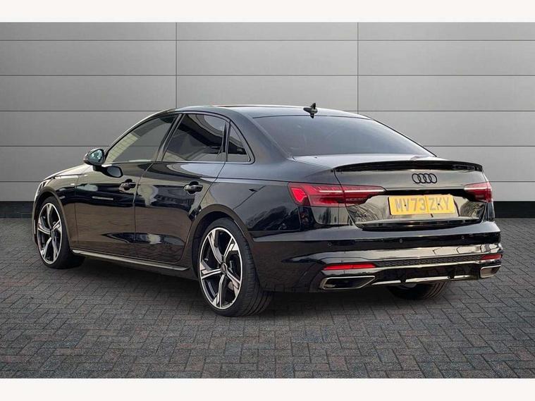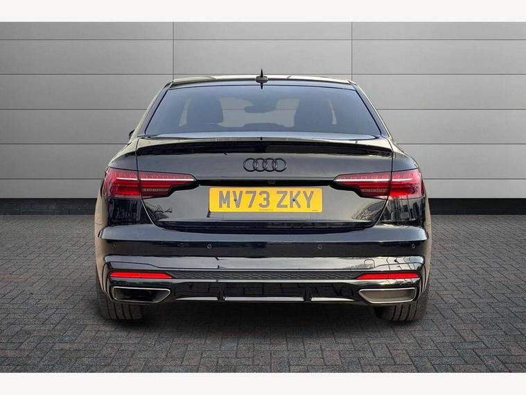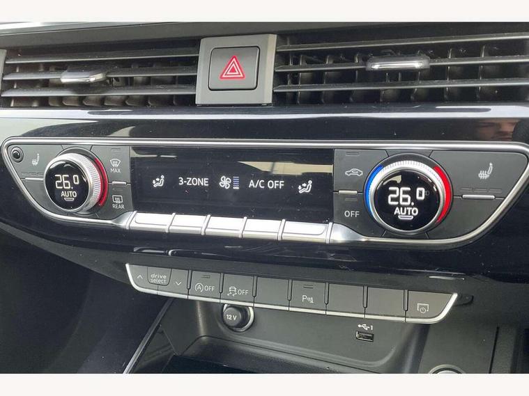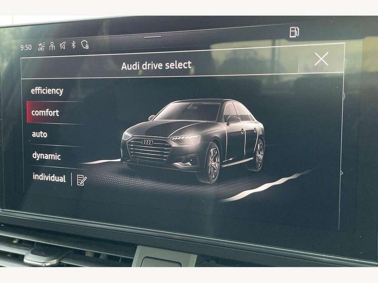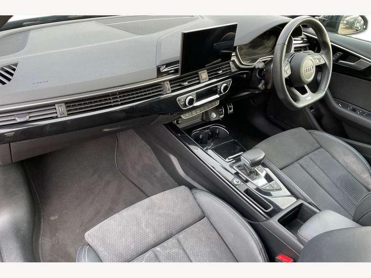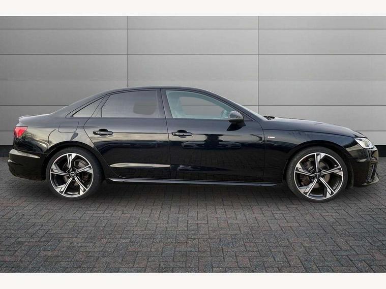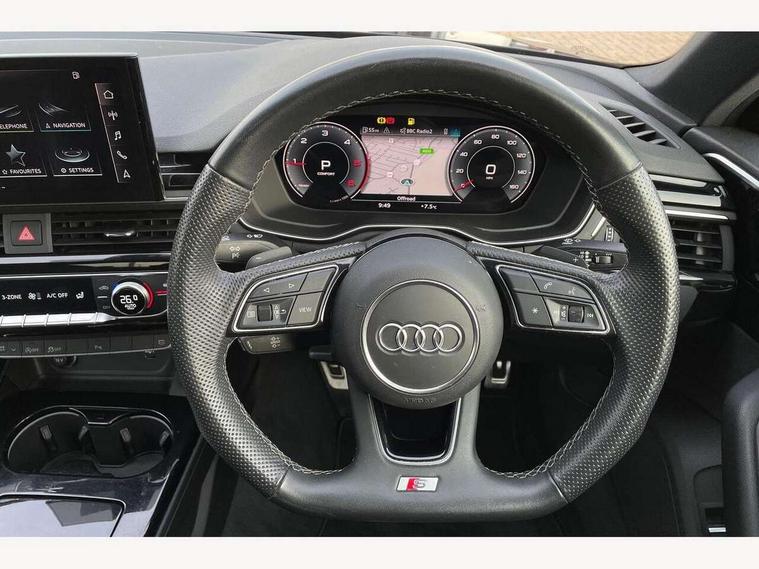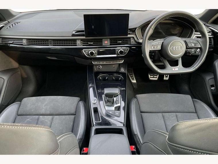 Audi connect safety and service (e-call), Audi drive select, Audi smartphone interface, Audi virtual cockpit, Automatic start-stop system with coasting functionality and efficiency programme, Bluetooth interface, Camera based traffic sign recognition, Electric boot lid release, Electromechanical power steering, Email, calendar and text messages displayed via MMI, Front and rear parking sensors, Lane departure warning, MMI Navigation plus with MMI touch includes 10.1" high resolution colour MMI display, 3D map, Rear view camera, Voice control system, Sports suspension lowered by 23mm, 2 USB charging ports, 8 passive loudspeakers, DAB digital radio reception, Audi beam uses LEDs to project the audi logo onto the ground as you exit your A4, Auto dimming rear view mirror, Black Audi rings and black badging (model name in black badging, no engine badging), Body colour door handles, Body colour front spoiler lip, Body colour side sill trim, Electric adjustable/heated/folding door mirrors with auto dimming, Exhaust tailpipes in high dark chrome, Grained matt black side air inlets with matt aluminium silver inlay, High beam assistant, High gloss black B pillar trims and triangular rear door trim, LED headlights with LED rear lights + dynamic rear indicators + headlight adjustment and high beam, turning light + LED daytime running lights, LED third brake light, Privacy glass, Rain and light sensors, Rear boot, Rear diffuser in matt black with trim strip in matt aluminium silver, Rear side wing doors, Sport front and rear bumpers with side skirts, Variable intermittent front wash/wipe, Windscreen with acoustic glazing, 4 way electric lumbar support for driver and front passenger, 40/20/40 split folding 3 rear seat bench in 3 parts with rear centre armrest, Black carpets, Black cloth headlining, Black perforated leather gearknob, Contrast stitching on seats, steering wheel and gear lever gaiter, Deluxe 3 zone electronic climate control, Front and rear head restraints, Front centre armrest, Heated front seats, Illuminated door sill trims with S logo, ISOFIX child seat mounting and top tether, Manual seat adjustment, Single front passenger seat, Stainless steel pedals and foot rest, Black styling pack - A4 Saloon, LED Interior light pack - A4/S4, 3 rear seatbelts, 6 airbags - Driver, front passenger, curtain and side windows, Attention and drowsiness assist, Electronic Stabilisation Control (ESC) including ABS, ASR and EDL, Hill hold assist, Multi collision brake assist, Pop-up bonnet for pedestrian protection, Pre sense city, Rear door child safety locks, Seatbelt monitoring, Warning triangle and first aid kit, Anti theft alarm, Anti theft wheel bolts, Central locking, Keyless Go, Piano black finish inlay, Tool kit, Tyre repair kit,
