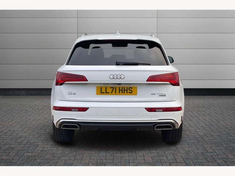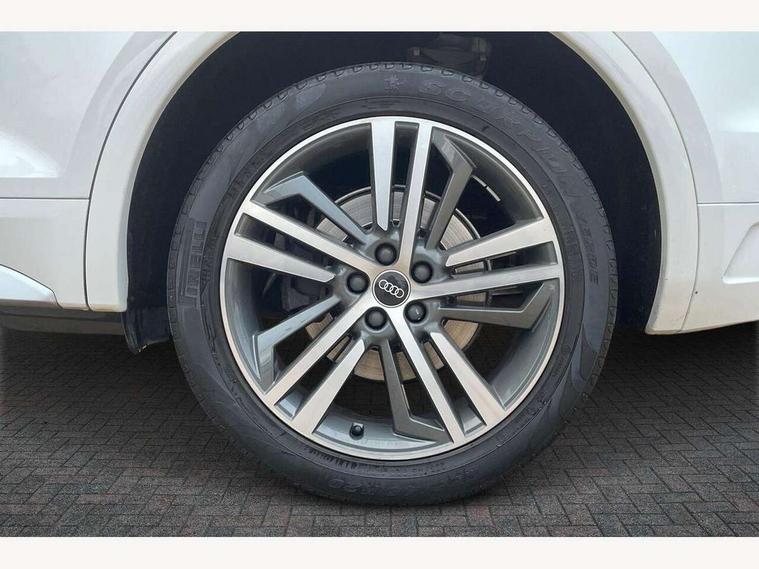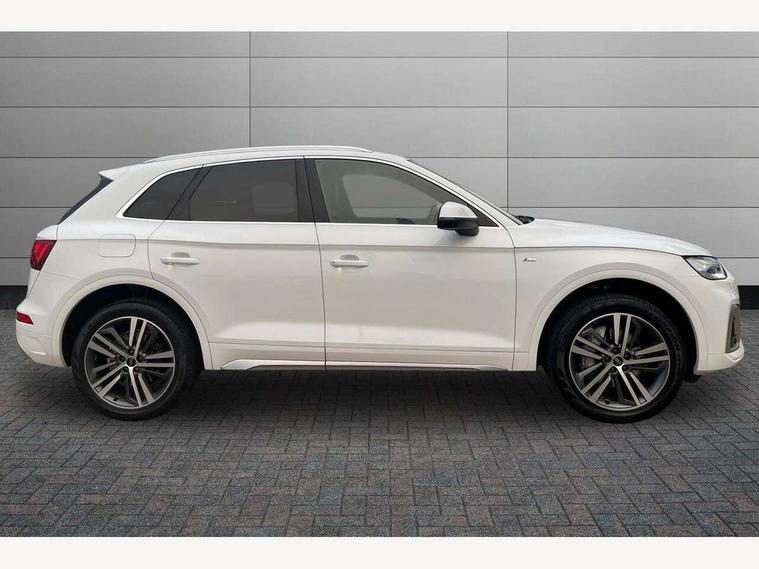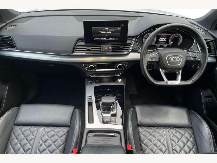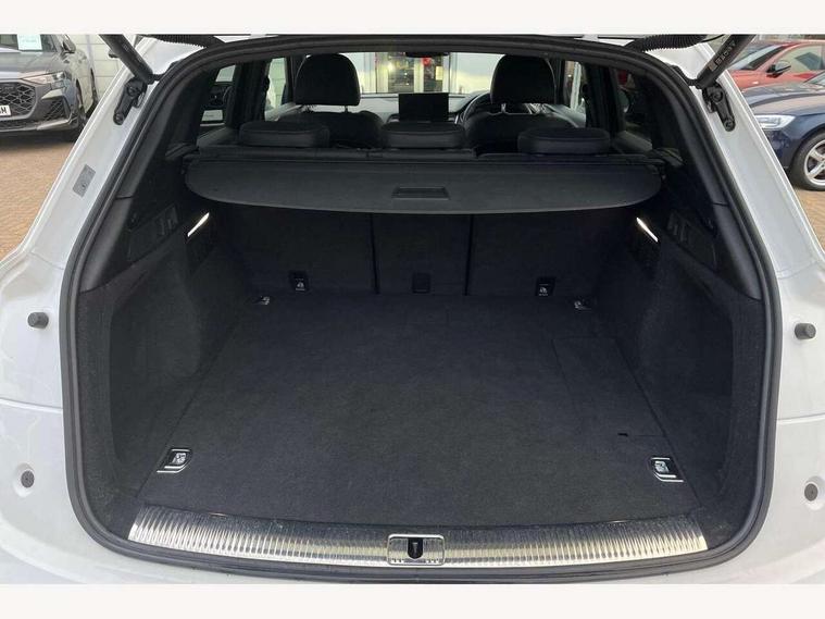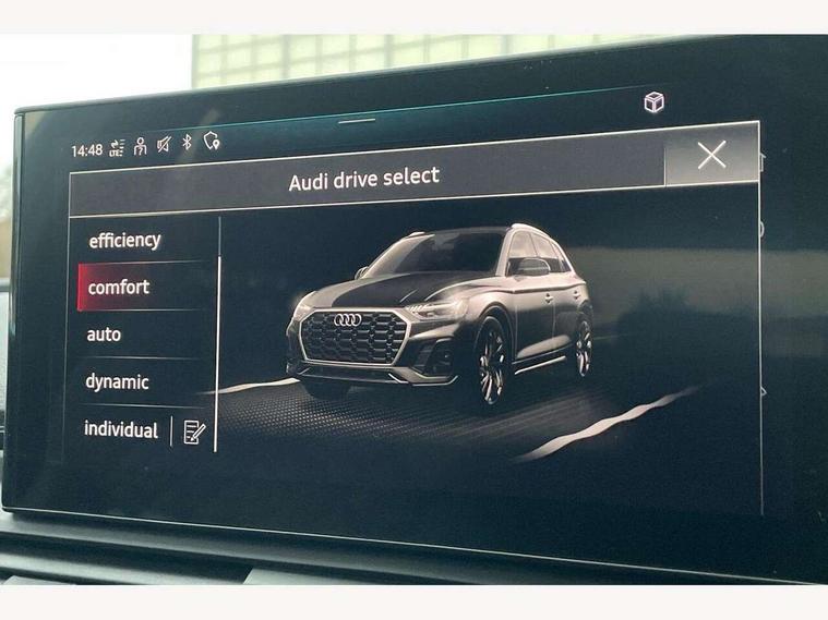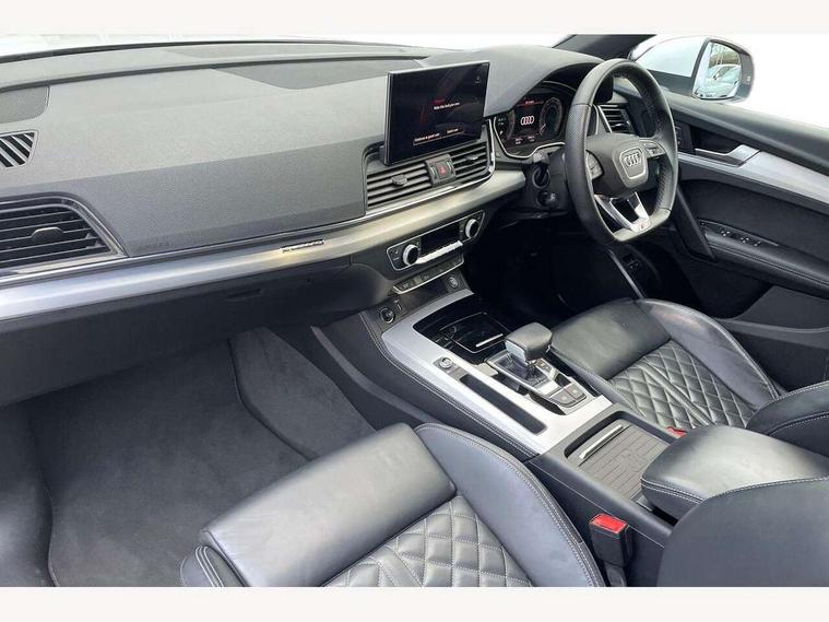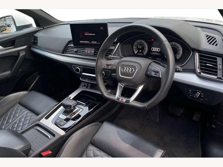 Advanced key with electric hands free boot opening system, Audi connect safety and service (e-call), Audi connect with Amazon Alexa Integration, Audi drive select, Audi virtual cockpit plus with 12.3" screen and three different layout designs, Audi wireless smartphone interface, Automatic start-stop system with coasting functionality and efficiency programme, Bluetooth interface, Electro - mechanical power assisted steering, MMI navigation plus with 10.1" touch screen, Power tailgate, Reversing camera, Service interval indicator, Voice control system with Audi hotword activation "Hey Audi", 3 pin 10 amp domestic charging cable, Dynamic suspension, Quattro on demand, Type 2 mode 3 22kW 32 amp charging cable, Type 2 socket for AC charging, Audi sound system, DAB Digital radio, Acoustic glass for front and door windows, Aluminium roof rails, Audi beam, Audi matrix LED headlights with dynamic front and rear indicators, Auto dimming rear view mirror, Automatic headlights and windscreen wipers, Body colour bumpers, Body colour door mirrors, Body colour rear diffuser with matt aluminium silver surrounds, Body colour underbody protection, Chrome plated exhaust trims, Door sills in Selenite silver, Electric adjustable/heated/folding door mirrors, Front air inlet surrounds in aluminium, Front and rear electric windows, Front radiator grille in honeycomb design, Headlight washers, Lower bumpers painted in contrast Manhattan grey, Rear chrome trim strip below lights, Rear diffuser strip in selenite silver, Rear privacy glass and rear side windows, Rear spoiler, Rear wiper, Roof bars, 2 x USB charging port with aux input socket, 3 rear headrests, 40:20:40 split folding rear seat with rear centre armrest, Black cloth headlining, Comfort front centre armrest, Contrast stitching on seats, steering wheel and gear lever gaiter, Deluxe 3 zone electronic climate control, Fine Nappa leather upholstery with diamond pattern contrast stitching + front sport seats with S embossed logo, Front/rear floor mats, Fully electrically adjustable seats, Gear lever in black leather, Heated front seats, Height adjustable front head restraints, Height/reach adjustable steering column, Illuminated door sill trims with S logo, ISOFIX child seat mounting and top tether, Massage function for front seats, Rear seat bench plus, Sunvisors with vanity mirrors, Tool kit, Trunk roller cover, Extended interior upholstery pack - Q5, High gloss pack - Q5, LED interior light pack - Q5, 3 point seatbelts on all seats, 6 airbags - Driver, front passenger, curtain and side airbags, Electrically operated child locks on rear doors, Electromechanical parking brake, Electronic stabilisation control including ABS, ASR and EDL, Front passenger airbag deactivation, Hill descent control, Hill hold assist, Multi collision brake assist, Pop-up bonnet for pedestrian protection, Pre sense city, Seat belt force limiter, Seatbelt monitoring, Tyre pressure warning, Warning triangle and first aid kit, Anti theft alarm, Anti-theft wheel bolts, Keyless Go access/ignition system, Matt brushed aluminium inlays, 20'' 5 segment spoke design alloy wheels in contrasting grey with diamond cut finish, Tyre repair kit,