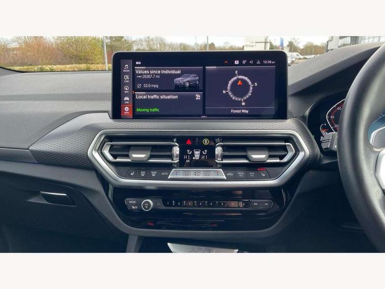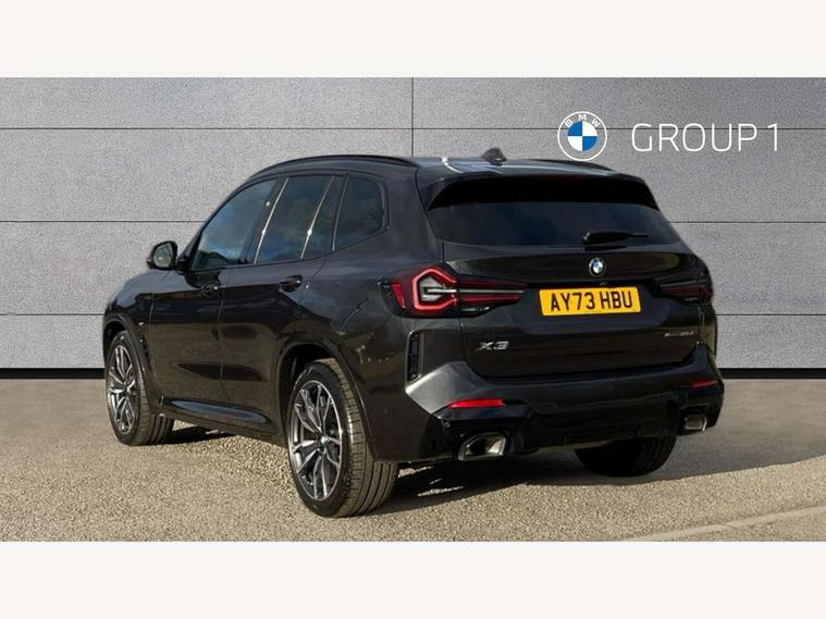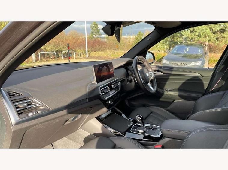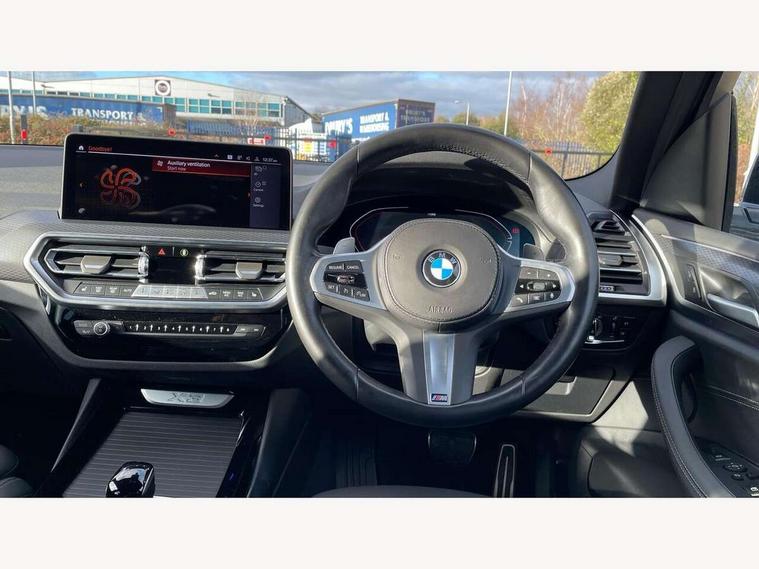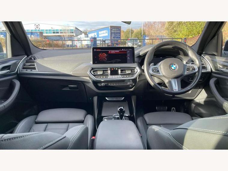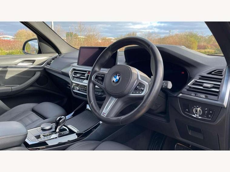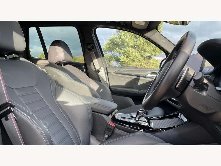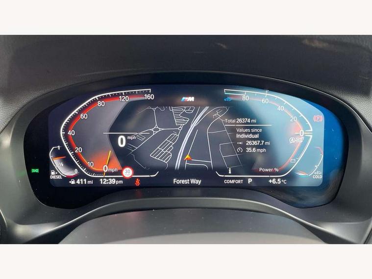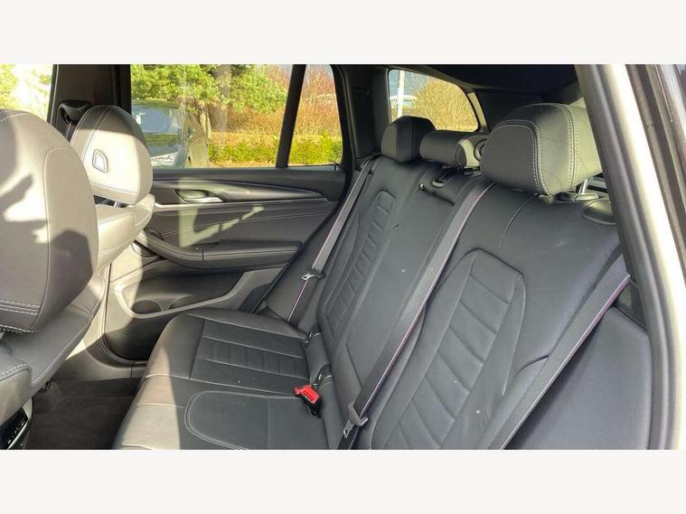 Active Guard, Attentiveness assist, BMW Live Cockpit Professional nav system including 12.3" instrument display + 12.3 high resolution control display, BMW Online services, BMW Teleservices, Brake pad wear indicator in front and rear, Check Control warning system for monitoring of lights and door/luggage compartment open warning, Condition based service - BMW service history, electronic service booklet, integrated owner's handbook, Connected drive services, Electric boot lid, Front/rear Parking distance control, iDrive touch controller with 8 favourite buttons, Instrument cluster with speedometer with mph readout, tachometer, fuel gauge and oil temperature gauge, Lights on warning by audio warning signal when ignition is switched off, Oil sensor for level and grade, warning by check control system, On board computer - average speed+fuel consumption, service interval, clock/date, odometer/trip meter, outside temperature display and ice warning, Optimum shift indicator, Personal Profile - automatic lock when driving away selectable, Run flat indicator, Stop/start system, Variable sports power steering with drive performance control Sport+ mode, Automatic transmission with gearshift paddles, Diesel particulate filter, Incorrect fuelling protection, Larger capacity fuel tank, M sport suspension, Multi-link rear suspension, BMW professional radio/CD/MP3, DAB tuner, Acoustic glazing, Automatic windscreen wipers and automatic headlight, Black finish on B pillars, Body colour door handles, Body colour electric adjust heated aspherical door mirrors, Body colour roof mouldings, Body coloured bumpers, Direction indicator, side repeaters, integrated in exterior mirrors, Dynamic brake lights, Exhaust tailpipes - dual, round, split left and right with chrome finisher, Fingertip control / anti-trap function on electric window, Folding wing mirrors with auto dimming, Follow me home headlights, Front and rear bumper system with replaceable deformation elements, Front and rear electric windows, Gloss chrome tailpipes finishers, Green tinted heat insulating glass, Heated windscreen washer jets, High beam assistant, High gloss black shadow line roof rails, High gloss shadowline exterior trim in decorative moulding side frame/recess cover/guide rail/B, C pillars/mirror frame and triangle with mirror base, High level 3rd brake light incorporating LED Technology, Interior rear view electrochromatic mirror with automatic anti dazzle function, LED tail lights, Lightweight engineering, M aerodynamic bodystyling, M Sport entry door sill strips, Model designation, Rain sensor, Rear side wing doors, Rear wing door, Rear wiper, Shark fin antenna, Side exterior M designation badges, Visible VIN plate, Welcome lighting, Windscreen wipers with adjustable interval, 12V power point in luggage area, 12V power socket in front centre console, 2 x USB Type C ports for charging and data transmission (front centre console) and 2 x USB Type C ports for charging (rear centre console), 3 rear headrests, 3 seat bench in 2nd row, 3 zone automatic air conditioning, 4 lashing points to secure luggage, 40:20:40 split folding rear seat with loading system, Ambient lighting, Anthracite headlining, Automatic interior light when door is opened/ignition switched off or via remote key, Floor mats in velour, Foldable storage floor with compartment, Four grab handles integrated in roof lining, Front and rear bottle holders integrated into door trim storage compartments, Front and rear side armrests integrated into door trim, Front centre armrest with storage compartment, Front footwell lights, Front head restraints, Front passenger seat, Front sports seats, Front/rear courtesy lights with soft on/off dimming, Front/rear reading lights, Heated front seats, Isofix rear child seat preparation, Leather gear knob, Lockable glove compartment, Luggage area underfloor compartment, Luggage compartment lighting, M sport leather steering wheel, Multifunction steering wheel, Parcel shelf removeable and storable under boot floor, Reach and rake adjustable steering column, Rear centre armrest with 2 cupholders, Removable / retractable luggage cover, Slope adjustable rear seats, Storage compartment in rear centre console and front/rear door trims, Sun visors with vanity mirrors and ticket pocket, Toolkit located in luggage compartment, Two front cupholders with removable oddments tray/lid, Connected pro pack - X3, ADB - Automatic Differential Brake, Anti-lock braking system (ABS) with brake assist, Automatic Stability Control (ASC), Battery safety cut-off, BMW emergency call, Brake drying, Brake energy regeneration, Braking pre-tensioning, Child locks on rear doors, Cornering brake control (CBC), Crash Sensor - activation of central locking release, hazard warning light and interior lighting, Deactivation of fuel pump in the event of a crash, Driver and front passenger front and side airbags with passenger deactivation and ITS front and rear head airbags, Driver and front passenger knee airbag, DSC+, Dynamic brake control, Dynamic Traction Control - DTC, Electromechanical parking brake, Hill descent control, Hill start assist, Seatbelt security check for front seats, Side impact protection, Three point seatbelts to all seats with front and outer rear pyrotechnic belt tensioners and seat belt force limiters, Two tone horn, Tyre pressure sensor, Ventilated front and rear disc brakes, Warning triangle and first aid kit, Central locking switch for all doors, fuel filler cap and luggage compartment, Electronic engine immobiliser, Locking wheel nuts, Remote control including two integrated key - one button for open/close all lockable content, windows and separate button for open luggage compartment, Remote control Thatcham category 1 alarm, Start/stop button with Comfort Go keyless engine start and auto Start/stop deactivation button, Low rolling resistance tyres,