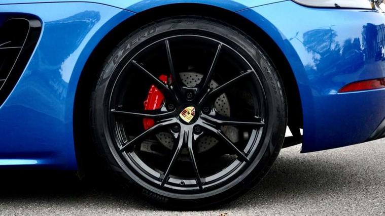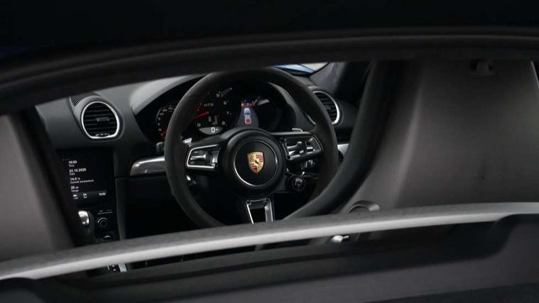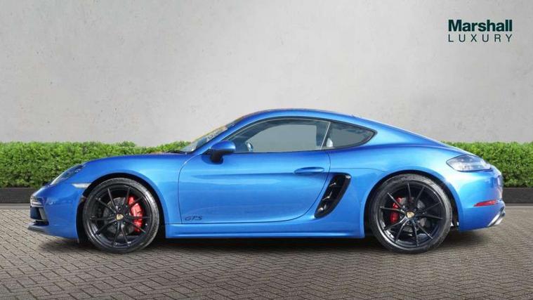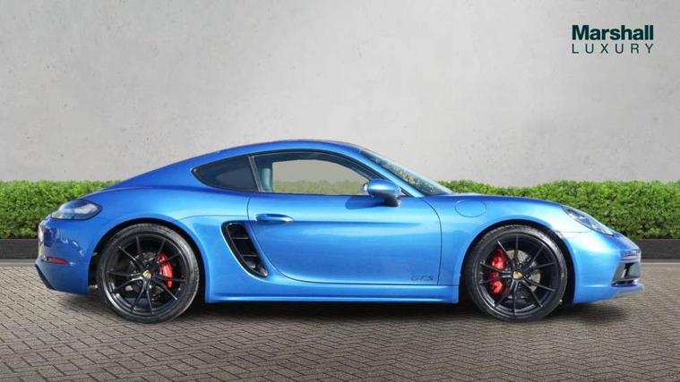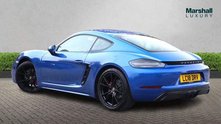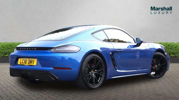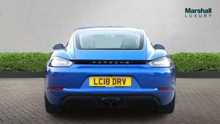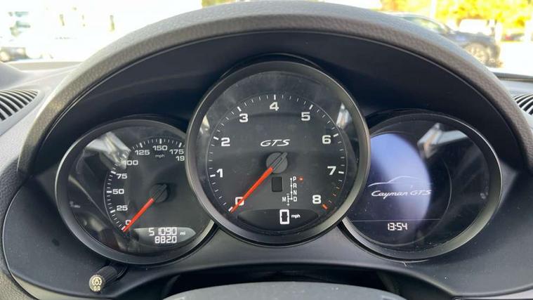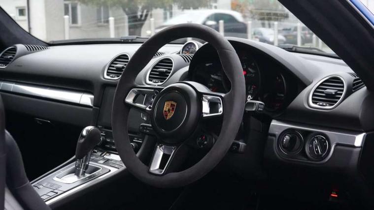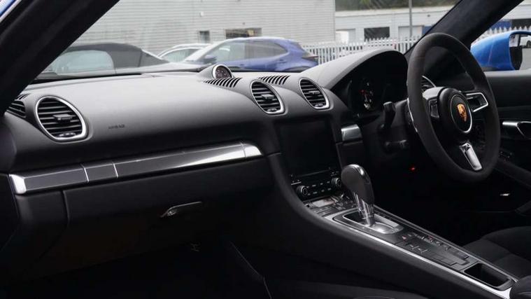Black rev counter, Instrument cluster with high-resolution 4.6-inch TFT colour display, Mobile telephone preparation, PCM navigation module, Porsche communications management, Porsche Connect Plus, Sports button, Porsche Active Suspension Management (PASM), Porsche stability management (PSM), Porsche TORQUE Vectoring (PTV) with mechanical rear differential lock, Connect Plus with Apple CarPlay, wireless internet access, Carfinder, Remote Vehicle Status and Remote Services, DAB Digital radio, Aerodynamic wipers, Aspherical driver's exterior mirror, Automatic coming home lighting, Automatically extending rear boot spoiler, Black model designation on doors, Body colour bumpers, Door sill guards with logo, Electric windows one touch open/close, Electrically adjustable and heated door mirrors, Green tinted heat insulating glass, Heated rear windscreen, LED brake lights, LED daytime running lights, Painted Porsche logo and model designation, Painted rear apron, Sports exhaust system including sports tailpipes in black, Top tinted windscreen, Windscreen washer jets, 12V sockets in front centre console and passenger footwell, 2 cupholders, Air recirculation control, Clothes hooks on front seat backrests, Defrost switch, Door panel armrests and centre console main storage compartment lid in smooth finish leather, Driver/passenger electric backrest adjustment, Driver/passenger seats fore/aft adjustment, Front and rear luggage compartments, Front centre console storage box, Glovebox illumination, GT alcantara sports steering wheel and PDK gear selector, Ignition Lock illumination, Illumination of luggage compartment, Interior orientation lighting, LED reading lights, Lockable glovebox, Sports steering wheel with manual fore/aft/height adjust, Storage compartments in doors, Sport chrono pack PDK - Cayman (with dynamic transmission mounts), ABS, Electronic parking brake, Full size driver and passenger airbags, Head airbags, POSIP, Red painted brake calipers, Side (thorax) airbags, Tyre pressure monitoring system, Alarm system with interior protection, Anti-theft wheel bolts, Porsche vehicle tracking system (VTS), Remote central locking including luggage compartment, Transponder engine immobiliser, Sealing compound and compressor kit,