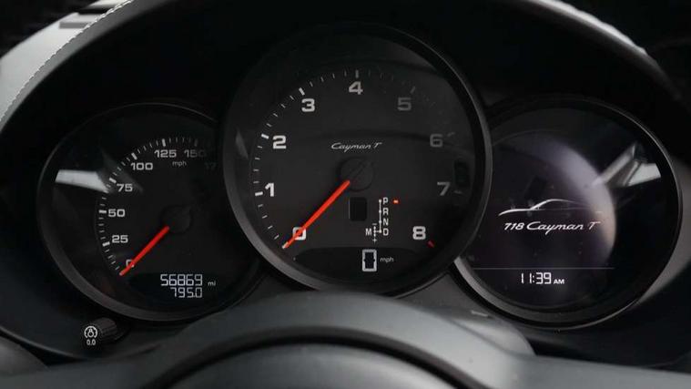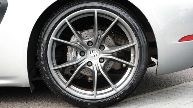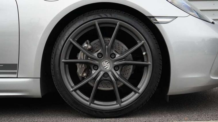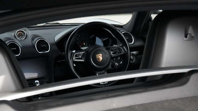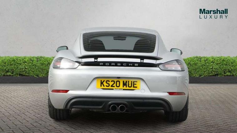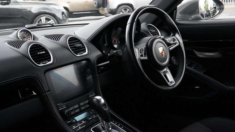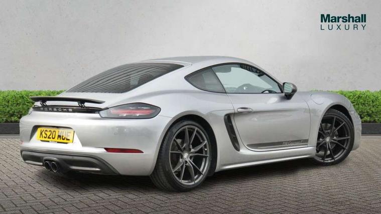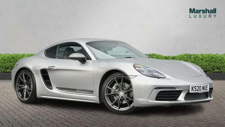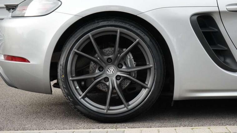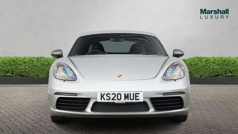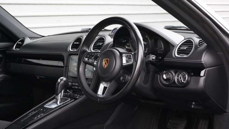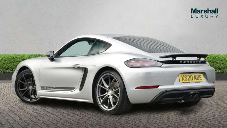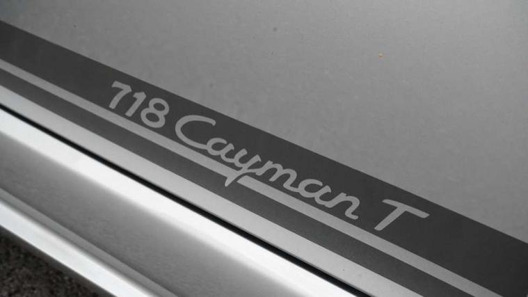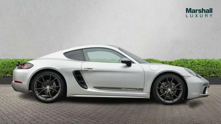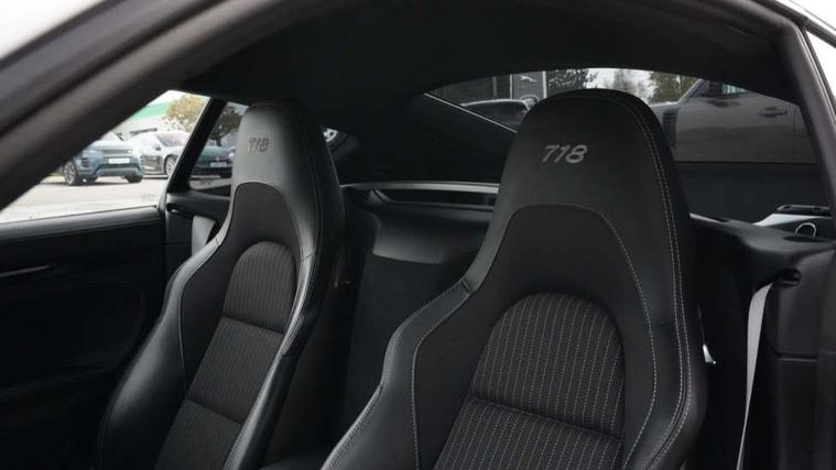 Digital displays for vehicle speed, chosen gear, odometer, trip odometer and clock, Instrument cluster with central rev counter and high-resolution 4.6 inch colour display, 4 valves per cylinder, Aluminium block and cylinder heads, Direct fuel injection (DFI), Gasoline particulate filter, Integrated dry-sump lubrication with an on-demand oil pump, Porsche Active Suspension Management (PASM) sport suspension with lowered 20mm ride height, Porsche Doppelkupplung (PDK), Porsche Stability Management (PSM) with ABS, advanced brake functions, Porsche TORQUE Vectoring (PTV) with mechanical rear differential lock, Rear wheel drive, Turbocharger with intercooler, Two seater vehicle with mid mounted engine, Two three-way catalytic converters and on-board diagnostics for monitoring emission control system, VarioCam Plus variable valve timing and switchable valve lift, Water cooled with thermal management, Integrated 4G/LTE compatible SIM including data for the Porsche Connect Services, Integrated compatible SIM including Porsche Connect Services, Wifi and music streaming, 718 Cayman T stripes in agate grey, Automatic headlight activation including welcome home lighting, Automatically extending rear boot spoiler, Body colour bumpers, Body colour door handles, Door pull loops in black, Electrically adjustable heated exterior mirrors on door waist rails, aspherical on driver's side, Green tinted heat insulating glass, Heated rear windscreen, Intelligent lightweight body in Aluminium/Steel composite construction, Mirror upper trims painted in agate grey, Power windows with one touch operation and door seal protection, Separate auxiliary lights in the front end with LED indicators and position lights, Top tinted windscreen, Twin tract sports exhaust system with black central twin tailpipe in stainless steel, Wide opening rear hatch with heated screen, Windscreen washer system with two wiper speeds and washer jets, 12V sockets in passenger footwell, Adjustable fan with air recirculation and defroster functions, Clothes hooks on front seat backrests, Elevated centre console with uncovered storage compartment and closed storage compartment, Footwell illumination, Front and rear luggage compartments, Front headrests, Gloss black interior door handles, Heated seats, LED reading lights, orientation, ignition lock, additionally luggage compartment and glove compartment lighting, Lockable glovebox, Porsche logo in high gloss silver colour, Seat centres in sport tex, side bolsters and headrests in leather, SPORT button to activate dynamic driving settings for engine, transmission (with PDK), Storage compartments in each doors, Two individual cup holders (integral to dashboard trim strip), Sport chrono pack - Cayman, 3 point automatic seatbelts, ASR, Electrically controlled parking brake, Front and rear lightweight spring strut axle, Front seatbelt pretensioners + load limiters, Full size driver and passenger airbags, Passenger airbag deactivate switch, Porsche side impact protection doors with thorax airbag in outer backrest side bolster and head airbag for driver/passenger in door panel, Tyre pressure monitoring system, Alarm system with interior surveillance, Auto start/stop function including coasting (in connection with PDK), Engine immobiliser with in key transponder, central locking and remote control, High gloss black interior trim, Tyre sealing compound and electric air compressor kit,