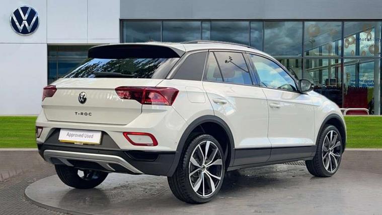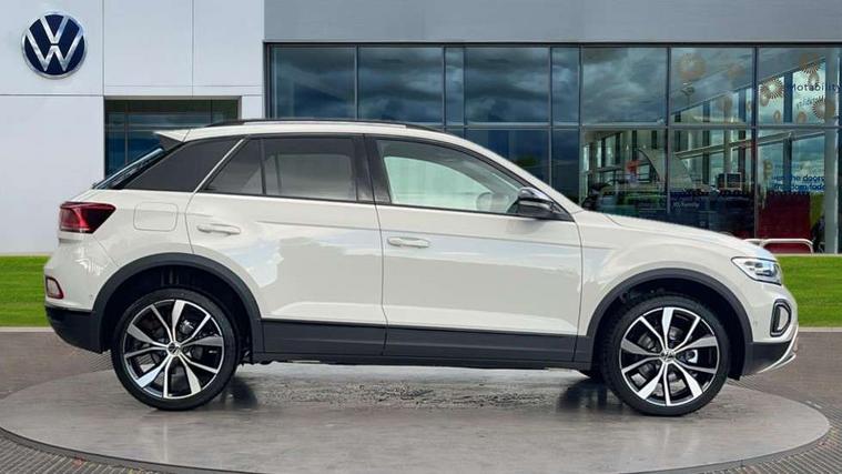 10.25" Digital cockpit pro, Advanced driver attention and drowsiness monitor, Dynamic road sign display, Emergency call service, Lane keeping system Lane Assist, Mobile phone interface, Modified key software - reduce switch off time for key status change to Long no motion, Online services, Park assist including front and rear parking sensors, Power assisted speed sensitive steering, Rear view camera, Service interval indicator, Tailgate/trunk lid release from outside, Think blue trainer driver tips and journey analysis, Warning sound and light for front seatbelts unfastened, Wireless app connect, Battery regeneration during braking, Start/stop function with battery regeneration, DAB Digital radio, Diversity antenna for FM reception, Music playback - MP3, WMA and AAC files, Premium USB cable in choice of either Apple or Android smartphone compatibility, SD card slot, Simultaneous pairing of 2 compatible mobile devices, Title and cover art display, We Connect and We Connect Plus functionality, Adhesive film in carbon look on the C-pillars, Advanced dynamic light assist for LED matrix headlights, Auto dimming interior rear view mirror, Automatic hazard lights activation under emergency braking, Black roof rails, Body colour sports bumpers with silver metallic underbody fascia, Body coloured exterior mirror housings and door handles, Dynamic cornering light, Dynamic headlight range control with self adjusting whilst driving, Electrically adjustable and heated door mirrors, Extended roof spoiler, Exterior ambient lighting, Exterior mirrors aspherical on driver side, convex on front passenger side, External USB type C socket and charging sockets, Front windscreen wiper with intermittent wipe and 4 position delay, Heated rear window, Illuminated front grille, IQ LED matrix headlights, LED 3rd brake light, LED rear number plate lights, LED rear tail lights with dynamic turn signal, LED separate daytime running light, Light mode for poor weather, rain, fog or snow, Power windows with comfort operation and circuit breaker, Privacy glass for rear side windows and rear window, Rain sensor, Rear exhaust tailpipe, Rear fog light on one side and reversing lights on both sides, Rear side wing doors, Rear wash/wipe with intermittent wipe setting, Remote electrically foldable door mirrors, puddle lights and reverse activated passenger's door mirror, Tilting and sliding panoramic sunroof with rear panoramic sunroof, 12V power socket in centre console, 3 rear head restraints, 3 seat bench in 2nd row, 4 load lashing points in luggage compartment, Air care climatronic air conditoning system with active combination filter and 2-zone temperature control, Black roof lining, Chrome plated radiator grille inserts, air vent surrounds and light switch surrounds, Door and side trim panel with leatherette insert, Drawer under drivers seat, Front + rear carpet mats, Front centre armrest, Front comfort sports seats, Front cupholders x 2, Front footwell illumination, Front seat back storage pockets, Glove compartment door with light, Instrument lighting, white adjustable panel illumination, Interior ambient lighting and surround lighting, Interior light delay, Isofix child seat preparation, Leather gearshift handle, LED interior light with switch off delay/dimmer and 2 front/rear LED reading lights, Load-through provision with cup holder when folded down ('Unsplit rear seat bench, split folding backrest, with centre armrest), Luggage compartment lighting, Non-folding front passenger seat backrest, Single front passenger seat, Storage compartment in left and right luggage area, Storage compartment in rear doors, Storage compartments in driver and front passenger doors, Sunvisors with illuminated vanity mirrors, Variable boot floor, height adjustable and removable, Black design pack - T-Roc style design, Driver assistance pack without proactive passenger protection - T-Roc, Easy open package with safelock - T-Roc, 3 point height adj front seatbelts + pretensioners, 3 point seatbelts in outer rear with ECE label, ABS, Child locks on rear doors, City emergency braking and pedestrian monitoring, Driver and front passenger airbag with front passenger airbag deactivation, Driver and front passenger safety-optimised head restraints, Drivers seatbelt reminder, Electronic parking brake, Electronic Stability Control (ESC) inc EDL (Electronic Differential Lock) and ASR (Traction Control), Front and rear passengers curtain airbag system including front side airbags, Predictive pedestrian protection, Rear disc brakes, Two tone horn, Tyre pressure loss indicator, Volkswagen roadside assistance, Black decorative trims, Piano black decorative inserts in dashboard and front door trim panels, Tool kit, Trims for alloy wheels, Tyre mobility kit including compressor and sealing foam,