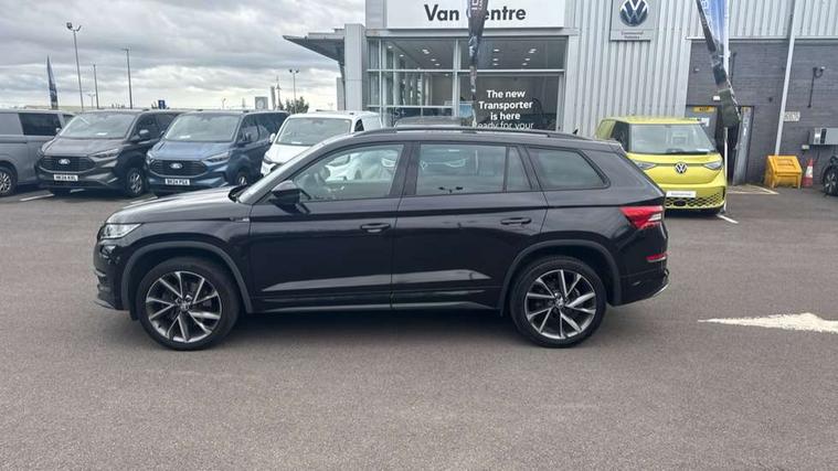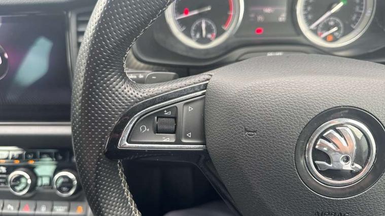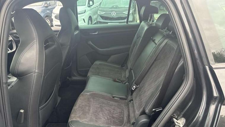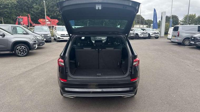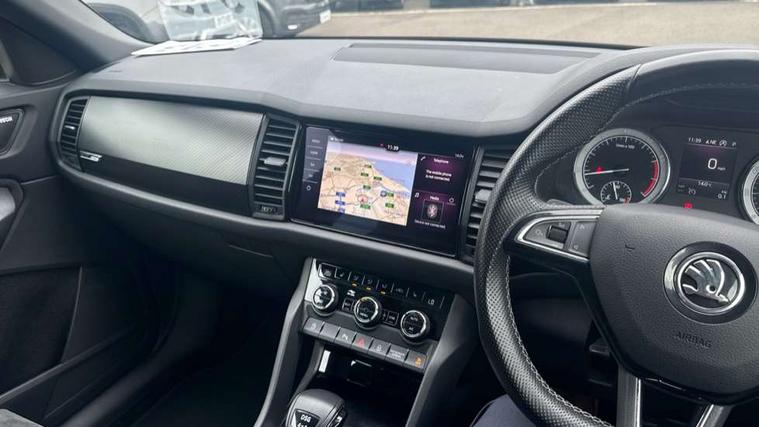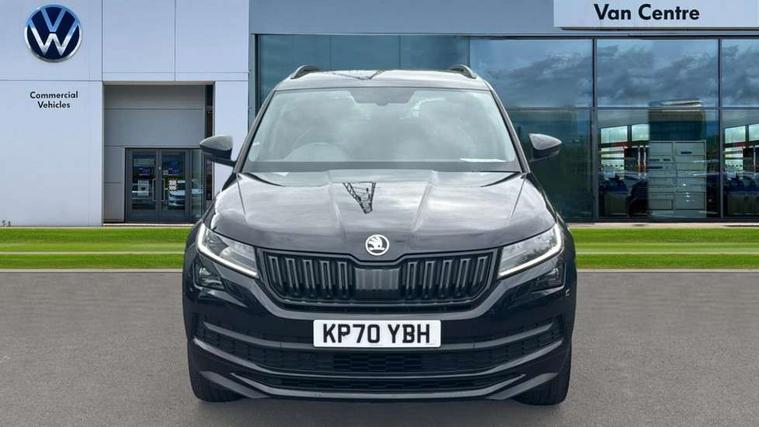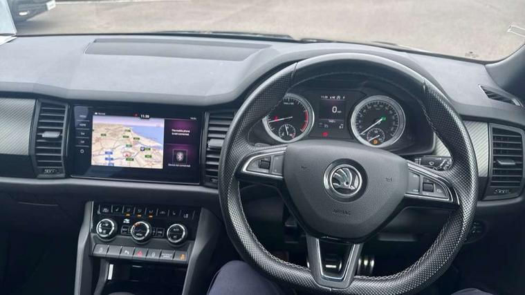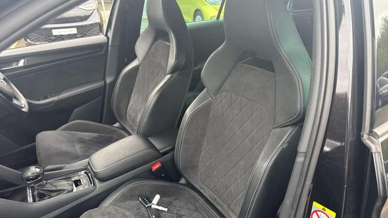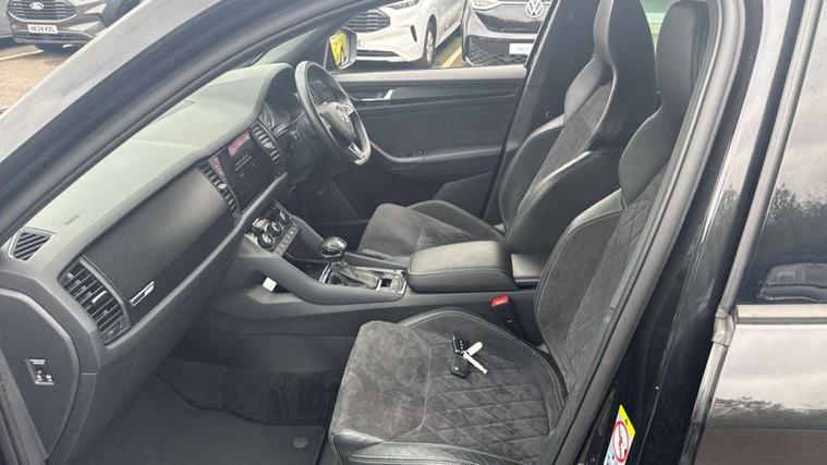 Bluetooth system, Columbus satellite navigation with 9.2" touch screen and integrated Wi-Fi + WLAN and web radio, Digital voice enhancement, ECO Stop/start function, Exterior temperature indicator, Map care, Progressive power assisted steering, SmartLink plus, Speed limiter, Sports dials, Tailgate unlocking from outside, USB C Port x 2 in front centre console, Bolero Radio, DAB Digital radio, DVD System, Aero front windscreen wipers with intermittent function, Aero rear window wiper, Auto dimming rear view mirror, Automatic activation of hazard warning lights, Black electric window control buttons, Black roof rails and door mirrors with radiator grille and window surrounds, Black wheel arch surrounds, Body colour bumpers, Body colour door handles, Chrome exhaust tailpipe, Electric front and rear windows, Electrically adjustable/heated/foldable and auto dimming door mirrors with memory function, Front door steps with SportLine logo, Full LED Headlights with adaptive front light system and LED daytime running lights, Headlight washers, Heated rear window, LED front fog lights with static cornering light function, LED rear fog light, LED third brake light in rear spoiler, Light assistant (coming home/tunnel light), Rain and light sensors, Rear diffuser, Rear spoiler, Safety reflectors on front and rear doors, Sportline badge on front fender, Sports front and rear bumpers, Sunset privacy glass, Tailgate lettering in Black, Without engine designation, 12V socket in boot, 2 rails with 2 hooks including 4 hooks for net programme, 3 spoke leather sports heated multi-function steering wheel with hands off detection, 4 foldable roof handles with rear coat hooks, 4 lashing points on luggage floor, 60:40 foldable rear seat with sliding adjustment and backrest angle adjustment, Alcantara door panels, Alcantara/Leather upholstery with Sport seats with silver stitching, Aluminium pedals, Black roof headlining, Bottle holders in door panel in the 1.5 litre front and 1 litre rear, Cargo storage compartments, Centre console with open storage box, cup holder and 12V socket, Chrome headlight control button, Chrome interior door handles, Coat hooks on B pillar, Covered storage compartment on driver side, Front and rear door armrest with black adductor trim, Front and rear height adjustable headrests, Front centre armrest with storage compartment, cup holder and 12V socket, Front courtesy lights, Gear shift lever with chrome frame and black gloss insert, Illuminated and cooled glovebox, Illuminated luggage compartment, Isofix child seat fittings in outer rear seats with top tether, Manually adjustable steering column, Net programme in boot (1x horizontal Net, 2x vertical Nets), Overhead glasses storage compartment, Paddles on steering wheel for DSG gearbox, Pollen filter, Rear centre armrest with cupholders, Roll up luggage compartment cover with intermediate position, Small Bags on the inner sides of the front backrests, Storage compartment in lower middle instrument panel with closing, Three rear height adjustable headrests, Ticket holder on A Pillar, Umbrella in door panel, LED Interior Light pack - Kodiaq Scout/Sport Line/VRS/Laurin + Klement, Auto door release and activation of warning lights in the event of an accident, Driver and passenger airbags, Electronic parking brake with hill hold control, Emergency rear braking signal, ESC (incl. ABS+MSR+ASR+EDS+HBA+DSR+RBS+MKB), Front and rear three point safety belt on all seats, Front assist includes AEB city/urban, Front passenger airbag deactivation switch, Front side airbags, Fuel cut off safety device, Head and knee airbags, Rear disc brakes, Safety vest holder in door, Seat belt reminder for all seats, Two tone horn, Tyre pressure monitor, Warning lights in front doors, Alarm with interior monitoring and tilt sensor with safe function, Immobiliser, Keyless entry and start system (KESSY), Remote central locking, Carbon finish dashboard and door inserts, Chrome air vent surrounds, 20" Vega Anthracite alloy wheels with anti-theft wheel bolts,