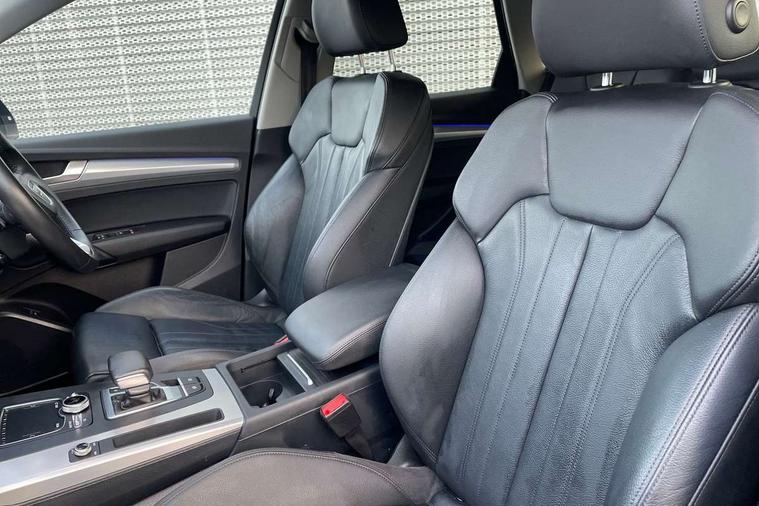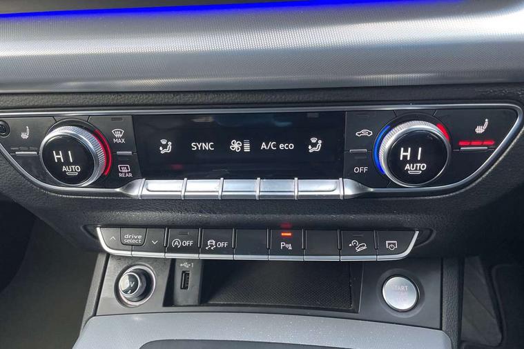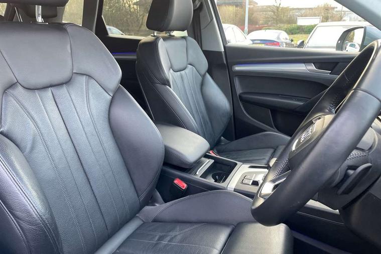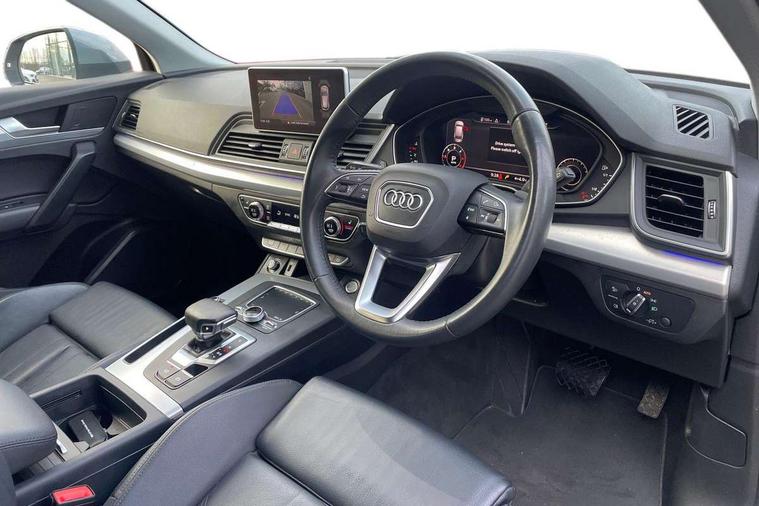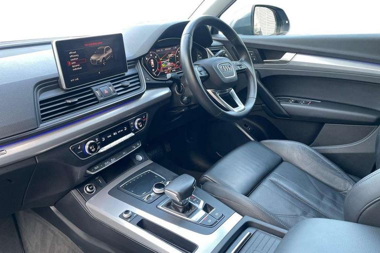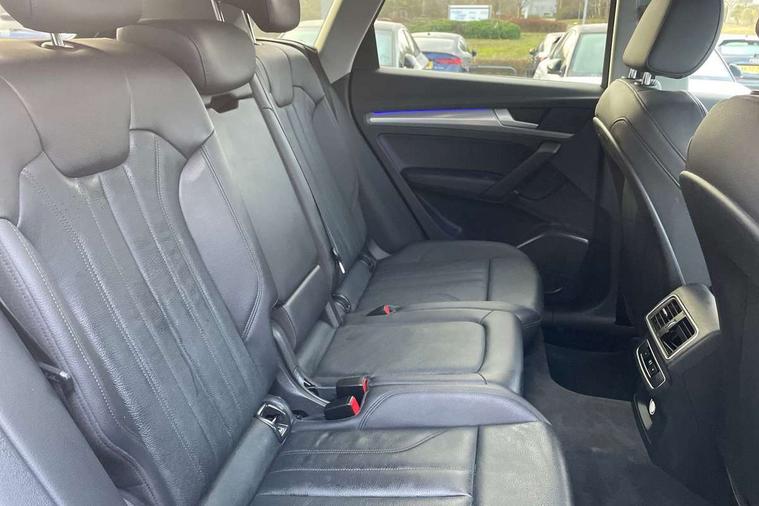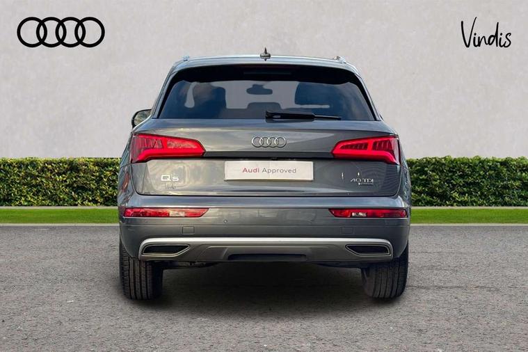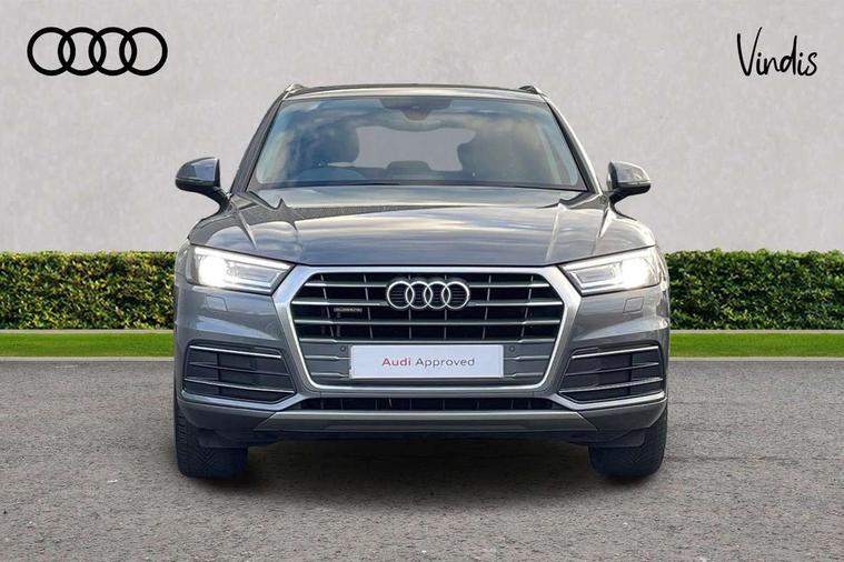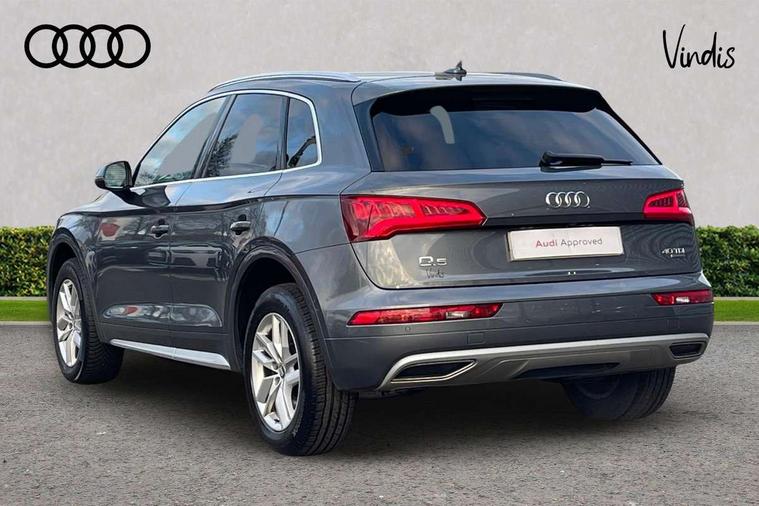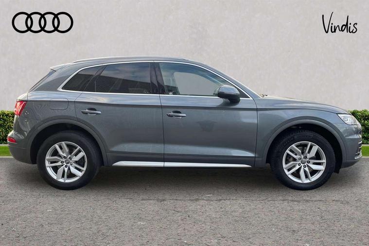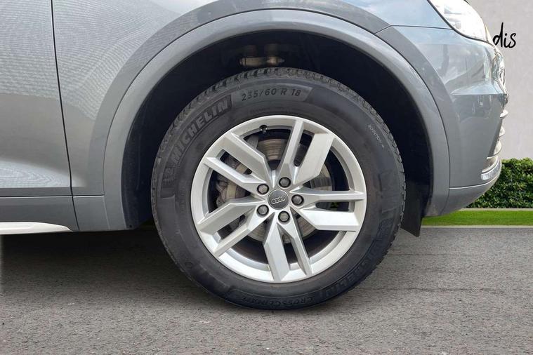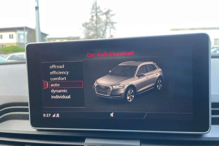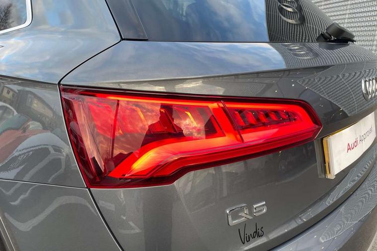 7" Colour driver information system, Audi drive select, Audi parking system plus with front and rear sensors, Audi smartphone interface, Automatic start/stop system, Electro - mechanical power assisted steering, MMI Navigation, Mobile telephone preparation - bluetooth interface, Power tailgate, Service interval indicator, Voice control system, Diesel particulate filter, 2x SD card slot, CD player, DAB Digital radio, MMI radio plus with 7" colour MMI screen and MMI controller, Acoustic windscreen, Air inlets in matt titanium black with blades in matt aluminium silver, Aluminium roof rails, Auto dimming rear view mirror, Automatic headlight levelling, Body colour bumpers, Body colour door mirrors, Chrome exhaust tailpipe, Front and rear electric windows, Light and rain sensor for auto activation of lights and windscreen wipers, Loading sill protector in stainless steel, Matt selenite silver underbody protection, Rear diffuser strip in selenite silver, Rear spoiler, Rear wiper, Side skirts in matt selenite silver, Twilight grey matt radiator grille with matt aluminium horizontal chrome struts, 2 x USB charging port with aux input socket, 3 rear headrests, 3 Spoke leather multi function steering wheel, 3 zone climate control, 4 way electric lumbar support for driver and front passenger, 40:20:40 split folding rear seat with rear centre armrest, Cloth headlining, Door sills trims with aluminium inlays, Front centre armrest, Front/rear floor mats, Height adjustable front head restraints, ISOFIX child seat mounting and top tether, Luggage compartment carpet, Removable luggage compartment floor, Sunvisors with vanity mirrors, Tool kit, Trunk roller cover, High gloss pack - Q5, Non Smokers pack, 3 point seatbelts on all seats, 6 airbags - Driver, front passenger, curtain and side airbags, Electromechanical parking brake, Electronic stabilisation control including ABS, ASR and EDL, Front passenger airbag deactivation, Hill descent control, Hill hold assist, Multi collision brake assist, Pop-up bonnet for pedestrian protection, Pre sense city, Seat belt force limiter, Seatbelt monitoring, Tyre pressure warning, Warning triangle and first aid kit, Anti theft alarm, Anti-theft wheel bolts, Keyless Go access/ignition system, Remote central locking, Aluminium rhombus inlay,