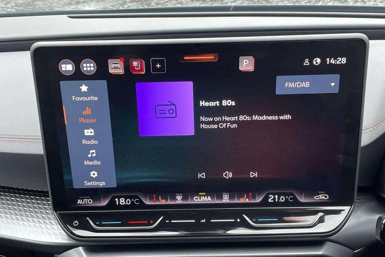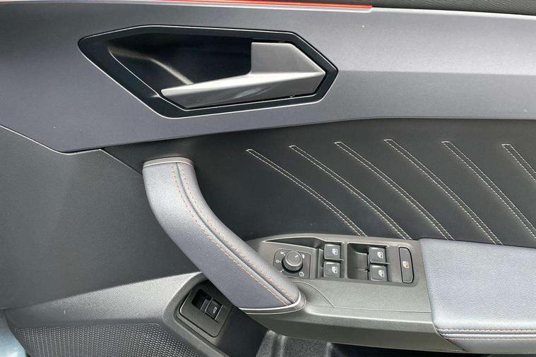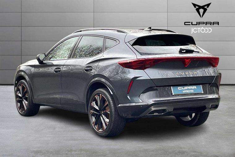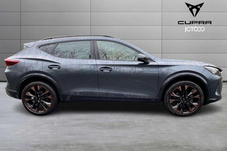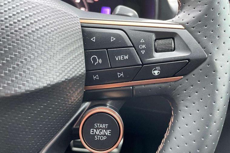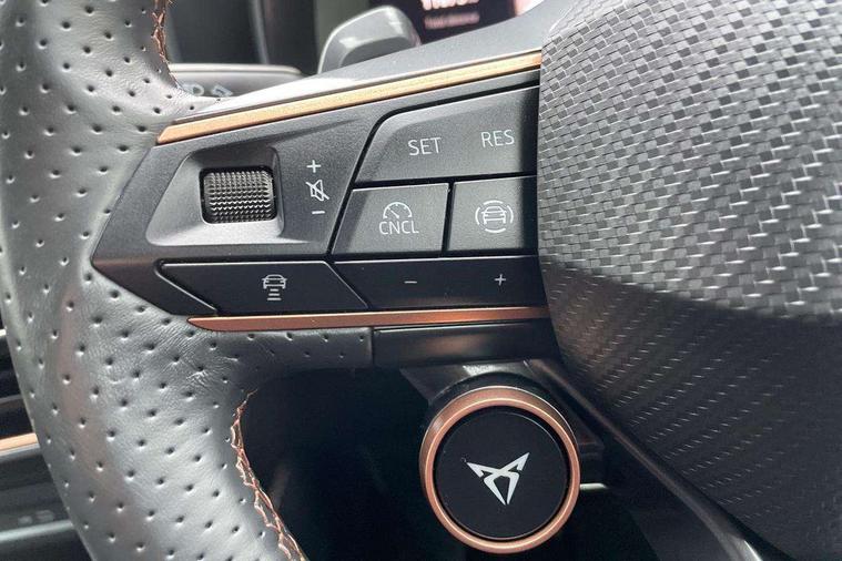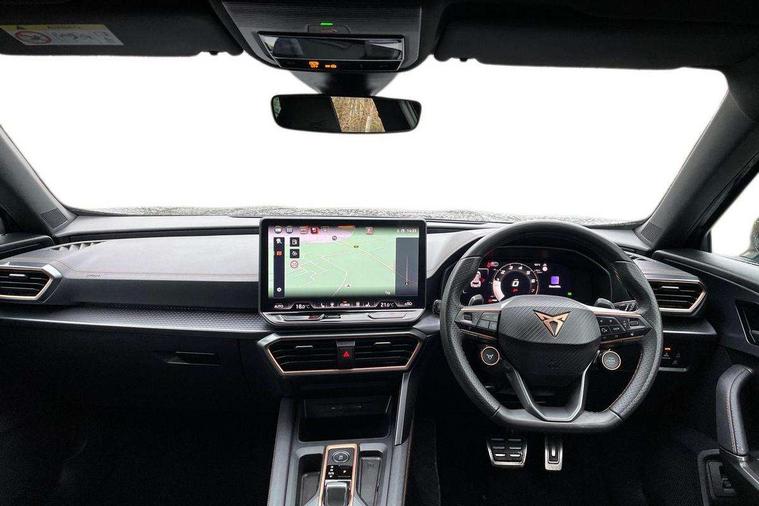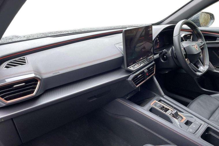 10.25" digital cockpit and configurable dashboard, Adaptive cruise control with follow-to-stop and speed limiter, Advanced driver alert system, Advanced lane assist with semi-automatic vehicle control in a medical emergency and traffic jam assist, Driving profile selection, Dynamic road sign display, Emergency steering support with turn assist, Forward collision warning with automatic braking, Full link phone integration, Intelligent park assist, Progressive steering, RPM, trip computer, outside temp gauge, instrument light brightness, low fuel warning light, lights on reminder, gearshift indicator, Service interval indicator, Side and exit assist, Start/stop system with regenerative braking, Top view camera, Virtual pedal and electric tailgate, Voice control system, Wired Android Auto, Wireless apple carplay, Wireless phone charger, CUPRA sport suspension, Electronic locking differential and dynamic traction support, 2 front and 2 rear USB type C sockets, Media system with navigation, 12.9" touchscreen display, voice control, DAB, steering wheel mounted controls, Auto dimming rear view mirror, Body colour door handles, Body coloured bumpers, Dark grey wing mirror, Daytime running light with automatic headlight control and coming home feature, Door panel ambient lighting, Dynamic headlight range control, Electric front/rear windows, Electrically adjustable heated and folding door mirrors with memory function, Gloss black roof rails and window surrounds, High beam assist, LED 3rd brake light, LED front fog lamps with cornering function, LED Headlights, LED Taillights with dynamic indicator, Rain sensing wipers, Rear diffuser with black simulated exhaust pipes, Rear fog lights, Rear side wing doors, Rear wash/wipe, Tinted rear windows, Welcome lights (within exterior mirror housing), 12V socket, 2 front and 2 rear reading lights, 3 seat bench in 2nd row, 60/40 split rear bench seat with armrest and mechanical seat release, Black headlining, Black interior roof lining, Cupra sports pedals, Dust/pollen filter, Electrically adjustable front seats with lumbar support and memory function, Front and rear head restraints, Front centre armrest, Heated front seats, Heated supersports multifunction leather steering wheel with satellite buttons and gear shift paddles, Height/reach adjust steering wheel, Illuminated aluminium doorsteps, Illuminated interior front door sills, Illuminated sunvisor with mirror, Isofix, Leather dashboard, door insert and side trim panel, LED smart wraparound lighting, PVC/Leather upholstery, Satellite steering wheel, Single front passenger seat, Storage pockets on rear of front seats, Three zone climate control with control panel in rear, Variable luggage/load compartment floor, 3 point seatbelts on all rear seats, ABS, Brake control system - ESC and brake booster, Child proof door locks, Driver and front passenger airbags with front passenger airbag de-activation, Electronic parking brake, Front and rear disc brakes, Front side curtain airbags, Hill hold control, Pre-crash front and rear seat belt tensioner, window closure and hazard lights, Public e-call, Seat belt reminder for front and rear seats, Tyre pressure monitoring system, Anti theft alarm system, KESSY Advanced - Keyless start, keyless entry with SAFELOCK, Locking wheel bolts, Copper and aluminium interior detailing,