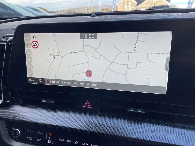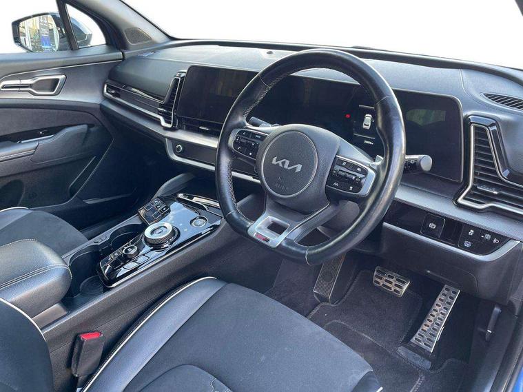 12.3" Display with navigation, 4.2" supervision colour cluster display, Apple car play/Android Auto with voice control, Drive mode selector, E-call, Forward collision avoidance assist (FCA) - city/pedestrian/cyclist/junction covering, Front and rear parking sensors, Highway Driving Assist (HDA), Intelligent speed limit assist, Kia Connect (UVO), Lane Following Assist (LFA), Lane keep assist, Low washer fluid warning, Rear view monitor, Reversing camera system integrated into centre fascia screen, Smart cruise control with stop and go functionality, Speed sensitive power steering, Trip computer, Windscreen washer level indicator, Intelligent Stop and Go, 6 speaker audio system, Bluetooth audio streaming, DAB Radio with MP3, Rear USB port, Steering wheel mounted audio controls, USB C type charging ports on centre console, USB C type charging ports on side of front seats, USB port for connection of a media device, All round electric windows with drivers and front passenger auto up/down function, Automatic headlight control system, Automatic window defogger, Backlite glass heated with timer, Black bumpers, Body colour exterior door handles, Body colour radiator upper garnish and door garnish, Electrically adjustable/heated/folding door mirrors with LED indicators, Front and rear chrome skid plates, Gloss black door mirrors, Gloss black radiator grille, Gloss black side sill and wheel arch body mouldings, Glossy black roof rack, High beam assist, Interior electrochromic mirror, LED daytime running lights, LED front fog lamps, LED headlamps (low and high beam - MFR type), LED High mounted stop light, LED rear combination lamp, Rain sensing wipers with aero blades, Rear fog lamp, Rear privacy glass, Rear side wing doors, Rear spoiler, Rear wiper, Satin finished beltline, Silver coloured inserts to bumpers, Tinted rear glass, Trailer stability assist, 12V power socket in front centre fascia and luggage compartment, 2nd row personal lamps, 3 seat bench in 2nd row, 3 x passenger assist grips, 40/20/40 split folding rear seat, All-round height adjustable headrests, Black headlining, Centre console storage box, Cupholders in rear armrest, D-Shaped sports leather steering wheel and perforated inserts with GT-Line logo, Door courtesy lamps, Drink holder at centre armrest, Driver and front passenger side sunvisors with illuminated vanity mirrors, Driver's seat manual height adjust, Drivers seat power lumbar support, Front and rear door storage, Front seat and rear pockets, Front/rear centre armrests, Gear shift indicator, Glovebox illumination, Heated front seats, Heated steering wheel, Interior door lock/unlock function, ISOFIX Child seat top tethers and anchor fixings outer rear seats, Luggage area light, Luggage area load cover, Luggage net with hooks, Metal paint interior door handles, Overhead console lamp, Paddle shift controls, Rear cabin light, Rear coat hooks, Single front passenger seat, Sports pedals, Suede leather upholstery, Three zone climate control, Tilt/telescopic adjustable steering wheel, Ventilation ducts to rear compartment, Active front headrests, All round 3-point seatbelts, Anti-lock braking system (ABS), Dual front side airbags, Dual horn, Electronic parking brake, Electronic stability control with downhill brake control, Front passenger airbag cut-off switch, Front seatbelt pretensioners + load limiters, Height adjustable front seatbelts, Hill start assist control (HAC), Impact sensing auto door unlocking, Multi collision brake assist, Rear door child safety locks, Rear seat alert system, Traction control, Twin curtain airbags, Twin front airbags, Tyre pressure monitoring system, Advanced anti-theft system including immobiliser and alarm, Door deadlocks, Engine Start/Stop Button with Smart Entry System, Locking wheel nuts, Speed sensitive auto door locking, Visible vehicle identification number, Aluminium pattern finish centre fascia and door garnish, 18" GT-Line alloy wheels, Tyre mobility kit,