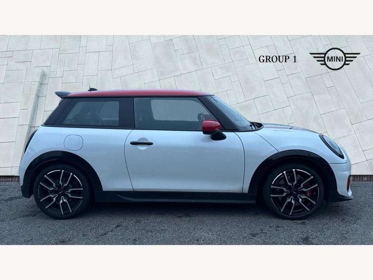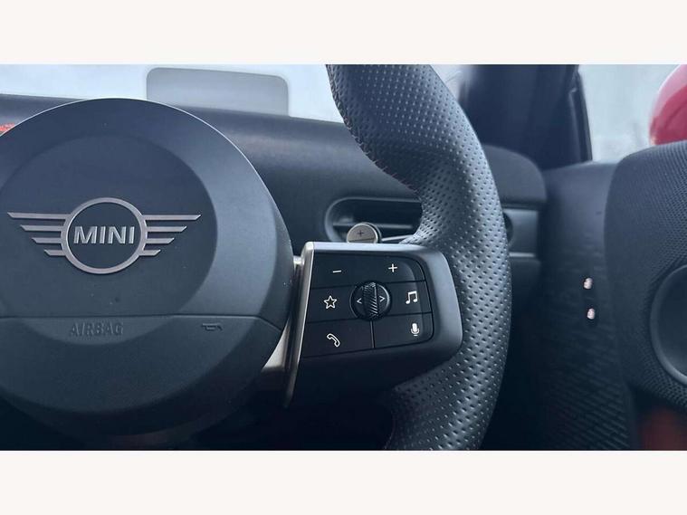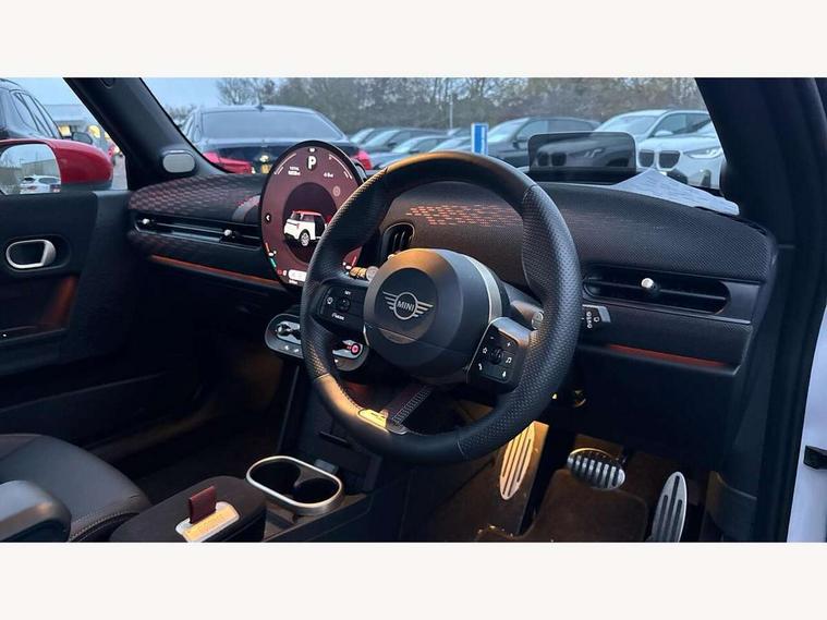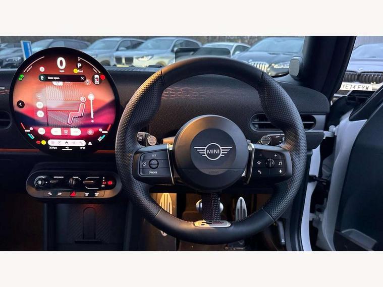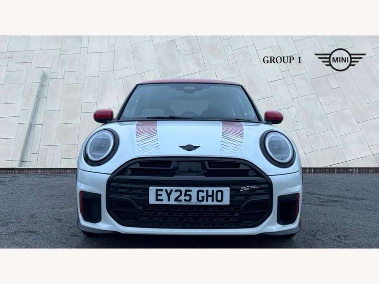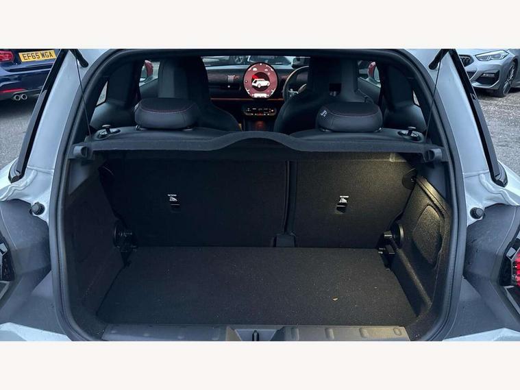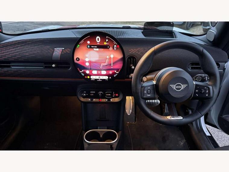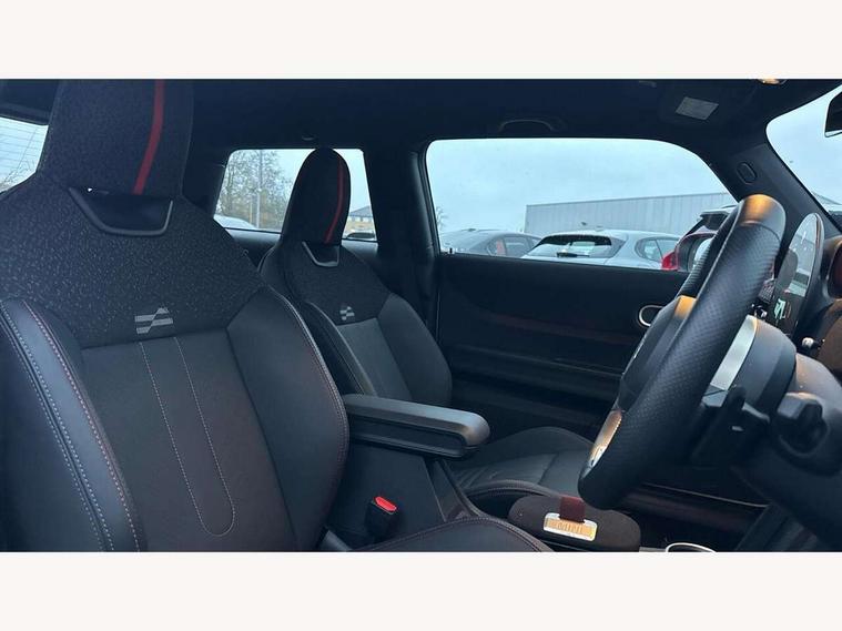 Central toggle bar, Circular OLED Screen, Compatible mobile phone bluetooth with audio streaming, Cruise control, Digital instrument cluster, Electro-mechanical speed dependant steering assistance, Emergency call service, Gaming controller with intelligent personal assistant voice update, JCW bespoke experience mode, Mini navigation system, On board computer, Service interval indicator, Tailgate, 7 speed sport transmission with double clutch, Adaptive suspension, JCW exhaust system, DAB Digital radio, Harman Kardon sound system, Personal eSim, Rear USB charger, Auto headlights, Electric adjustable heated door mirrors, Electric front windows, Front and rear apron, Heated rear window, Heated windscreen washer jets, High gloss black wheel arches, High gloss hexagonal patterned grill surround, JCW body kit, LED 3rd brake light, LED daytime running lights, LED indicator lights, LED rear lights, Rain sensor window wipers, Rear fog lights, Rear roof spoiler with airblades, Rear window wiper, 2 seat bench in second row, 2 zone automatic air conditioning, 60/40 rear seat bench, Ambient lighting, Black lower band in high gloss, Cupholders, Dark headliner, Floor mats, Front and rear head restraints, Front compact armrest, Heated steering wheel, Height adjustable passenger seat, Lidded storage box in Black/Red knit, Luggage compartment lighting, Partially perforated vescin steering wheel with red accent, black/red decorative strap, Single front passenger seat, Stainless steel pedals, Steering wheel paddle shift, Sunvisors with vanity mirrors, Vescin/Cord combination JCW upholstery includes dash knit in black with red accents, Driving assistant pack - Cooper Hatchback, Level 1 pack - Mini Hatchback, Park assistant pack - Cooper Hatchback, 3 point seatbelts on all four seats, 6 Airbags - front, side, head and seat belt tensioners, Anti-lock braking system (ABS), DSC - Dynamic Stability Control, Electronic parking brake, Front and rear disc brakes, Front ISOFIX (iSize), Front passenger airbag deactivation, JCW Sport Brakes, Red brake callipers with JCW badge, Traction control, Tyre pressure monitoring system, Alarm, Immobiliser, Remote central locking, Black/Red decorative dash strap, Tyre repair kit,