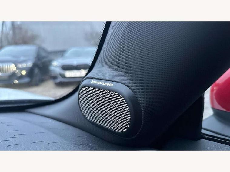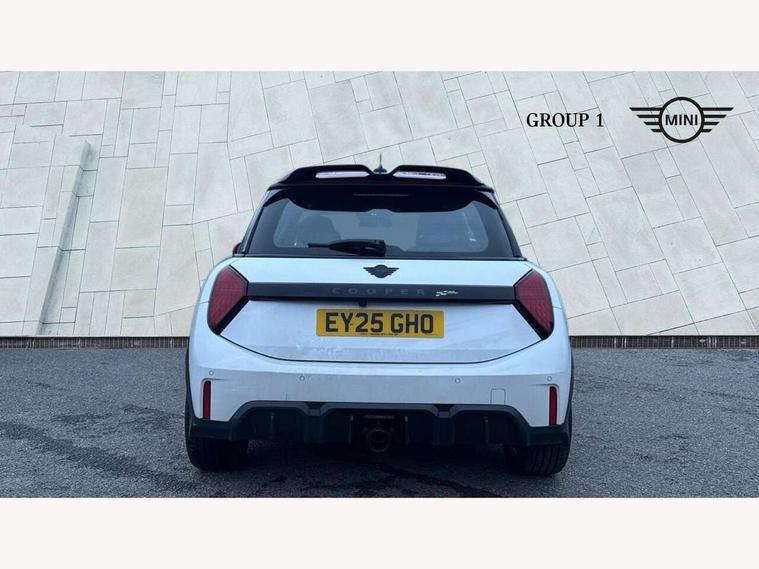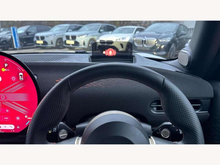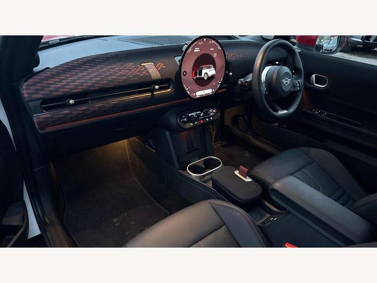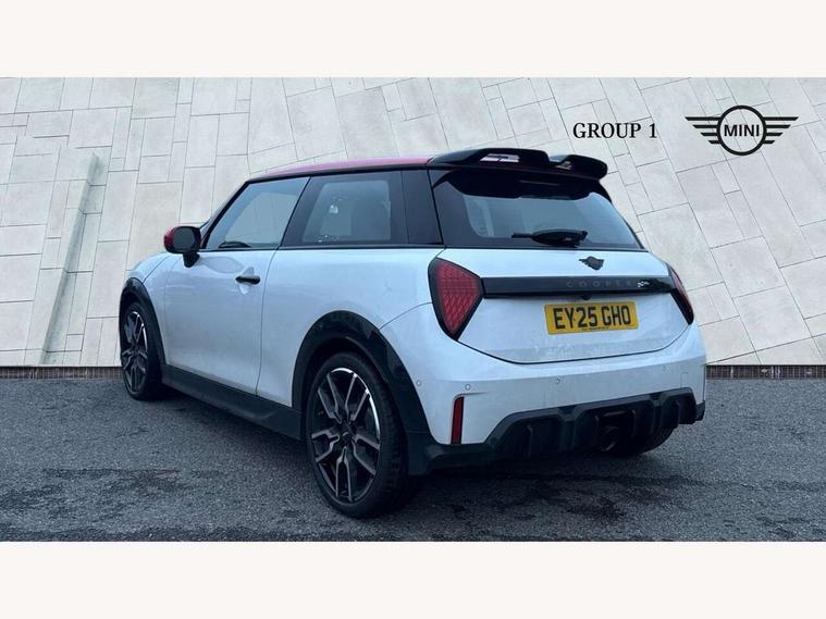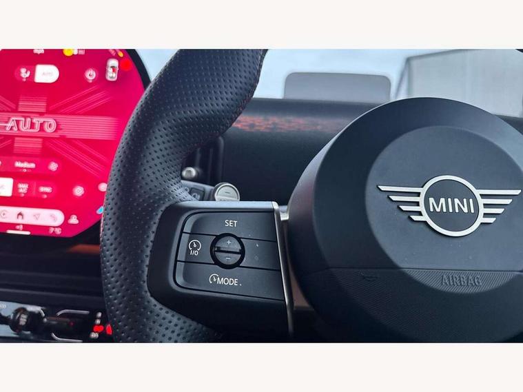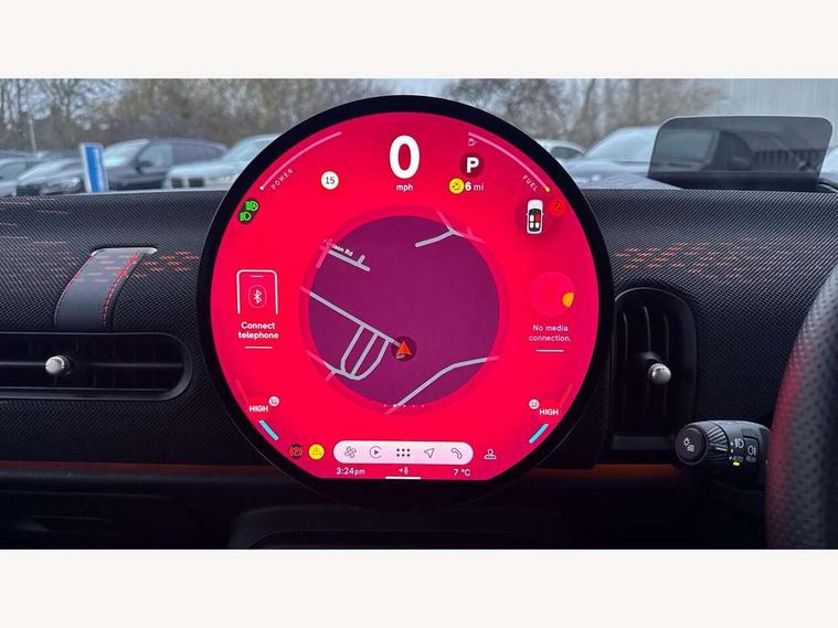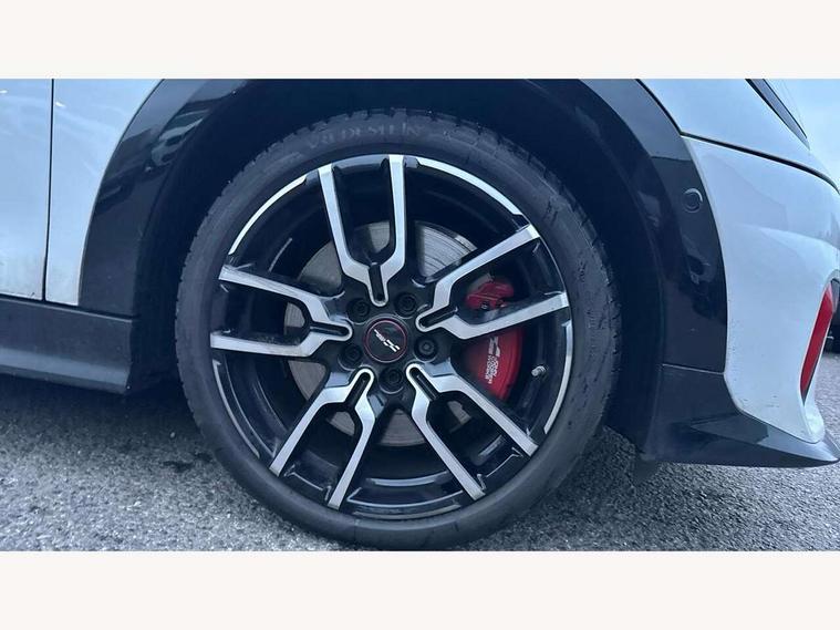 Central toggle bar, Circular OLED Screen, Compatible mobile phone bluetooth with audio streaming, Cruise control, Digital instrument cluster, Electro-mechanical speed dependant steering assistance, Emergency call service, Gaming controller with intelligent personal assistant voice update, JCW bespoke experience mode, Mini navigation system, On board computer, Service interval indicator, Tailgate, 7 speed sport transmission with double clutch, Adaptive suspension, JCW exhaust system, DAB Digital radio, Harman Kardon sound system, Personal eSim, Rear USB charger, Auto headlights, Electric adjustable heated door mirrors, Electric front windows, Front and rear apron, Heated rear window, Heated windscreen washer jets, High gloss black wheel arches, High gloss hexagonal patterned grill surround, JCW body kit, LED 3rd brake light, LED daytime running lights, LED indicator lights, LED rear lights, Rain sensor window wipers, Rear fog lights, Rear roof spoiler with airblades, Rear window wiper, 2 seat bench in second row, 2 zone automatic air conditioning, 60/40 rear seat bench, Ambient lighting, Black lower band in high gloss, Cupholders, Dark headliner, Floor mats, Front and rear head restraints, Front compact armrest, Heated steering wheel, Height adjustable passenger seat, Lidded storage box in Black/Red knit, Luggage compartment lighting, Partially perforated vescin steering wheel with red accent, black/red decorative strap, Single front passenger seat, Stainless steel pedals, Steering wheel paddle shift, Sunvisors with vanity mirrors, Vescin/Cord combination JCW upholstery includes dash knit in black with red accents, Driving assistant pack - Cooper Hatchback, Level 1 pack - Mini Hatchback, Park assistant pack - Cooper Hatchback, 3 point seatbelts on all four seats, 6 Airbags - front, side, head and seat belt tensioners, Anti-lock braking system (ABS), DSC - Dynamic Stability Control, Electronic parking brake, Front and rear disc brakes, Front ISOFIX (iSize), Front passenger airbag deactivation, JCW Sport Brakes, Red brake callipers with JCW badge, Traction control, Tyre pressure monitoring system, Alarm, Immobiliser, Remote central locking, Black/Red decorative dash strap, Tyre repair kit,