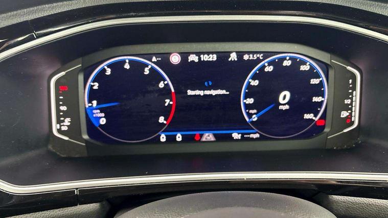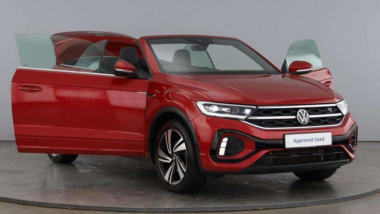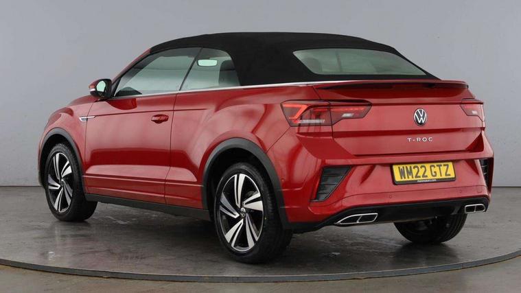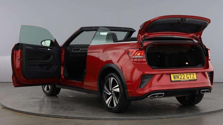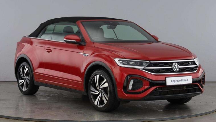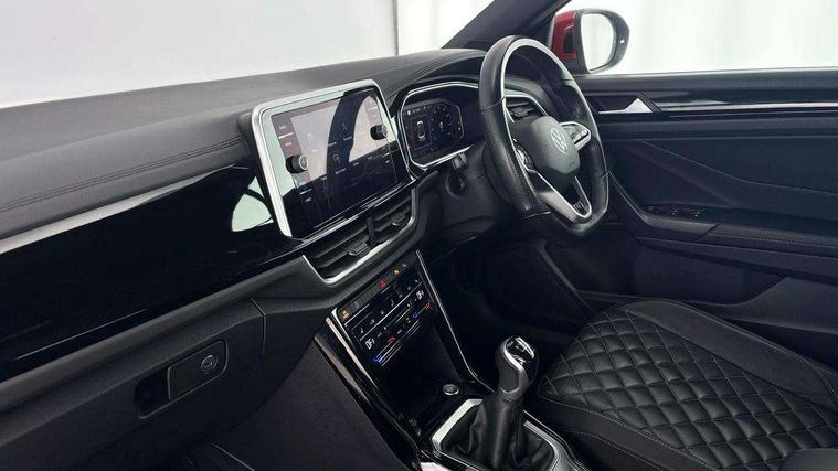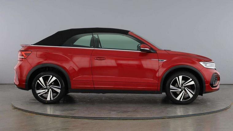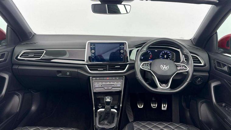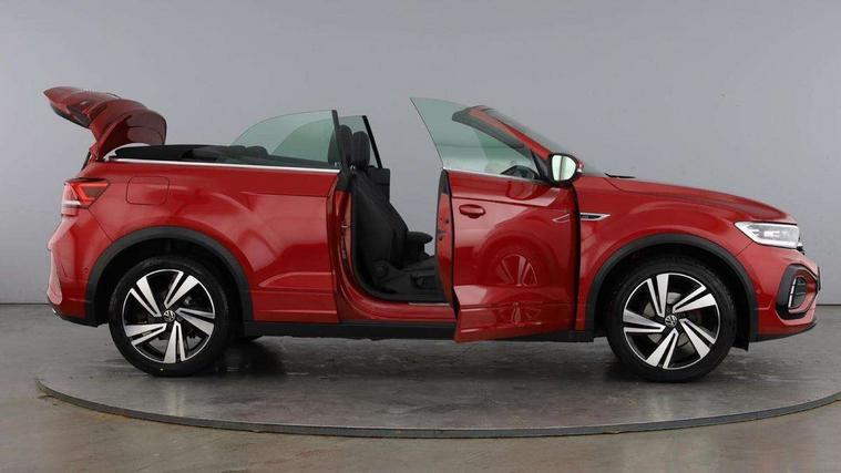 Adaptive cruise control and speed limiter, Bluetooth mobile phone interface, Brake pad wear indicator, Car information display, Digital Cockpit Pro with 10.25" Display, Driver alert system with fatigue detection, Driver tips and journey analysis, Emergency call service, Modified key software - reduce switch off time for key status change to Long no motion, Multifunction computer with visual gear change recommendation for fuel consumption, Multifunction front facing camera, Park assist including front and rear parking sensors, Speedo and rev counter, electronic odometer, trip, service interval display and exterior temperature gauge, Start/stop system with brake energy recovery, Tailgate/trunk lid release from outside, Warning sound and light for front seatbelts unfastened, Diversity antenna for FM reception, Music playback - MP3, WMA and AAC files, SMS functionality - read, compose and send SMS messages using touch-screen display, Title and cover art display, USB-C Interface and USB charging socket, We Connect and We Connect Plus functionality, Ambient lighting with logo projection, Auto dimming interior rear view mirror, Automatic hazard lights activation under emergency braking, Automatic headlight control with LED separate daytime running lights with coming/leaving home function, Black roof, Body colour door handles, Body colour rear spoiler, Chrome effect left and right trapezoid exhaust tailpipe fascia surround, Chrome trim on upper and lower radiator grille, Dark red rear combination lamps in LED technology, Dusk sensor, Exterior mirrors aspherical on driver side, convex on front passenger side, Heat insulating glass windscreen, High level 3rd brake light, LED performance matrix headlights - dynamic range control, dynamic cornering light and turn signal + light mode for rain/fog/snow, LED rear number plate lights, Power operated canvas convertible top, Power windows with comfort operation and circuit breaker, R-Line design body coloured bumpers, Rain sensor, Rear boot, Rear exhaust tailpipe, Rear fog light on one side and reversing lights on both sides, Remote electrically foldable door mirrors, puddle lights and reverse activated passenger door mirror, Volkswagen roundel, Windscreen wiper with intermittent wipe light, Without exterior ambient lighting, 12V socket in centre console storage area, 2 LED front reading lights, 2 seat bench in 2nd row, 50:50 Split folding rear seat backrests with fixed rear seat bench, Air care climatronic air conditoning system with active combination filter and 2-zone temperature control, Black door lower parts with chrome trim, Chrome plated surround to light, mirror and window switch, Door and side trim panel with leatherette insert, Easy entry backrest release, Front and rear carpet mats with black stitching, Front centre armrest, Front cupholders x 2, Front door pockets, Front seat back storage pockets, Front sports comfort seats with manual height adjustment, Heated multifunction leather sports steering wheel, Height/reach adjust steering wheel, Inserts of front seats and outer rear seats in ArtVelours titan black, Instrument lighting, white adjustable panel illumination, Interior light delay, Interior light in footwell, Interior lighting with switch off delay and contact switches on all doors, Interior white ambient lighting and surround lighting, Isofix child seat preparation, Lockable glove compartment with light, Luggage compartment lighting, Power adjustable lumbar support in front, Rear head restraints, Single front passenger seat, Stainless steel pedals, Sun visors with illuminated vanity mirrors, Unique R Line door sill protectors, Driver assistance pack without proactive passenger protection - T-Roc cabriolet, 2 x 3-point seatbelts/outer rear seats with ECE label, Driver and front passenger airbag with front passenger airbag deactivation, Driver and front passenger safety-optimised head restraints, Drivers seatbelt reminder, Electronic parking brake, Electronic Stability Control (ESC) including ABS, ASR and EDL, Front and rear disc brakes, Front assist with autonomous emergency braking, Pedestrian monitoring, Predictive pedestrian protection, Rigid safety cell with front and rear crumple zones, Side airbag/thorax airbag system, for front passengers, Single tone horn, Three point height adjust front seatbelts + pretensioners, Tyre pressure loss indicator, Volkswagen roadside assistance, Anti-theft alarm system with interior protection and central locking system with SAFELOCK, radio remote control and 2 remote control folding keys, Electronic engine immobiliser, Trims for alloy wheels,