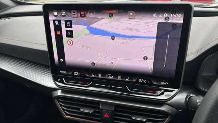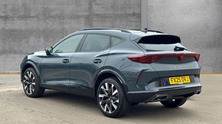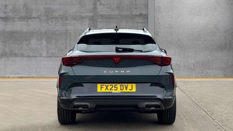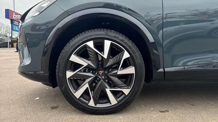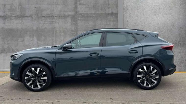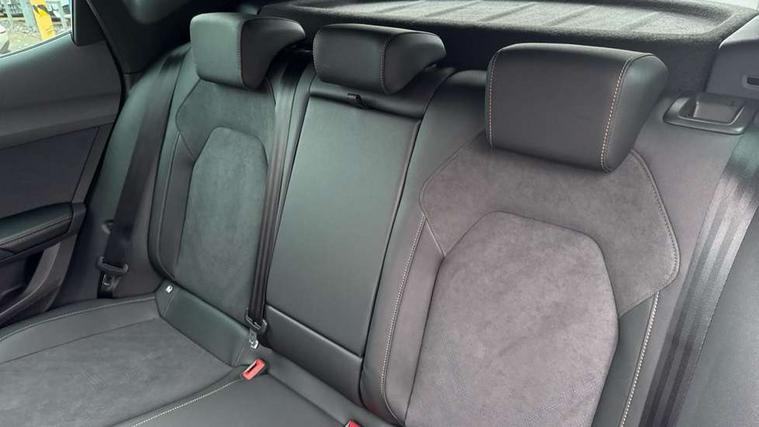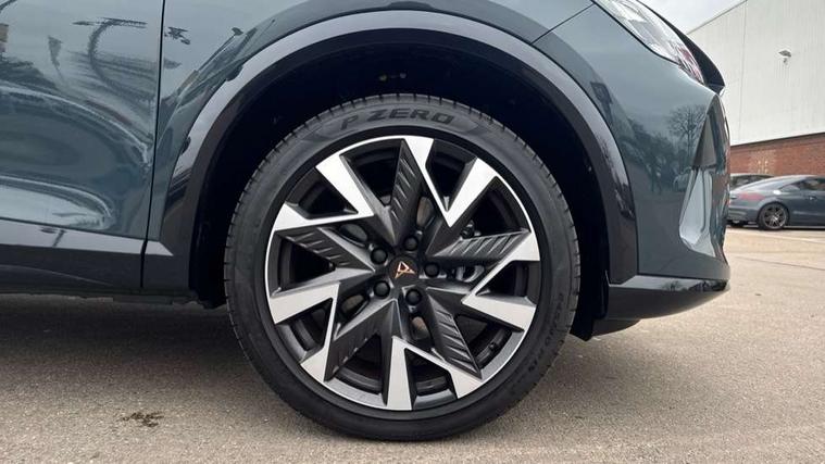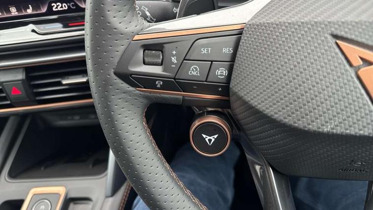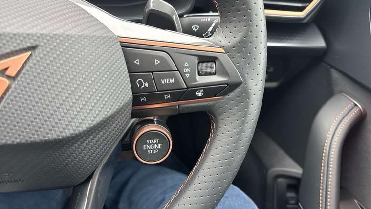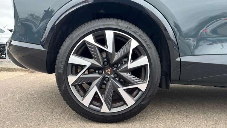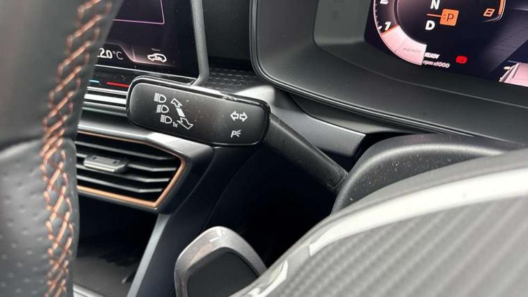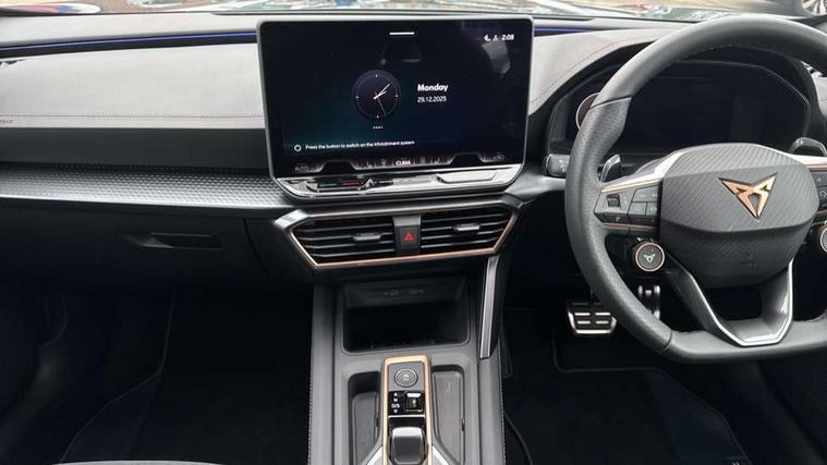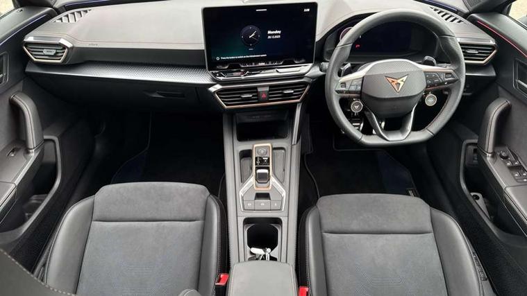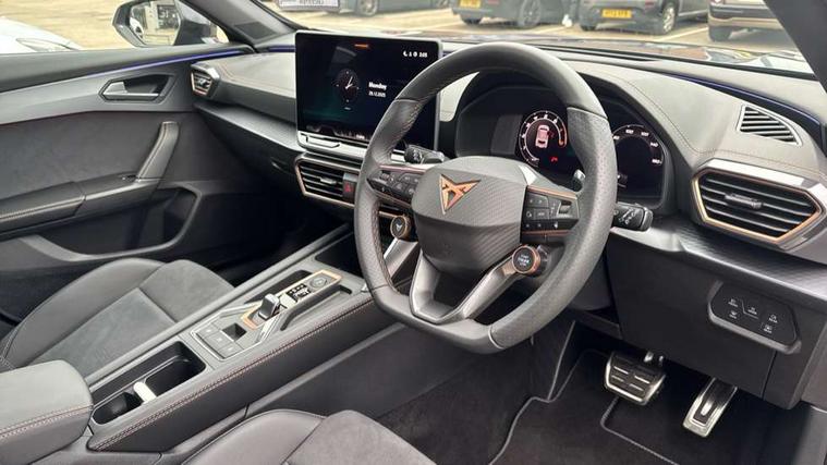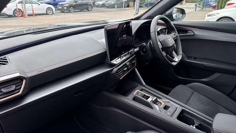10.25" digital cockpit and configurable dashboard, Adaptive cruise control with follow-to-stop and speed limiter, Advanced driver alert system, Driving profile selection, Dynamic road sign display, Emergency steering support with turn assist, Forward collision warning with automatic braking, Front and rear parking sensors, Full link phone integration, Lane assist, Progressive steering, Rear view camera, RPM, trip computer, outside temp gauge, instrument light brightness, low fuel warning light, lights on reminder, gearshift indicator, Service interval indicator, Start/stop system with regenerative braking, Virtual pedal and electric tailgate, Voice control system, Wired Android Auto, Wireless apple carplay, Wireless phone charger, CUPRA sport suspension, Electronic locking differential and dynamic traction support, 2 front and 2 rear USB type C sockets, Media system with navigation, 12.9" touchscreen display, voice control, DAB, steering wheel mounted controls, Auto dimming rear view mirror, Body colour door handles, Body coloured bumpers, Dark grey wing mirror, Daytime running light with automatic headlight control and coming home feature, Door panel ambient lighting, Dynamic headlight range control, Electric front/rear windows, Electrically adjustable heated and folding door mirrors with memory function, Gloss black roof rails and window surrounds, High beam assist, LED 3rd brake light, LED front fog lamps with cornering function, LED Headlights, LED Taillights with dynamic indicator, Rain sensing wipers, Rear diffuser with black simulated exhaust pipes, Rear fog lights, Rear side wing doors, Rear wash/wipe, Tinted rear windows, Welcome lights (within exterior mirror housing), 12V socket, 2 front and 2 rear reading lights, 3 seat bench in 2nd row, 60/40 split rear bench seat with armrest and mechanical seat release, Black headlining, Black interior roof lining, Cupra sports pedals, Dust/pollen filter, Electrically adjustable driver's seat with memory and lumbar support, Front and rear head restraints, Front centre armrest, Heated front seats, Heated supersports multifunction leather steering wheel with satellite buttons and gear shift paddles, Height/reach adjust steering wheel, Illuminated aluminium doorsteps, Illuminated interior front door sills, Illuminated sunvisor with mirror, Isofix, Leather dashboard, door insert and side trim panel, LED smart wraparound lighting, PVC/Dinamica microfiber upholstery + bucket seats, Satellite steering wheel, Single front passenger seat, Storage pockets on rear of front seats, Three zone climate control with control panel in rear, Variable luggage/load compartment floor, 3 point seatbelts on all rear seats, ABS, Brake control system - ESC and brake booster, Child proof door locks, Driver and front passenger airbags with front passenger airbag de-activation, Electronic parking brake, Front and rear disc brakes, Front side curtain airbags, Hill hold control, Public e-call, Seat belt reminder for front and rear seats, Tyre pressure monitoring system, Anti theft alarm system, KESSY Advanced - Keyless start, keyless entry with SAFELOCK, Locking wheel bolts, Copper and aluminium interior detailing, 19" Sandstorm machined sport black and silver alloy wheels,