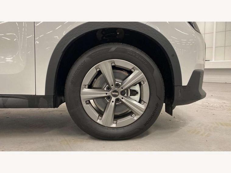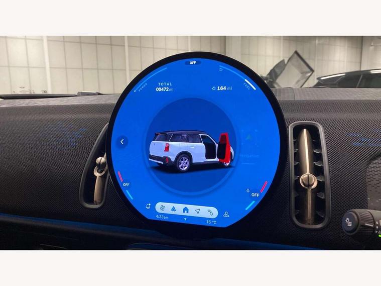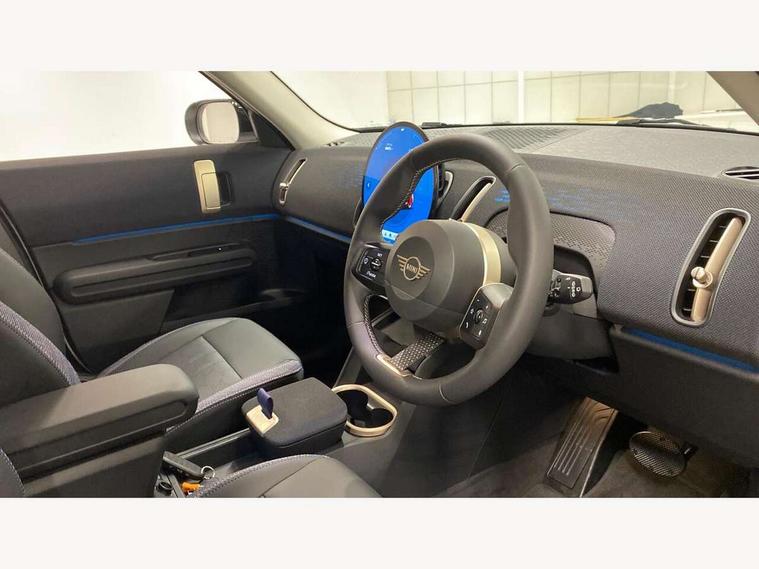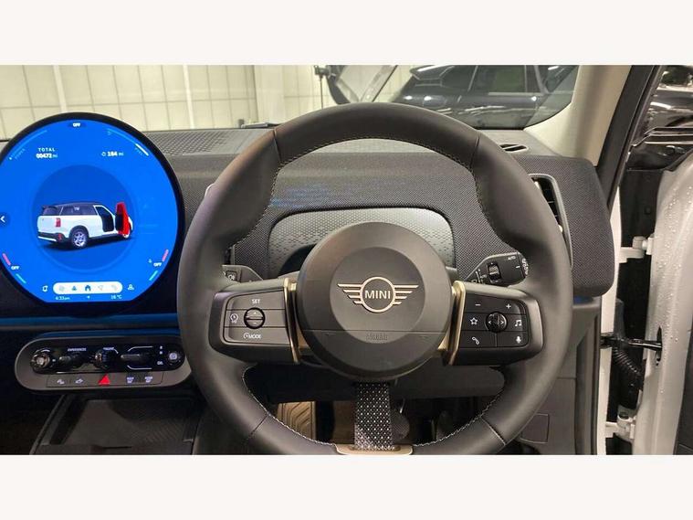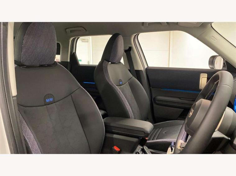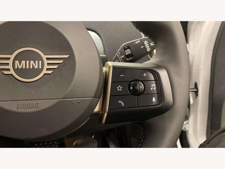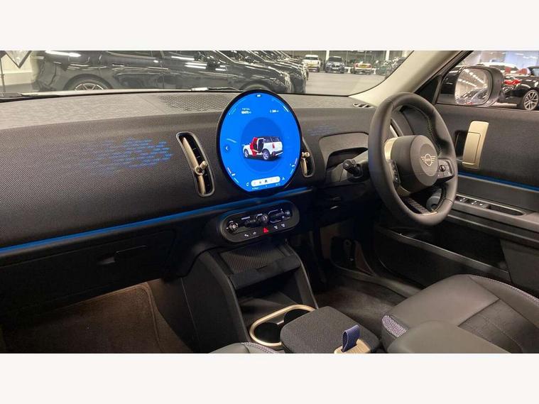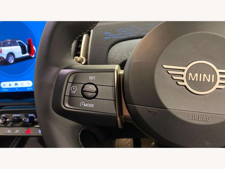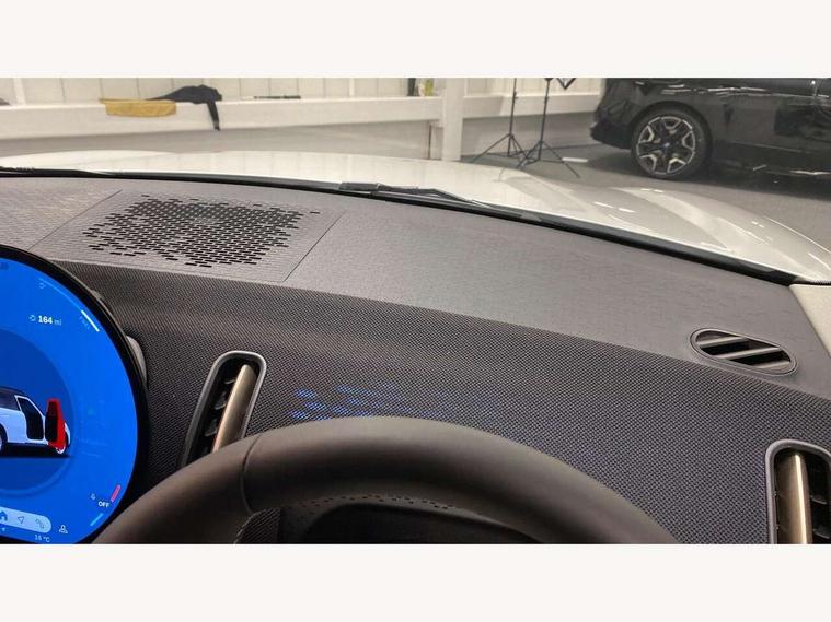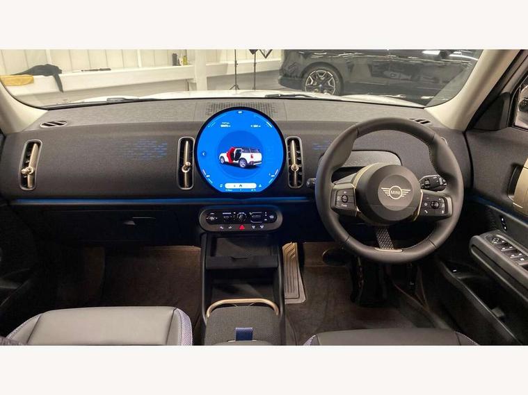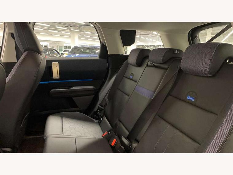 Bluetooth connection, Circular OLED Screen, Compatible mobile phone bluetooth with audio streaming, Cruise Control (DCC), Digital dashboard display, Driving assistant, E-call, Electro-mechanical speed dependant steering assistance, MINI Experience Modes, Mini navigation system, MINI TeleServices, Parking assistant in camera and ultrasound based assistance system, rear view camera, parking aid and distance control, Auto transmission with Paddles, Larger capacity fuel tank, 6 speakers, DAB Digital radio, Personal eSim, Auto tailgate, Electric adjustable heated door mirrors, Front and rear electric windows, Heated rear window, LED daytime running lights, LED Headlights, LED rear lights, LED third brake light, Rain sensor with auto headlights, Rear side wing doors, Rear window wiper, Roof rails, 3 seat bench in 2nd row, 60/40 split rear bench seat, Auto air conditioning, Floor mats, Front armrest, Front headrests, Heated steering wheel, Height and length steering column adjustment, Light headliner, Rear headrests, Single front passenger seat, Sport Vescin Steering Wheel, Sunvisors with vanity mirrors, Vescin/Cloth upholstery, 3x3 point rear seat belts, 6 Airbags - front, side, head and seat belt tensioners, ABS, DSC - Dynamic Stability Control, Electronic handbrake, Electronic Stability Programme (ESP), Front ISOFIX (iSize), Hill hold assist, Hill start assist, Manual rear child locks, Traction control, Tyre pressure monitoring system, Warning triangle, Alarm system with tilt sensor, monitoring doors, bonnet interior and tailgate, Auto drive away locking, Deadlocking function, Electronic vehicle immobiliser, Locking wheel bolts, Remote control locking, Start/stop toggle with keyless go, Black/Blue dashboard knit, MINI Mobility Kit,