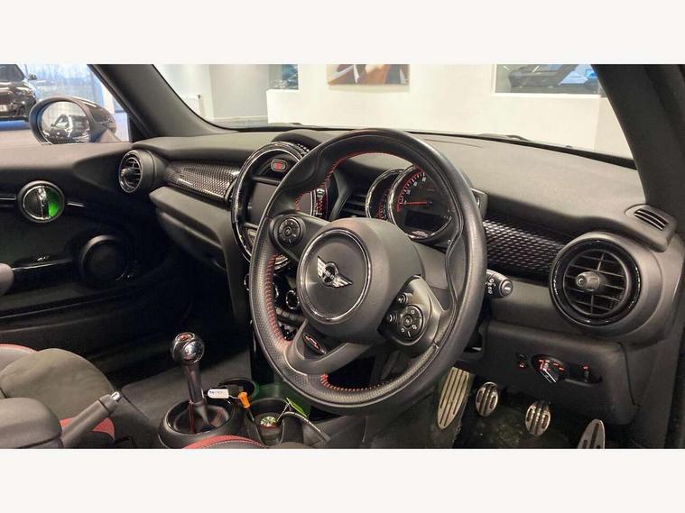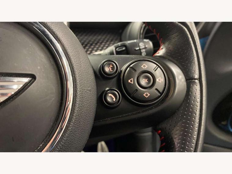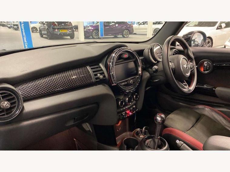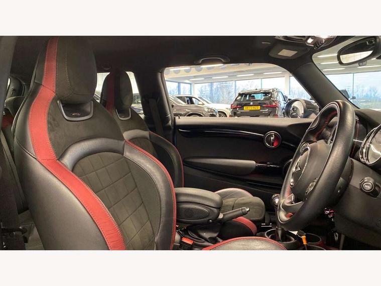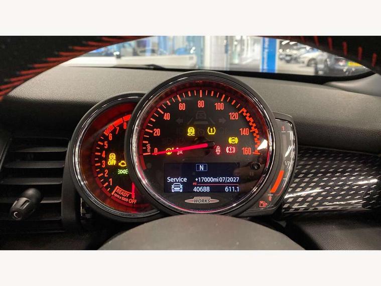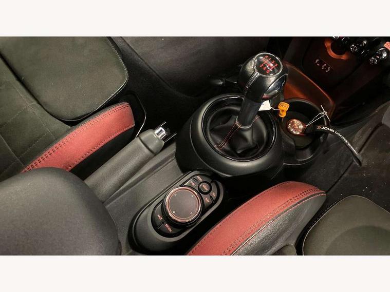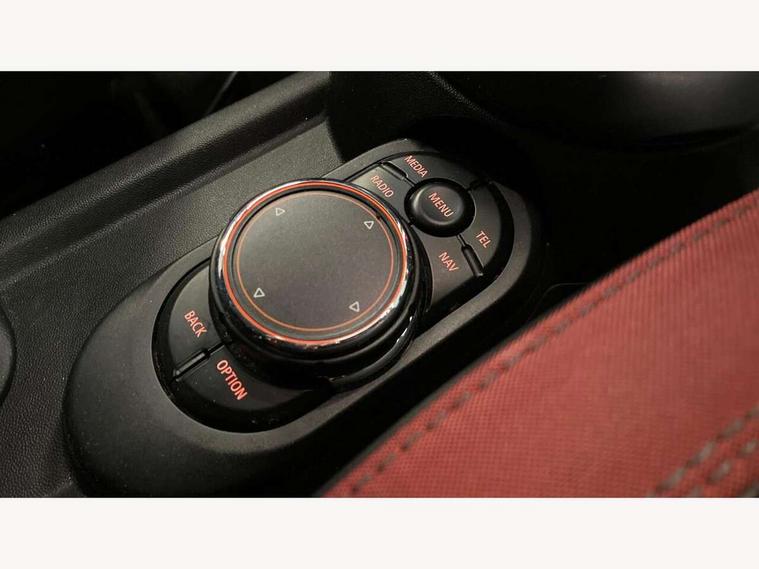 Acoustic seat-belt warning, Brake fluid level warning light, Brake pad wear indicator warning light, DTC - Dynamic traction control, Exterior temperature gauge, Intelligent emergency call, MINI Driving Modes - centre toggle switch to control driving setting (sport, mid and green), MINI TeleServices, Oil level indicator, On board computer, Push button starter, Service interval indicator, Servotronic PAS, Electronic differential lock, Performance Control, Auxiliary input socket, DAB digital radio module, 2 speed wipers+intermittent wipe, Anti dazzle mirror, Anti trapping/one touch open close front windows, Body colour scoop integrated into engine- compartment lid, Body coloured bumpers, Chili red grille bar, Chrome bezels around rear lights and headlights, Chrome door handles, Chrome plated fuel cap, Chrome plated trim on bottom edge of window, Chrome strip on lower grille, Electric front windows, Electrically adjustable door mirrors, Extended wheel arches, Follow me home headlights, Green tinted heat insulating glass, Heated door mirrors/heated windscreen washers, Heated rear window with auto timer, High gloss black tailgate, Honeycomb radiator grille, John Cooper Works roof spoiler, LED fog lights, Metal look door sill finishers, Rear apron, Rear wiper, Side scuttles, Twin chromed exhaust pipes, White indicator lights, 2 rear head restraints, 4 boot load lashing points, 6 way manually adjustable passenger seat, 6-way manually adjustable driver's seat, Active carbon filter, Air recirculation system, Anthracite headlining, Auxiliary socket in centre console storage compartment, Centre console storage, Driver's seat height adjuster, Driver/passenger sunvisors, Easy entry seats, Front and rear cupholders, Front head restraints, Front interior light, Front passenger grab handle, Front seat backrest storage nets, Front sports seats, Gear/selector and handbrake in artificial leather, Internal chrome door handles, Isofix child seat preparation, Luggage compartment lighting, Multifunction steering wheel, Passenger seat height adjuster, Reach + rake adjustable steering column, Rear grab handles, Rear storage trays, Split folding rear seats, Storage compartments in doors, Toolkit in luggage compartment, Vanity mirrors, 3 point seatbelts, ABS/EBD, ASC+T, Brake calipers in red, Cornering brake control (CBC), Crash Sensor - activates hazard/interior lighting + unlocks doors, Driver and passenger airbags, Driver/front passenger side airbags, DSC - Dynamic Stability Control, Fuel cut off safety device, Head airbags, Hill start assist, Manual passenger airbag deactivation function, Seatbelt pretensioners, Tyre pressure warning, Ventilated front disc brakes, Drive away door locking, Locking wheel bolts, Remote central locking/doors+fuel cap+tailgate, Second remote key, Thatcham category 1 alarm + immobiliser,