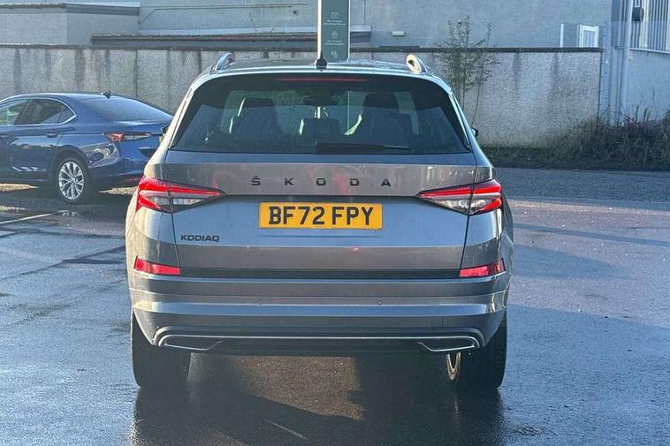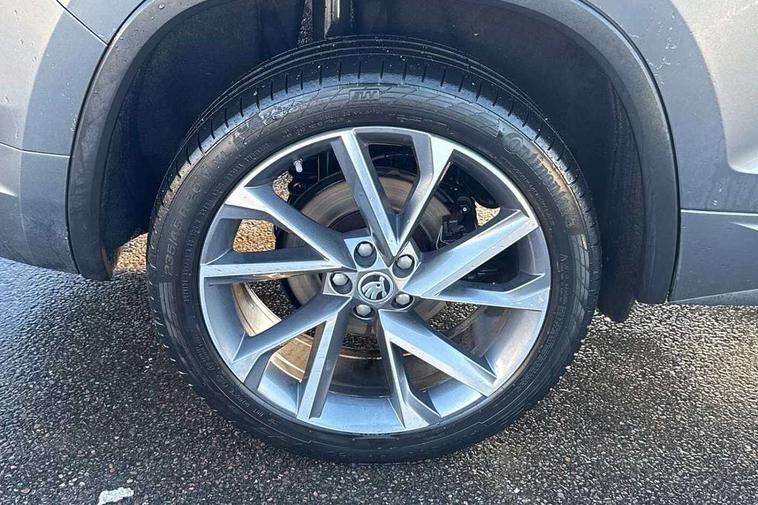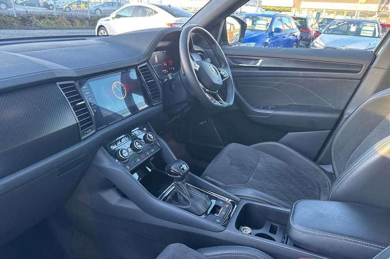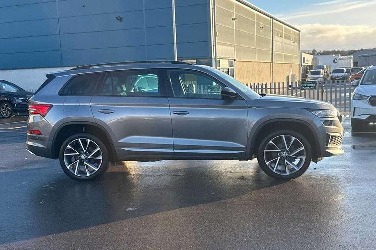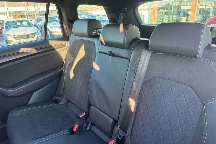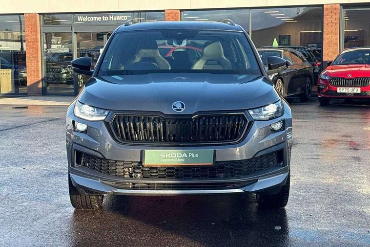 Bluetooth system, Columbus satellite navigation with 9.2" touchscreen, integrated Wi-Fi, web radio, Digital voice enhancement, e call+, ECO Stop/start function, Exterior temperature indicator, Progressive steering, Rear view camera, Smartlink wireless for apple carplay and wired for android auto, Speed limiter, Tailgate unlocking from outside, USB C Port x 2 in front centre console, Wireless charging, 8 Speakers, DAB Digital radio, Aero front windscreen wipers with intermittent function, Aero rear window wiper, Auto dimming rear view mirror, Black roof rails, Black sports styling including front grille and window surrounds, Black wheel arch surrounds, Body colour bumpers, Body colour door handles, Electric adjustable/heated/folding door mirrors, driver side auto dimming with boarding sports and memory function, Electric front and rear windows, Extended rear spoiler with finlets in gloss black, Front fog lights, Full LED matrix headlights with AFS (adaptive front light system), cornering function and AWL (all weather lighting system), Gloss black door mirrors, Headlight washers, Heated rear window, Invisible tailpipe, LED daytime running lights, LED rear fog light, LED third brake light in rear spoiler, Light assistant (coming/leaving home/tunnel light), Off-road style lower front bumper element, Privacy glass, Rain and light sensors, Rear diffuser, Rear LED lights (high functionality) with welcome effect and dynamic indicators, Rear side wing doors, Safety reflectors on front and rear doors, Sportline badge on front fender, Sports front and rear bumpers including lower rear chrome strip, Tailgate lettering in Black, Window control switches with black trim, 12V socket in boot, 2 rails with 2 hooks, 2 seat bench in 3rd row, 3 seat bench in 2nd row, 4 foldable roof handles with rear coat hooks, 60:40 foldable rear seat with sliding adjustment and backrest angle adjustment, Aluminium pedals, Black roof headlining, Bottle holders in door panel in the 1.5 litre front and 1 litre rear, Cargo storage compartments, Chrome headlight control button, Chrome interior door handles, Coat hooks on B pillar, Covered storage compartment on driver side, Decorative door sill covers, Front centre armrest with storage compartment, cup holder and 12V socket, Front courtesy lights, Gear shift lever with chrome frame and black gloss insert, Grey stitching in front and rear armrests and door armrests + door inserts, Height adjustable front headrests, Illuminated and cooled glovebox, Illuminated luggage compartment, Isofix child seat fittings in outer rear seats with top tether, Manually adjustable steering column, Microsuede door panels, Net programme in boot (1x horizontal Net, 2x vertical Nets), Overhead glasses storage compartment, Pollen filter, Rear centre armrest with cupholders, Single front passenger seat, Sliding trunk cover, Small Bags on the inner sides of the front backrests, Sports seats, Sunvisors with illuminated vanity mirrors, Three rear height adjustable headrests, Ticket holder on A Pillar, Umbrella in door panel, Variable boot floor, LED Interior light pack - Kodiaq, Auto door release and activation of warning lights in the event of an accident, Child locks on rear doors, Driver and front passenger airbag with knee airbag and front passenger airbag deactivation, Electronic parking brake with hill start assist, Emergency rear braking signal, ESC (incl. ABS+MSR+ASR+EDS+HBA+DSR+RBS+MKB), Front assist with autonomous emergency braking, Front side airbags with curtain airbags, Fuel cut off safety device, Height adjustable front 3 point seatbelts + pretensioners, Hill hold control, Rear disc brakes, Safety vest holder in door, Seat belt reminder for all seats, Three point rear seat belts, Two tone horn, Tyre pressure monitor, Alarm with interior monitoring and tilt sensor with safe function, Anti-theft wheel bolts, Immobiliser, Keyless entry and start system (KESSY), Remote central locking with 2 keys, Black air vent surround, Carbon finish dashboard and door inserts, Grey stitching in dashboard, 20" Vega Anthracite alloy wheels, Temporary spare wheel (space saver),