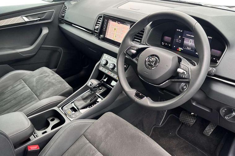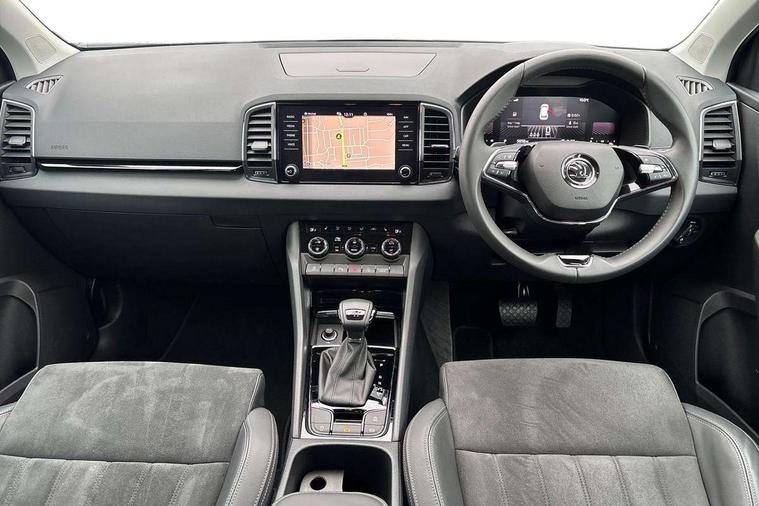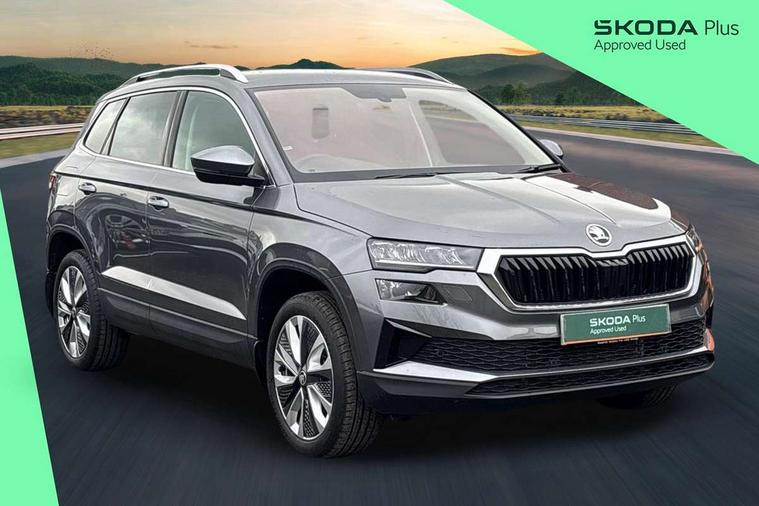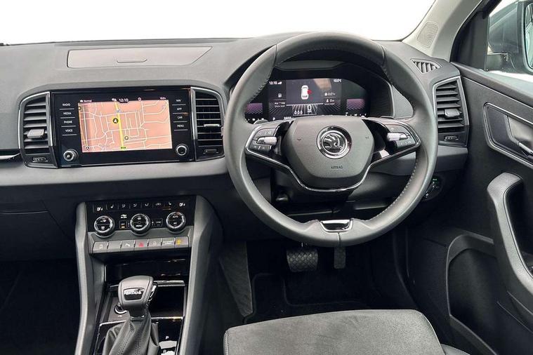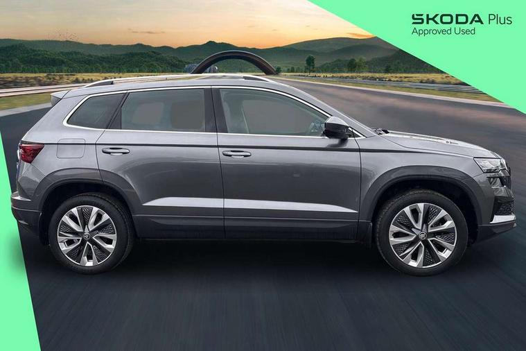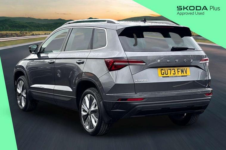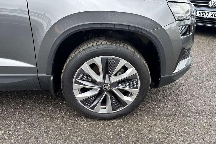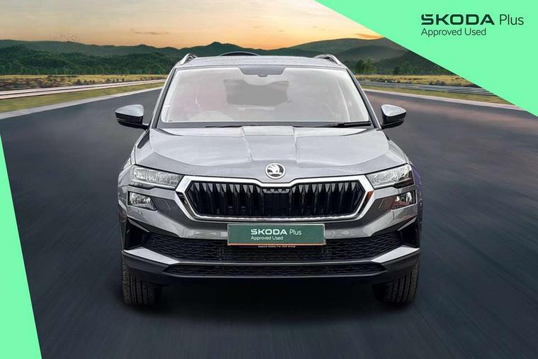 8" Digital display, Care connect, Driver fatigue sensor, Emergency services call system, Outside temperature gauge, Service interval indicator, SmartLink wireless for Apple and wired for Android, Start/stop system with regenerative braking, USB C Port x 2 in front centre console, 8 Speakers, DAB radio with Bluetooth, USB connection, Acoustic glass, Aero front windscreen wipers with intermittent function, Auto dimming rear view mirror with light and rain sensors, Black electric window control buttons, Body colour door mirrors and handles, Dynamic headlight range control with cornering light function, Electric front and rear windows with child proof lock, Heated rear windscreen, LED daytime running lights, LED rear lights with high functionality welcome effect and dynamic indicators, Light assistant (coming/leaving home/tunnel light), Plastic scuff plates, Privacy glass, Rear side wing doors, Rear spoiler, Rear window wiper with washer system and intermittent control, Safety reflectors on front doors, 1.5 litre bottle holders in driver and front passenger door panels, 12V socket in boot, 12v socket in front centre armrest with storage compartment and rear air vents, 2 spoke leather heated multifunction steering wheel with DSG paddles, 2 x Tablet holder, 3 rear height adjustable headrests, 3 seat bench in 2nd row, 4 foldable roof handles with rear coat hooks, Black floor carpet, Chrome inner door handles, Decorative door sills with KAROQ badging, Double sided boot floor, Foldable hooks in the boot, Front head restraints, Height adjustable front three point seats belts with tensioners, Height/reach adjust steering wheel, Ice scraper, Illuminated glovebox, Illuminated luggage compartment, Isofix child seat preparation for front passenger seat, Isofix child seat preparation outer rear, Manual lumbar support for front seats, Pen holder, Pollen filter, Rear boot cover, Rear reading lights, Rubbish bin door, Safety vest holder, Single front passenger seat, Storage box in upper central dashboard closed, Sunvisors with illuminated vanity mirrors, Textile floor mats, Ticket holder, VarioFlex seats with standard rear seat release, Boot pack - Karoq, Chrome roof rails + chrome pack - Karoq, Parking pack - Karoq, Automatic door unlocking in case of crash, Automatic fuel cut off in case of crash, Child locks on rear doors, Driver airbag, Electronic parking brake with auto hold function, Emergency rear braking signal, ESC including ABS, MSR, ASR, EDS, HBA, DSR, RBS, MKB and traction control, Front side airbags, Hill hold control, Knee airbags, Passenger airbag with switch-off function, Pedestrian monitor, Seatbelt reminder signalisation and pretensioner for all seats, Three point seatbelts rear, Two tone horn, Tyre pressure display, Tyre pressure monitor, Alarm with interior monitoring, back up horn and tilt sensor with safe function, Electronic engine immobiliser, Keyless entry and start/stop, Remote central locking with 2 remote folding keys, Chrome framed air vents, 18" Miran alloy wheels in black, Anti-theft wheel bolts protection, Storage on wheel cover, Tool kit,