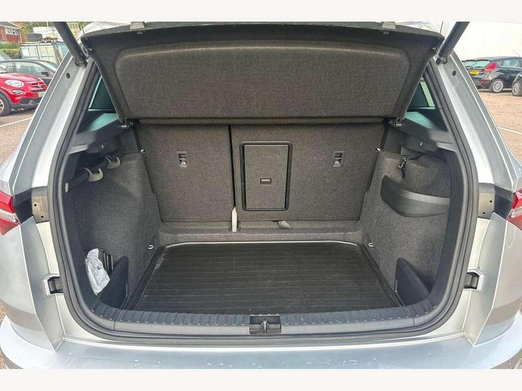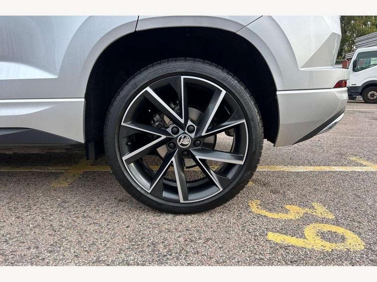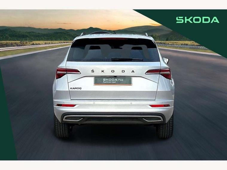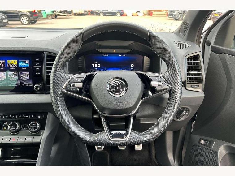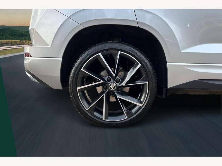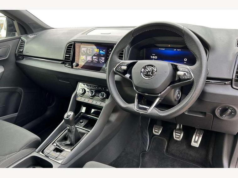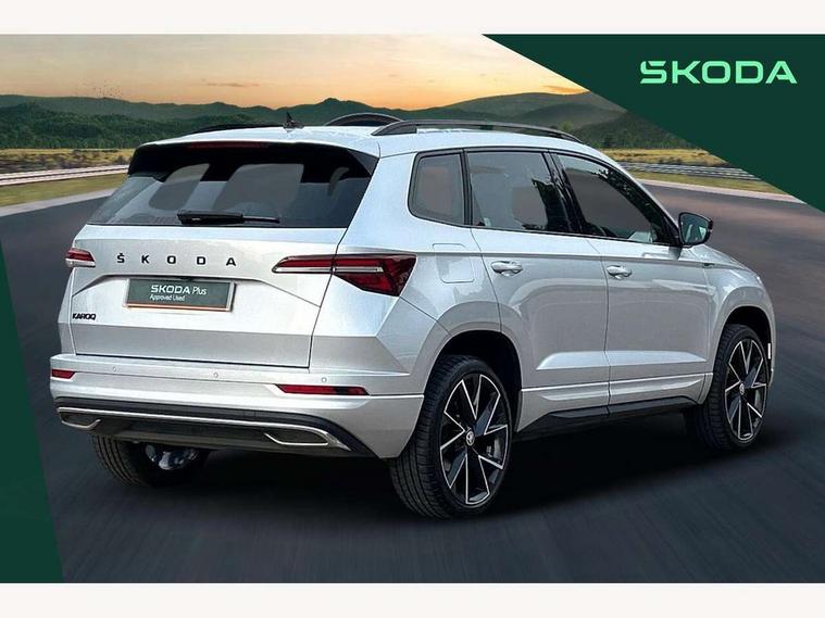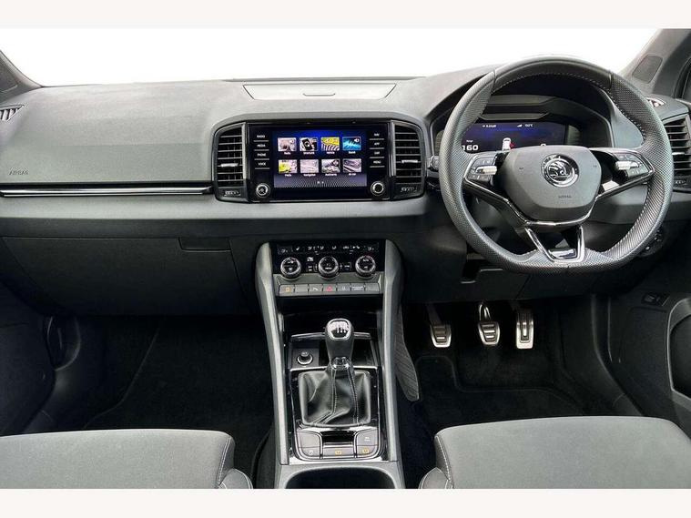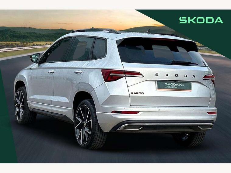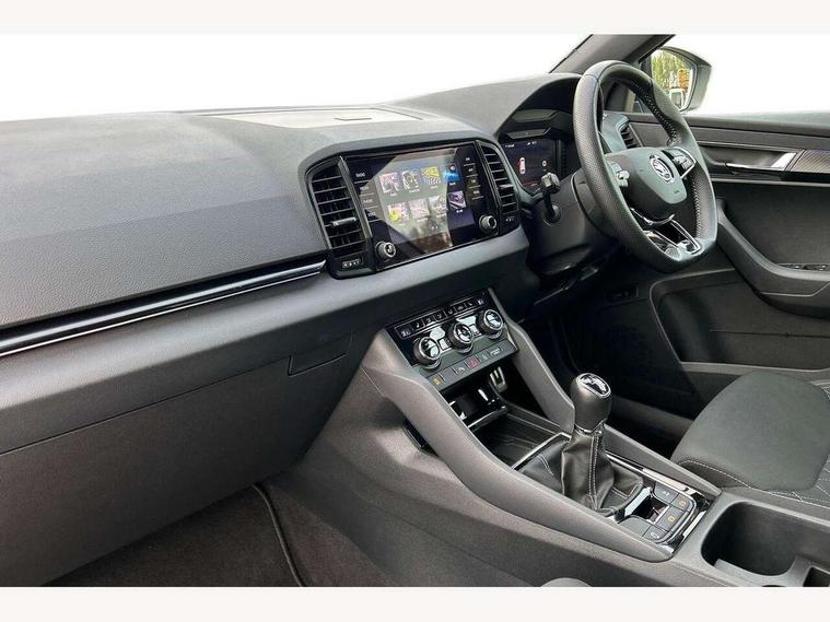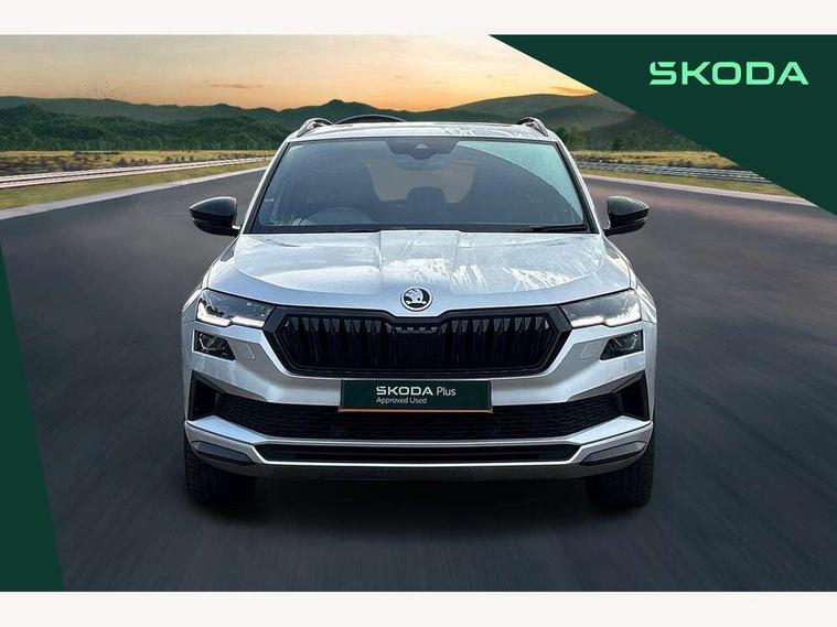 8" Digital display, Care connect, Driver fatigue sensor, Emergency services call system, Outside temperature gauge, Service interval indicator, SmartLink wireless for Apple and wired for Android, Start/stop system with regenerative braking, USB C Port x 2 in front centre console, Virtual cockpit, Virtual pedal with electrically operated boot door, 8 Speakers, DAB radio with Bluetooth, USB connection, Wireless charging without wireless aerial connection, Acoustic glass, Aero front windscreen wipers with intermittent function, Auto dimming rear view mirror with light and rain sensors, Black door mirrors, Black electric window control buttons, Black radiator grille, Black roof rails, Body colour door handles, Electric front and rear windows with child proof lock, Front door steps with SportLine logo, Heated rear windscreen, LED daytime running lights, LED rear lights with high functionality welcome effect and dynamic indicators, Light assistant (coming/leaving home/tunnel light), Panoramic sliding sunroof, Plastic scuff plates, Privacy glass, Protective door side sills in body colour, Rear diffuser, Rear side wing doors, Rear spoiler, Rear window wiper with washer system and intermittent control, Safety reflectors on front doors, Skoda lettering on tailgate in black, Sportline badge on front fender, Sportline decorative inserts with badging, Sports front and rear bumpers, 1.5 litre bottle holders in driver and front passenger door panels, 12V socket in boot, 12v socket in front centre armrest with storage compartment and rear air vents, 3 rear height adjustable headrests, 3 seat bench in 2nd row, 3 spoke leather sports multifunction steering wheel and silver stitching, 4 foldable roof handles with rear coat hooks, Black floor carpet, Black roof headlining, Chrome inner door handles, Double sided boot floor, Foldable hooks in the boot, Front head restraints, Height adjustable front three point seats belts with tensioners, Height/reach adjust steering wheel, Ice scraper, Illuminated glovebox, Illuminated luggage compartment, Isofix child seat preparation outer rear, Manual lumbar support for front seats, Pen holder, Pollen filter, Rear boot cover, Rear reading lights, Rear seats fixed folding and divided 60:40, Rubbish bin door, Safety vest holder, Single front passenger seat, Storage box in upper central dashboard closed, Sunvisors with illuminated vanity mirrors, Textile floor mats, Ticket holder, Titan black interior ceiling, Welcome animation with sportline logo, Boot pack - Karoq, Light Pack - Karoq, Parking pack - Karoq, Automatic door unlocking in case of crash, Automatic fuel cut off in case of crash, Child locks on rear doors, Driver airbag, Electronic parking brake with auto hold function, Emergency rear braking signal, ESC including ABS, MSR, ASR, EDS, HBA, DSR, RBS, MKB and traction control, Front side airbags, Hill hold control, Knee airbags, Passenger airbag with switch-off function, Pedestrian monitor, Seatbelt reminder signalisation and pretensioner for all seats, Three point seatbelts rear, Two tone horn, Tyre pressure display, Tyre pressure monitor, Alarm with interior monitoring, back up horn and tilt sensor with safe function, Electronic engine immobiliser, Keyless entry and start/stop, Remote central locking with 2 remote folding keys, Black air vent surround, Black centre console, Satin black dashboard, Satin black door trim, 19" Sagitarius anthracite alloy wheels with matt black aero inserts, Anti-theft wheel bolts protection, Matt black aero hub caps, Storage on wheel cover, Tool kit,